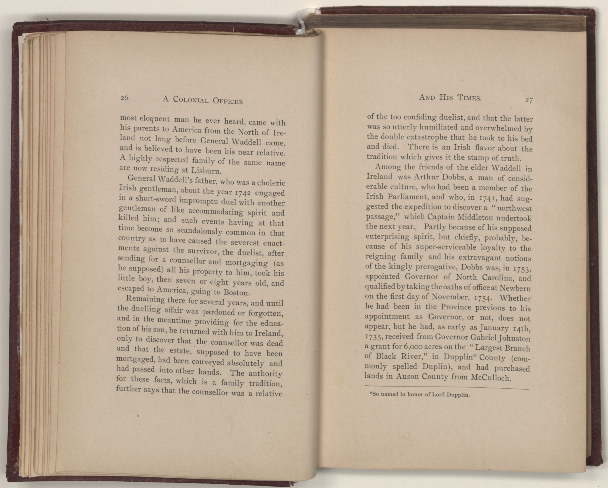 Among the friends of the elder Waddell in Ireland was Arthur Dobbs, a man of considerable culture, who had been a member of the Irish Parliament, and who, in 1741, had suggested the expedition to discover a “northwest passage,” which Captain Middleton undertook the next year. Partly because of his supposed enterprising spirit, but chiefly, probably, because of his super-serviceable loyalty to the reigning family and his extravagant notions of the kingly prerogative, Dobbs was, in 1753, appointed Governor of North Carolina, and qualified by taking the oaths of office at Newbern on the first day of November, 1754. Whether he had been in the Province previous to his appointment as Governor, or not, does not appear, but he had, as early as January 14th, 1735, received from Governor Gabriel Johnston a grant for 6,000 acres on the “Largest Branch of Black River,” in Dupplin* County (commonly spelled Duplin), and had purchased lands in Anson County from McCulloch.