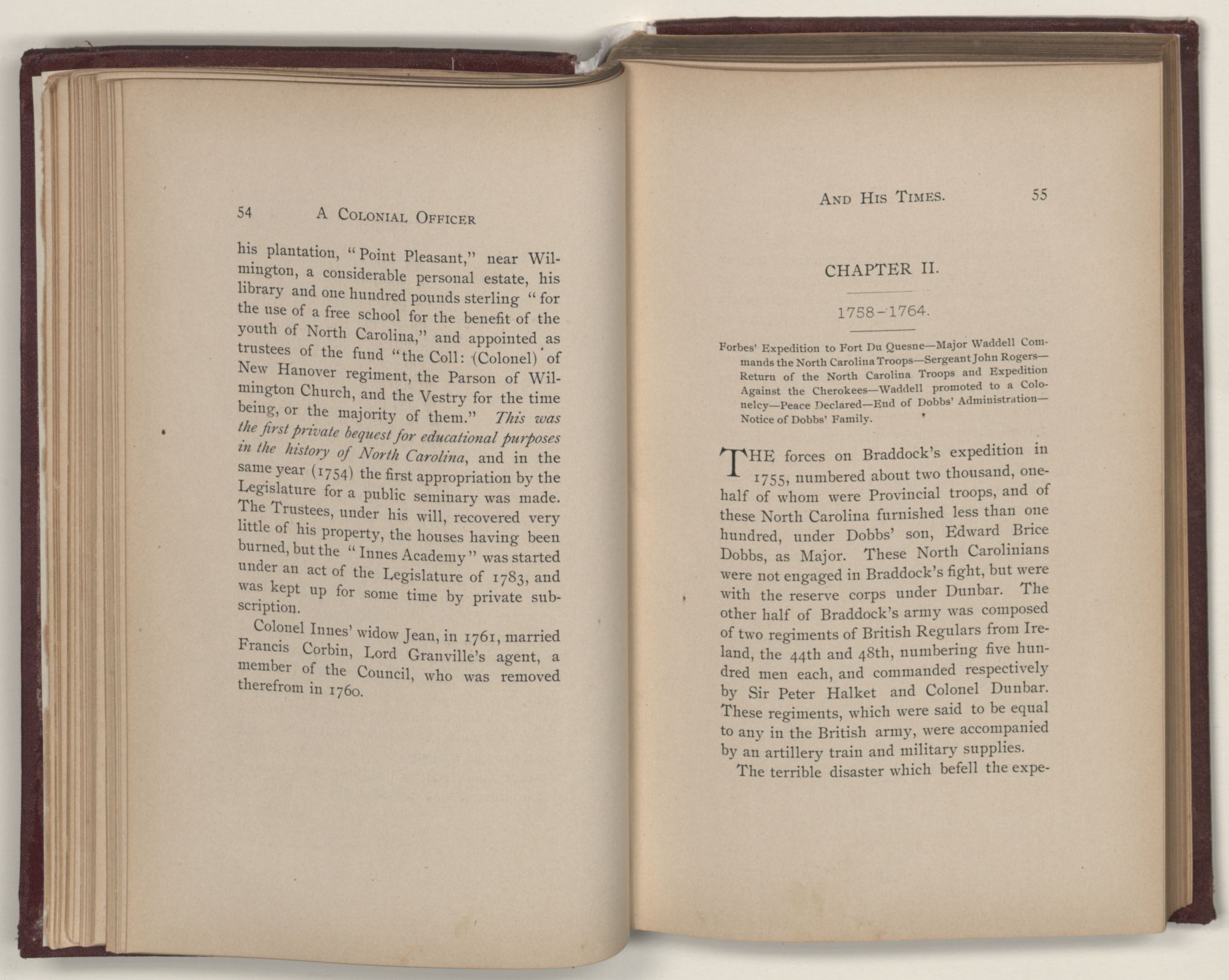 Before Governor Dobbs came over to assume his office, young Waddell had arrived in the Province, having, doubtless, been sent in advance, and arriving in 1753 or early in 1754. He was a Lieutenant in Colonel James Innes’ regiment which went to Virginia in the spring of 1754—a full account of which will presently be given—and was made a Captain there.* This was during the administration of Matthew Rowan, President of the Council, who was acting Governor until the arrival of Dobbs, and was the first appearance of Waddell in the history of the Province.†