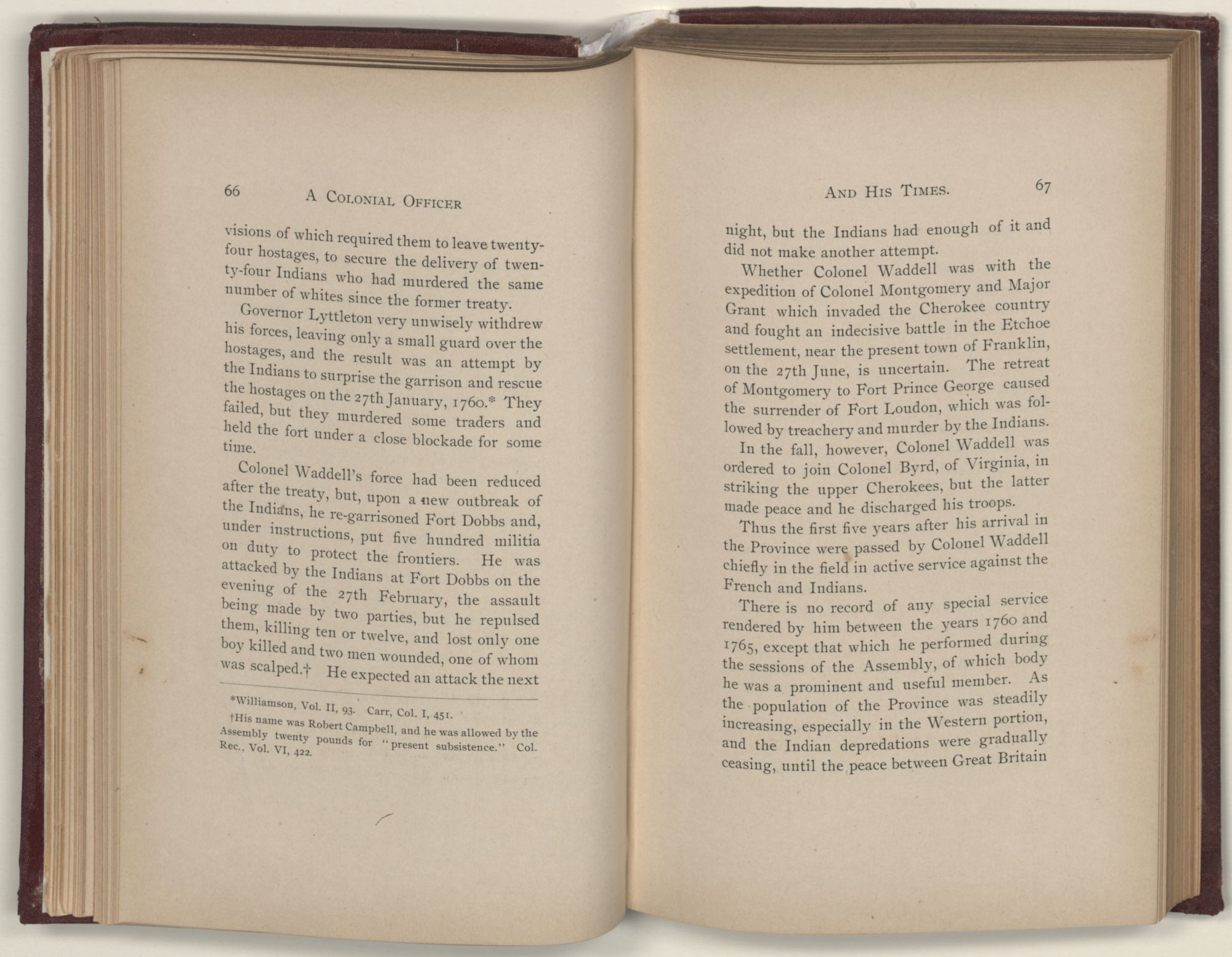A colonial officer and his times, 1754-1773 : a biographical sketch of Gen. Hugh Waddell, of North Carolina : with notices of the French and Indian War in the southern colonies; the resistance to the Stamp Act in North Carolina ... the Regulators' War; and an historical sketch of the former town of Brunswick, on the Cape Fear River / by Alfred Moore Waddell. Raleigh, N.C. : Edwards & Brougton, 1890. 242 p. front. (port.) pl. 24 cm.