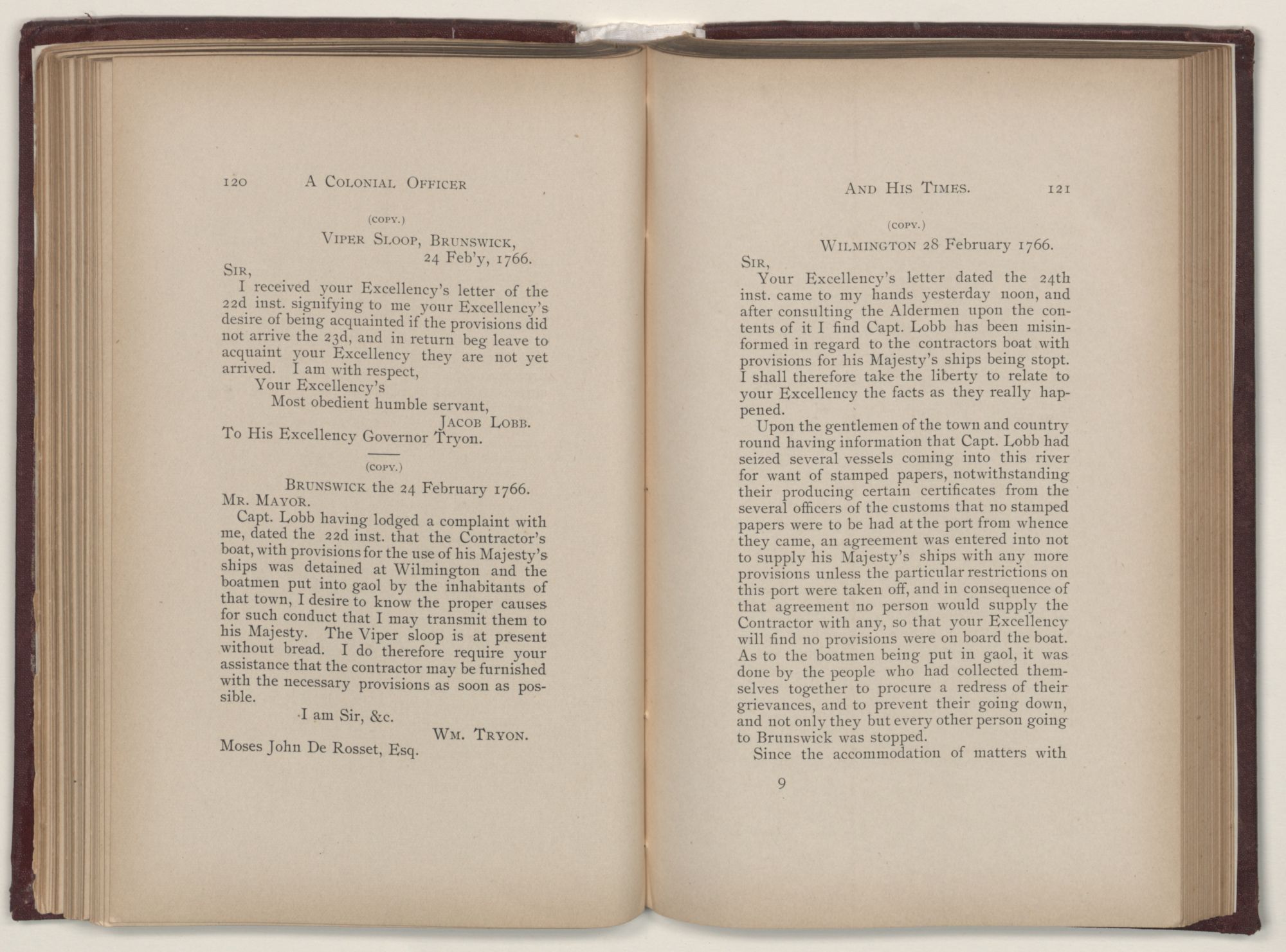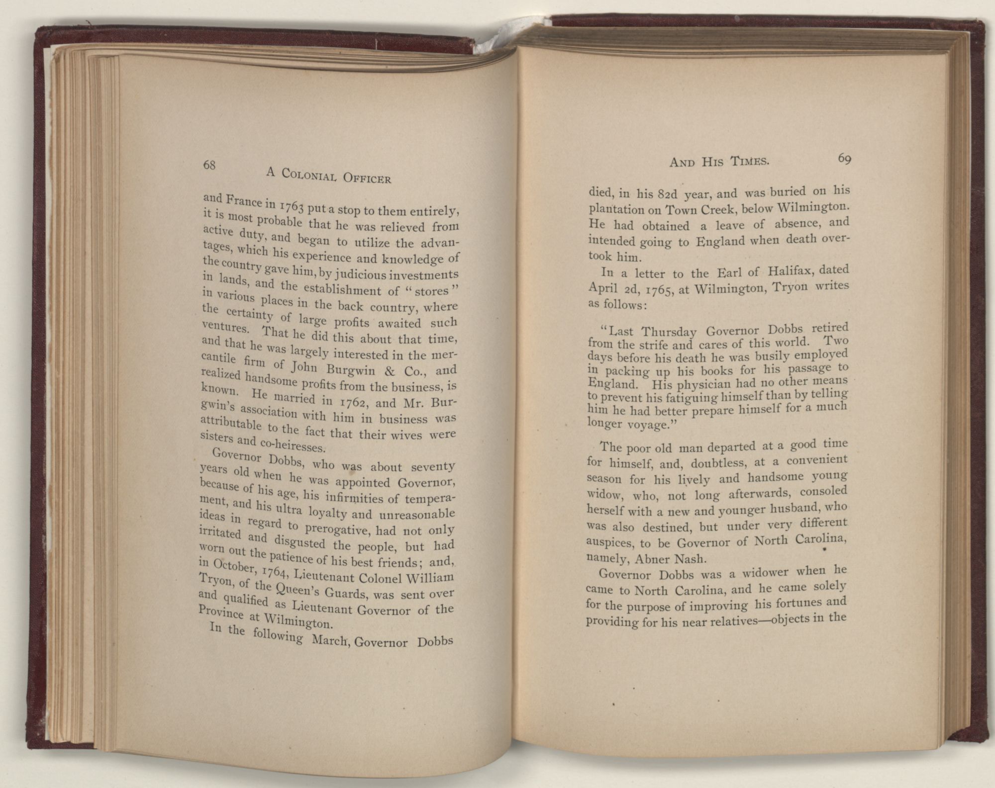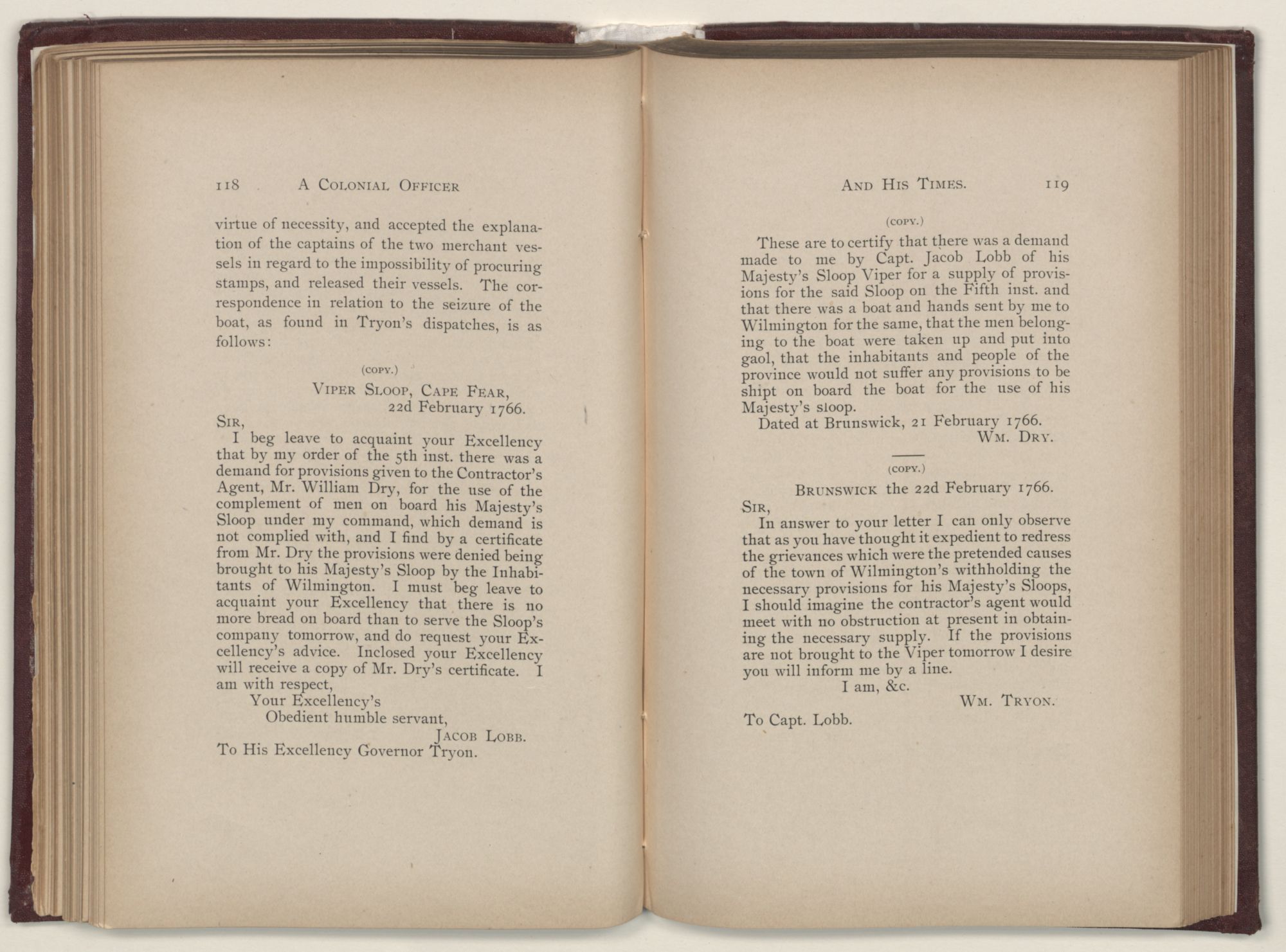 There was ample material for his biography in his letters, papers, and official correspondence, which had been carefully preserved by his son, and which would have thrown light on the events occurring in the Province and elsewhere during the interesting period in which he lived, but the very means adopted to give value to this material resulted in a total loss of it. His son loaned it to Dr. Hugh Williamson, who had been a member of Congress before, at the time of, and subsequent to the adoption of the Federal Constitution, and who was then (about the year 1800) writing a history of North Carolina in New York; but although the most strenuous efforts were made to recover the papers after Dr. Williamson's