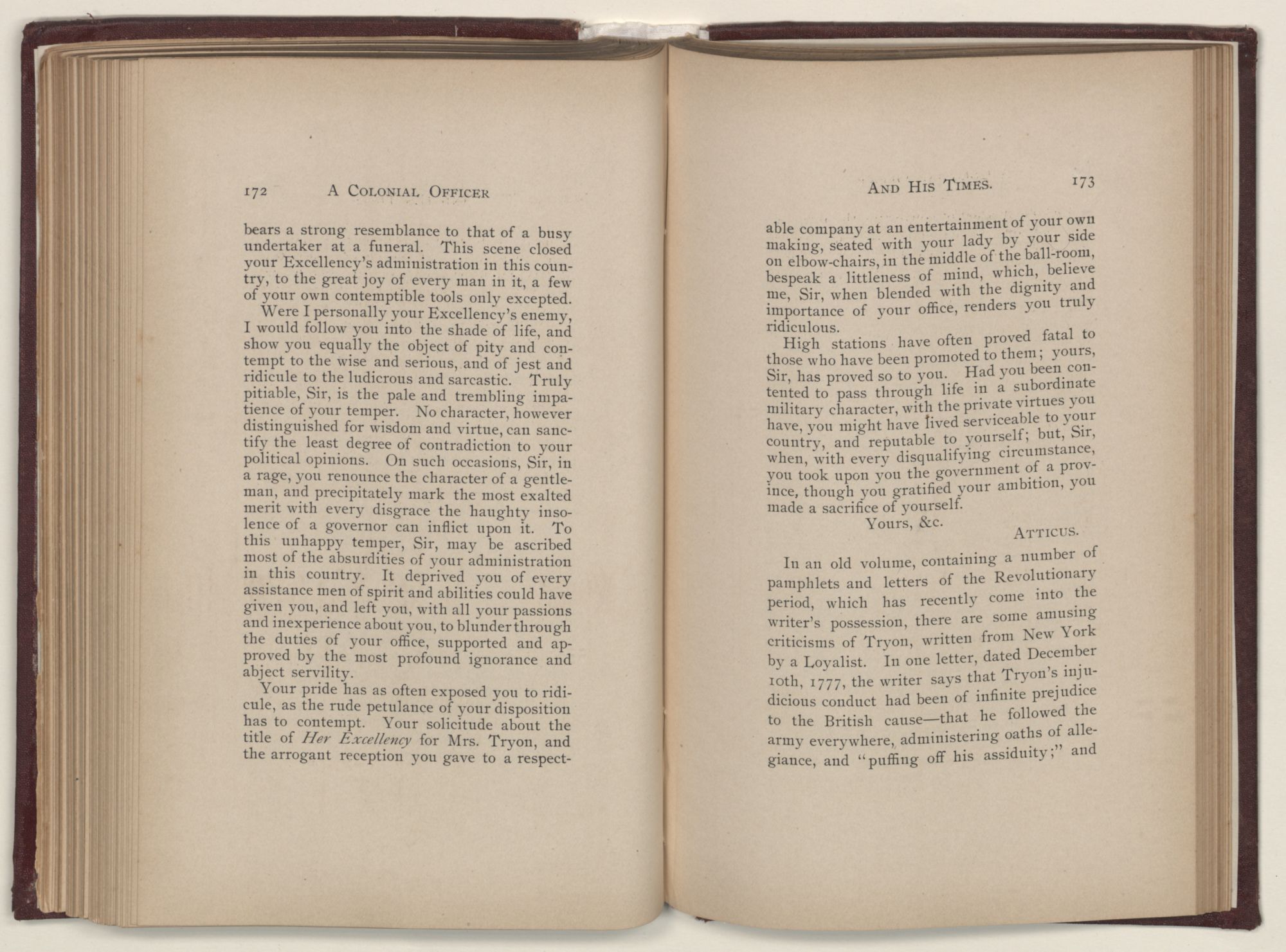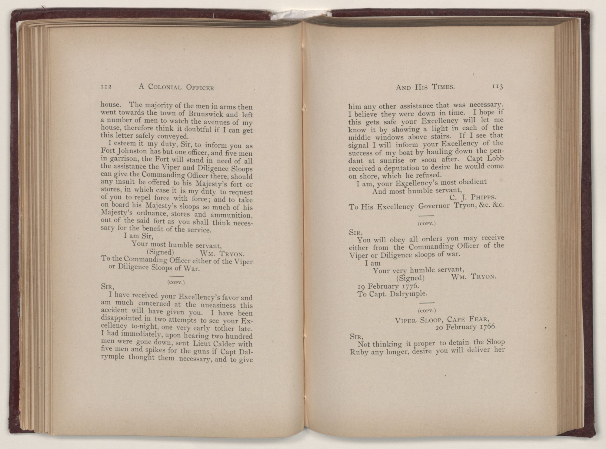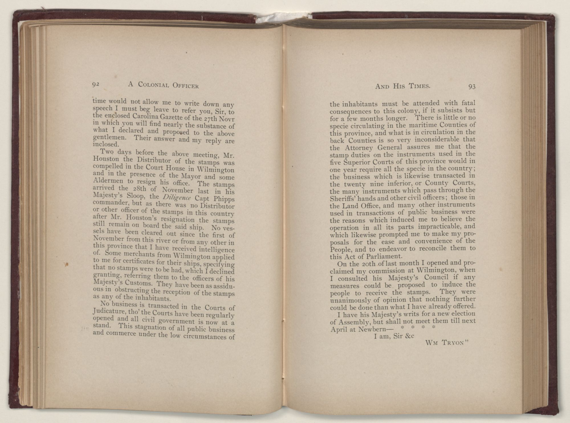 There was ample material for his biography in his letters, papers, and official correspondence, which had been carefully preserved by his son, and which would have thrown light on the events occurring in the Province and elsewhere during the interesting period in which he lived, but the very means adopted to give value to this material resulted in a total loss of it. His son loaned it to Dr. Hugh Williamson, who had been a member of Congress before, at the time of, and subsequent to the adoption of the Federal Constitution, and who was then (about the year 1800) writing a history of North Carolina in New York; but although the most strenuous efforts were made to recover the papers after Dr. Williamson's