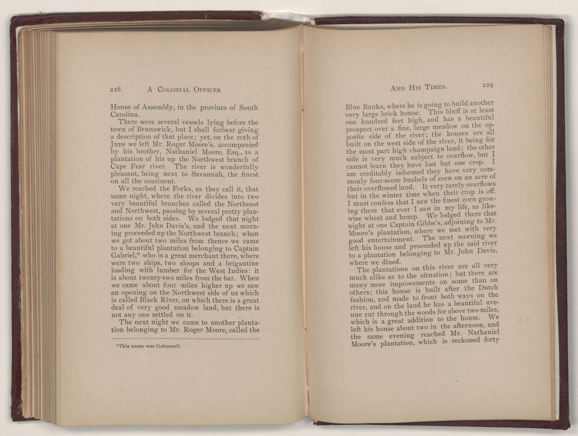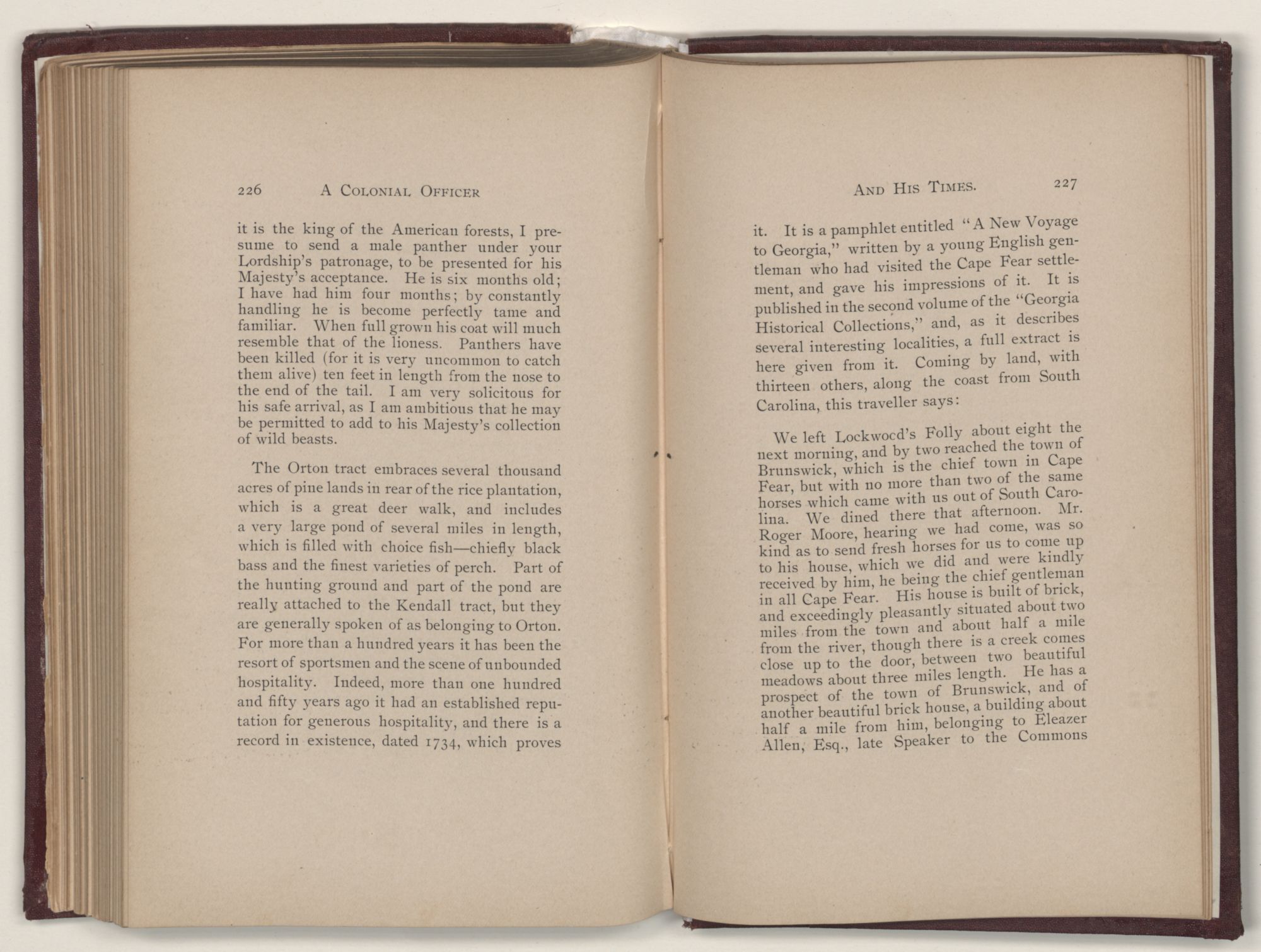 it. It is a pamphlet entitled “A New Voyage to Georgia,” written by a young English gentleman who had visited the Cape Fear settlement, and gave his impressions of it. It is published in the second volume of the “Georgia Historical Collections,” and, as it describes several interesting localities, a full extract is here given from it. Coming by land, with thirteen others, along the coast from South Carolina, this traveller says: