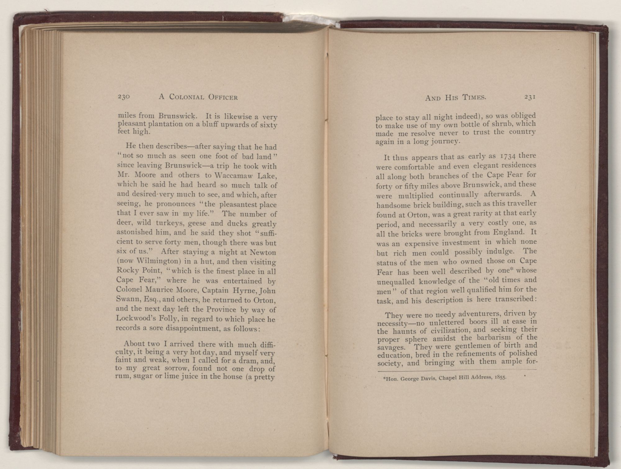 It thus appears that as early as 1734 there were comfortable and even elegant residences all along both branches of the Cape Fear for forty or fifty miles above Brunswick, and these were multiplied continually afterwards. A handsome brick building, such as this traveller found at Orton, was a great rarity at that early period, and necessarily a very costly one, as all the bricks were brought from England. It was an expensive investment in which none but rich men could possibly indulge. The status of the men who owned those on Cape Fear has been well described by one* whose unequalled knowledge of the “old times and men” of that region well qualified him for the task, and his description is here transcribed: