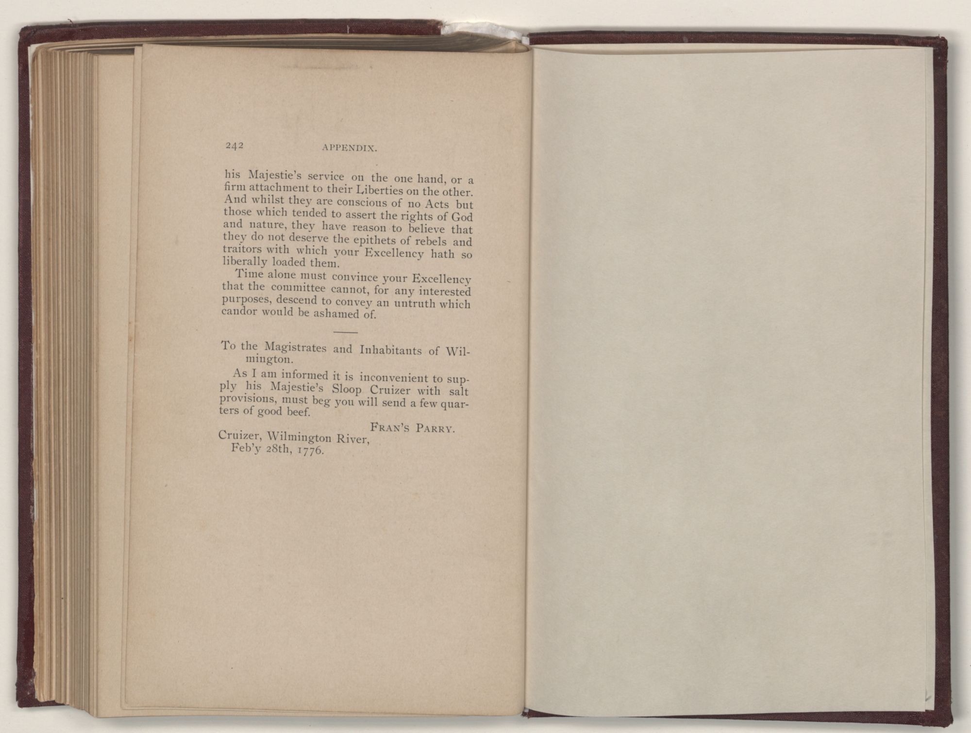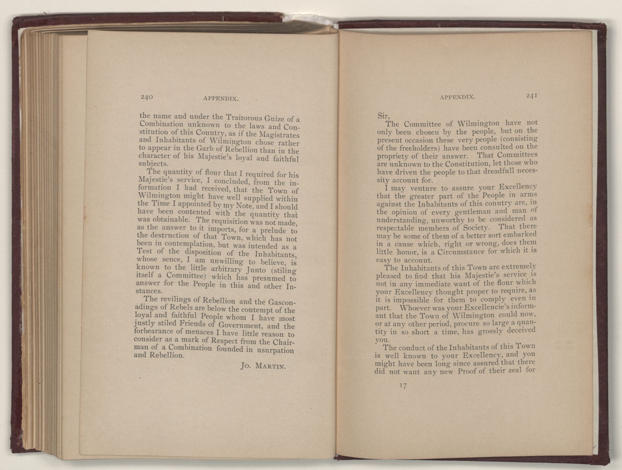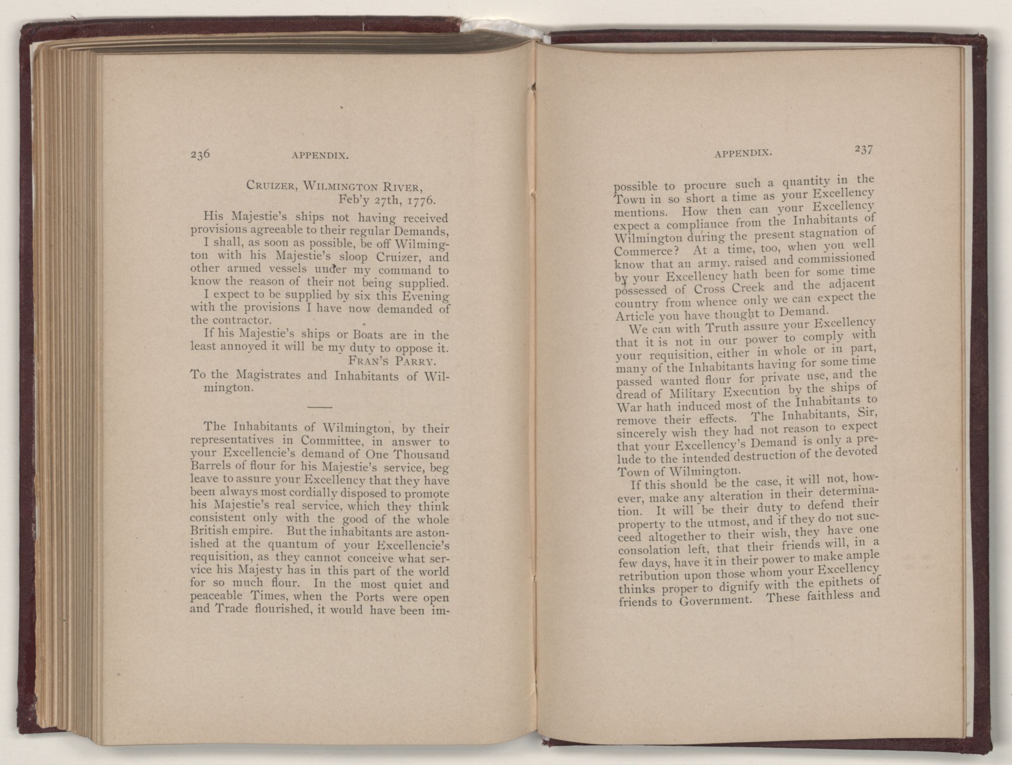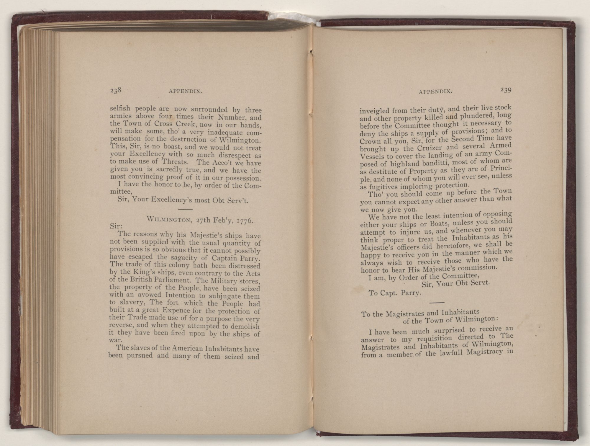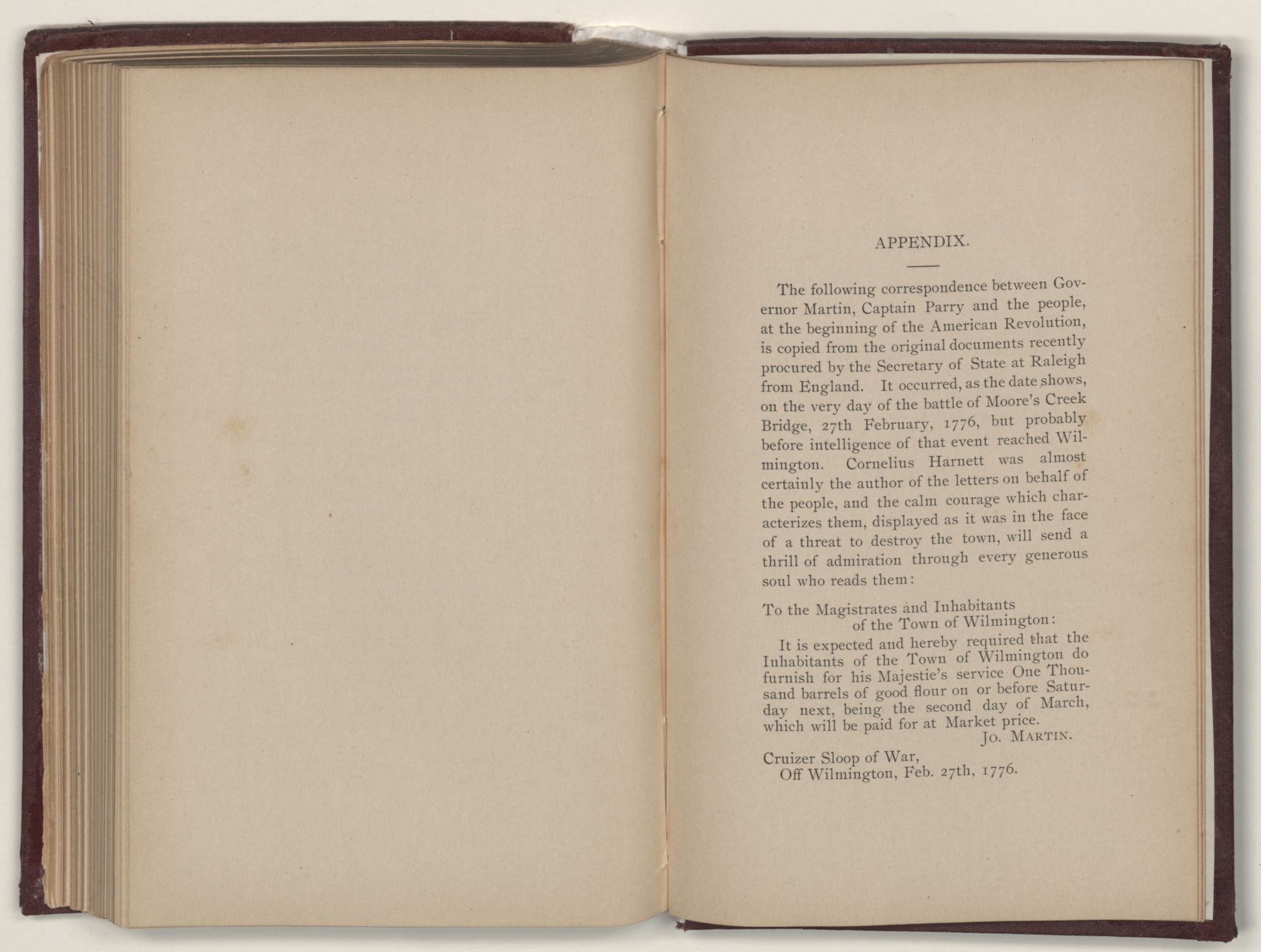 The following correspondence between Governor Martin, Captain Parry and the people, at the beginning of the American Revolution, is copied from the original documents recently procured by the Secretary of State at Raleigh from England. It occurred, as the date shows, on the very day of the battle of Moore's Creek Bridge, 27th February, 1776, but probably before intelligence of that event reached Wilmington. Cornelius Harnett was almost certainly the author of the letters on behalf of the people, and the calm courage which characterizes them, displayed as it was in the face of a threat to destroy the town, will send a thrill of admiration through every generous soul who reads them: