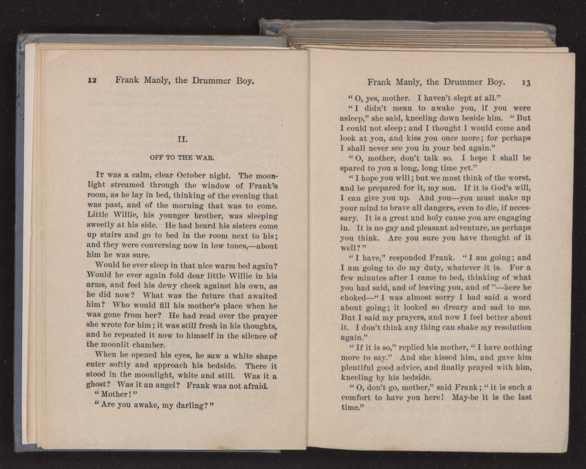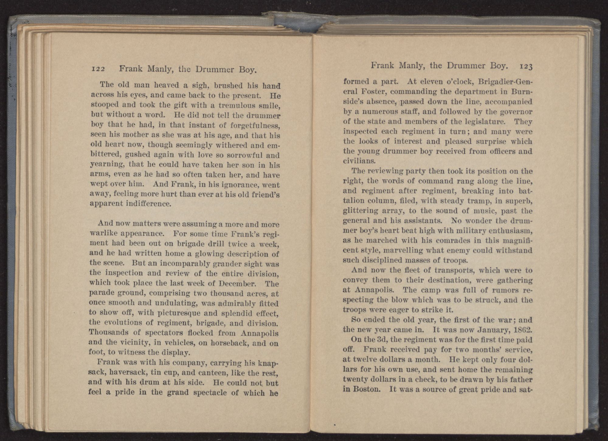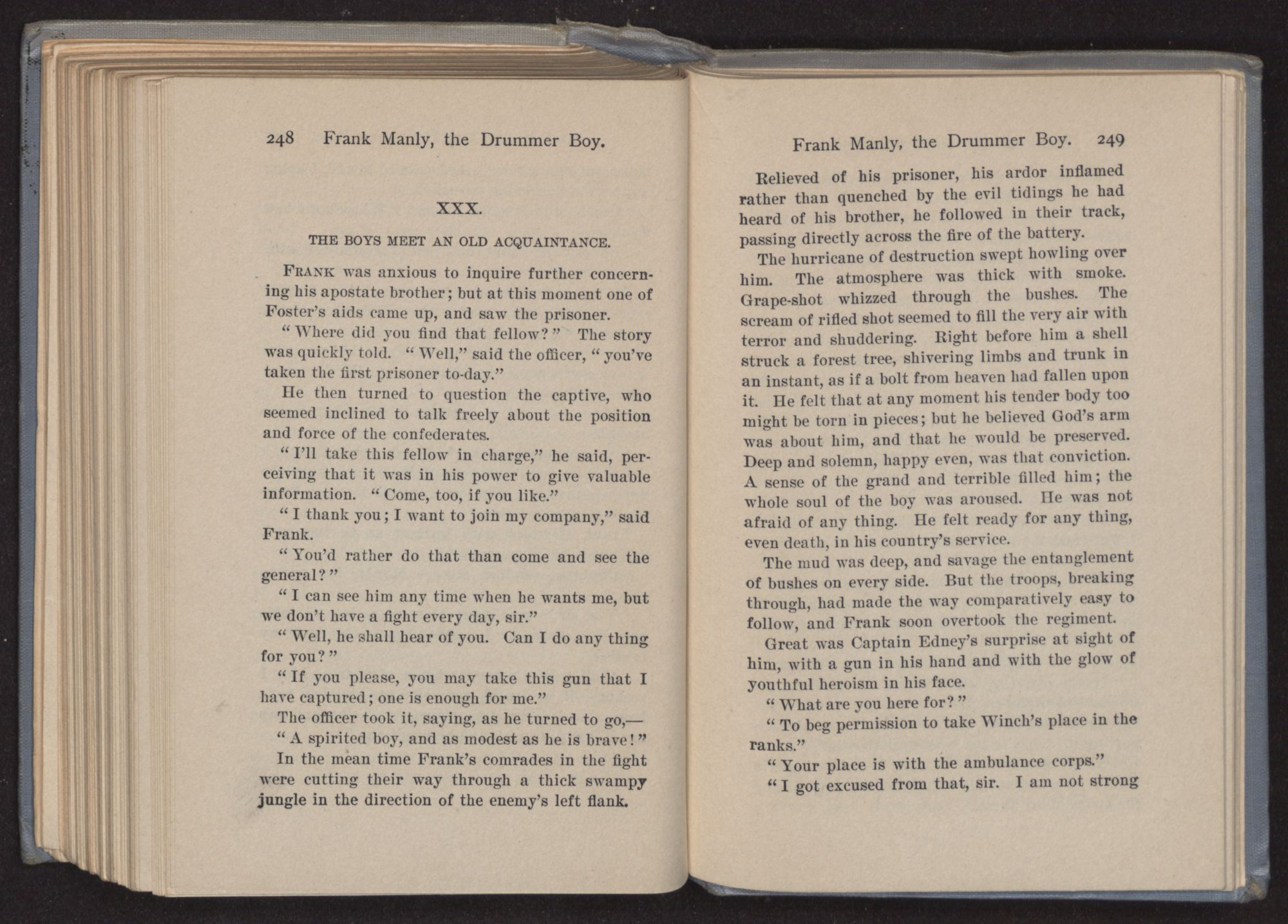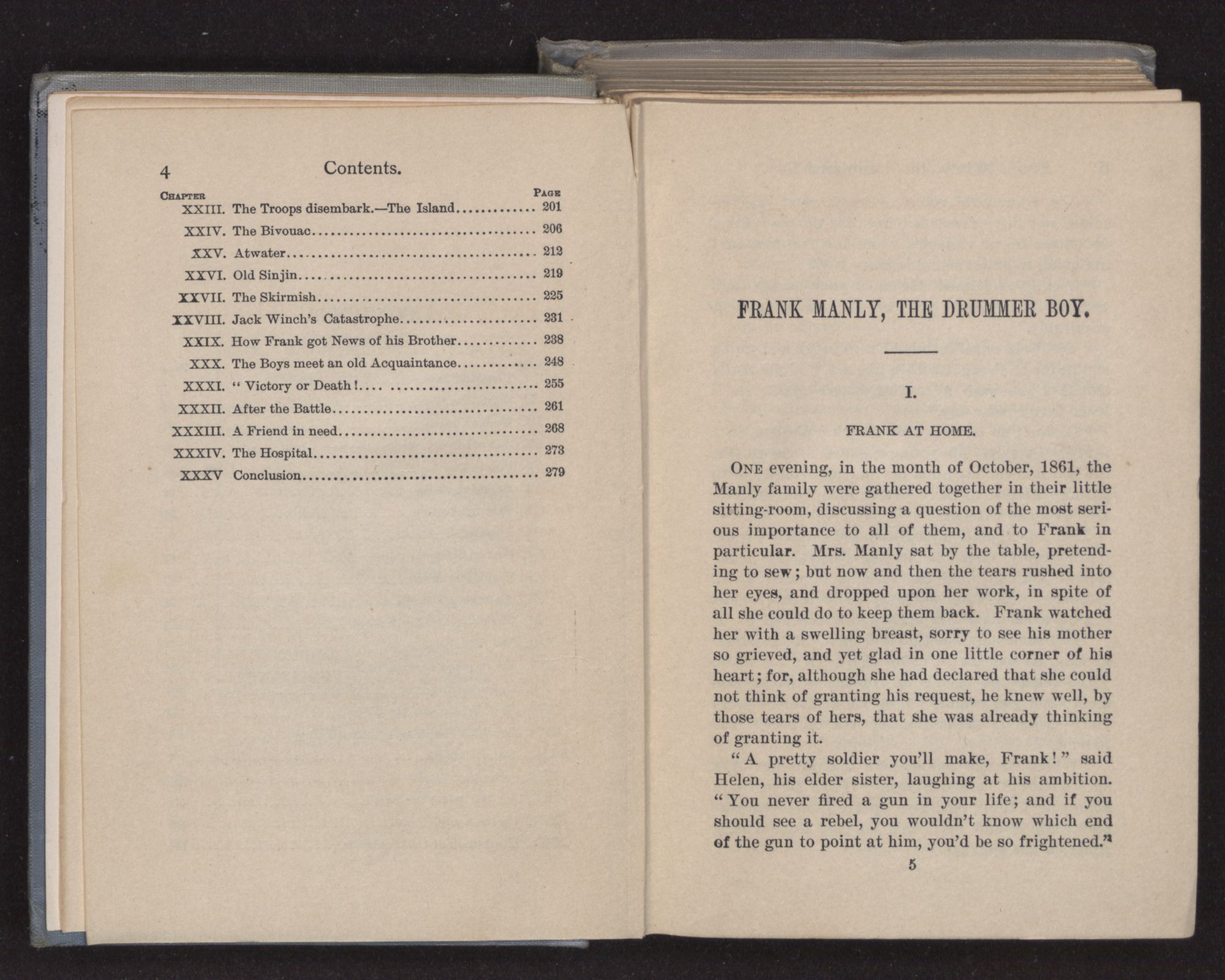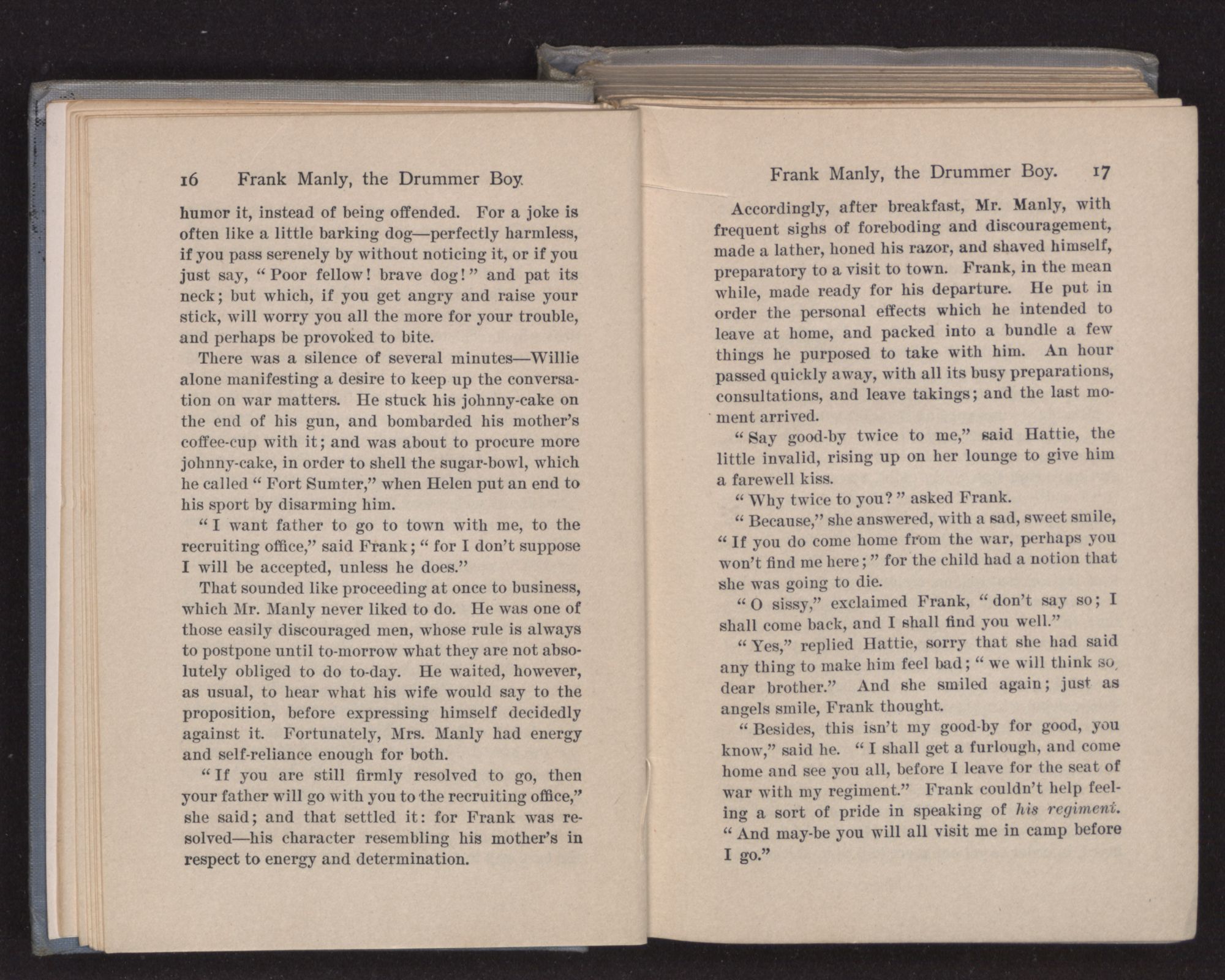 I. FRANK AT HOME.One evening, in the month of October, 1861, the Manly family were gathered together in their little sitting-room, discussing a question of the most serious importance to all of them, and to Frank in particular. Mrs. Manly sat by the table, pretending to sew; but now and then the tears rushed into her eyes, and dropped upon her work, in spite of all she could do to keep them back. Frank watched her with a swelling breast, sorry to see his mother so grieved, and yet glad in one little corner of his heart; for, although she had declared that she could not think of granting his request, he knew well, by those tears of hers, that she was already thinking of granting it.