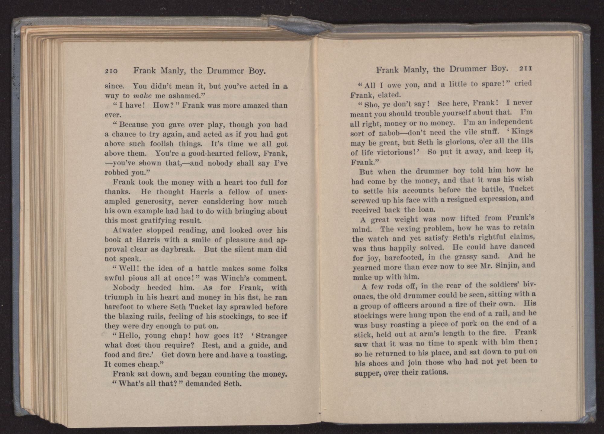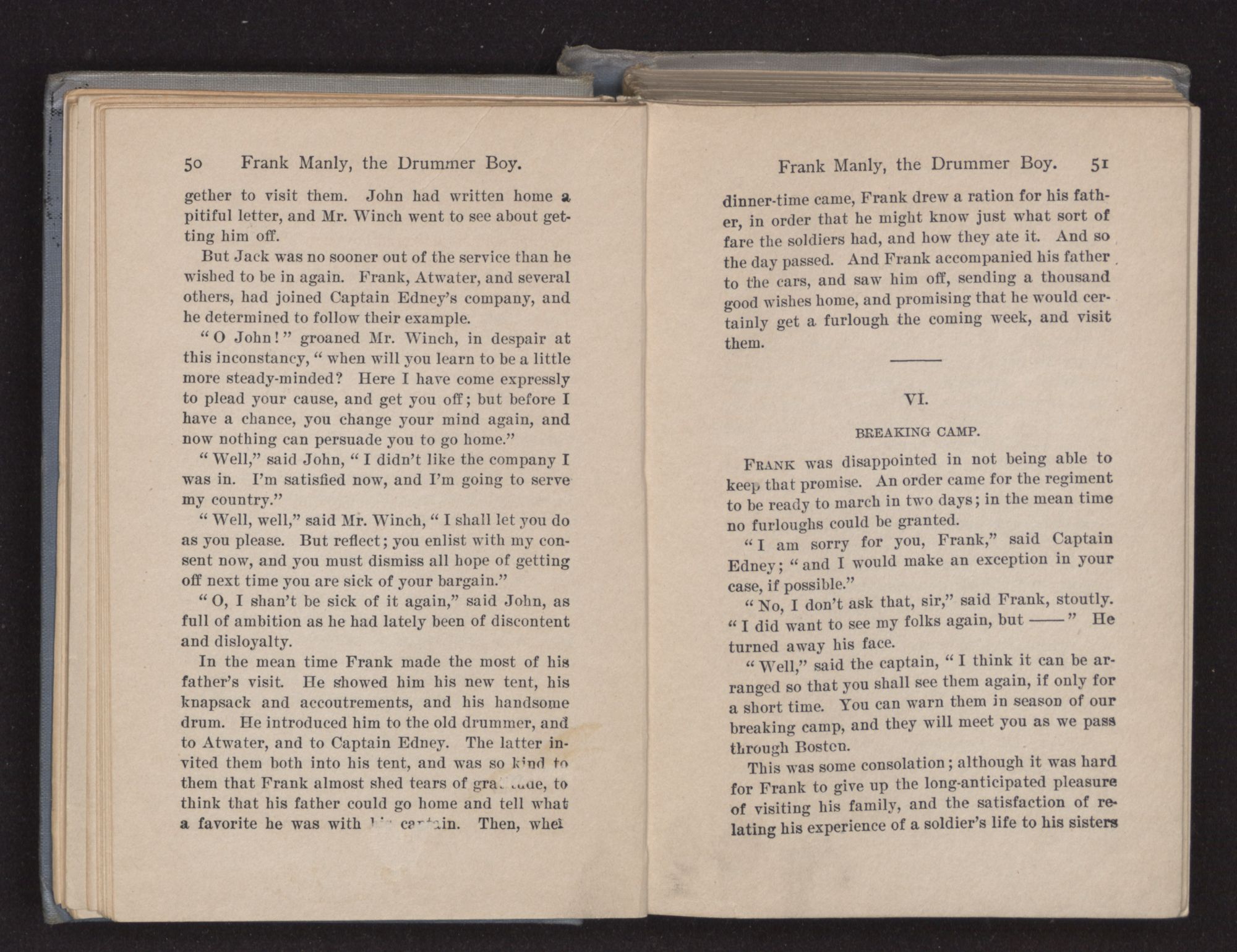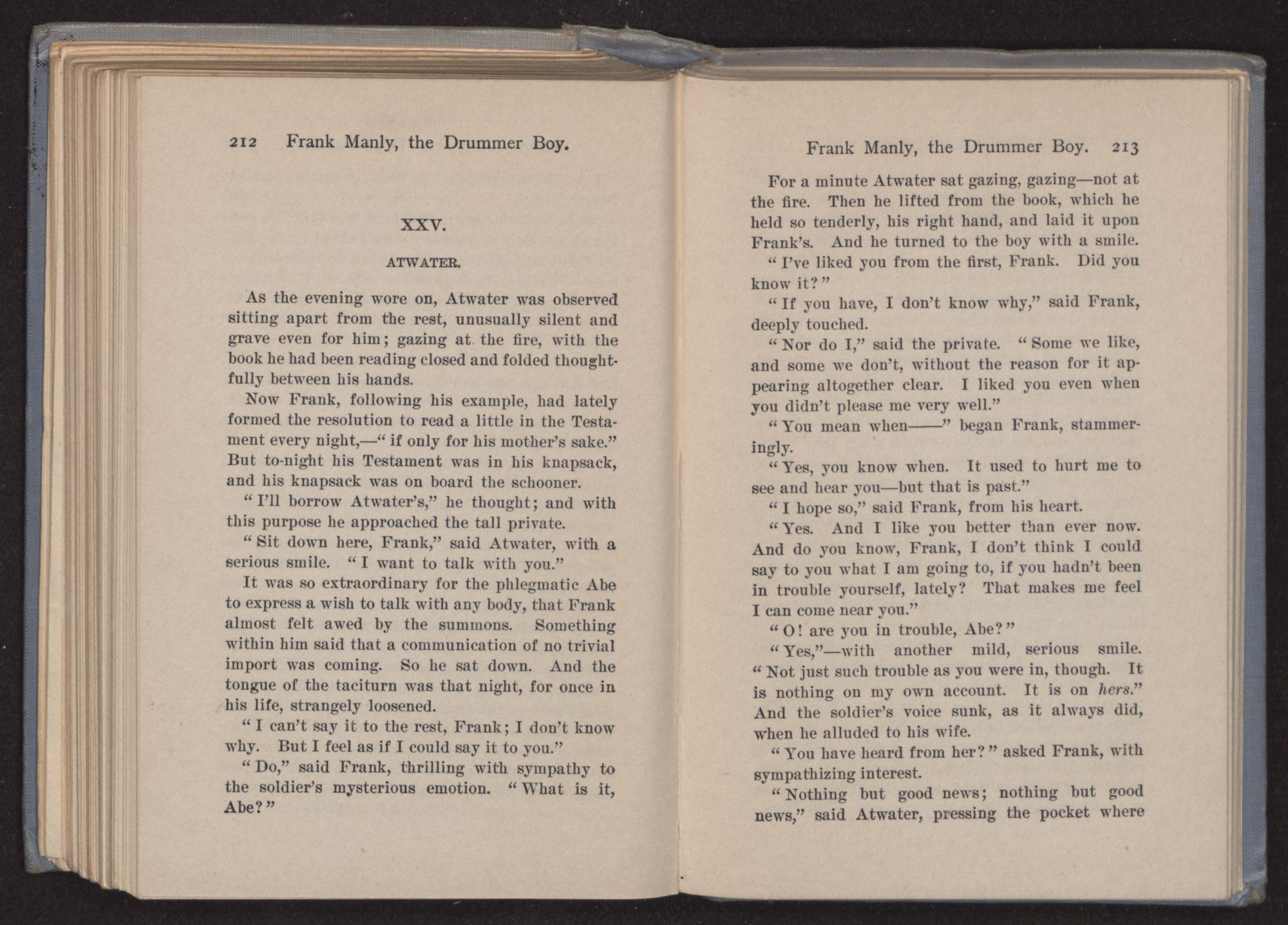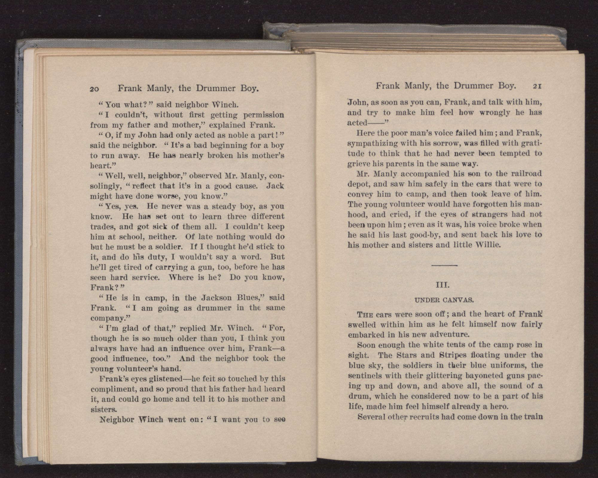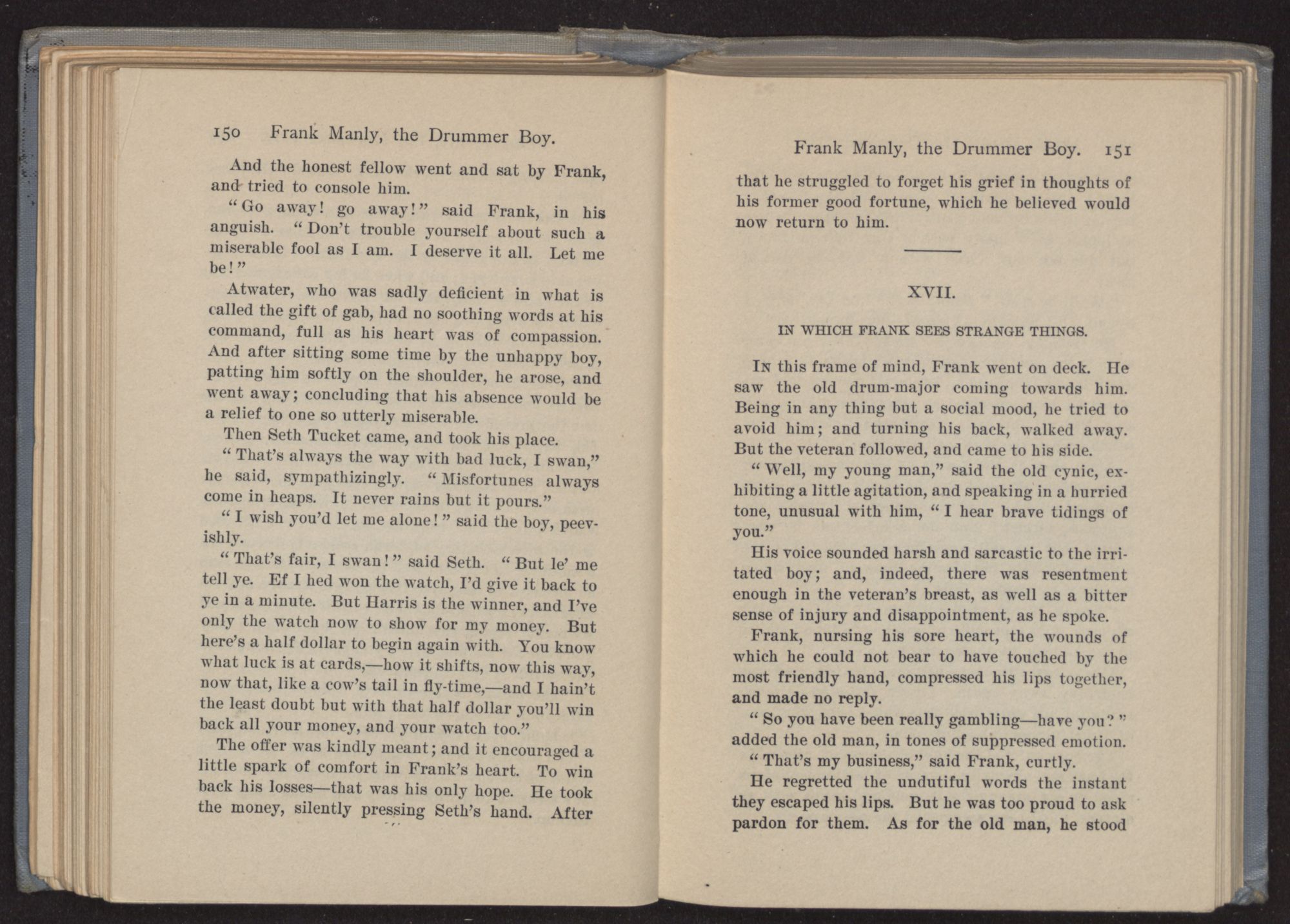 I. FRANK AT HOME.One evening, in the month of October, 1861, the Manly family were gathered together in their little sitting-room, discussing a question of the most serious importance to all of them, and to Frank in particular. Mrs. Manly sat by the table, pretending to sew; but now and then the tears rushed into her eyes, and dropped upon her work, in spite of all she could do to keep them back. Frank watched her with a swelling breast, sorry to see his mother so grieved, and yet glad in one little corner of his heart; for, although she had declared that she could not think of granting his request, he knew well, by those tears of hers, that she was already thinking of granting it.