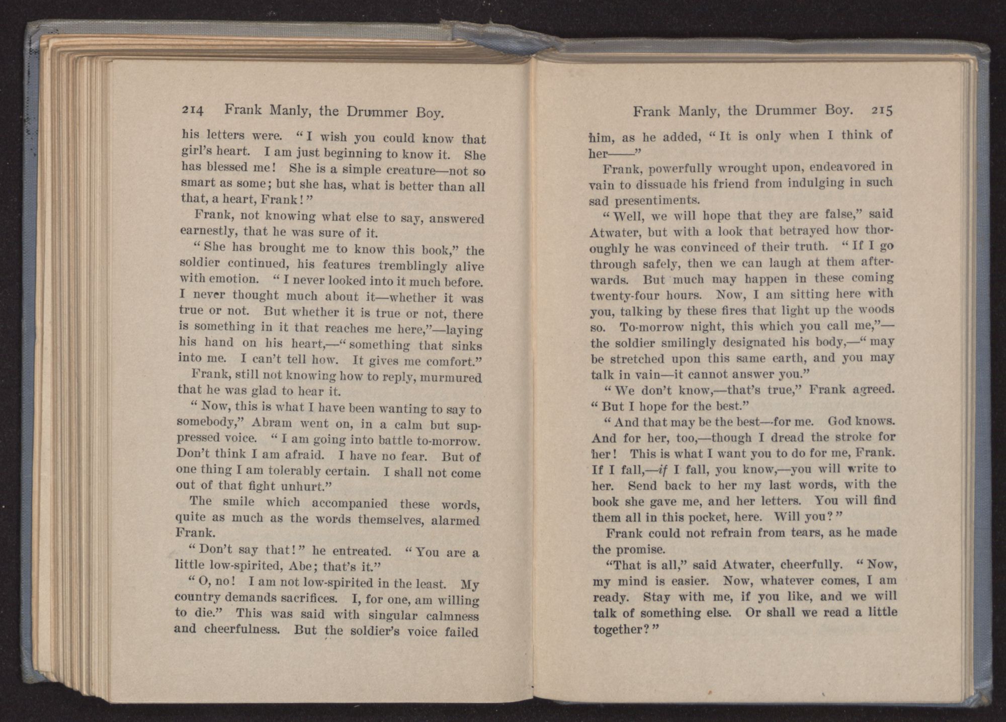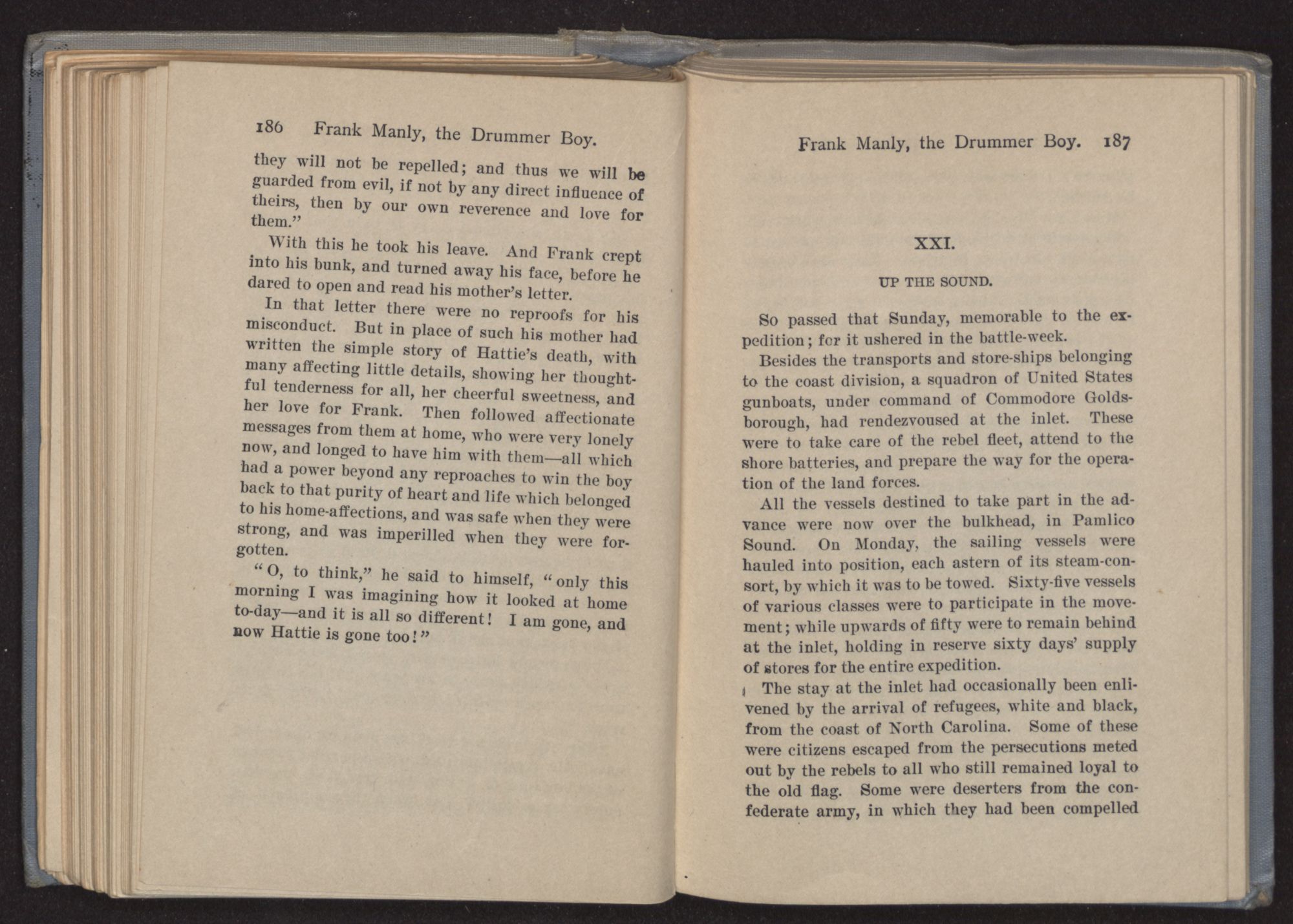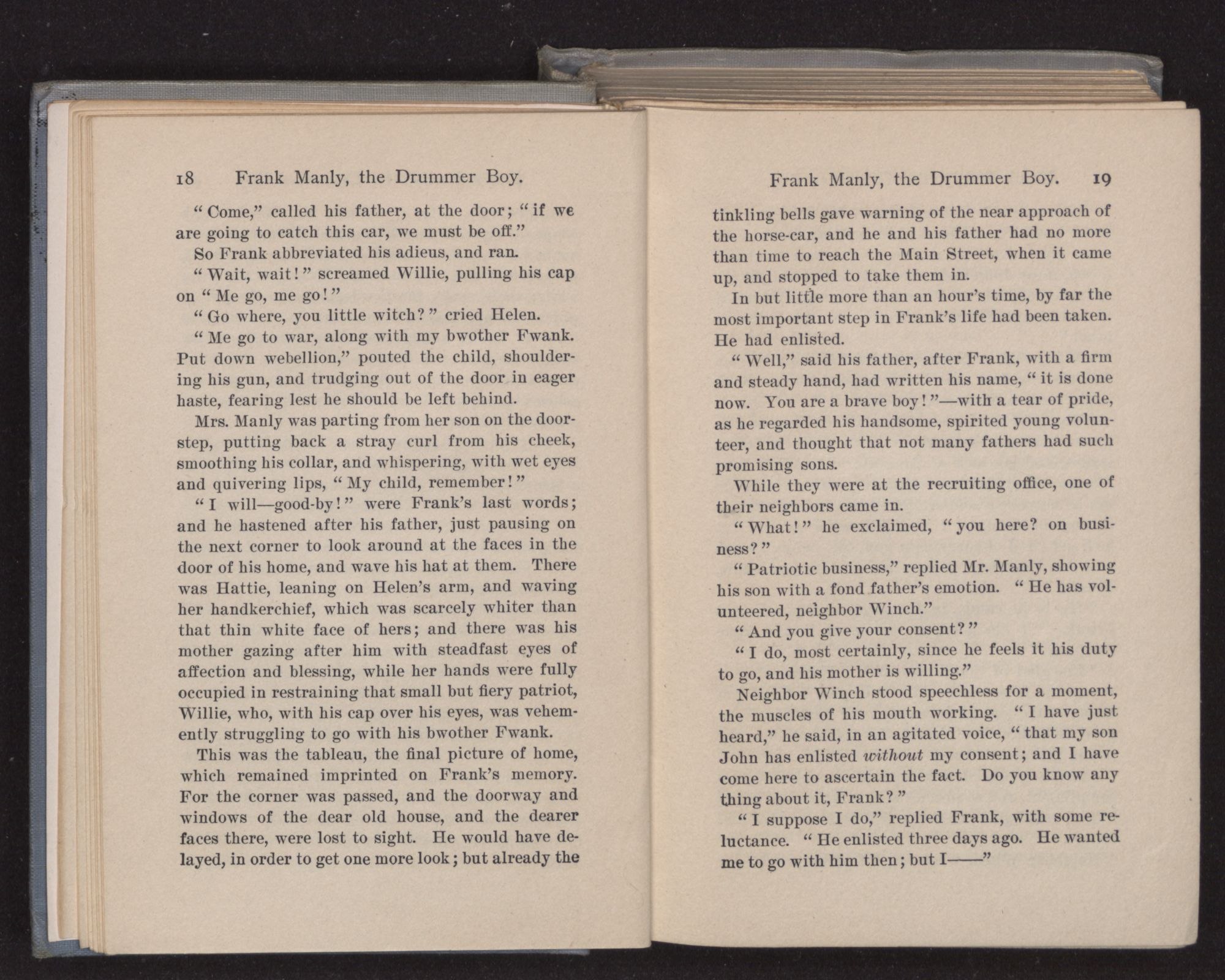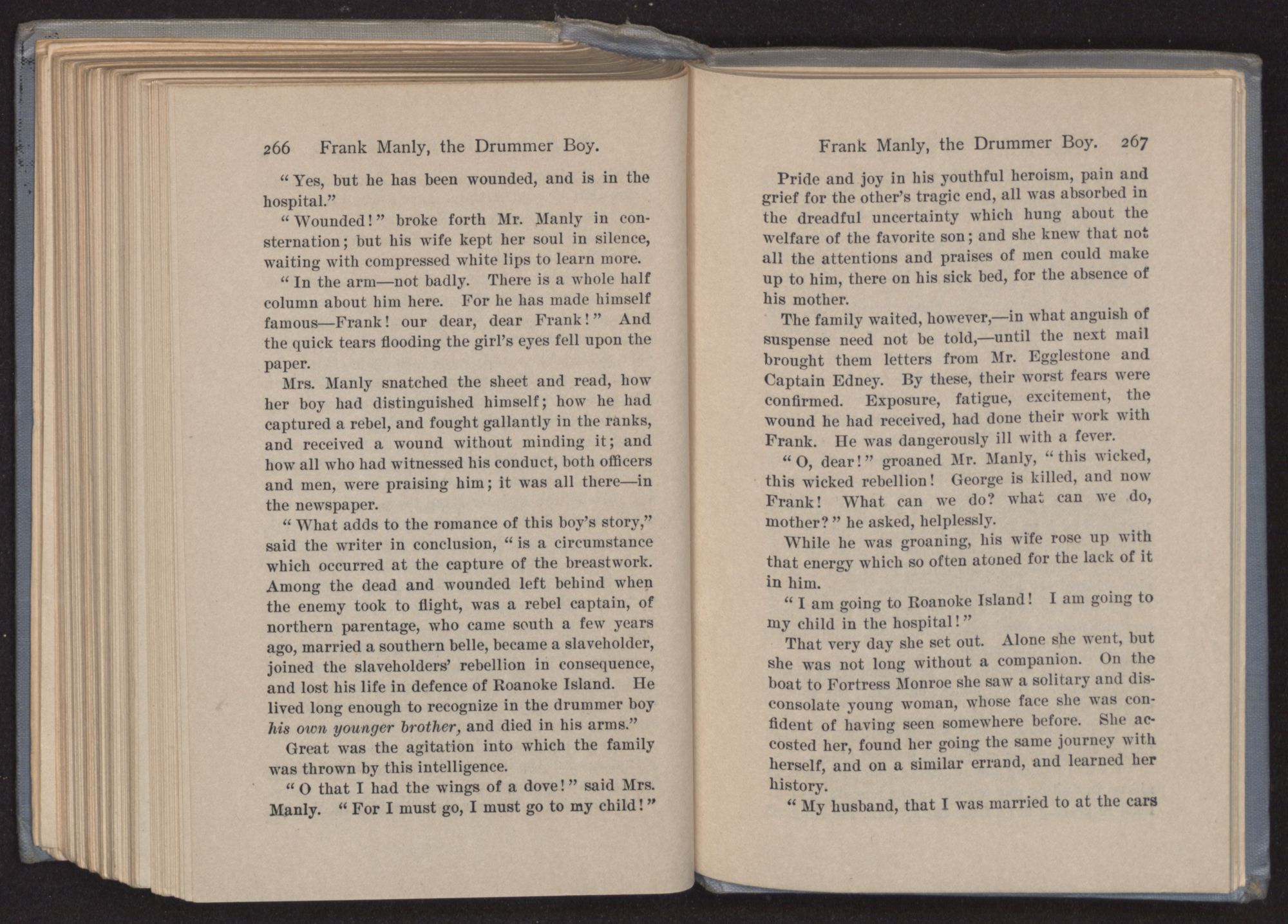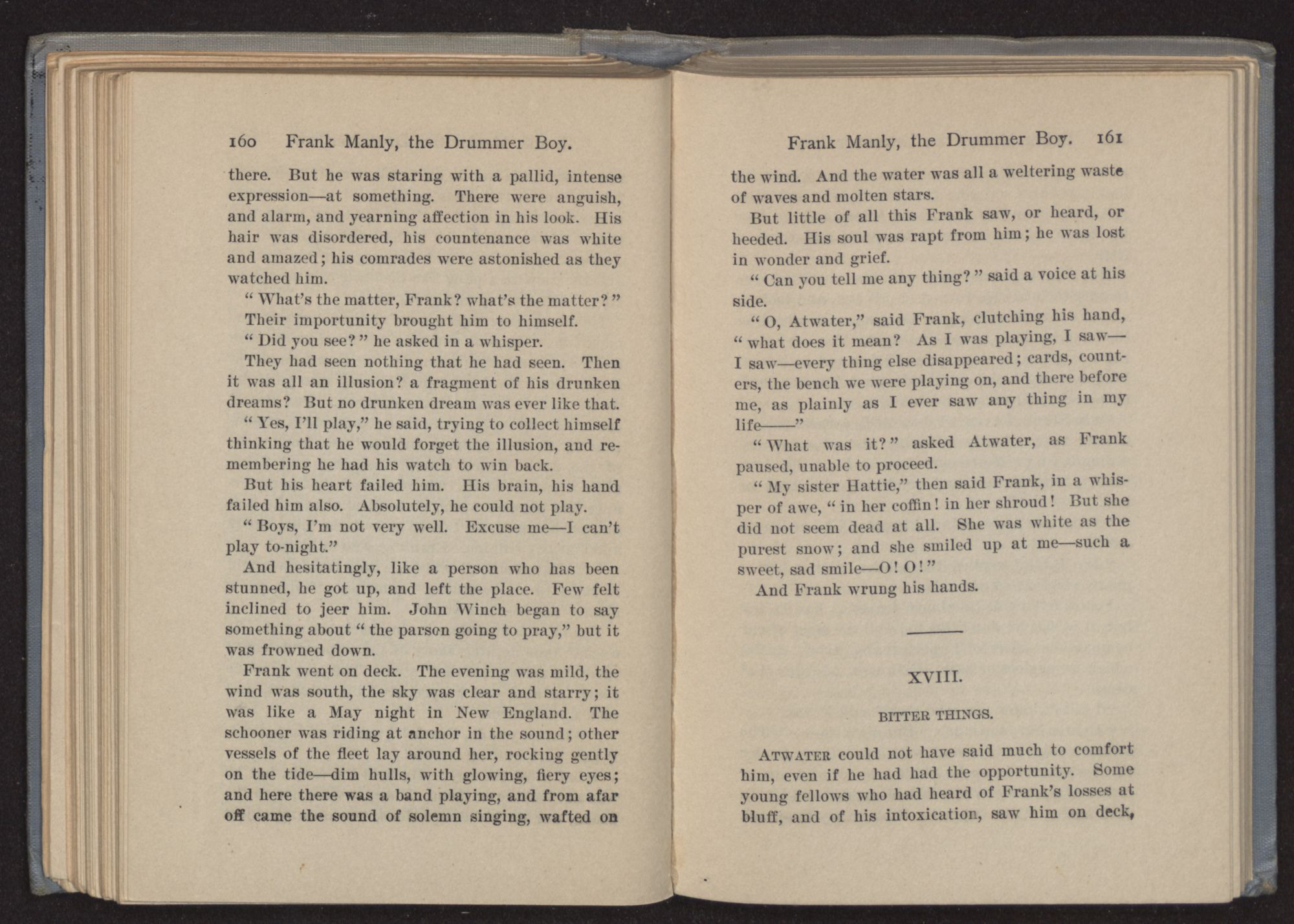 I. FRANK AT HOME.One evening, in the month of October, 1861, the Manly family were gathered together in their little sitting-room, discussing a question of the most serious importance to all of them, and to Frank in particular. Mrs. Manly sat by the table, pretending to sew; but now and then the tears rushed into her eyes, and dropped upon her work, in spite of all she could do to keep them back. Frank watched her with a swelling breast, sorry to see his mother so grieved, and yet glad in one little corner of his heart; for, although she had declared that she could not think of granting his request, he knew well, by those tears of hers, that she was already thinking of granting it.