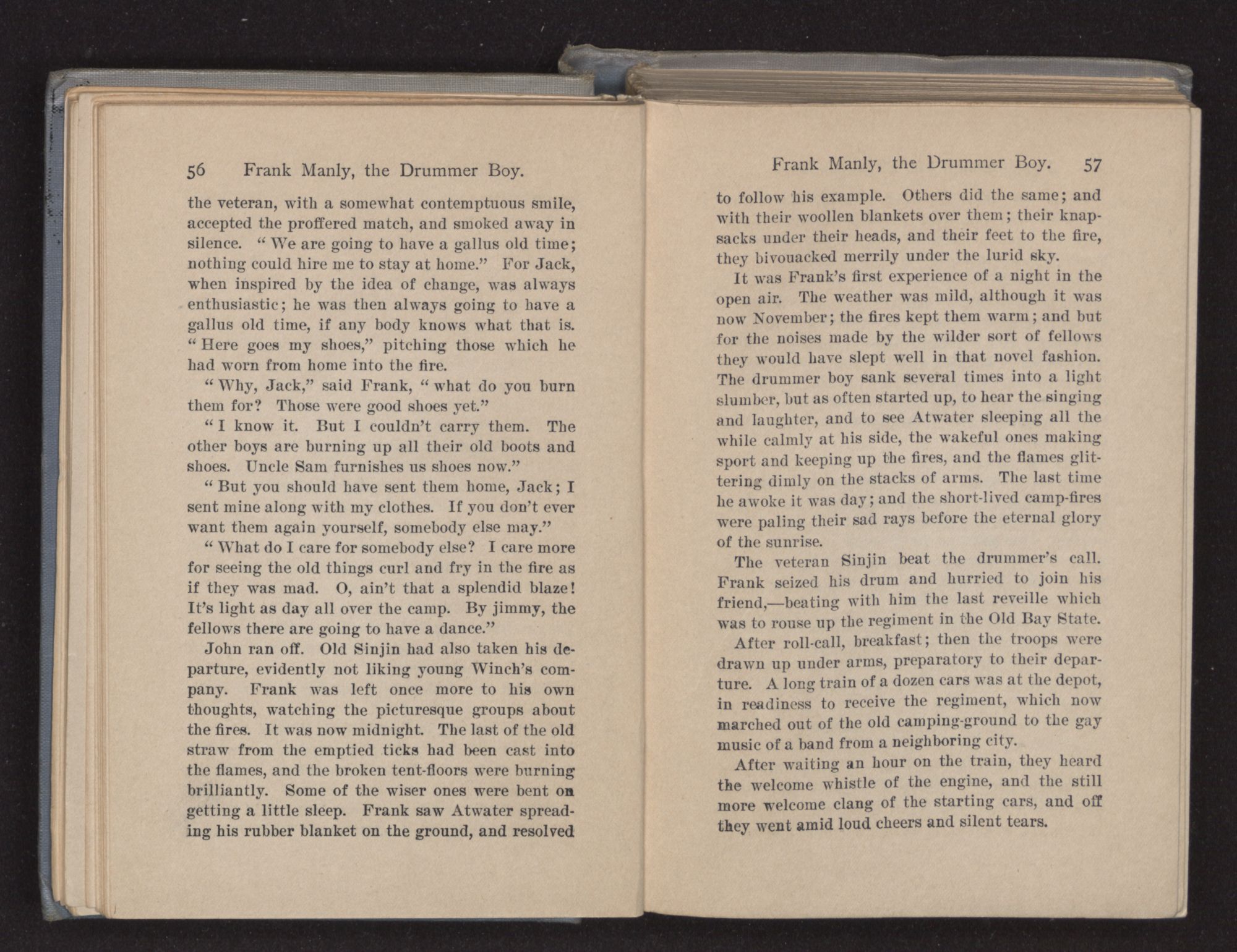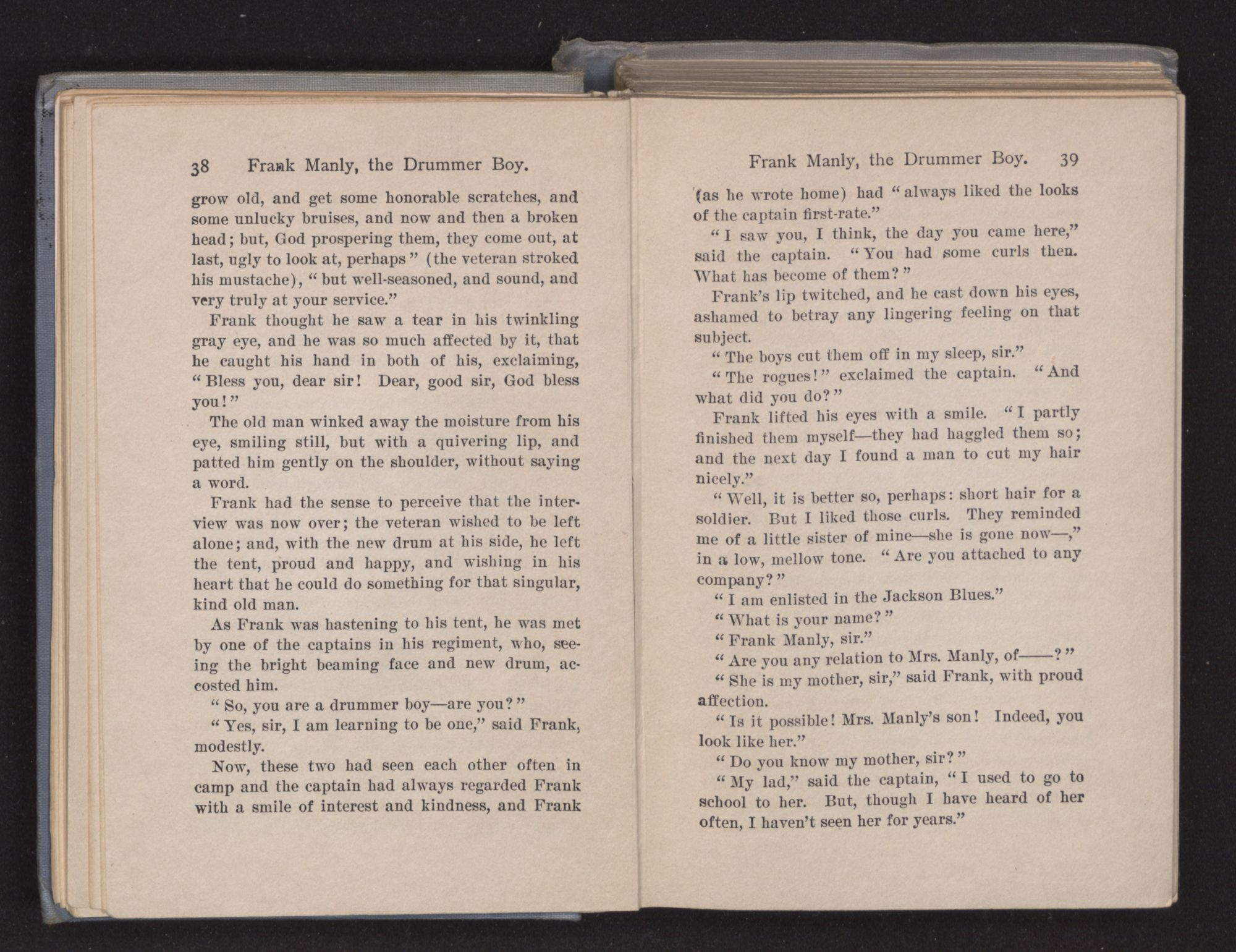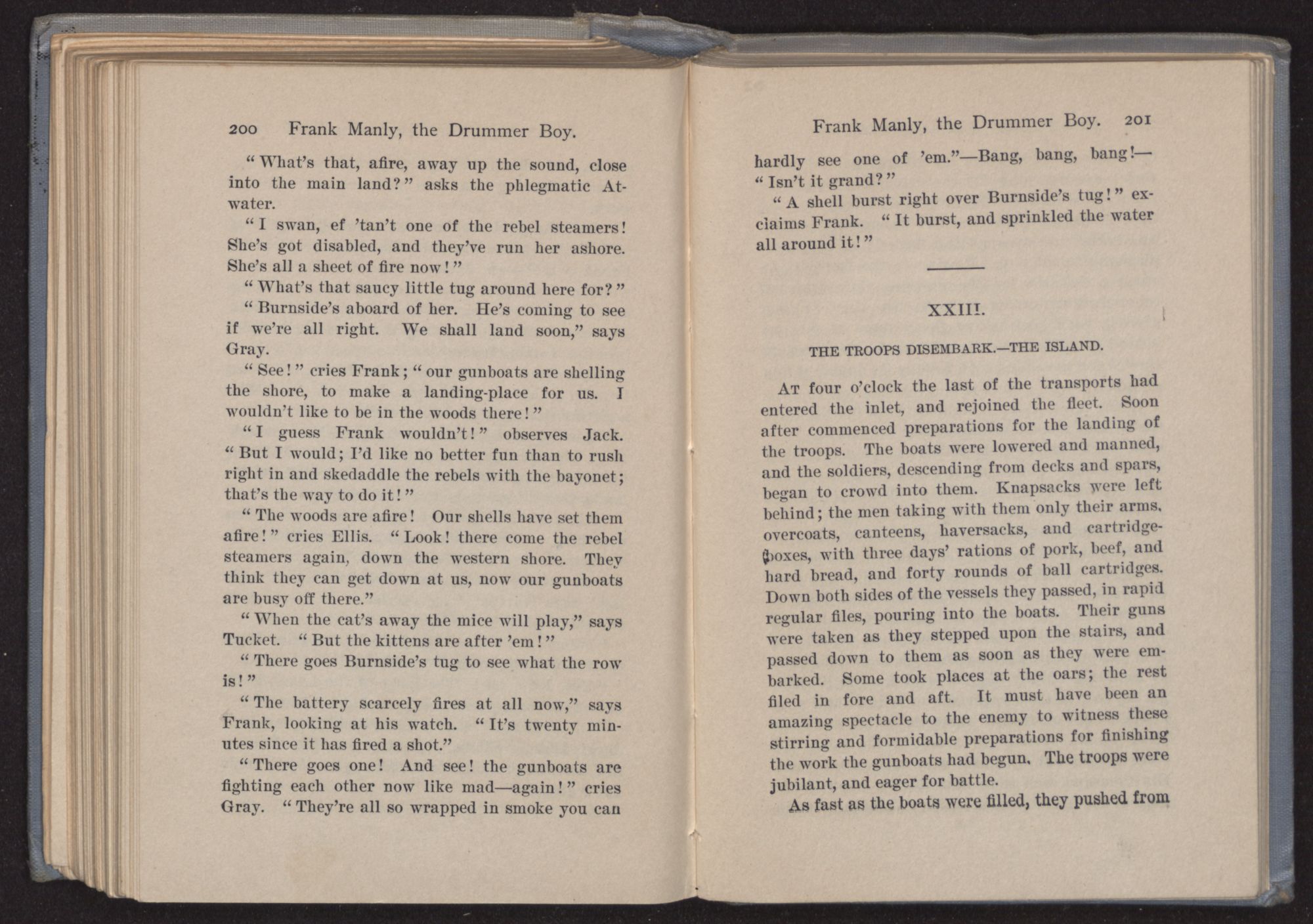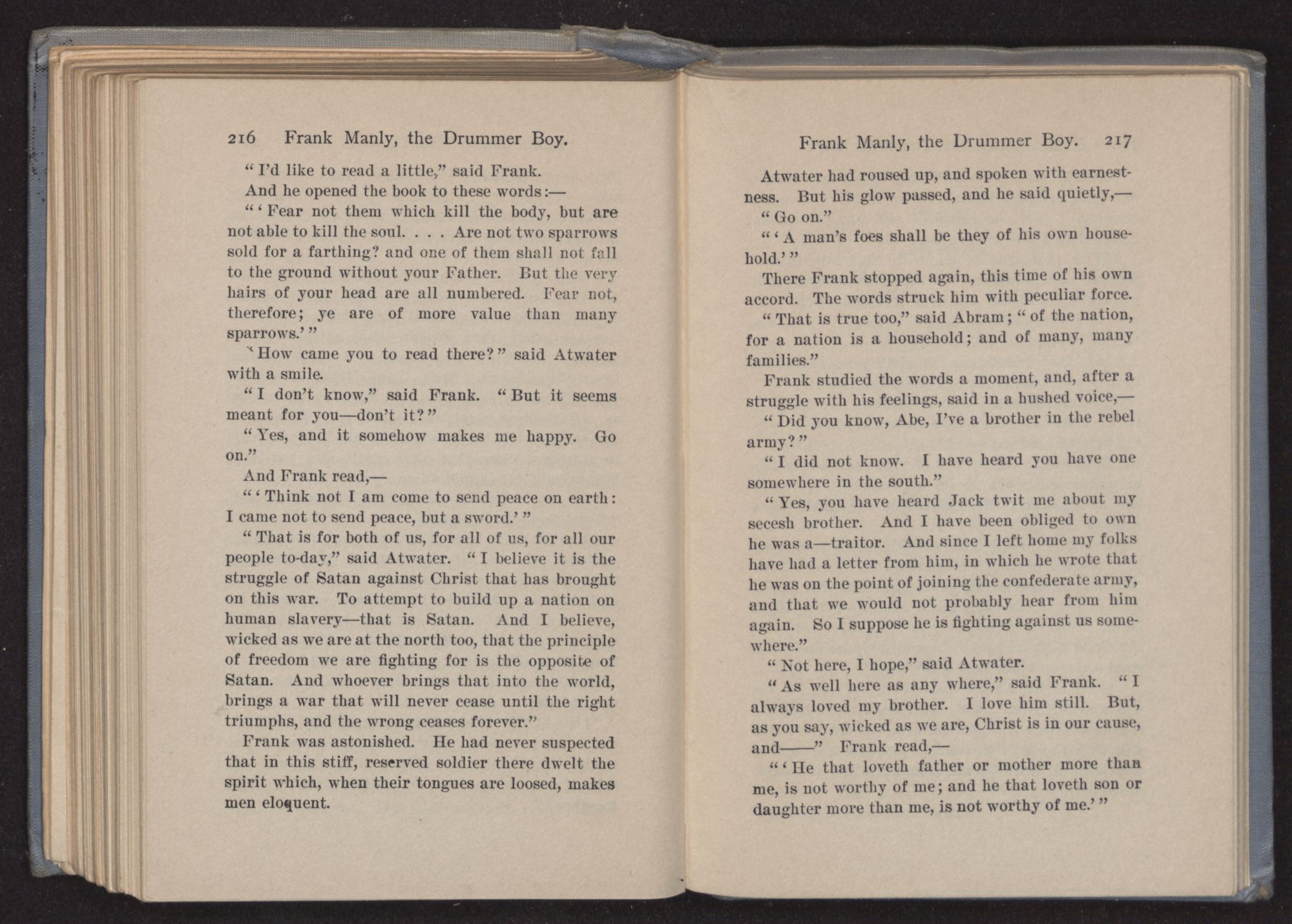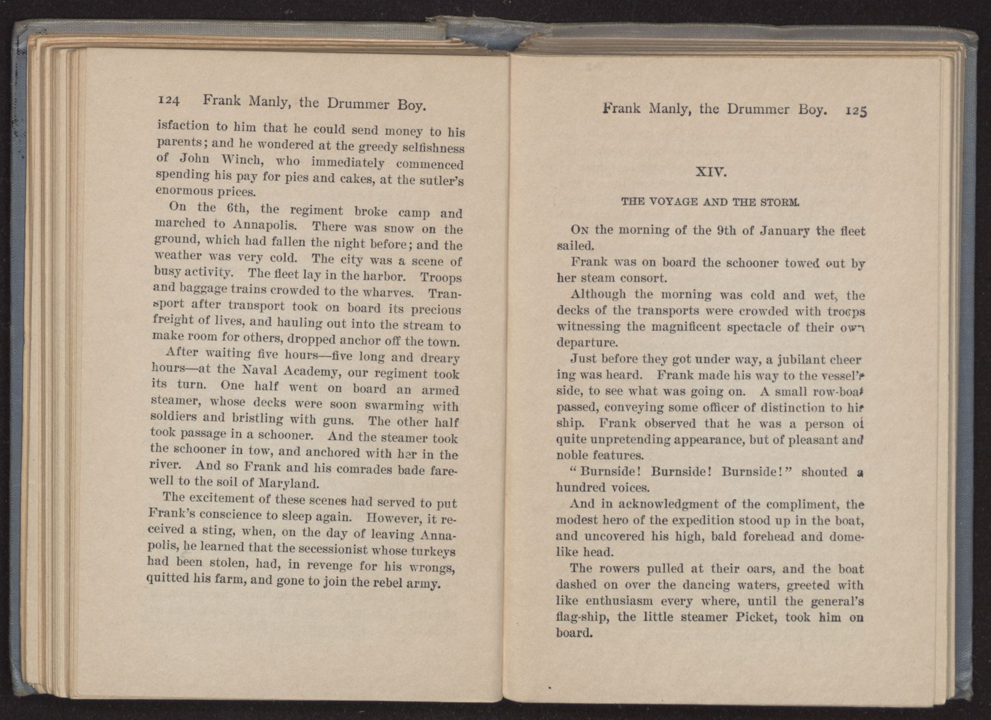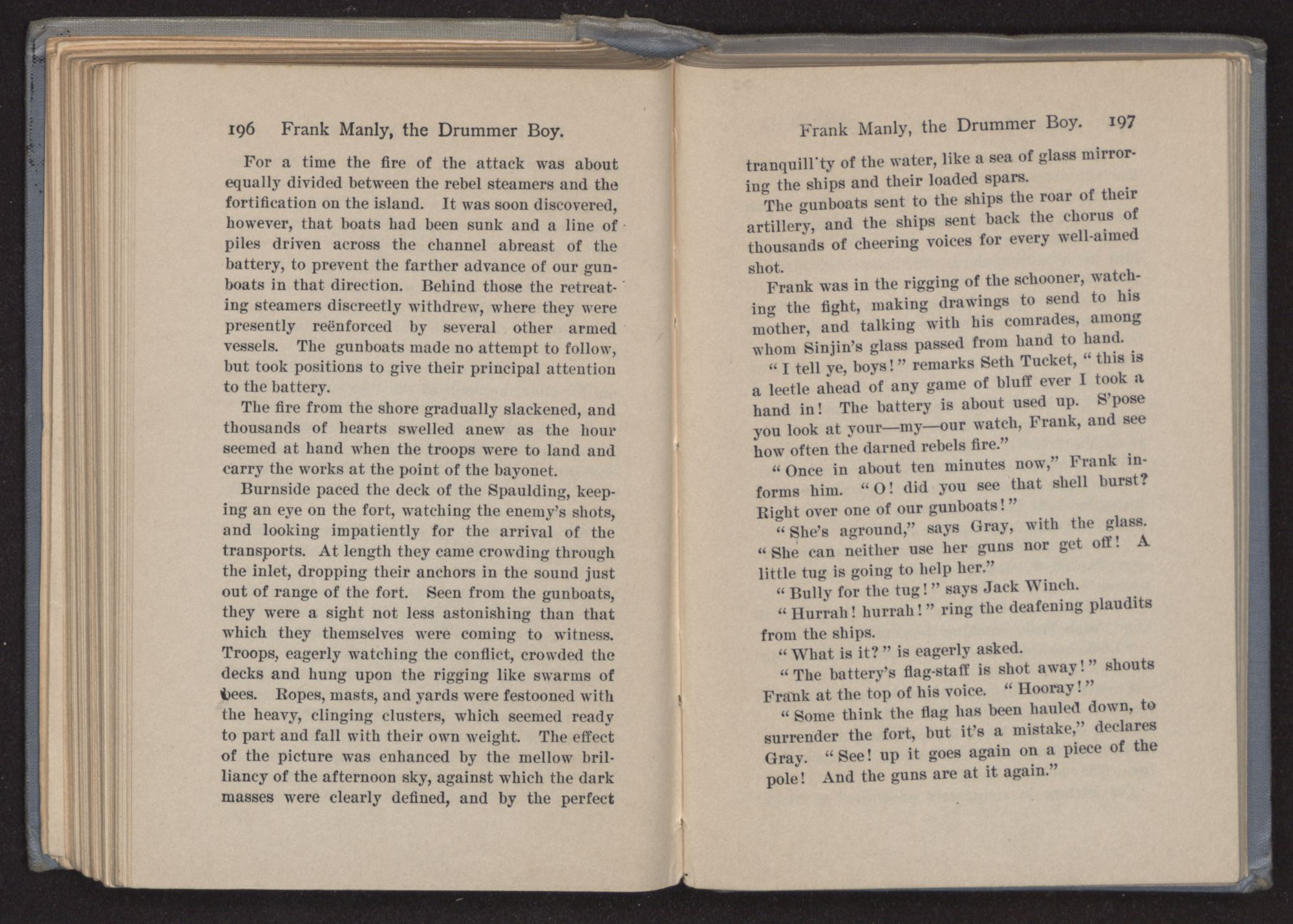 I. FRANK AT HOME.One evening, in the month of October, 1861, the Manly family were gathered together in their little sitting-room, discussing a question of the most serious importance to all of them, and to Frank in particular. Mrs. Manly sat by the table, pretending to sew; but now and then the tears rushed into her eyes, and dropped upon her work, in spite of all she could do to keep them back. Frank watched her with a swelling breast, sorry to see his mother so grieved, and yet glad in one little corner of his heart; for, although she had declared that she could not think of granting his request, he knew well, by those tears of hers, that she was already thinking of granting it.