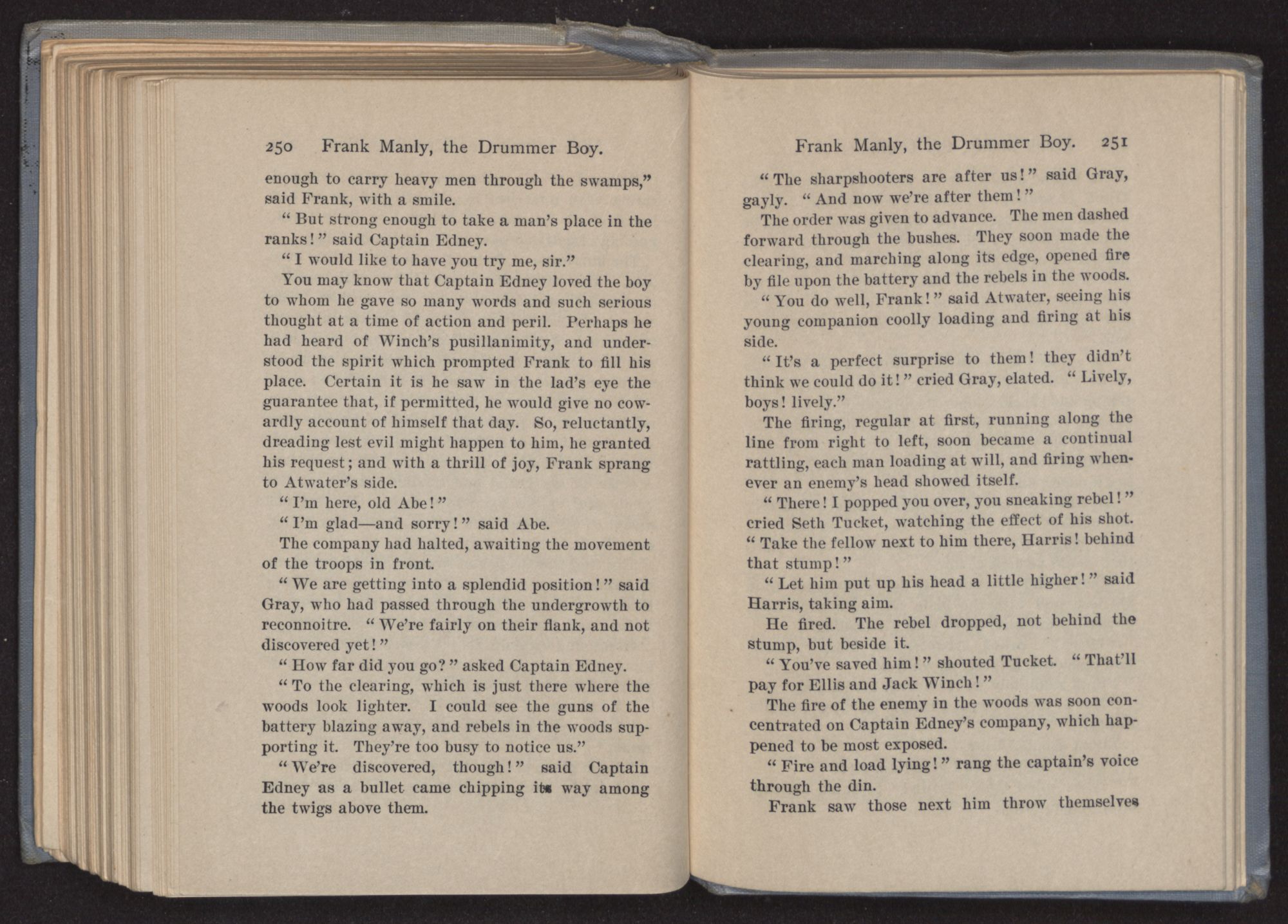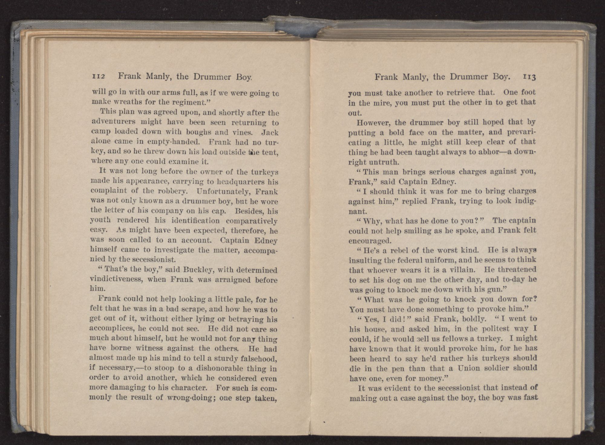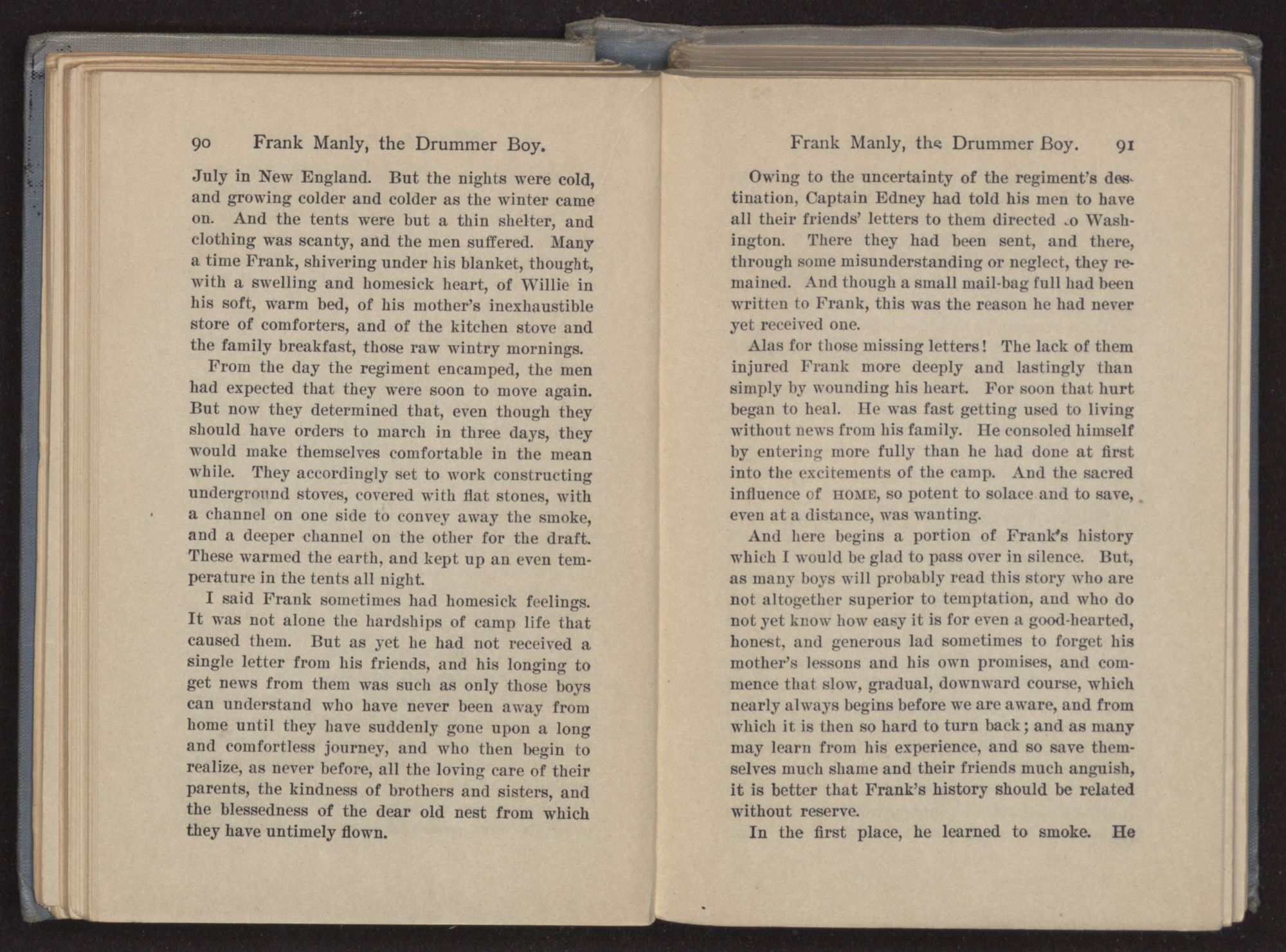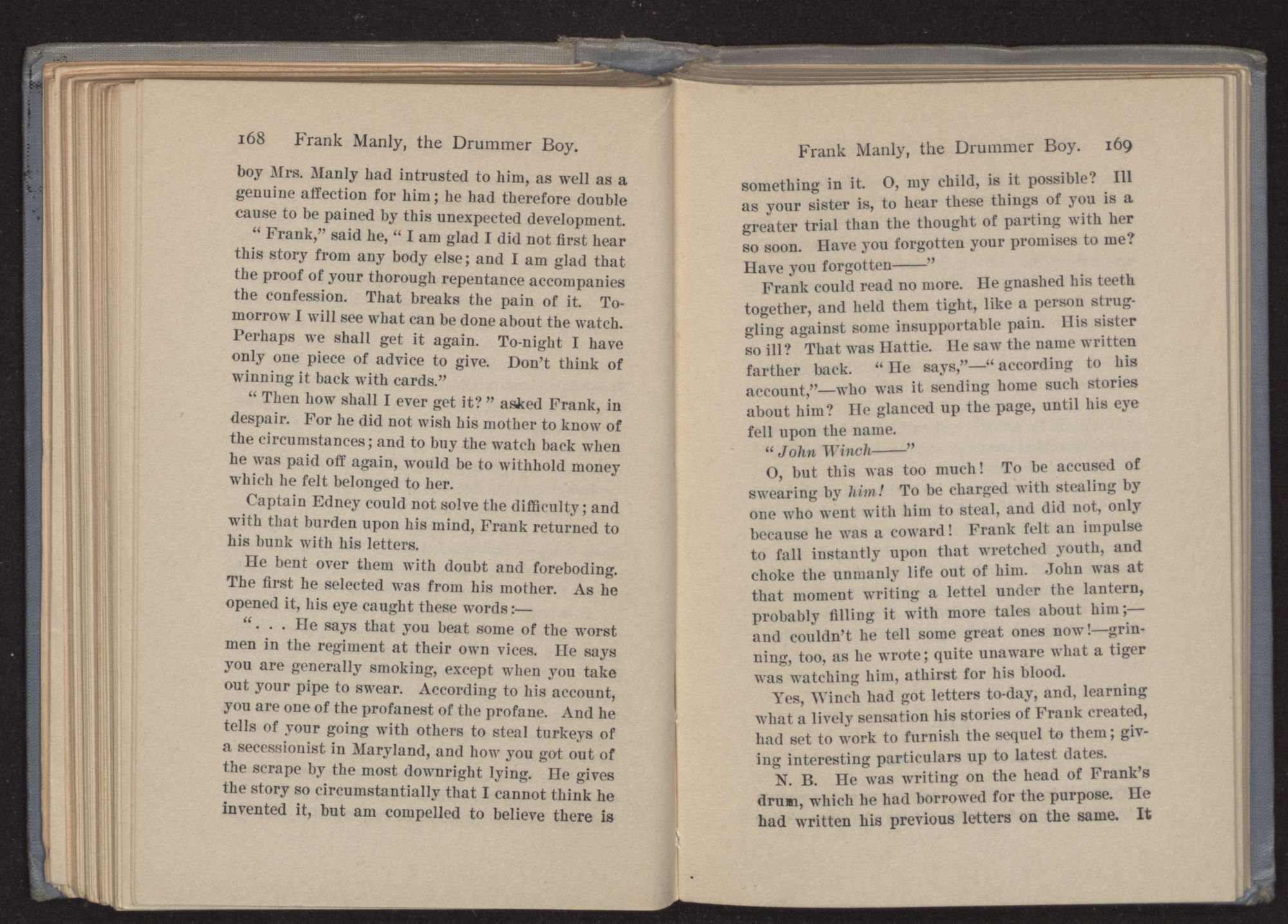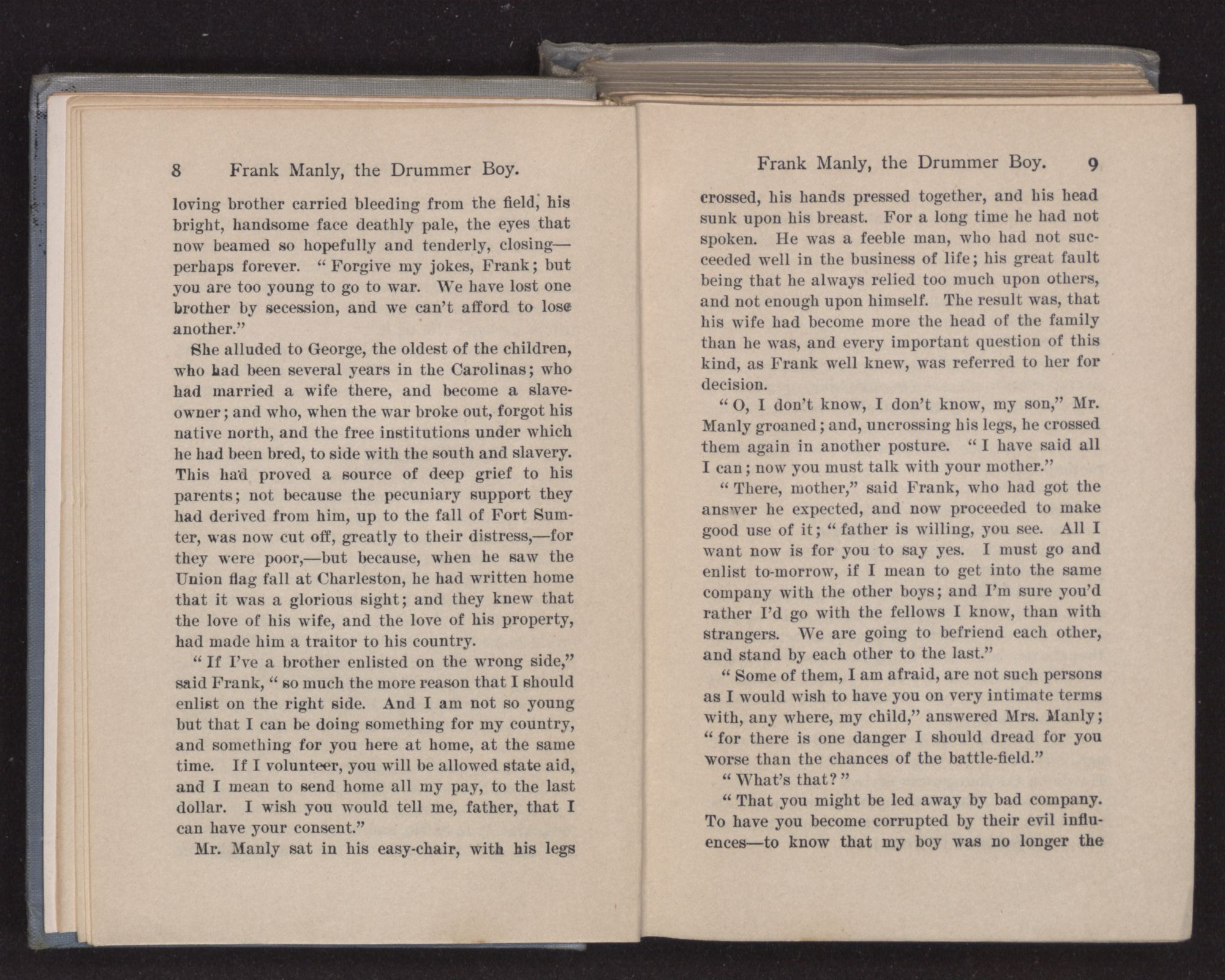 I. FRANK AT HOME.One evening, in the month of October, 1861, the Manly family were gathered together in their little sitting-room, discussing a question of the most serious importance to all of them, and to Frank in particular. Mrs. Manly sat by the table, pretending to sew; but now and then the tears rushed into her eyes, and dropped upon her work, in spite of all she could do to keep them back. Frank watched her with a swelling breast, sorry to see his mother so grieved, and yet glad in one little corner of his heart; for, although she had declared that she could not think of granting his request, he knew well, by those tears of hers, that she was already thinking of granting it.