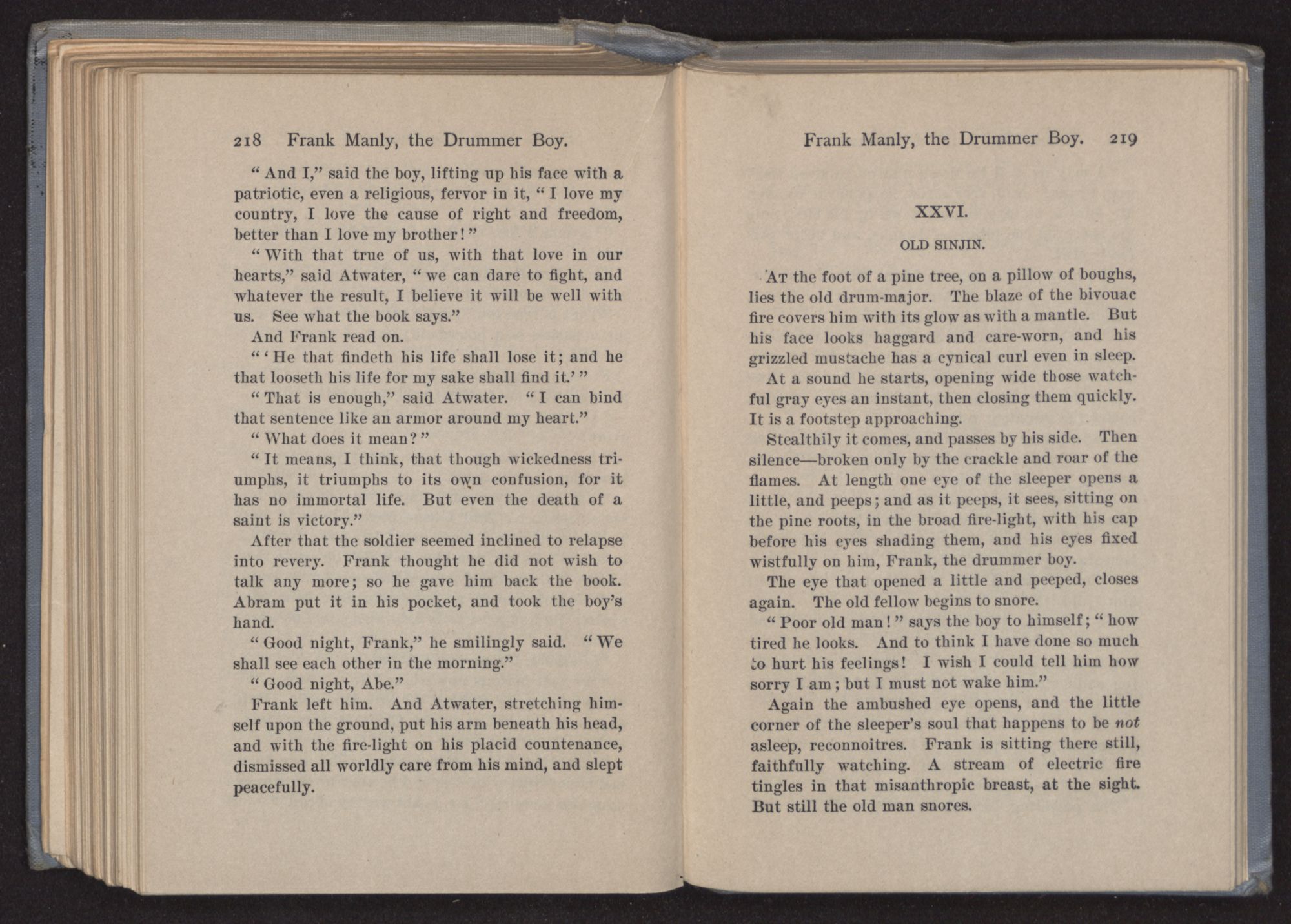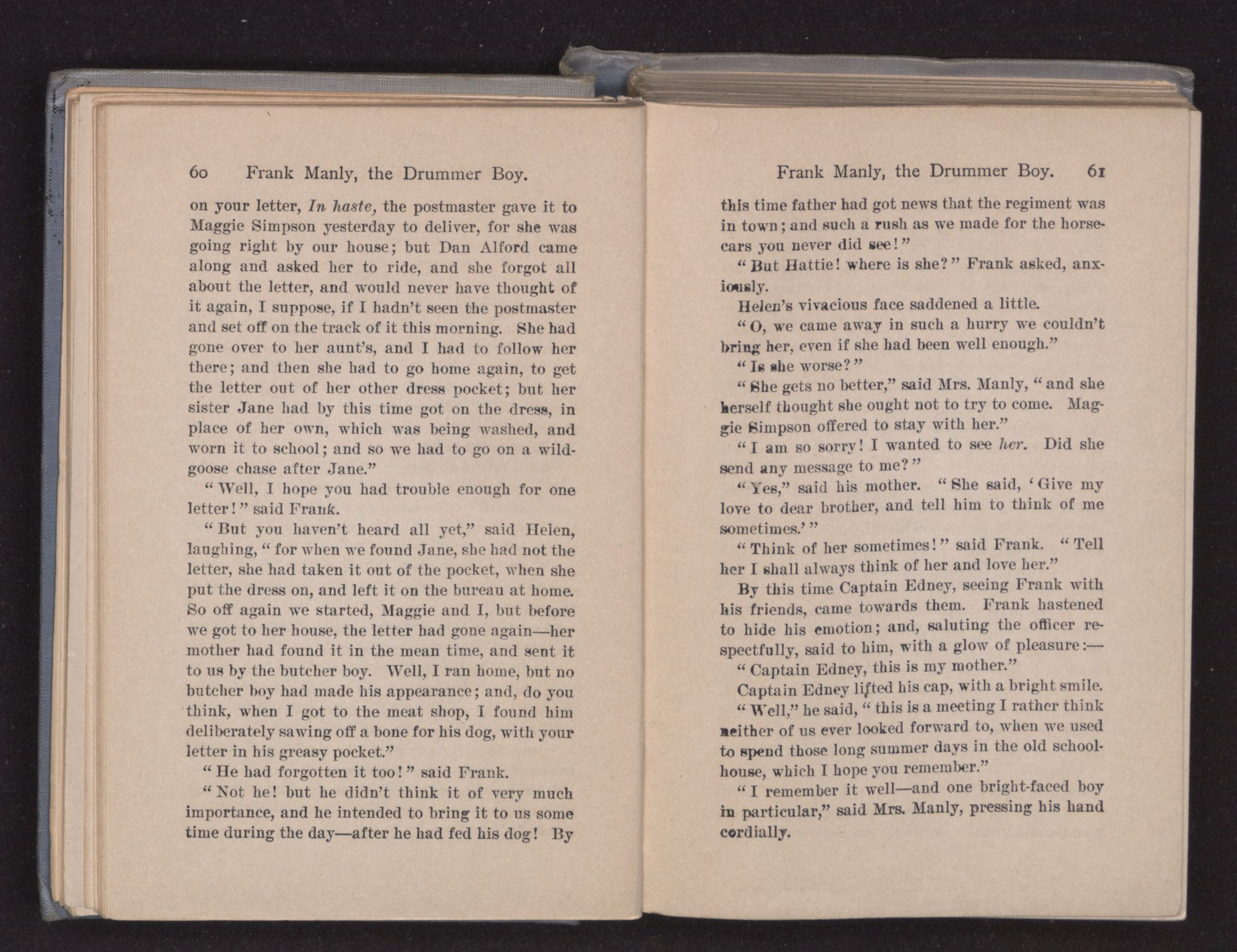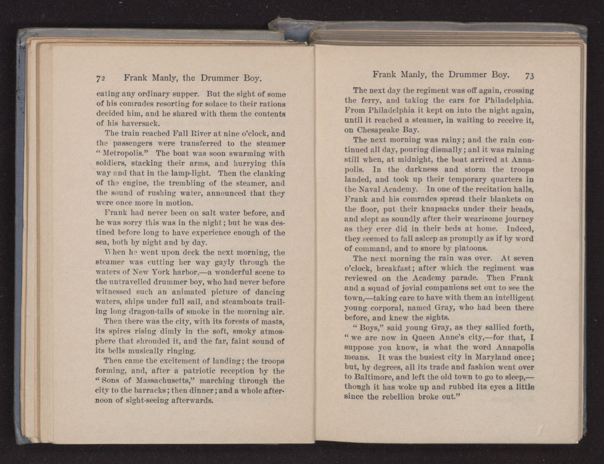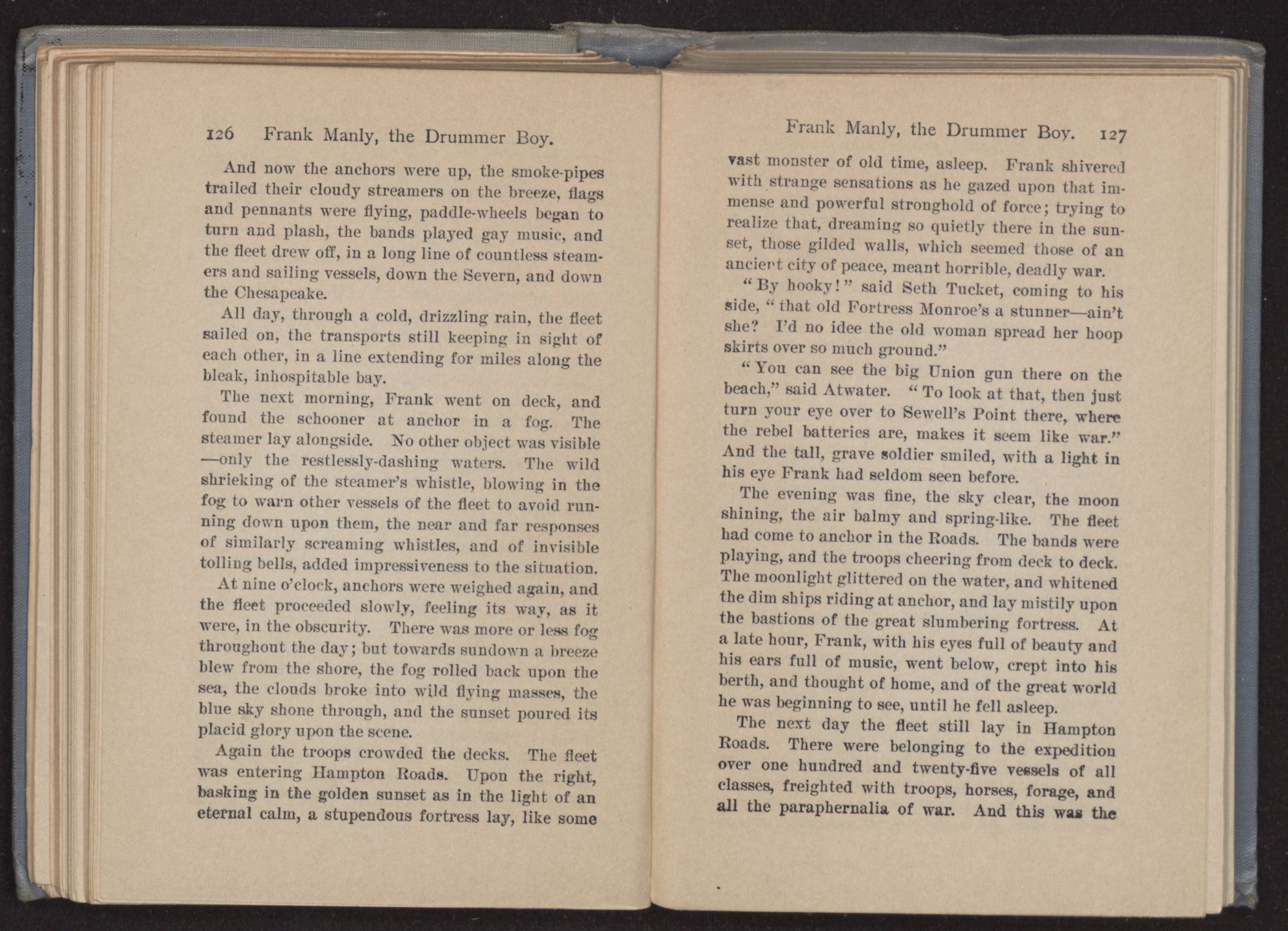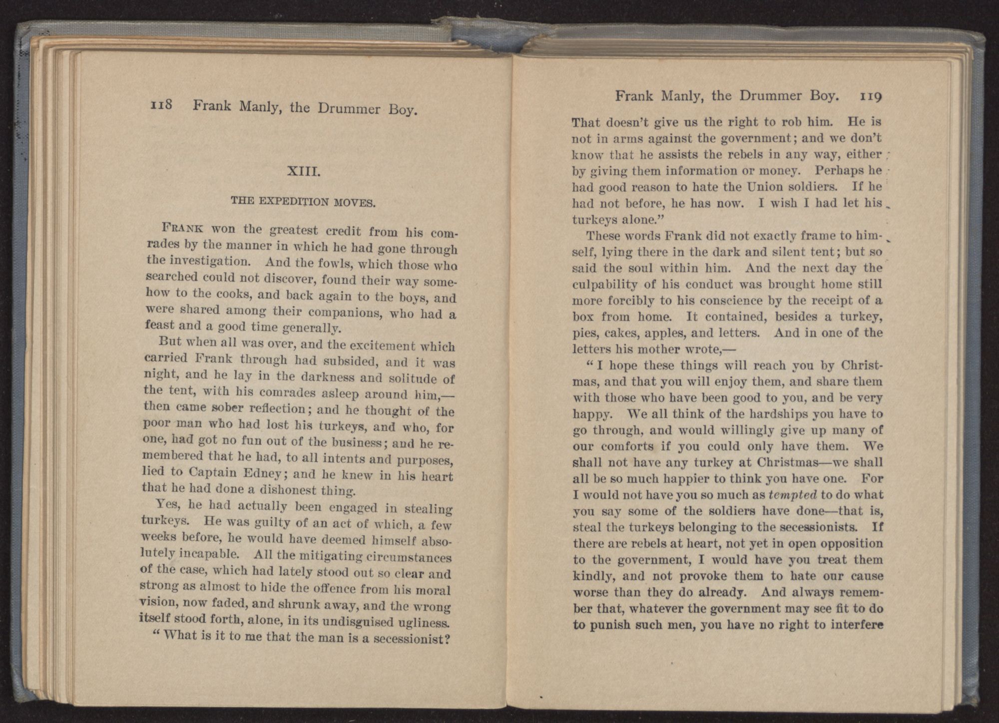 I. FRANK AT HOME.One evening, in the month of October, 1861, the Manly family were gathered together in their little sitting-room, discussing a question of the most serious importance to all of them, and to Frank in particular. Mrs. Manly sat by the table, pretending to sew; but now and then the tears rushed into her eyes, and dropped upon her work, in spite of all she could do to keep them back. Frank watched her with a swelling breast, sorry to see his mother so grieved, and yet glad in one little corner of his heart; for, although she had declared that she could not think of granting his request, he knew well, by those tears of hers, that she was already thinking of granting it.