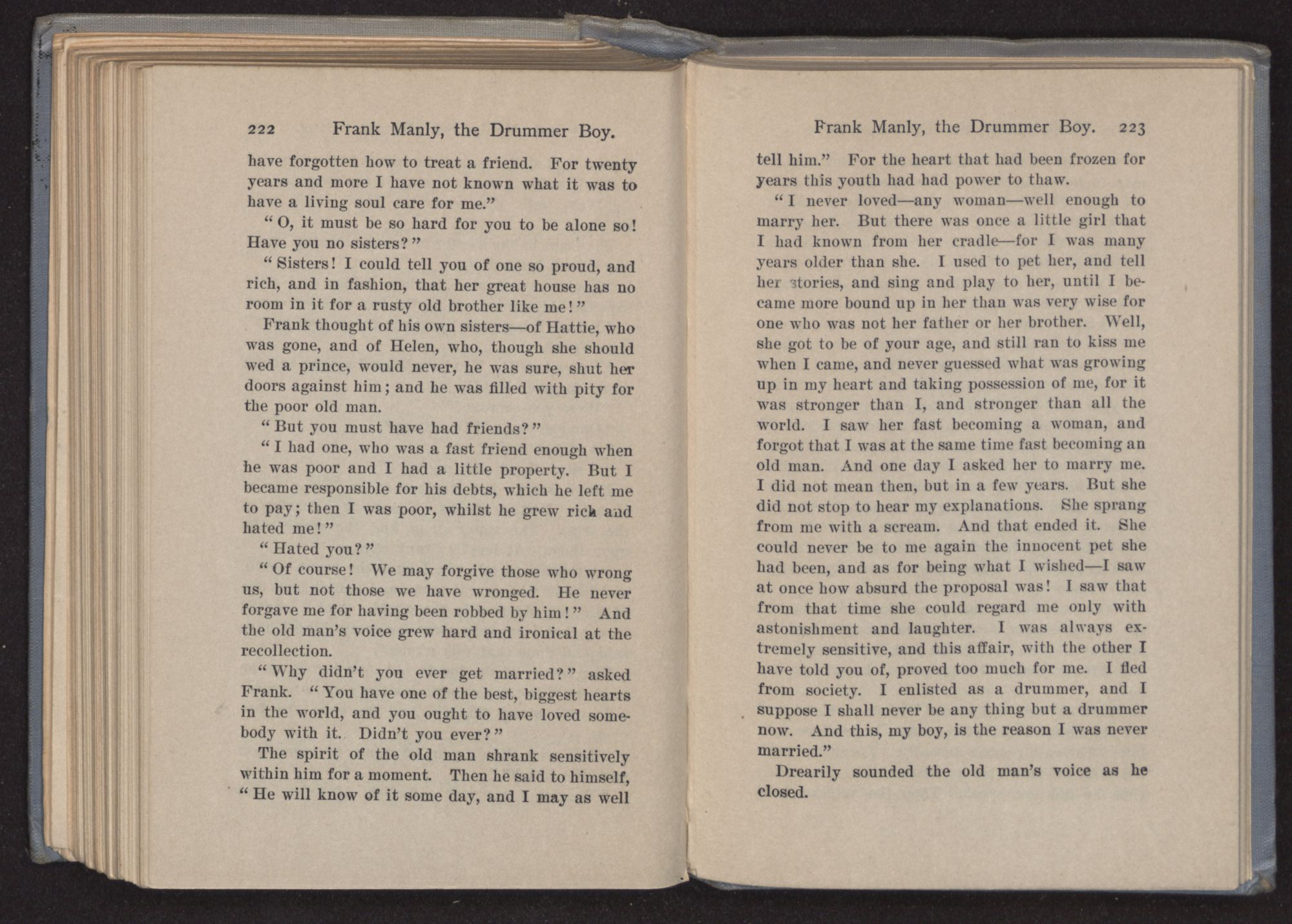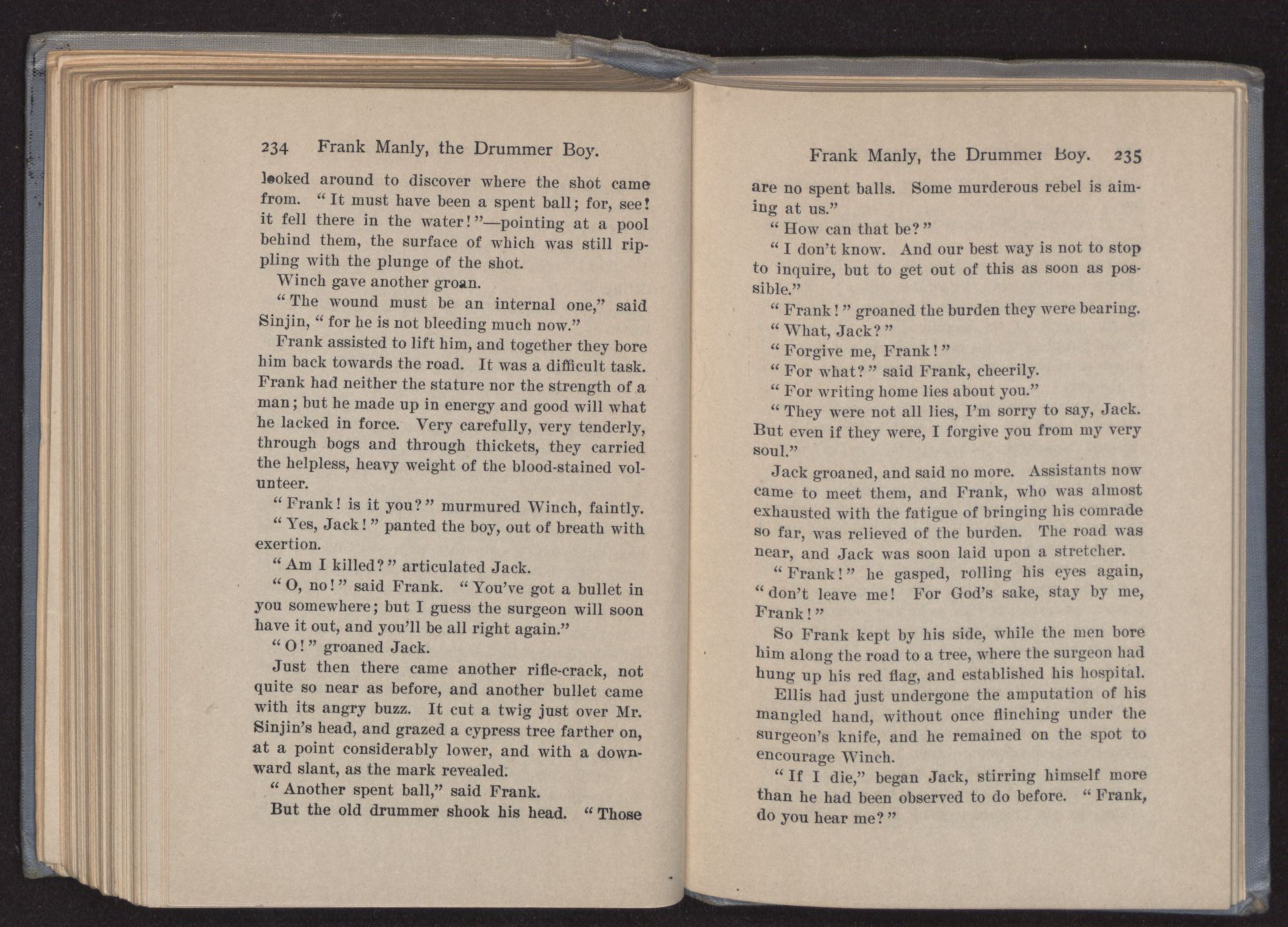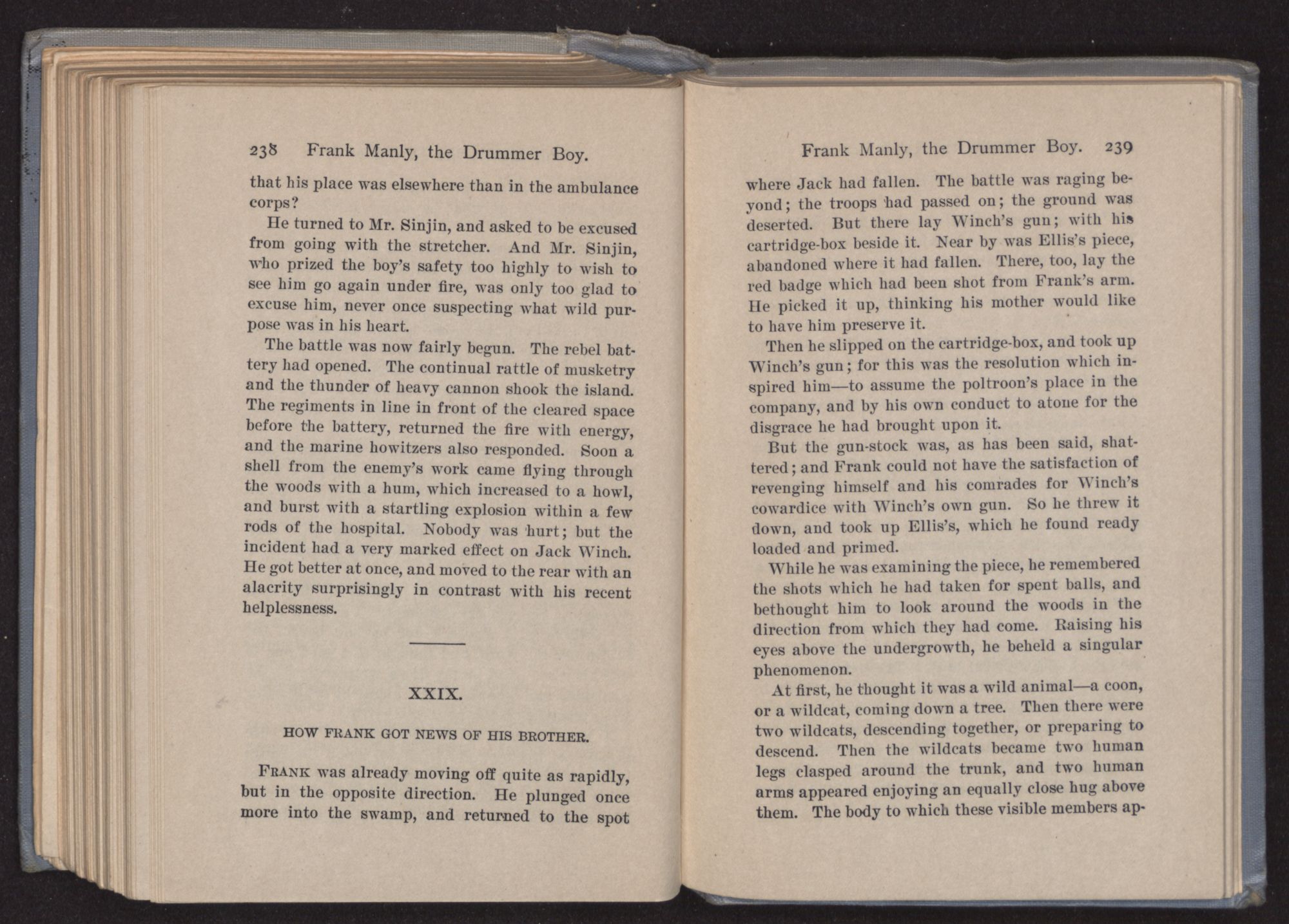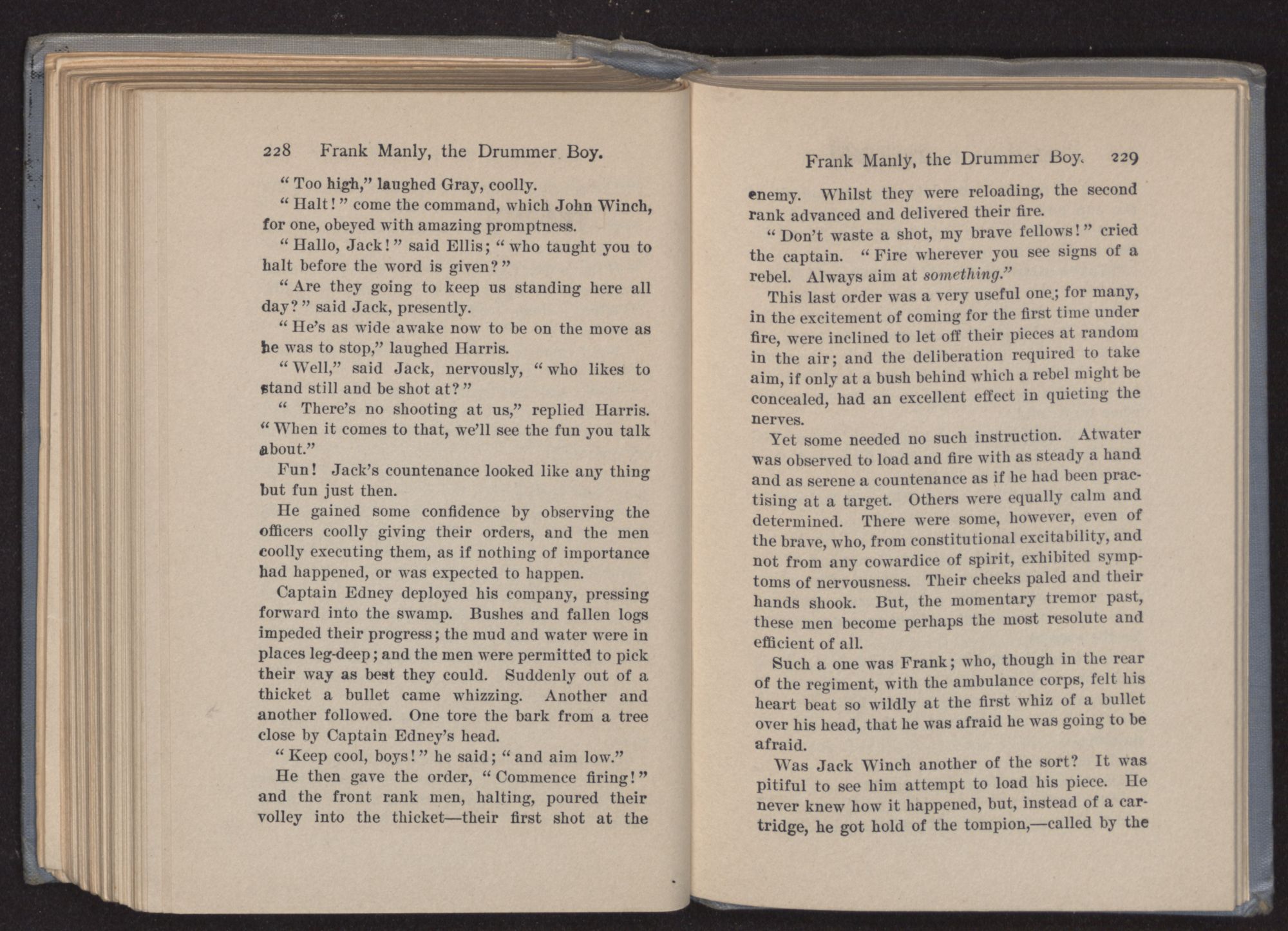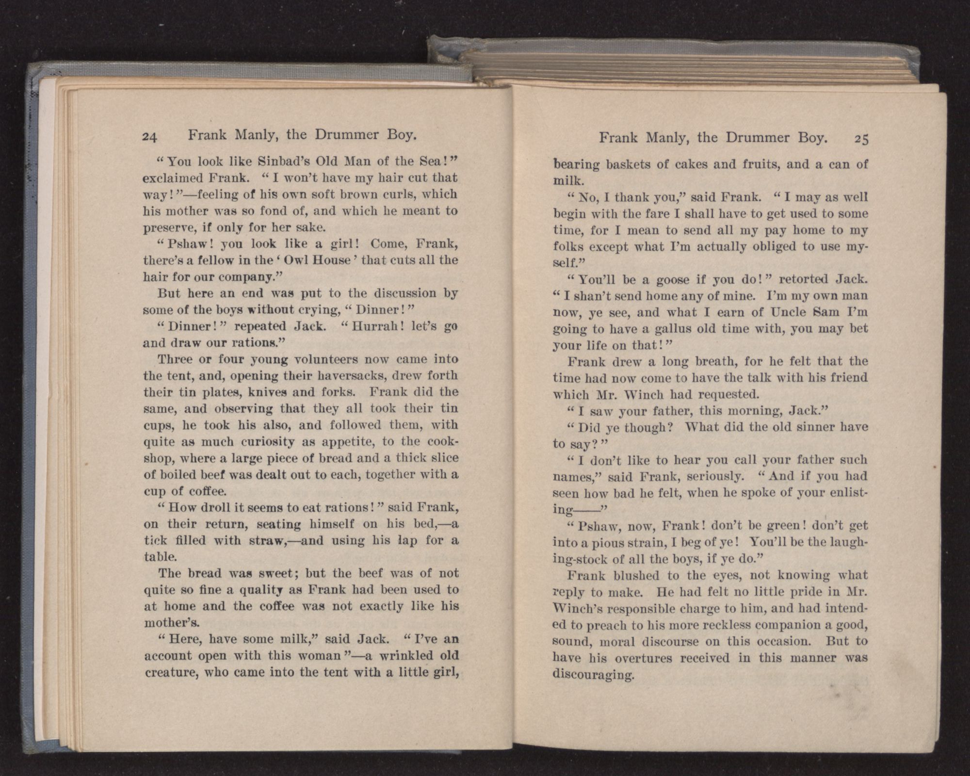 I. FRANK AT HOME.One evening, in the month of October, 1861, the Manly family were gathered together in their little sitting-room, discussing a question of the most serious importance to all of them, and to Frank in particular. Mrs. Manly sat by the table, pretending to sew; but now and then the tears rushed into her eyes, and dropped upon her work, in spite of all she could do to keep them back. Frank watched her with a swelling breast, sorry to see his mother so grieved, and yet glad in one little corner of his heart; for, although she had declared that she could not think of granting his request, he knew well, by those tears of hers, that she was already thinking of granting it.