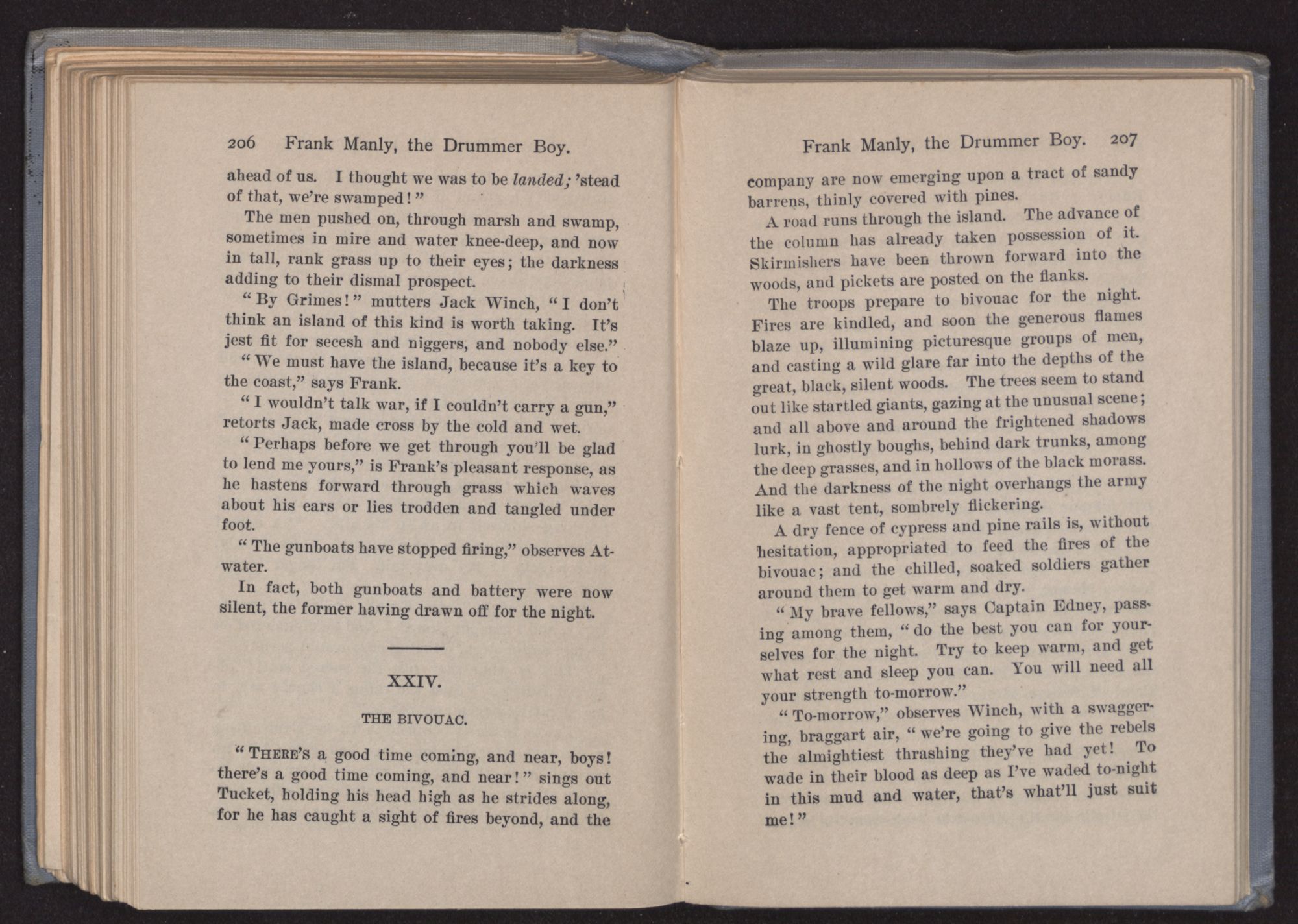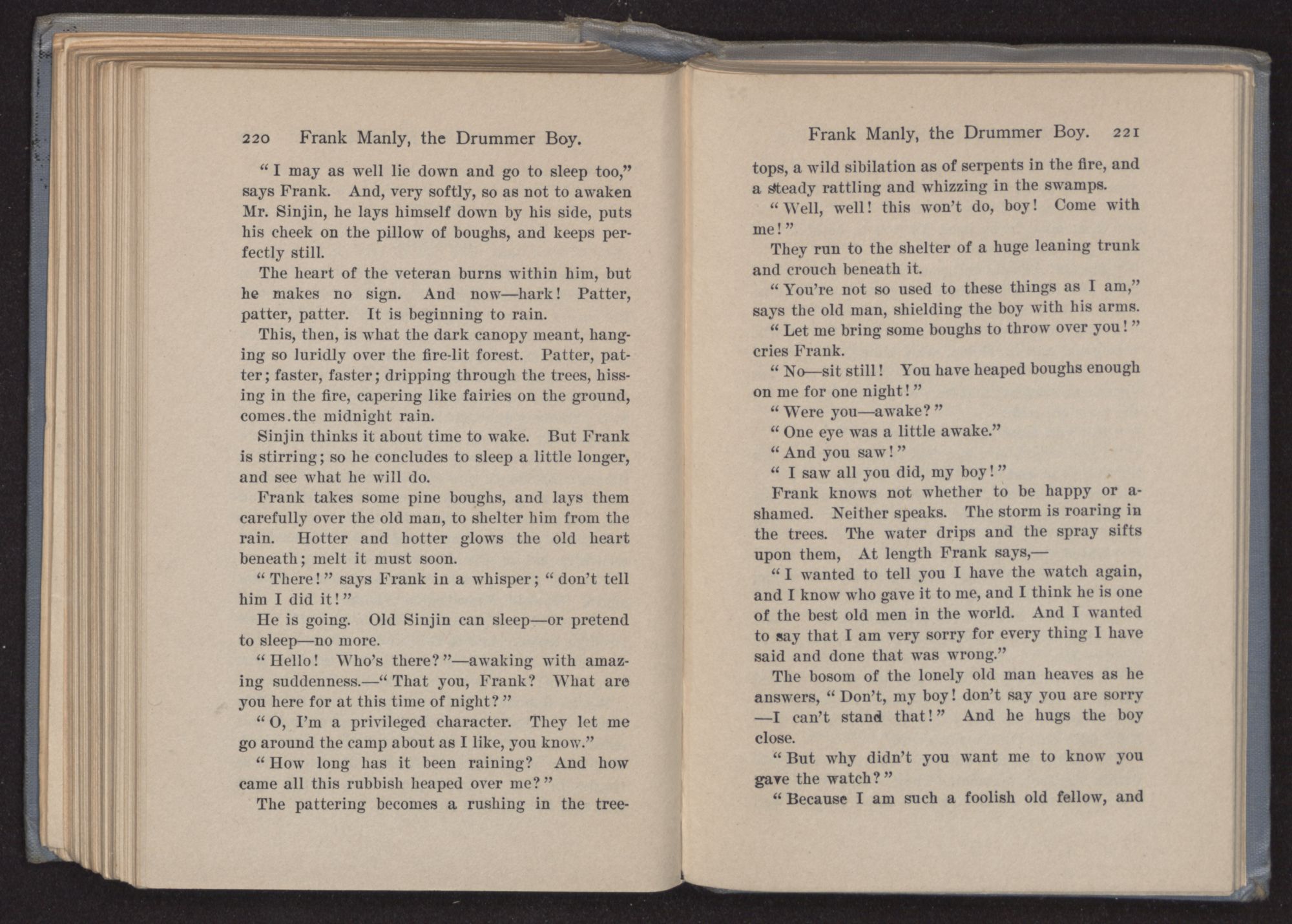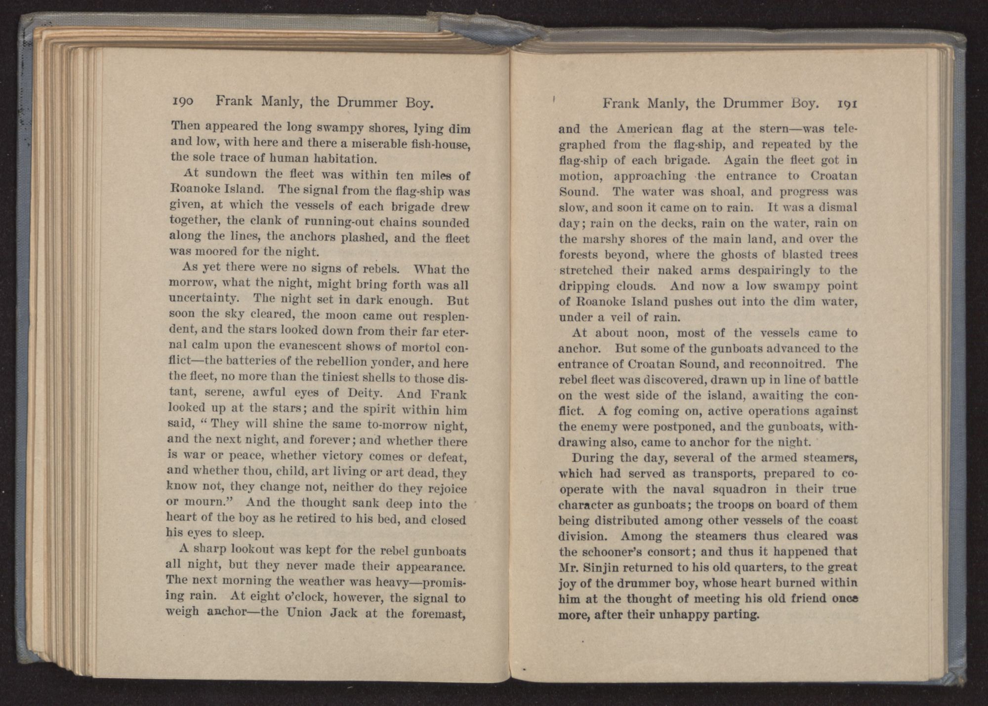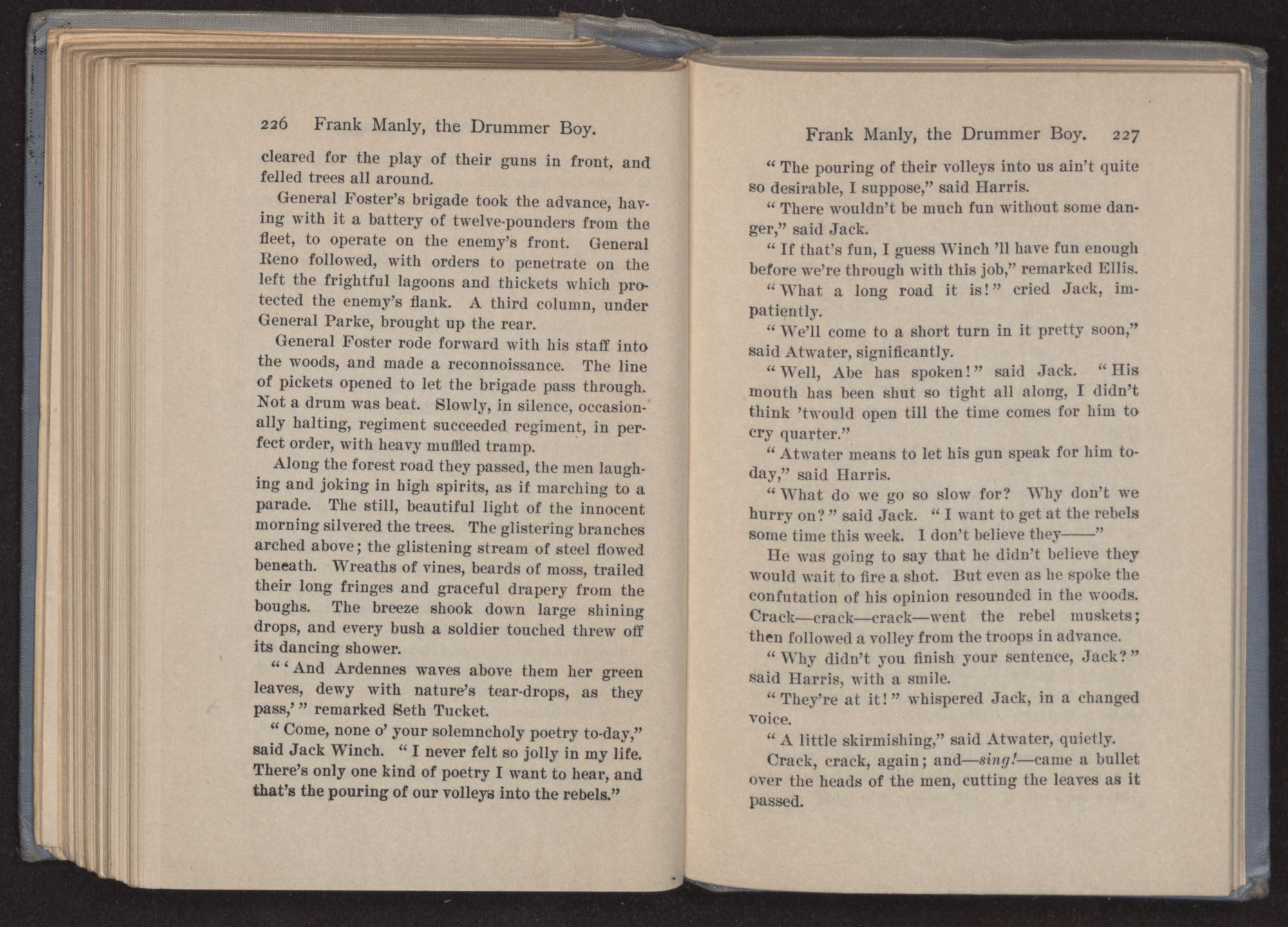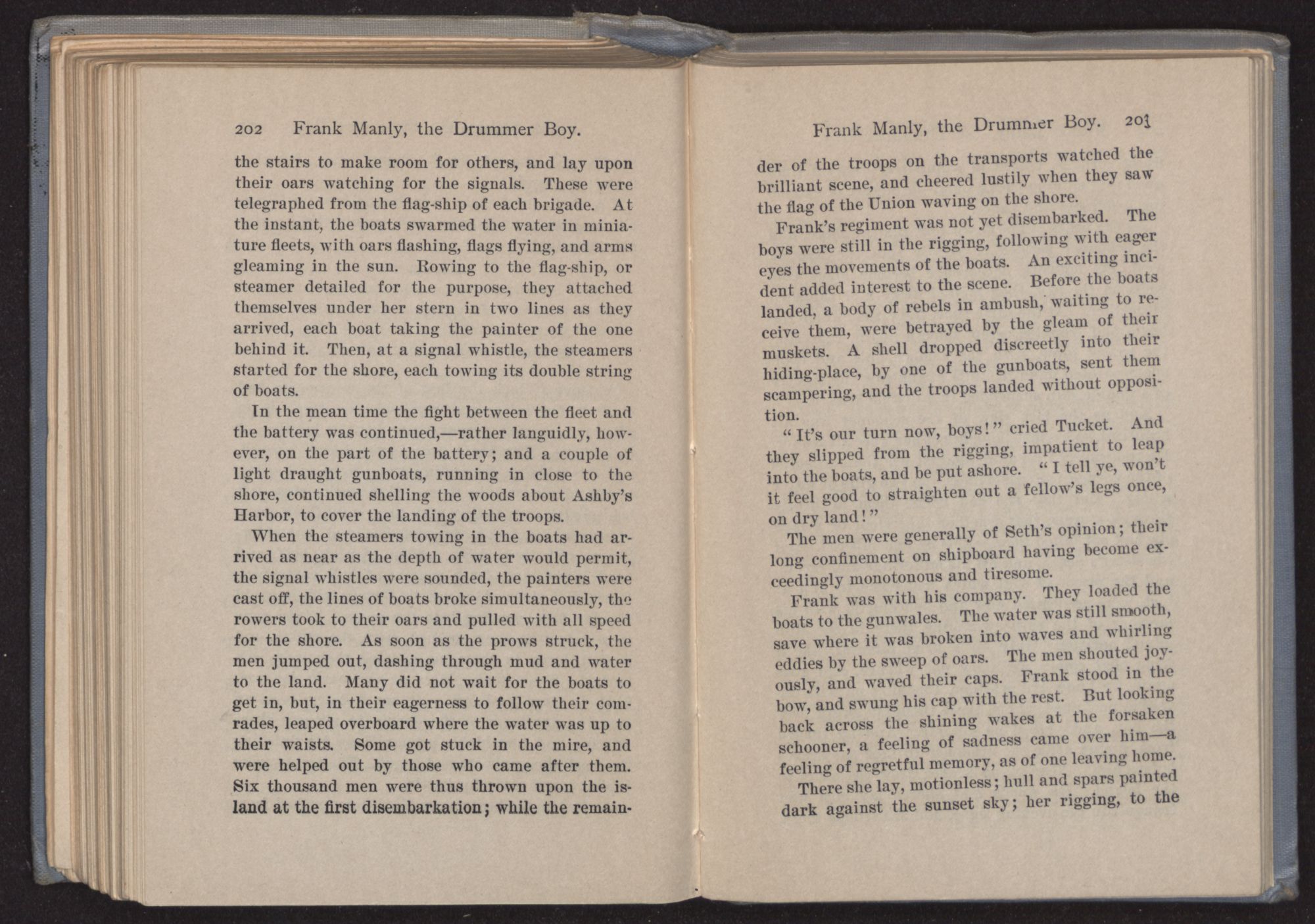 I. FRANK AT HOME.One evening, in the month of October, 1861, the Manly family were gathered together in their little sitting-room, discussing a question of the most serious importance to all of them, and to Frank in particular. Mrs. Manly sat by the table, pretending to sew; but now and then the tears rushed into her eyes, and dropped upon her work, in spite of all she could do to keep them back. Frank watched her with a swelling breast, sorry to see his mother so grieved, and yet glad in one little corner of his heart; for, although she had declared that she could not think of granting his request, he knew well, by those tears of hers, that she was already thinking of granting it.