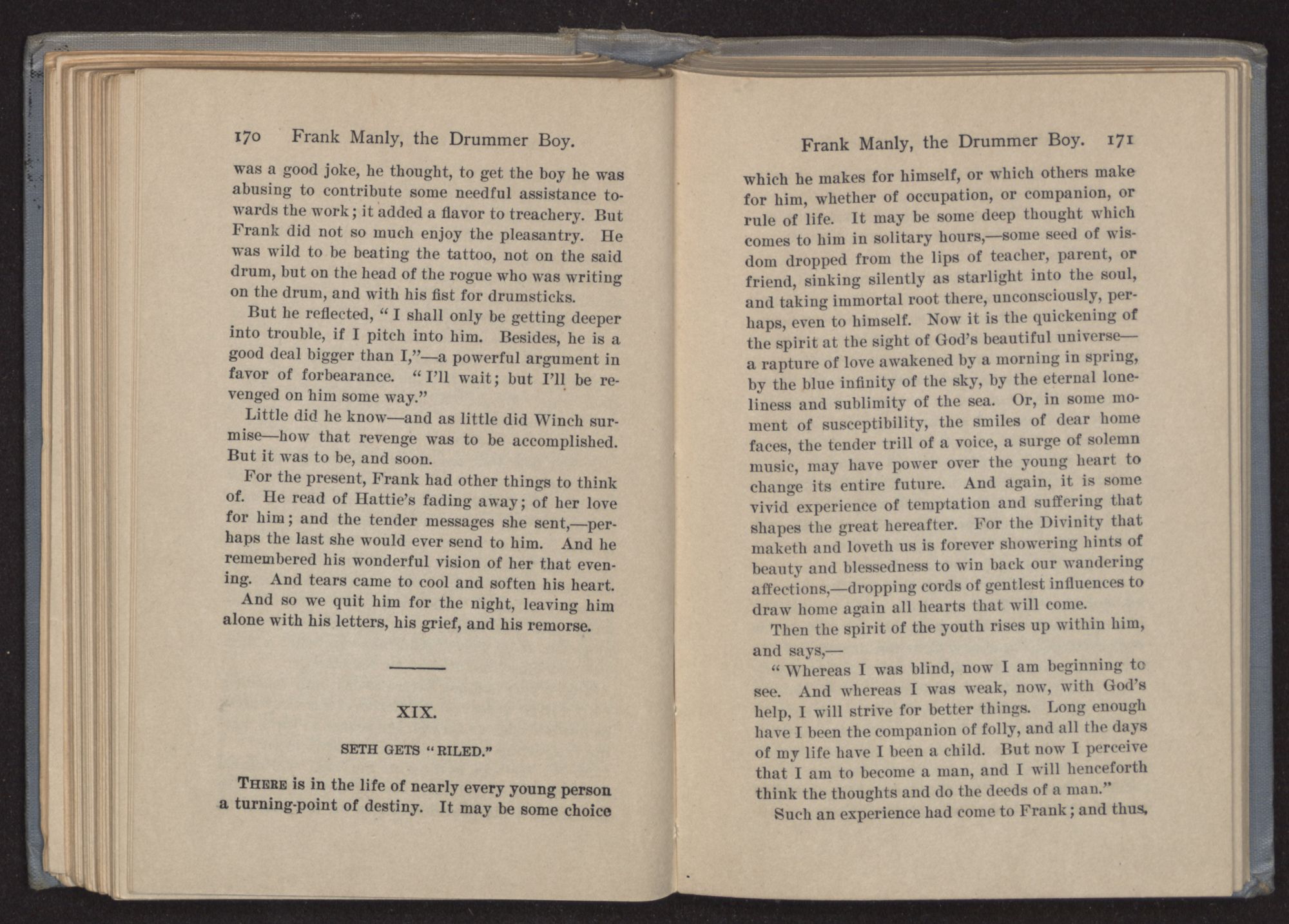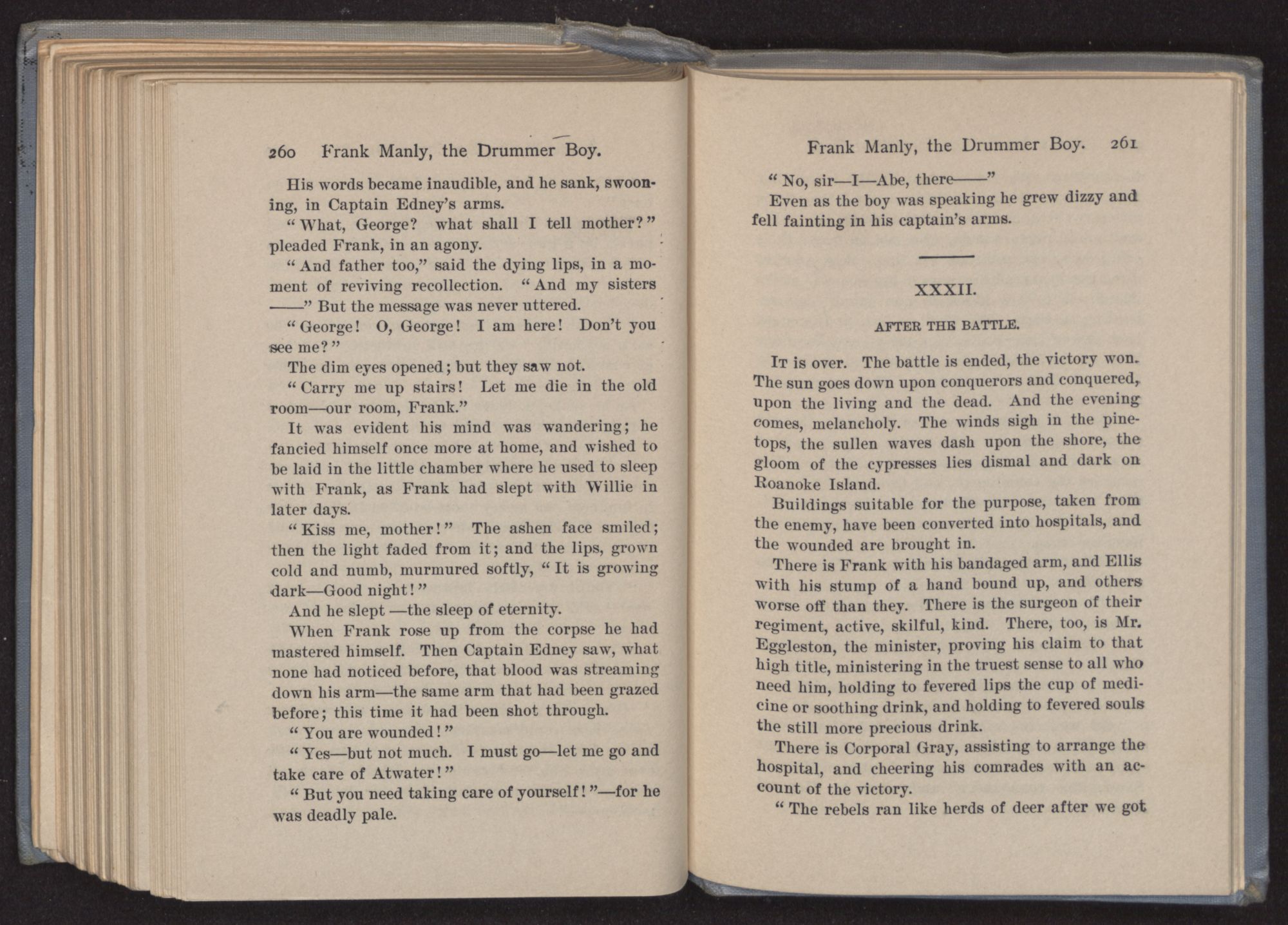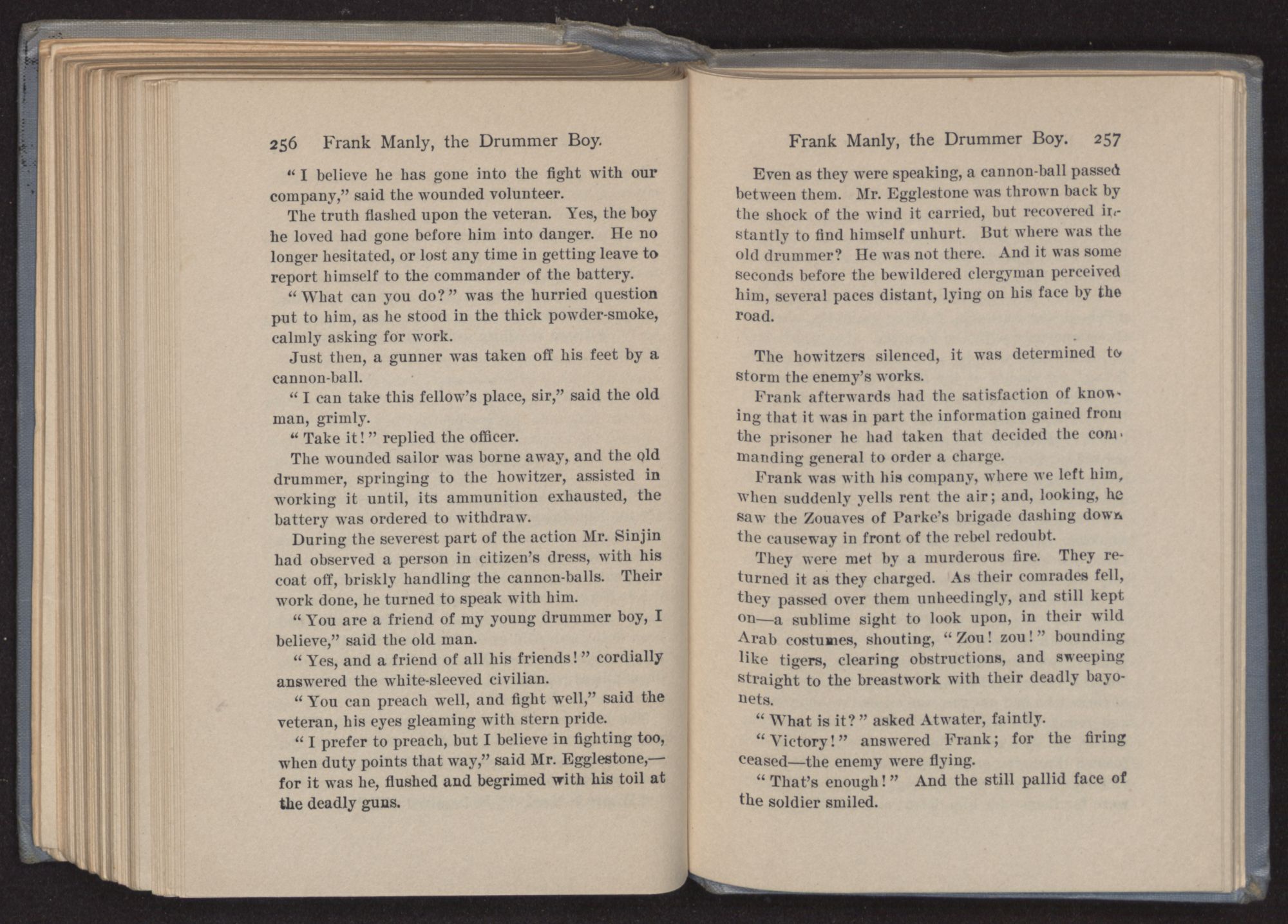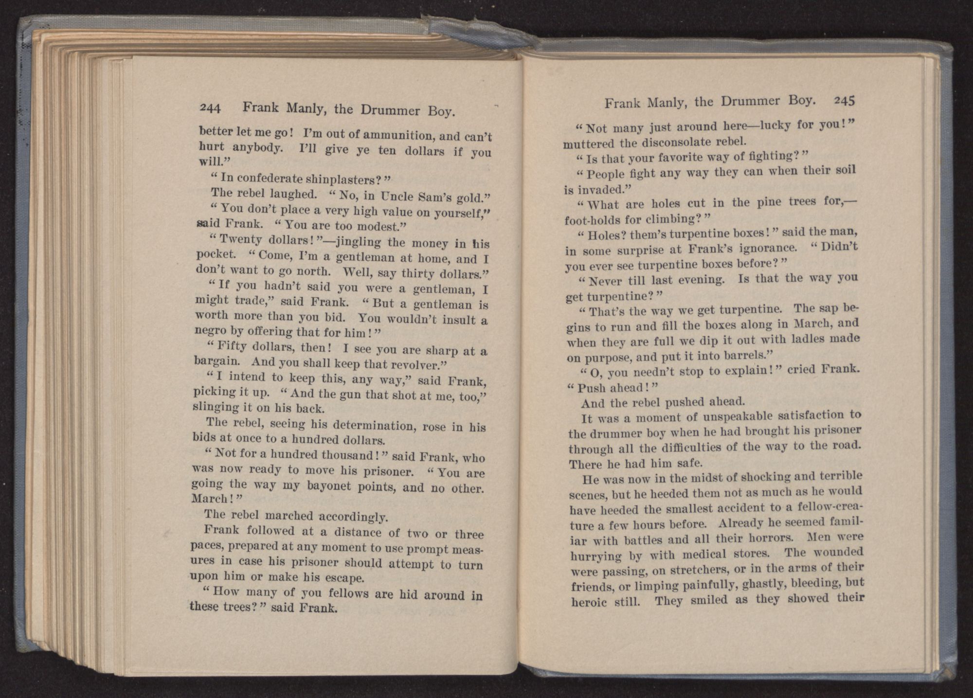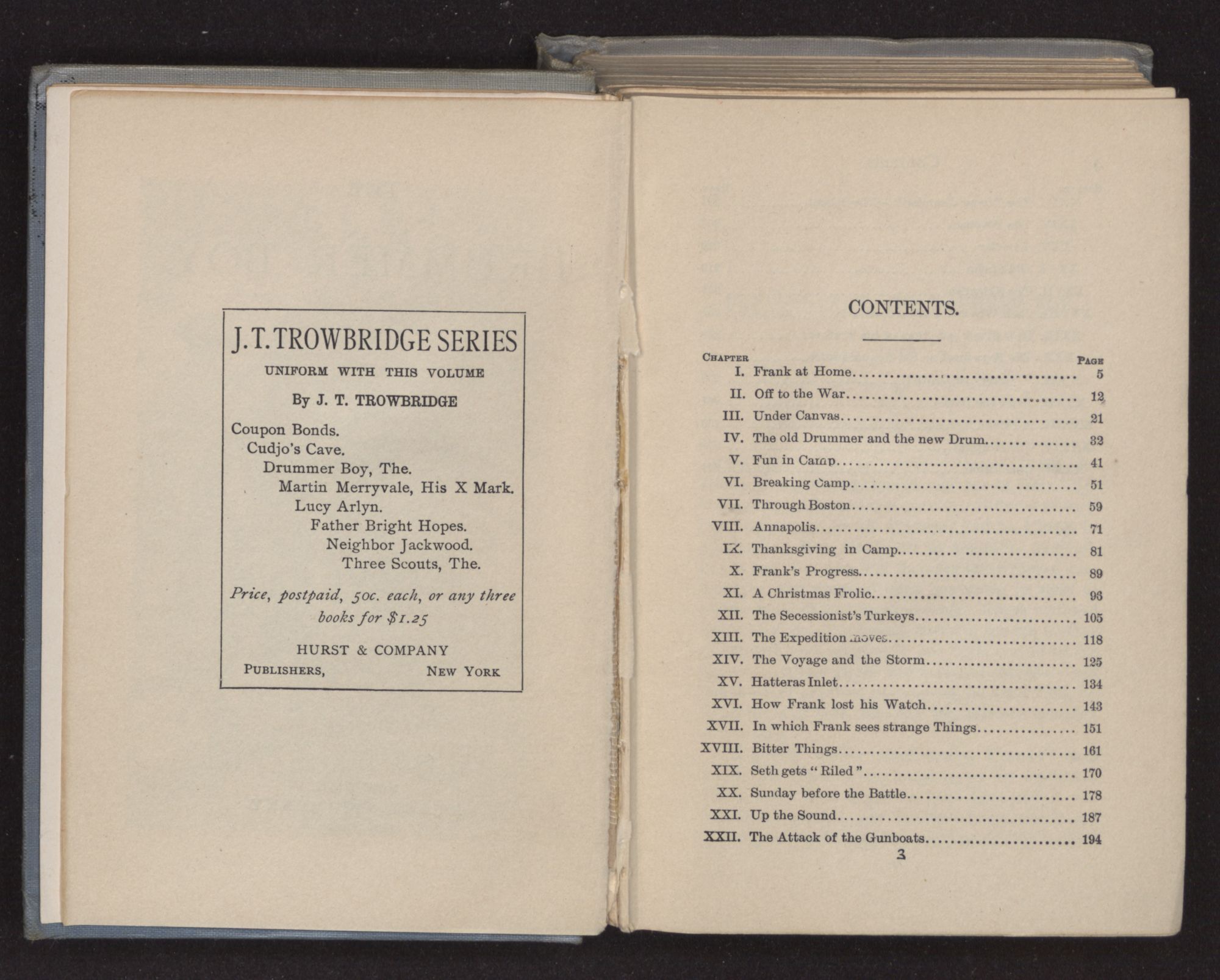 I. FRANK AT HOME.One evening, in the month of October, 1861, the Manly family were gathered together in their little sitting-room, discussing a question of the most serious importance to all of them, and to Frank in particular. Mrs. Manly sat by the table, pretending to sew; but now and then the tears rushed into her eyes, and dropped upon her work, in spite of all she could do to keep them back. Frank watched her with a swelling breast, sorry to see his mother so grieved, and yet glad in one little corner of his heart; for, although she had declared that she could not think of granting his request, he knew well, by those tears of hers, that she was already thinking of granting it.