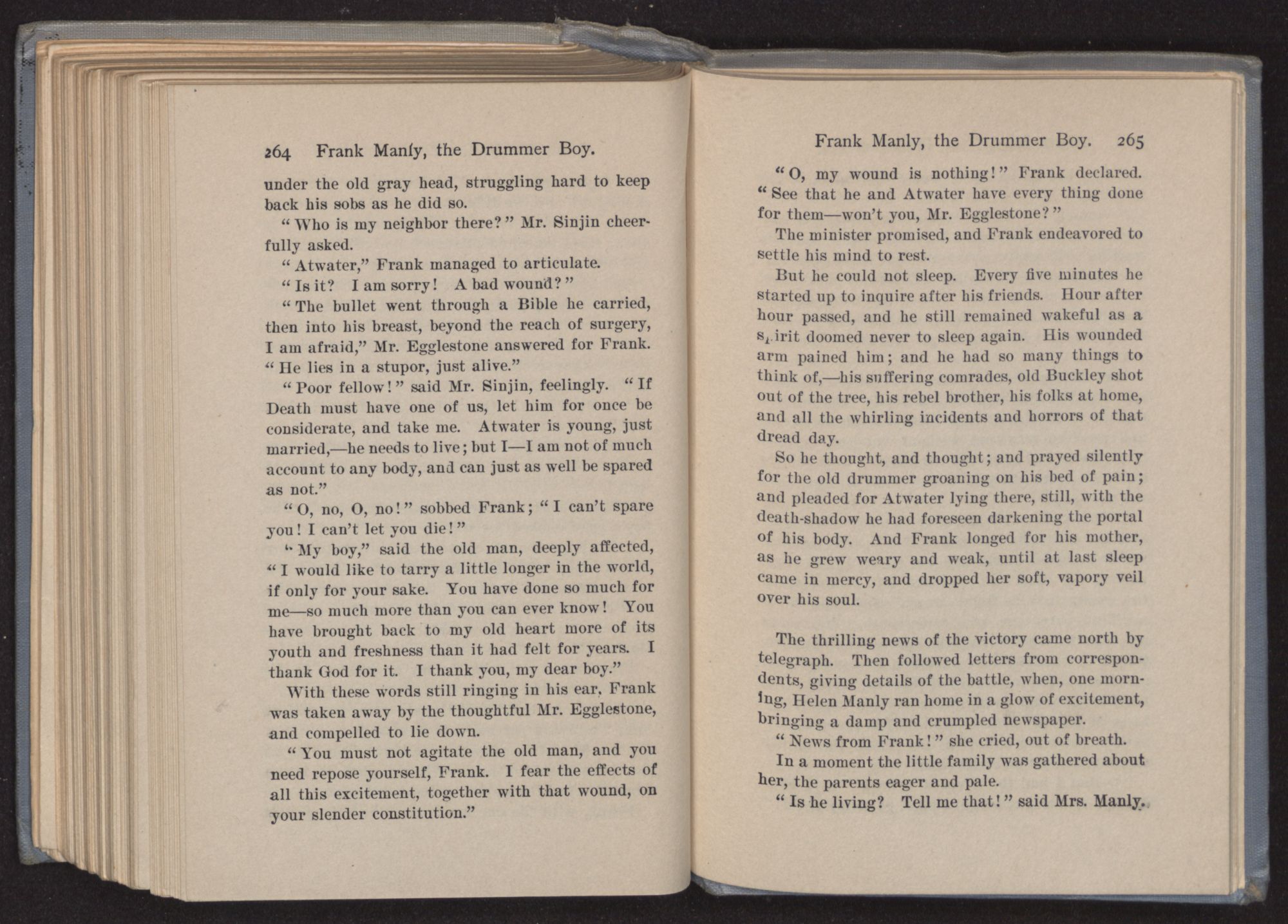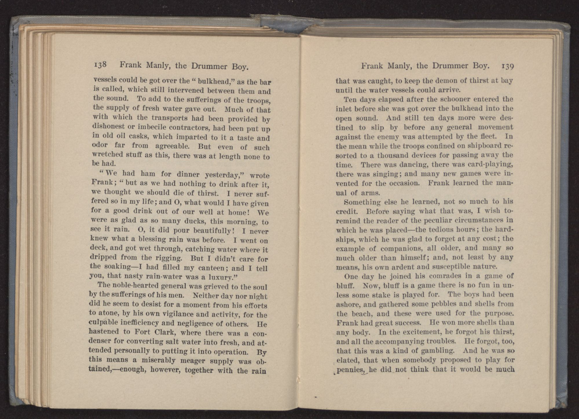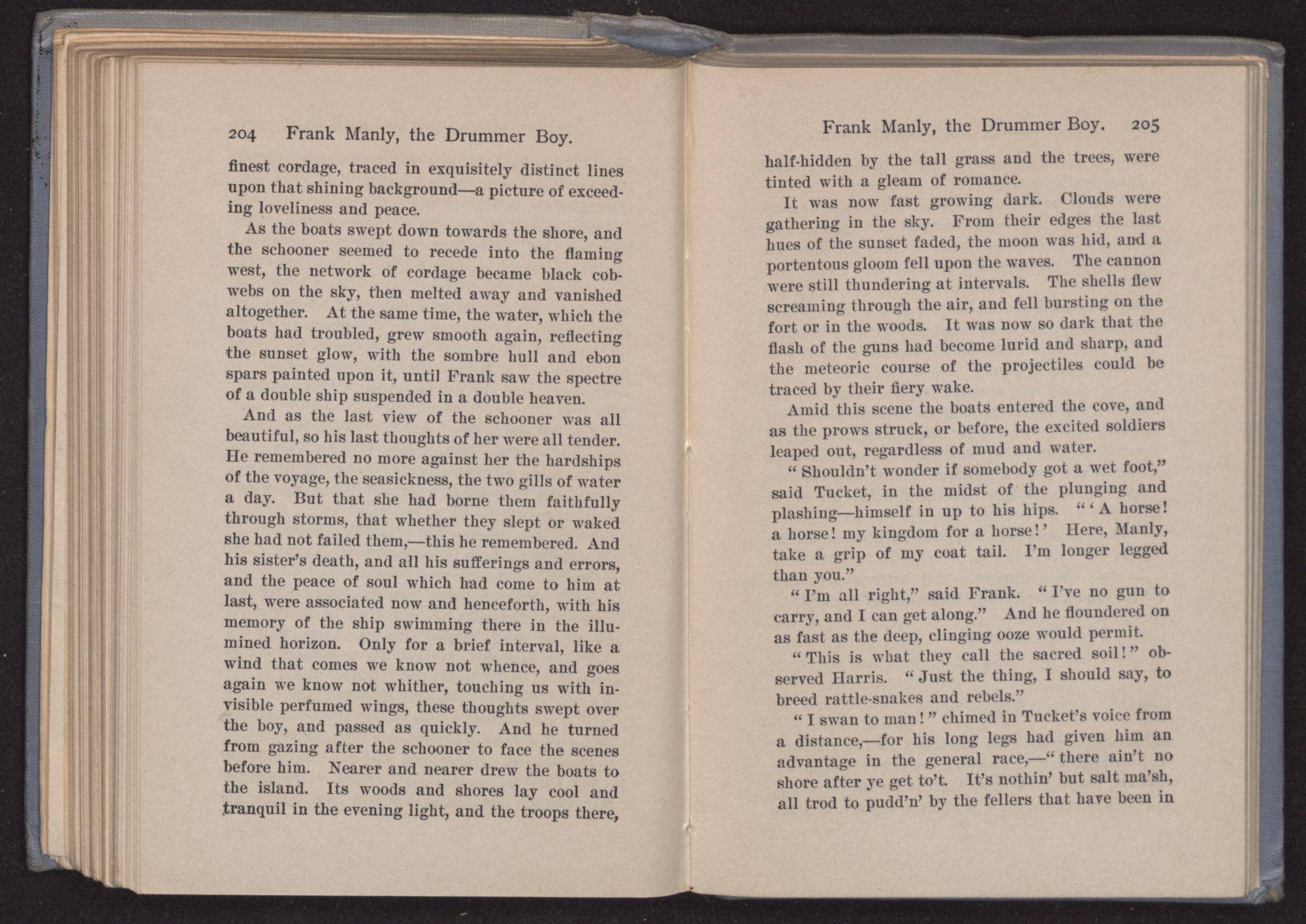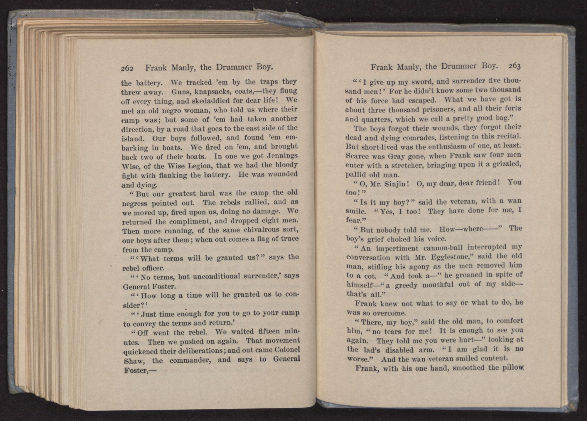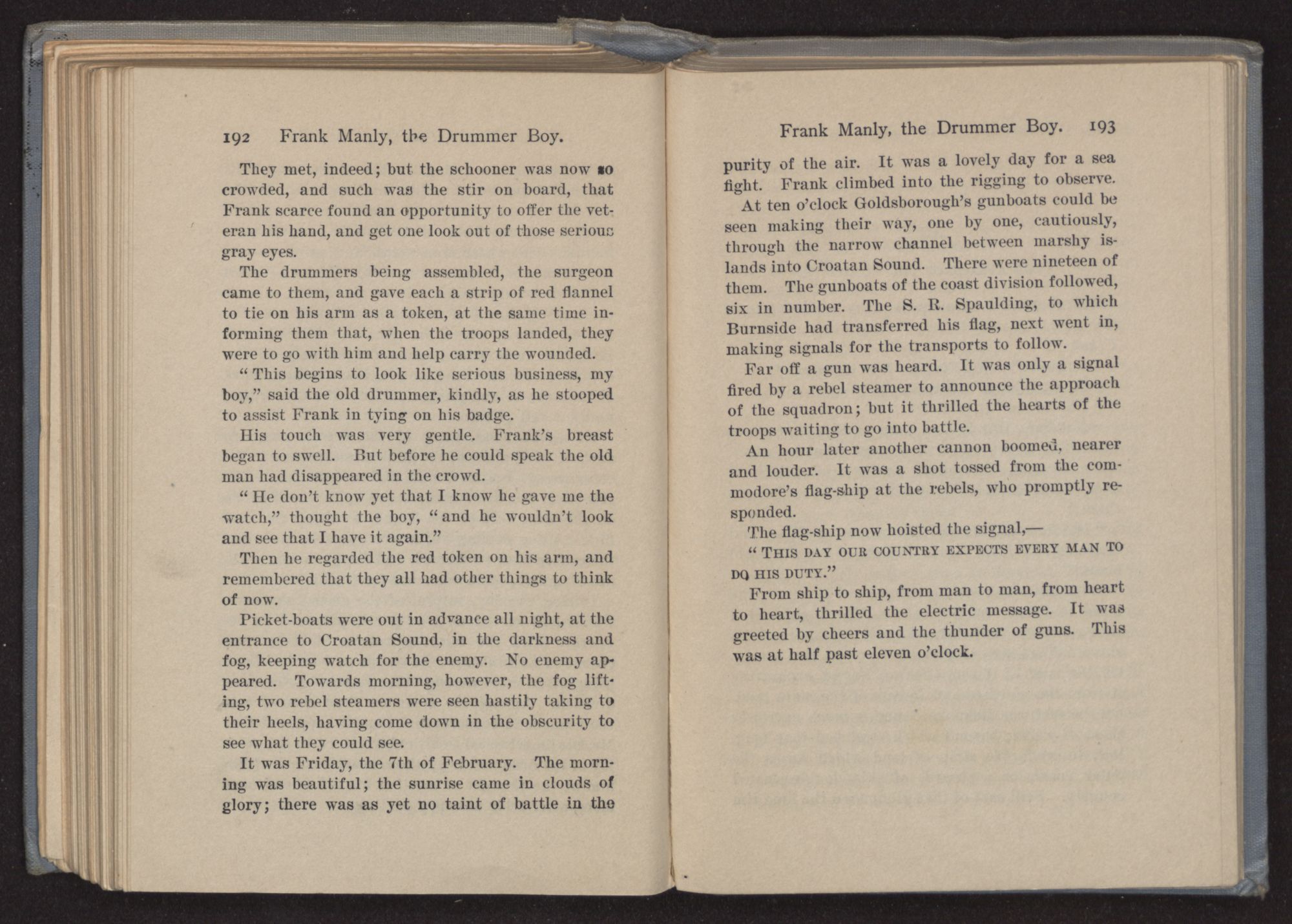 I. FRANK AT HOME.One evening, in the month of October, 1861, the Manly family were gathered together in their little sitting-room, discussing a question of the most serious importance to all of them, and to Frank in particular. Mrs. Manly sat by the table, pretending to sew; but now and then the tears rushed into her eyes, and dropped upon her work, in spite of all she could do to keep them back. Frank watched her with a swelling breast, sorry to see his mother so grieved, and yet glad in one little corner of his heart; for, although she had declared that she could not think of granting his request, he knew well, by those tears of hers, that she was already thinking of granting it.