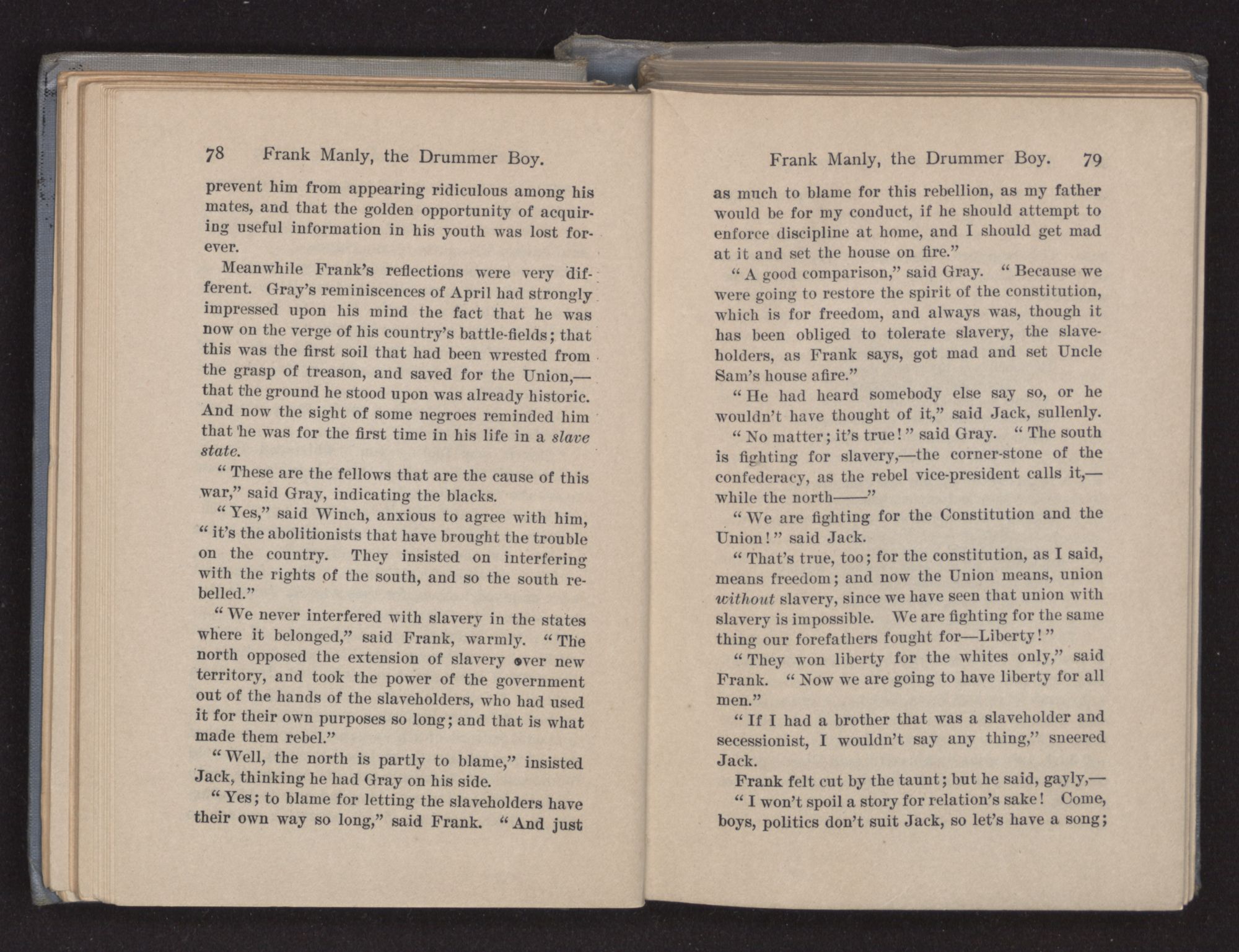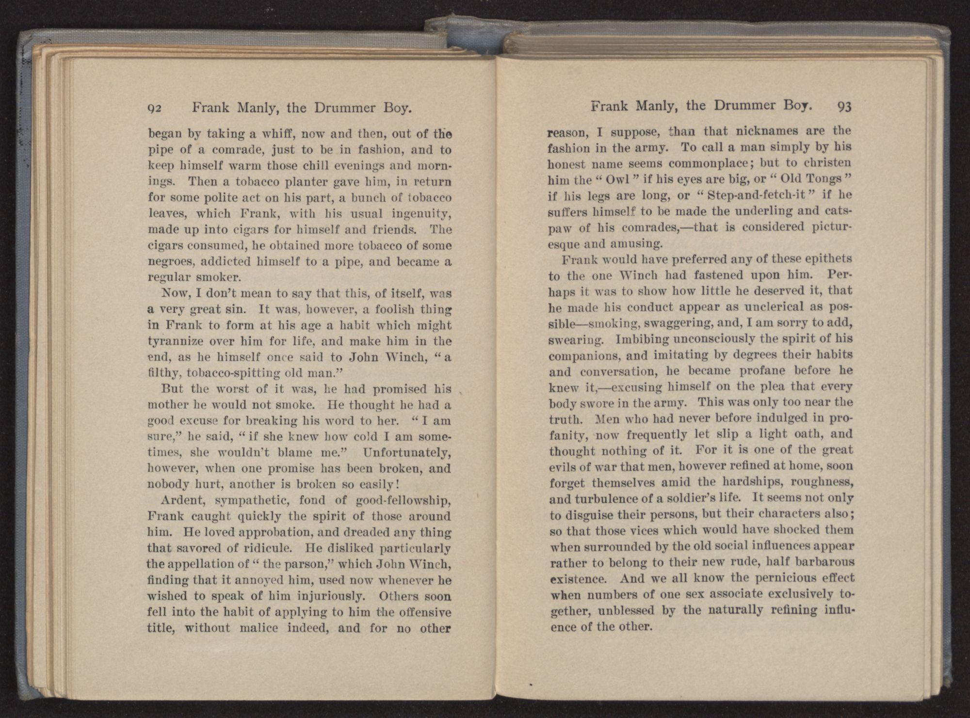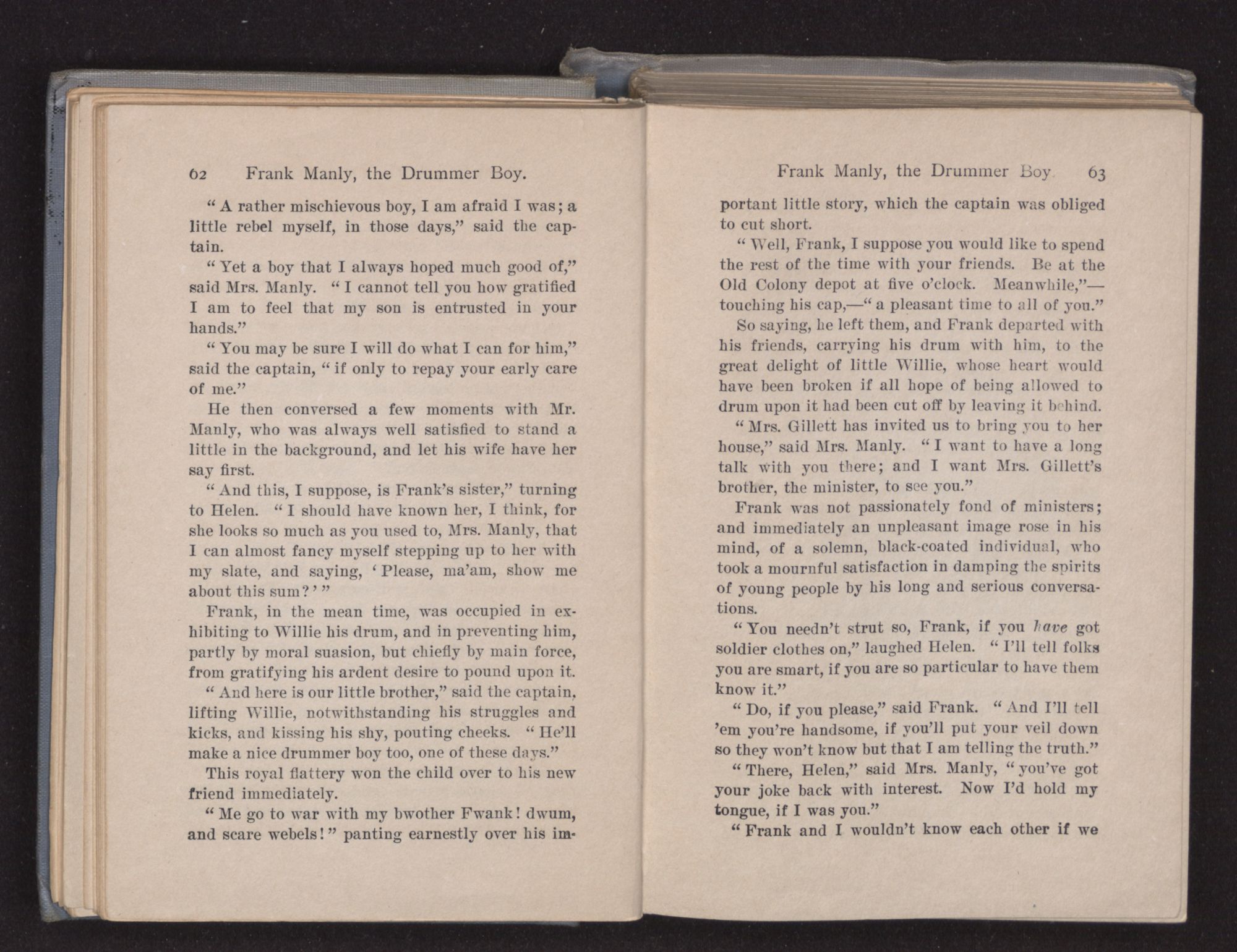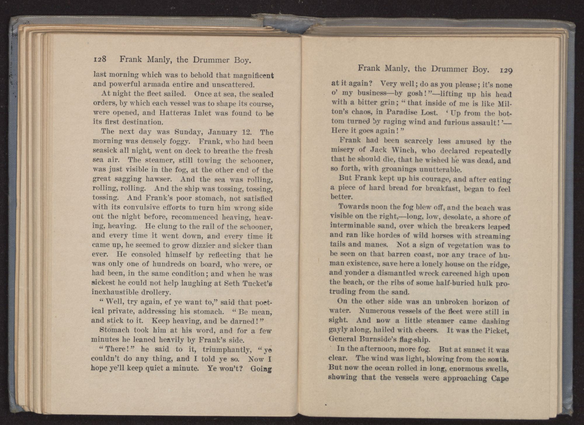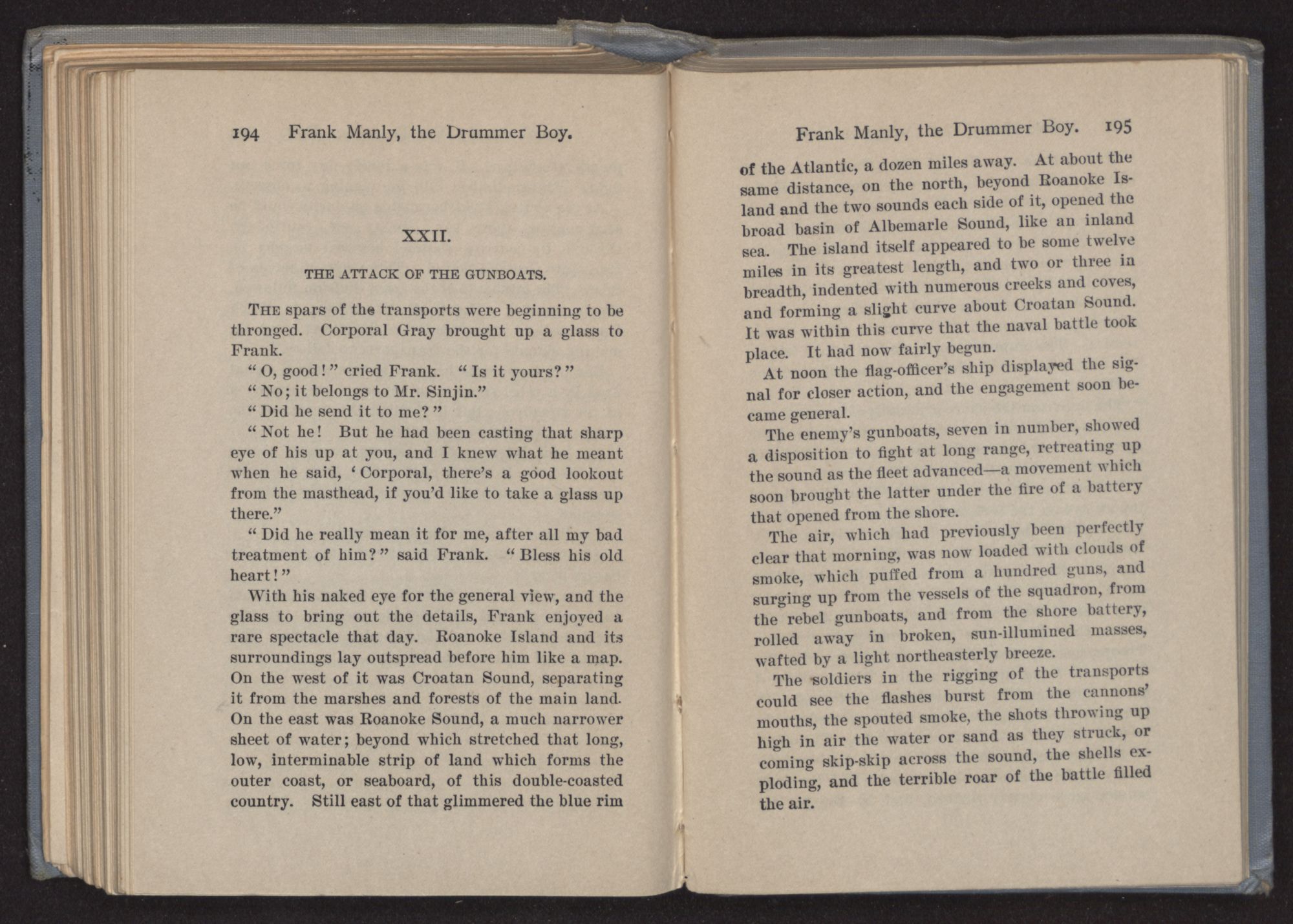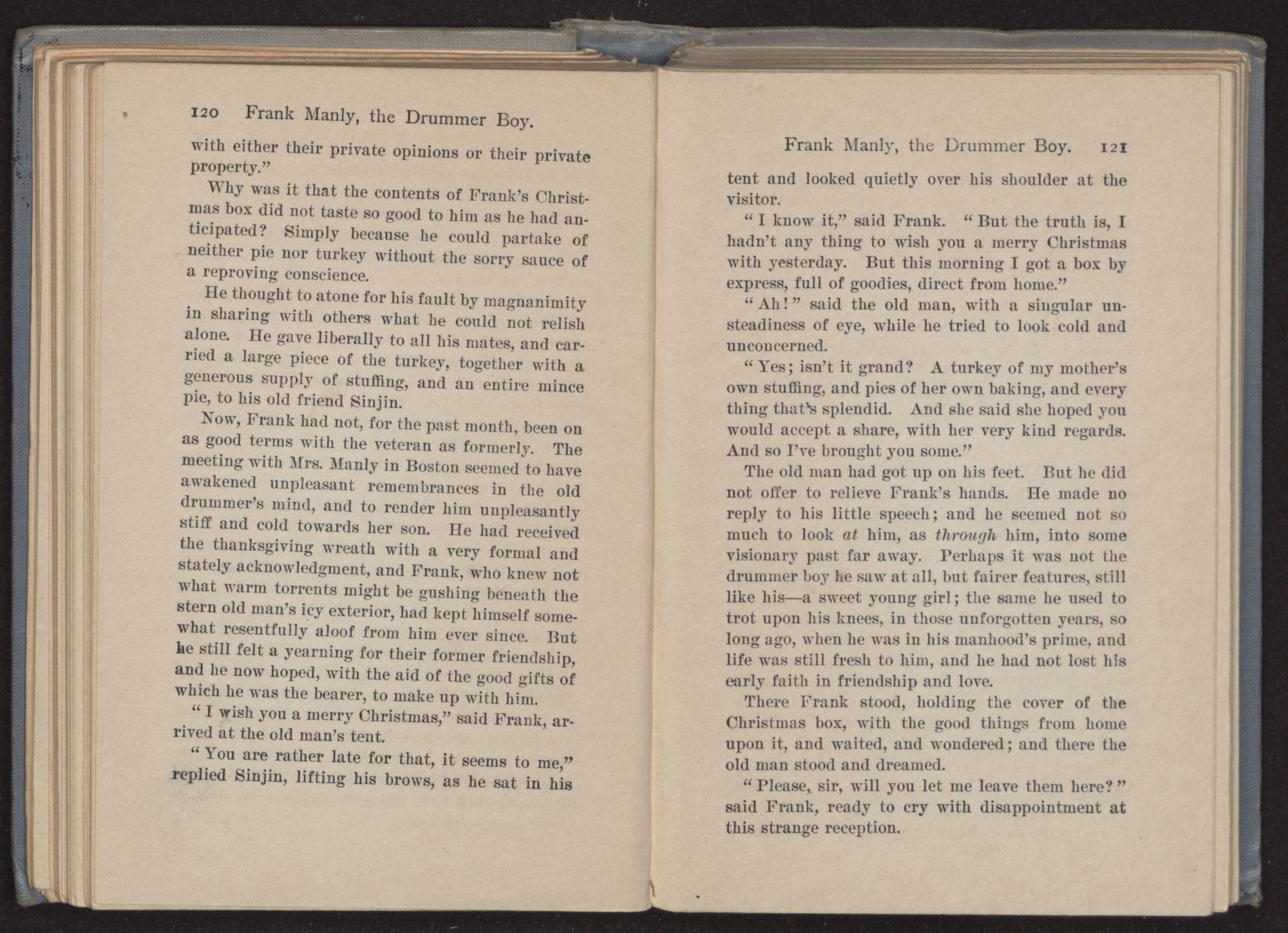 I. FRANK AT HOME.One evening, in the month of October, 1861, the Manly family were gathered together in their little sitting-room, discussing a question of the most serious importance to all of them, and to Frank in particular. Mrs. Manly sat by the table, pretending to sew; but now and then the tears rushed into her eyes, and dropped upon her work, in spite of all she could do to keep them back. Frank watched her with a swelling breast, sorry to see his mother so grieved, and yet glad in one little corner of his heart; for, although she had declared that she could not think of granting his request, he knew well, by those tears of hers, that she was already thinking of granting it.