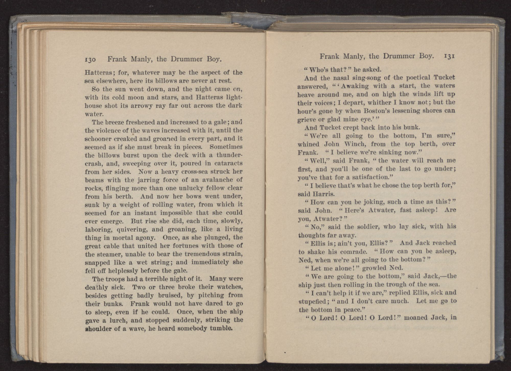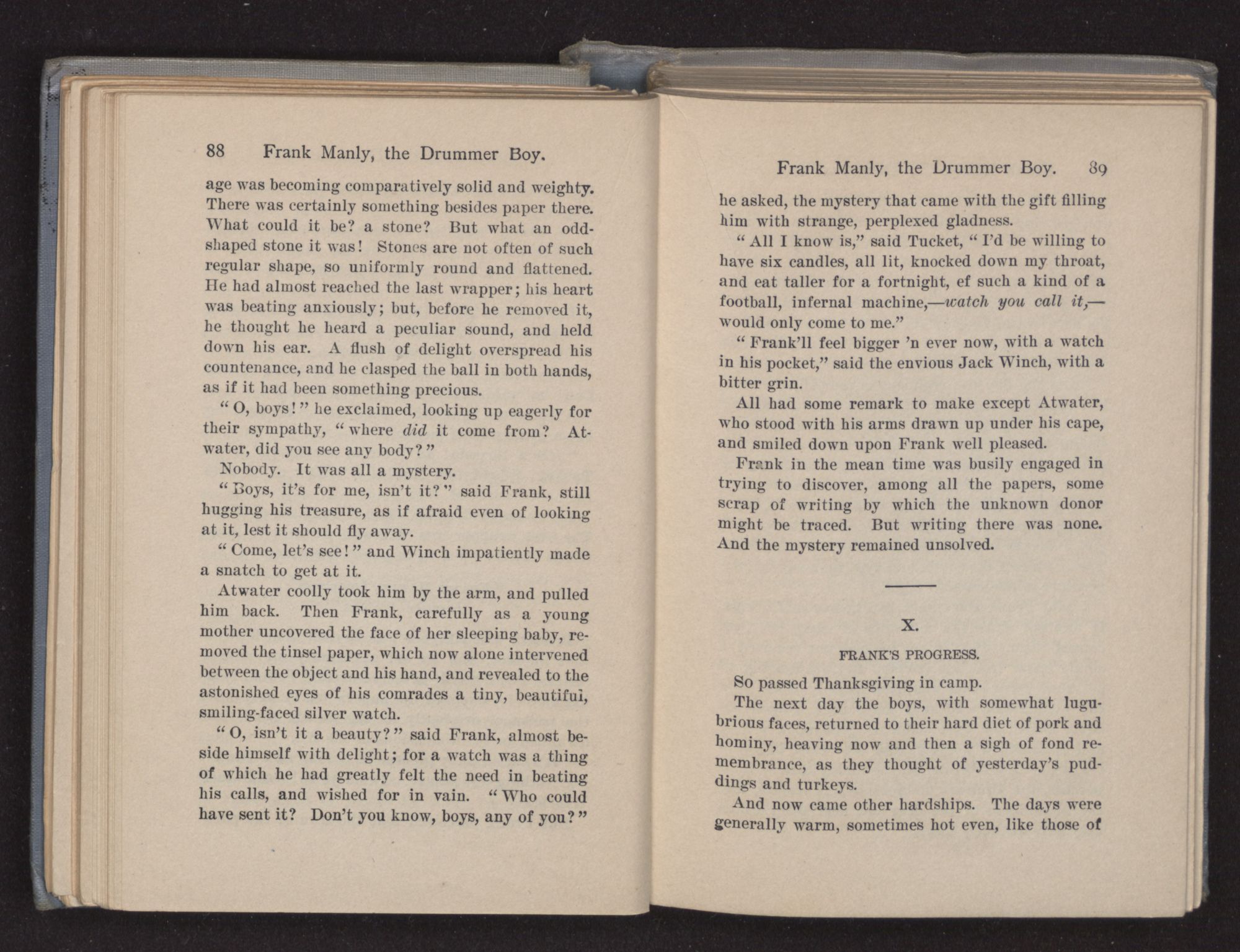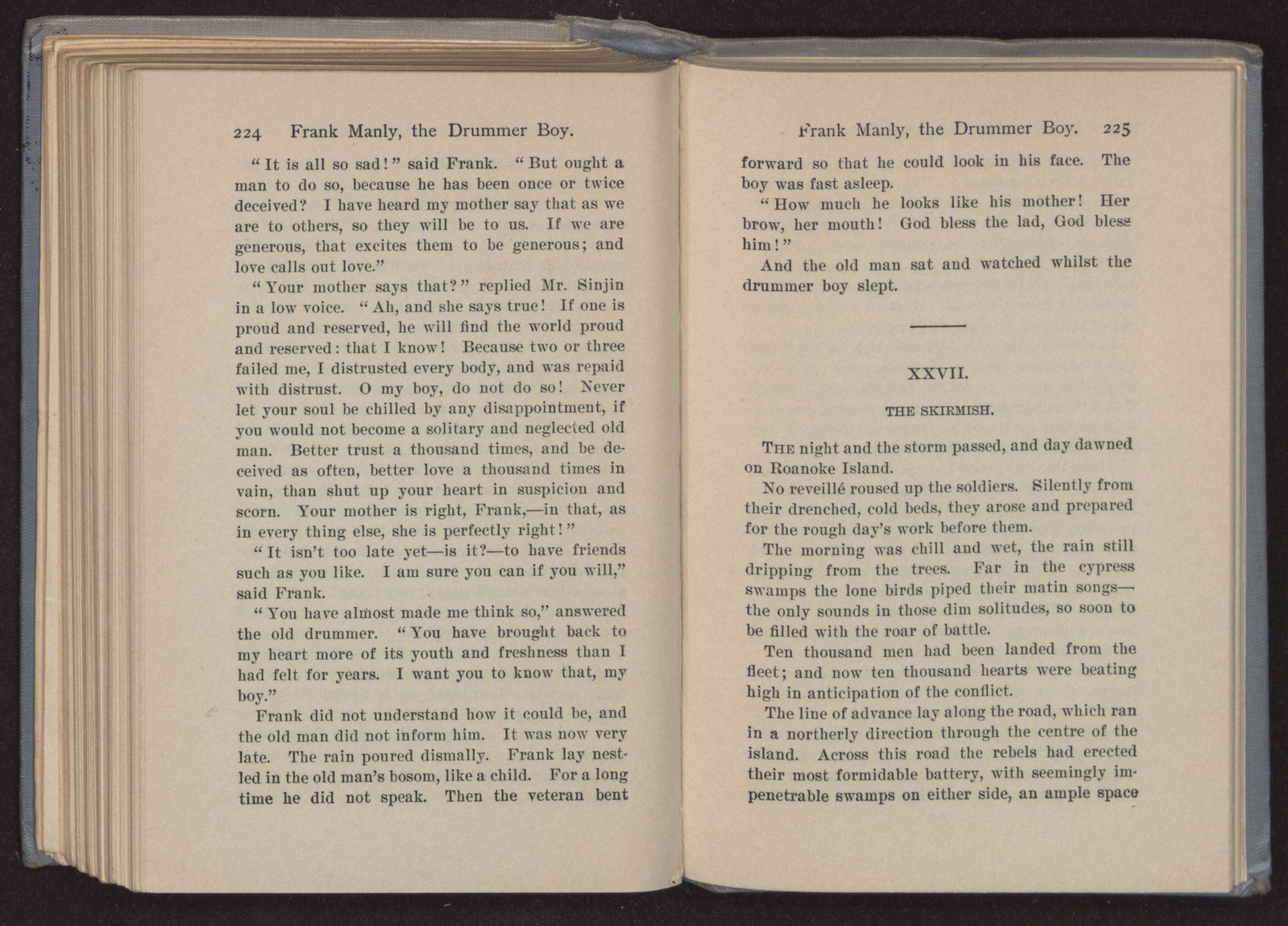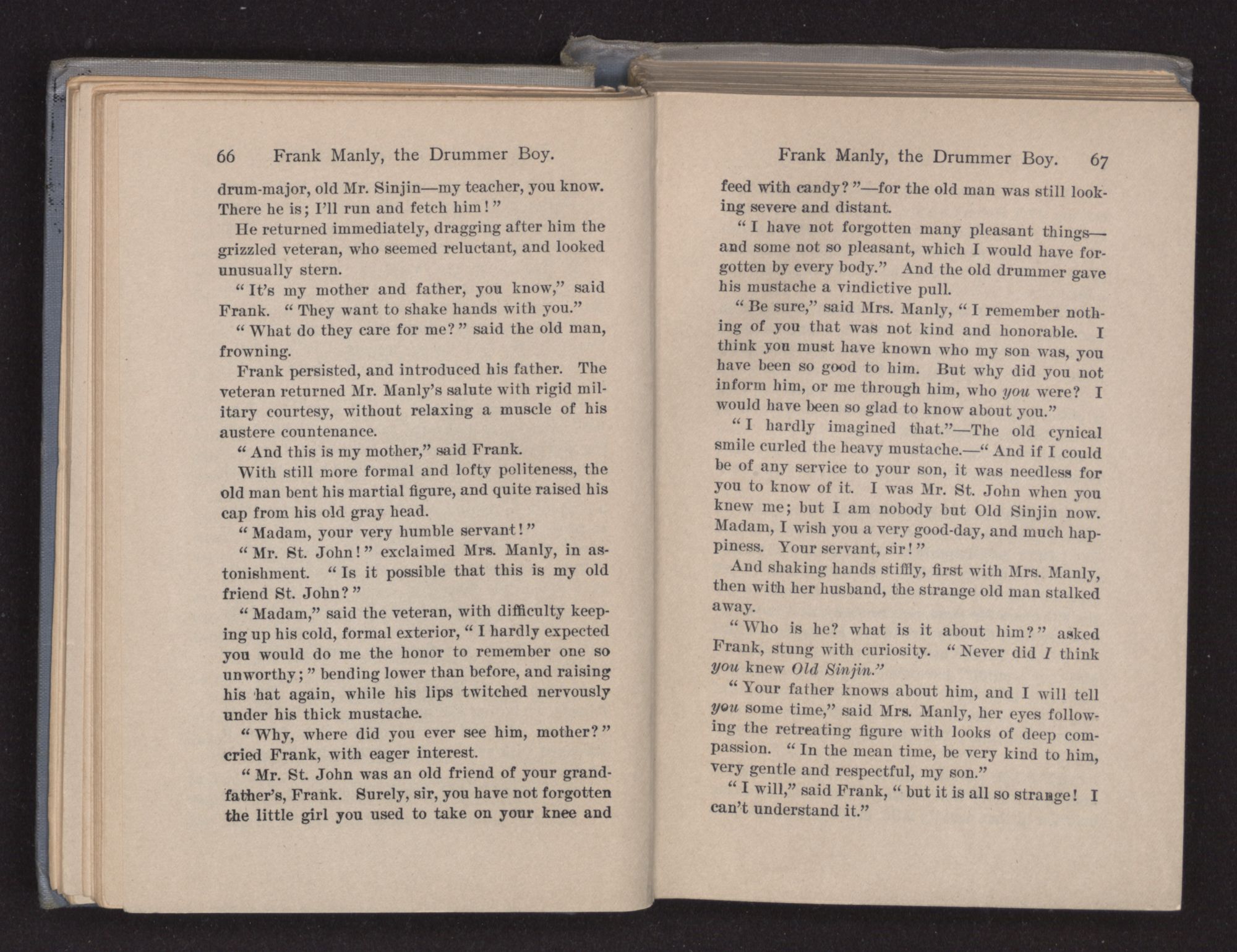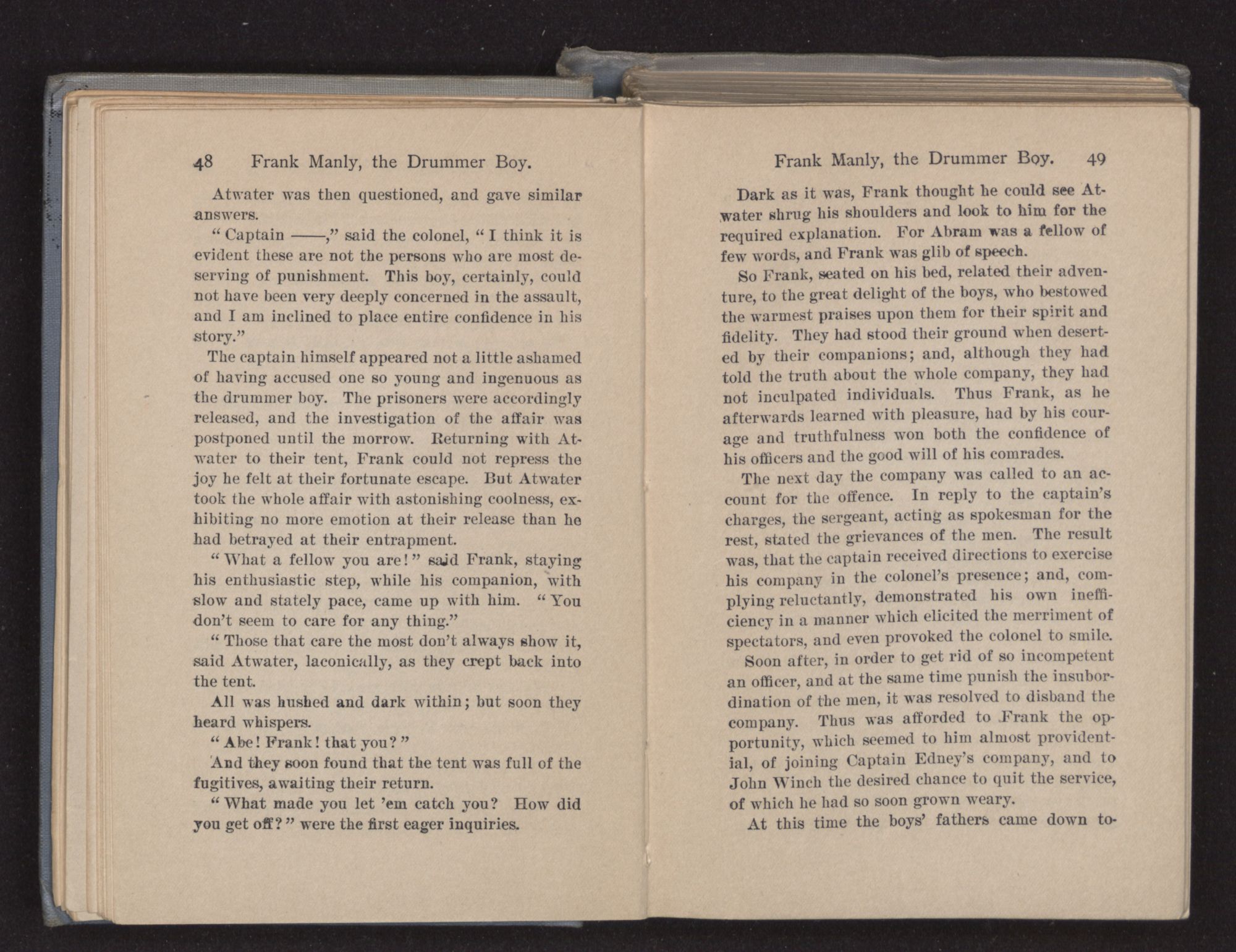 I. FRANK AT HOME.One evening, in the month of October, 1861, the Manly family were gathered together in their little sitting-room, discussing a question of the most serious importance to all of them, and to Frank in particular. Mrs. Manly sat by the table, pretending to sew; but now and then the tears rushed into her eyes, and dropped upon her work, in spite of all she could do to keep them back. Frank watched her with a swelling breast, sorry to see his mother so grieved, and yet glad in one little corner of his heart; for, although she had declared that she could not think of granting his request, he knew well, by those tears of hers, that she was already thinking of granting it.