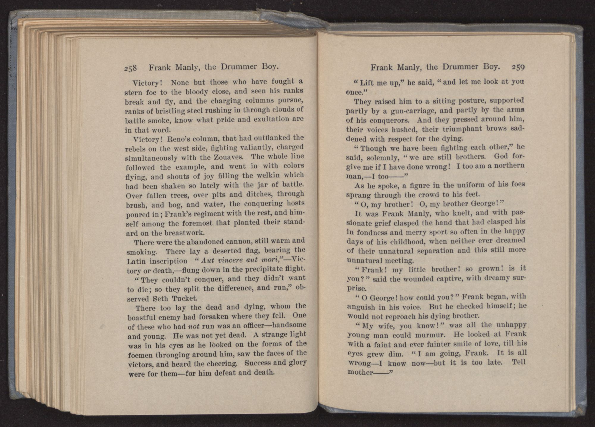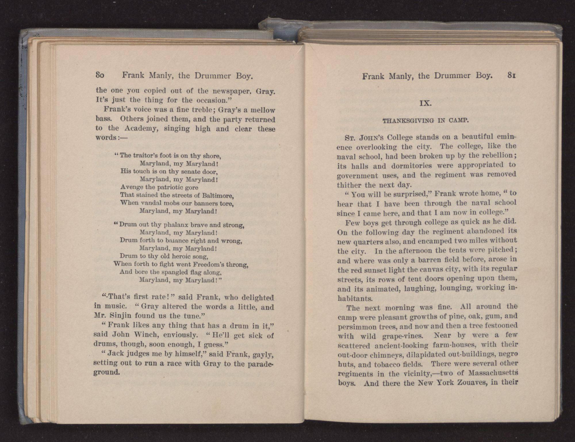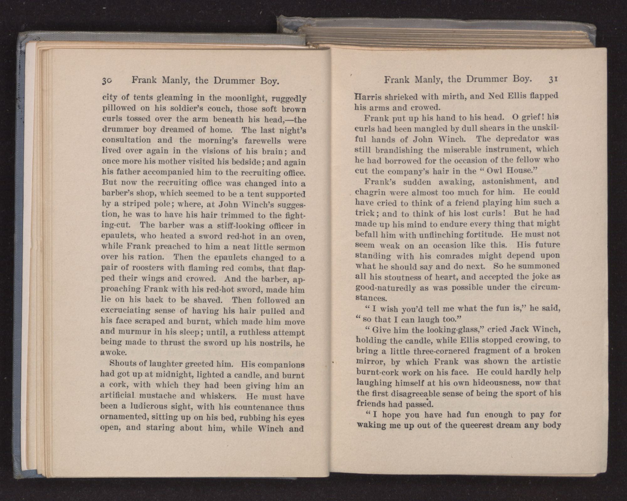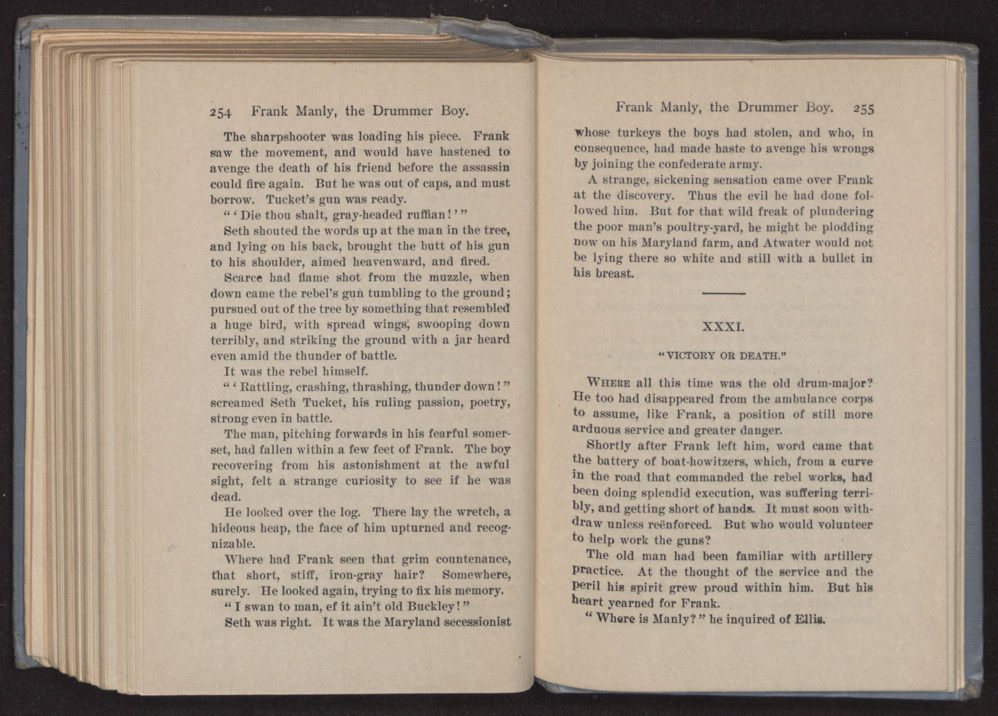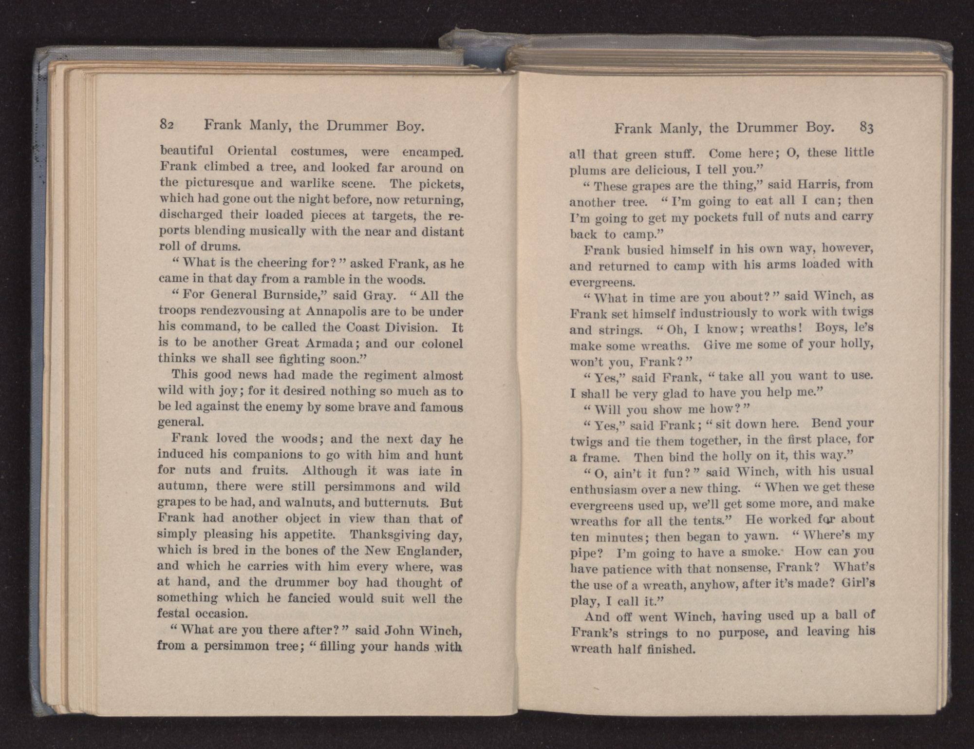 I. FRANK AT HOME.One evening, in the month of October, 1861, the Manly family were gathered together in their little sitting-room, discussing a question of the most serious importance to all of them, and to Frank in particular. Mrs. Manly sat by the table, pretending to sew; but now and then the tears rushed into her eyes, and dropped upon her work, in spite of all she could do to keep them back. Frank watched her with a swelling breast, sorry to see his mother so grieved, and yet glad in one little corner of his heart; for, although she had declared that she could not think of granting his request, he knew well, by those tears of hers, that she was already thinking of granting it.