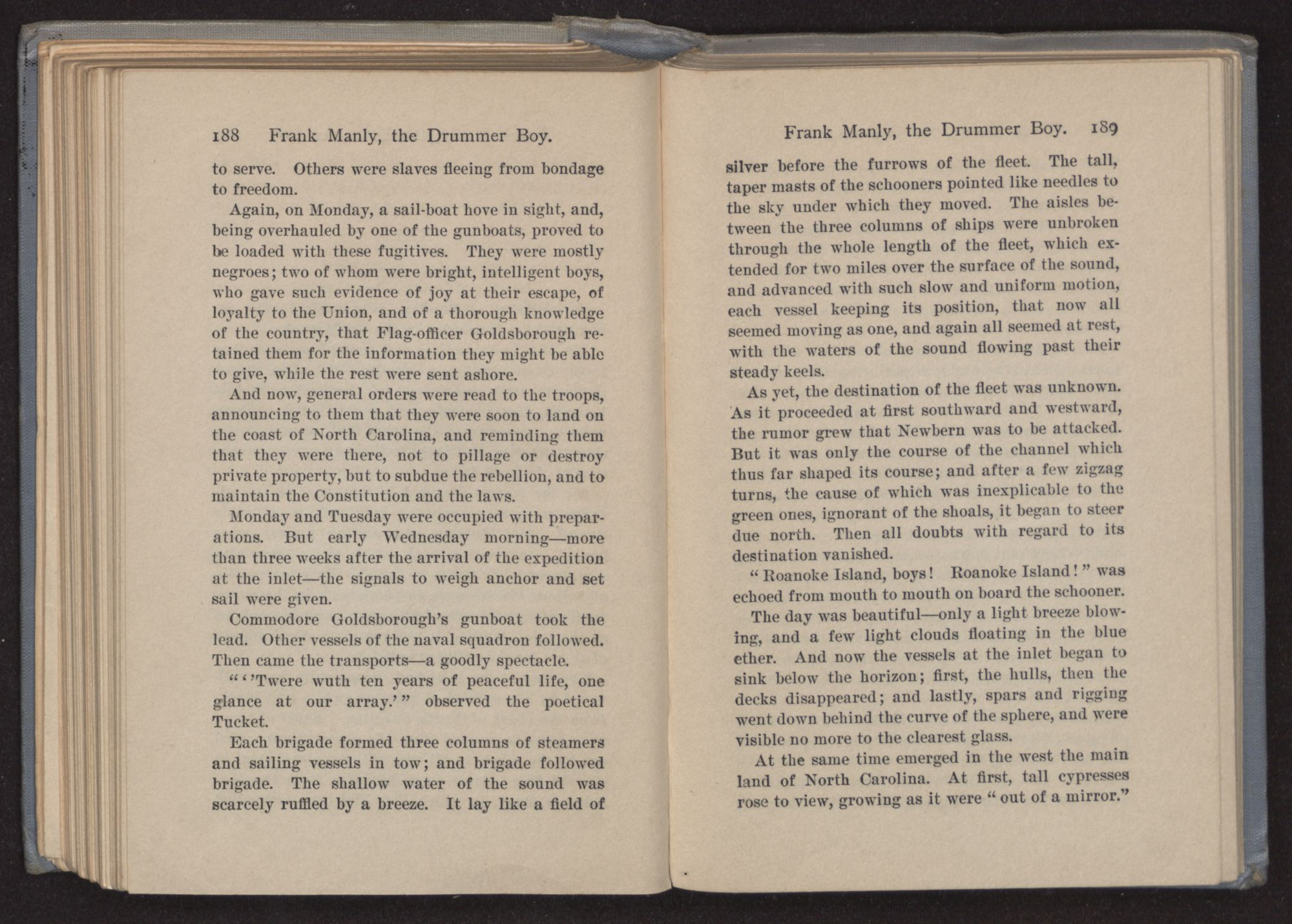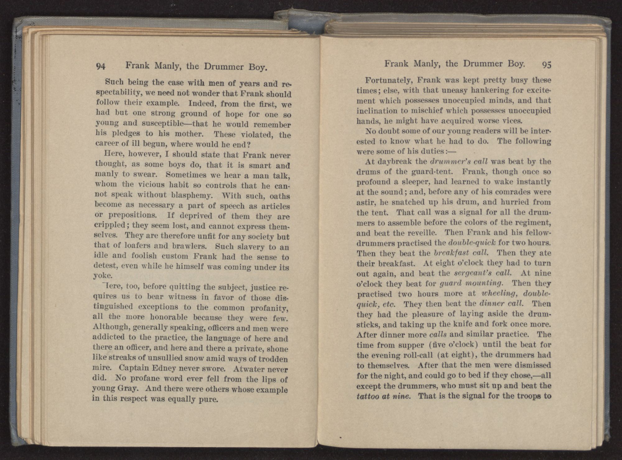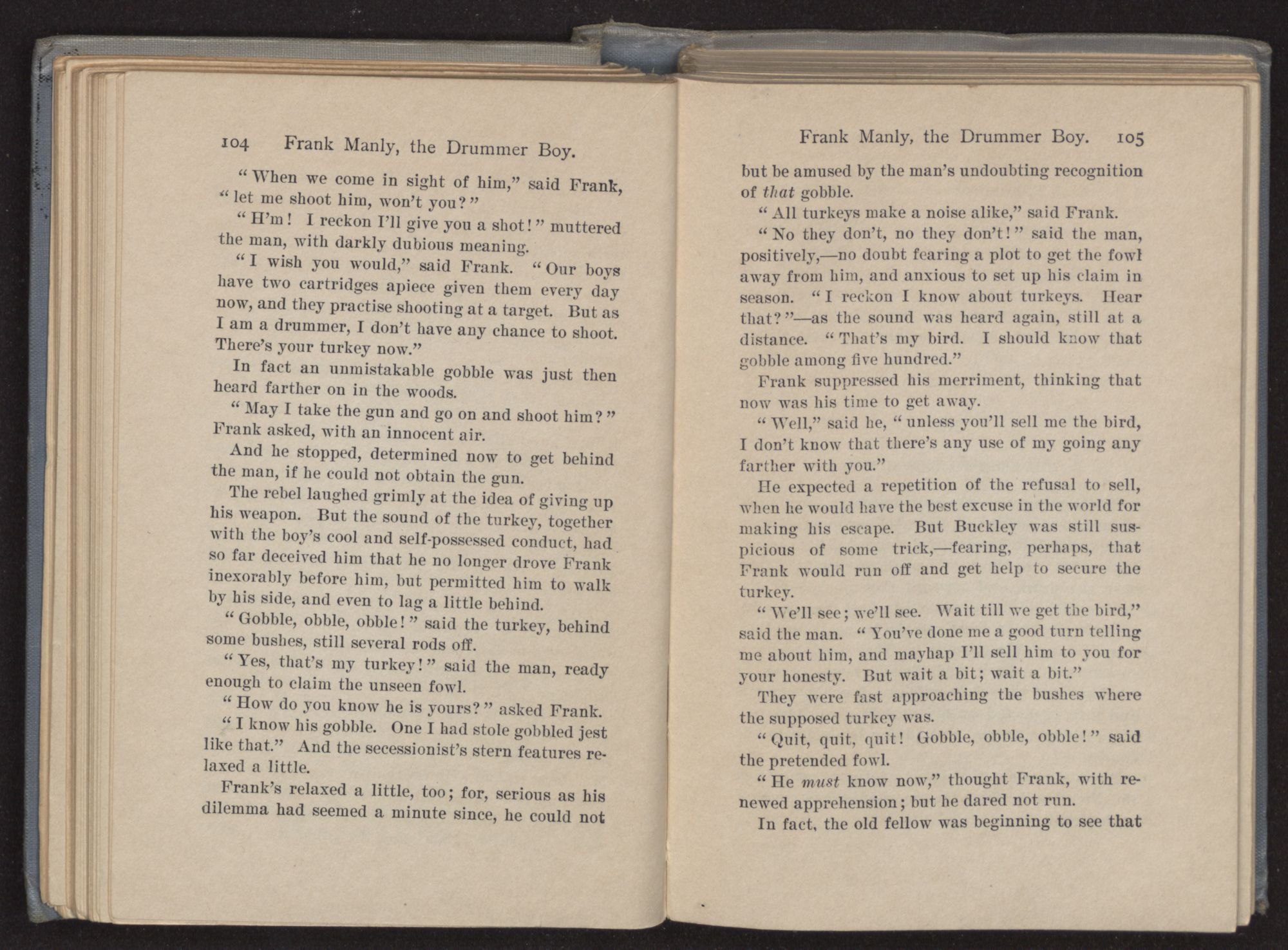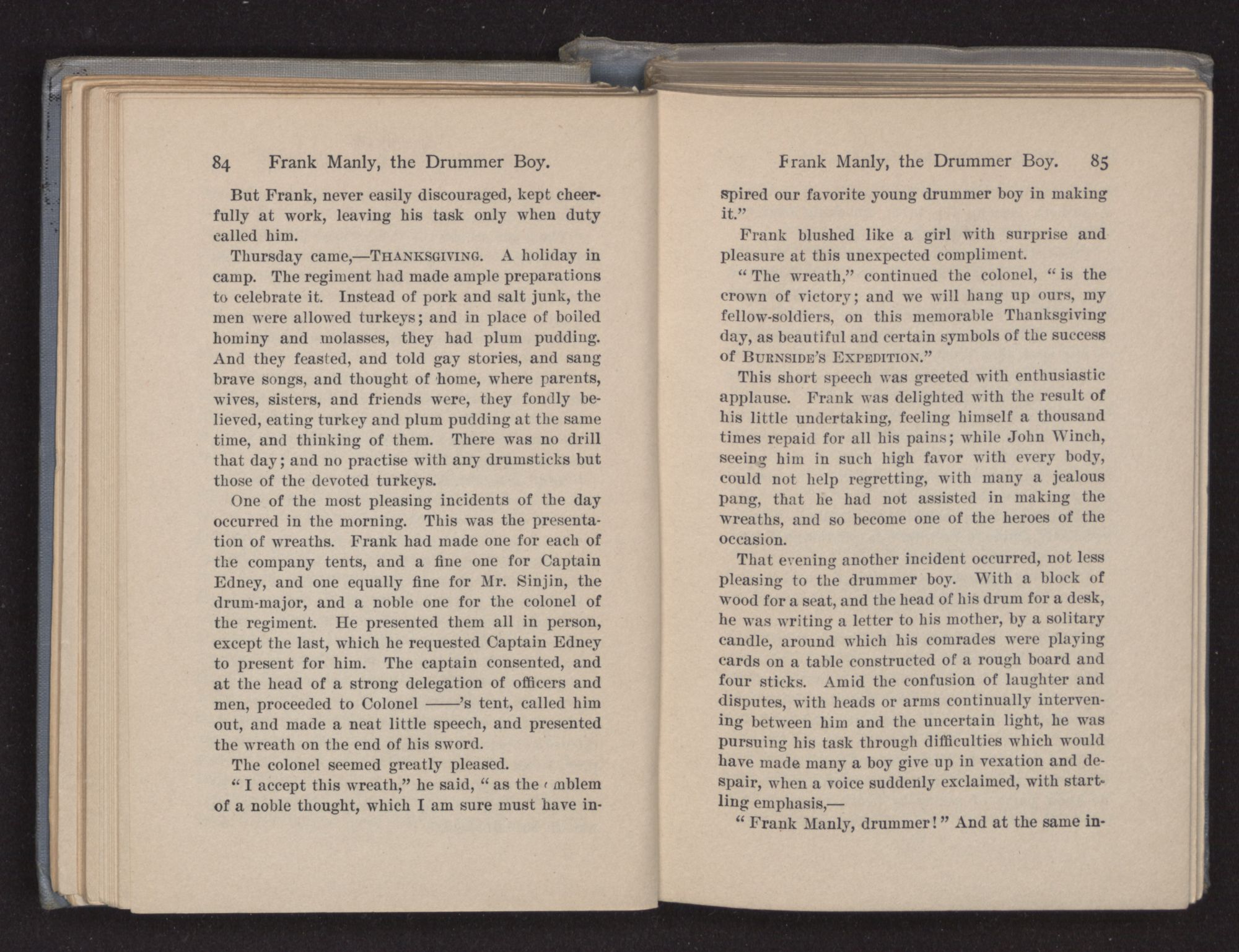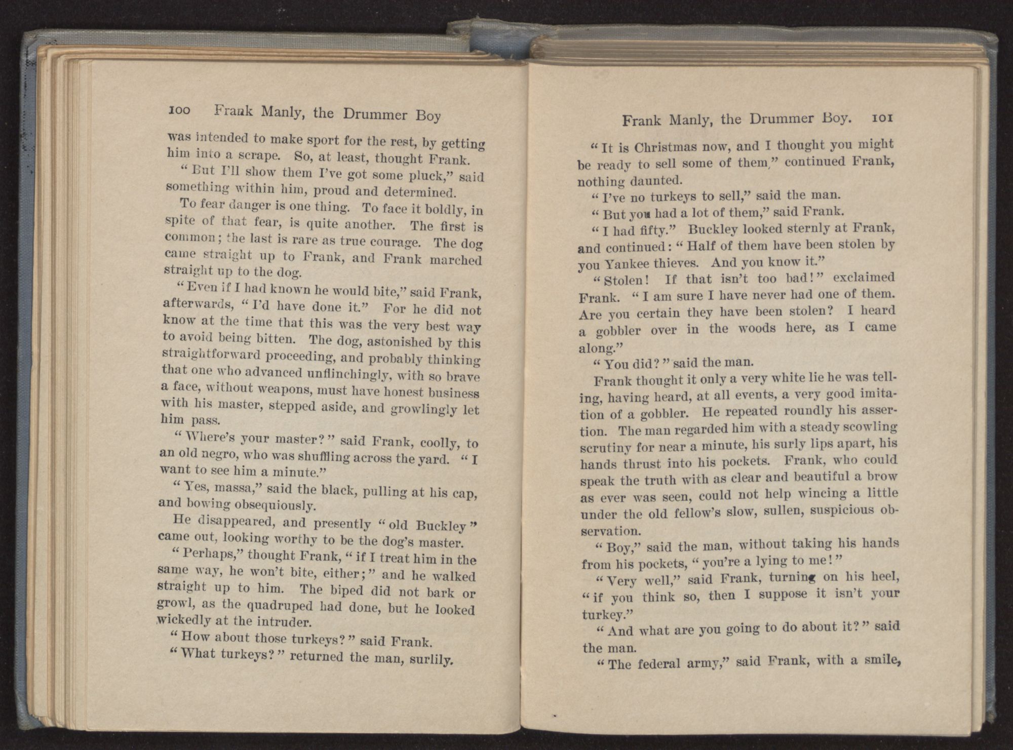 I. FRANK AT HOME.One evening, in the month of October, 1861, the Manly family were gathered together in their little sitting-room, discussing a question of the most serious importance to all of them, and to Frank in particular. Mrs. Manly sat by the table, pretending to sew; but now and then the tears rushed into her eyes, and dropped upon her work, in spite of all she could do to keep them back. Frank watched her with a swelling breast, sorry to see his mother so grieved, and yet glad in one little corner of his heart; for, although she had declared that she could not think of granting his request, he knew well, by those tears of hers, that she was already thinking of granting it.