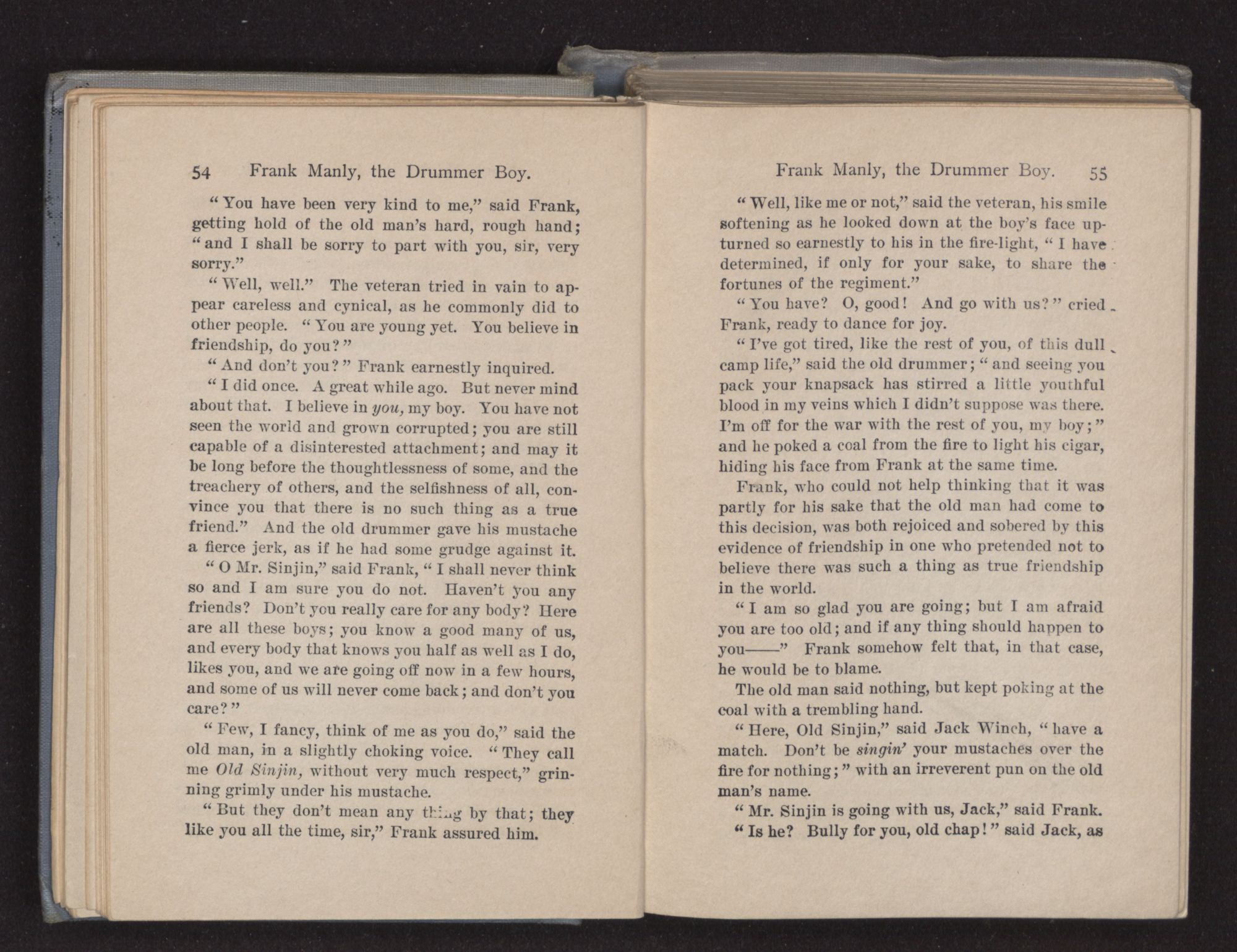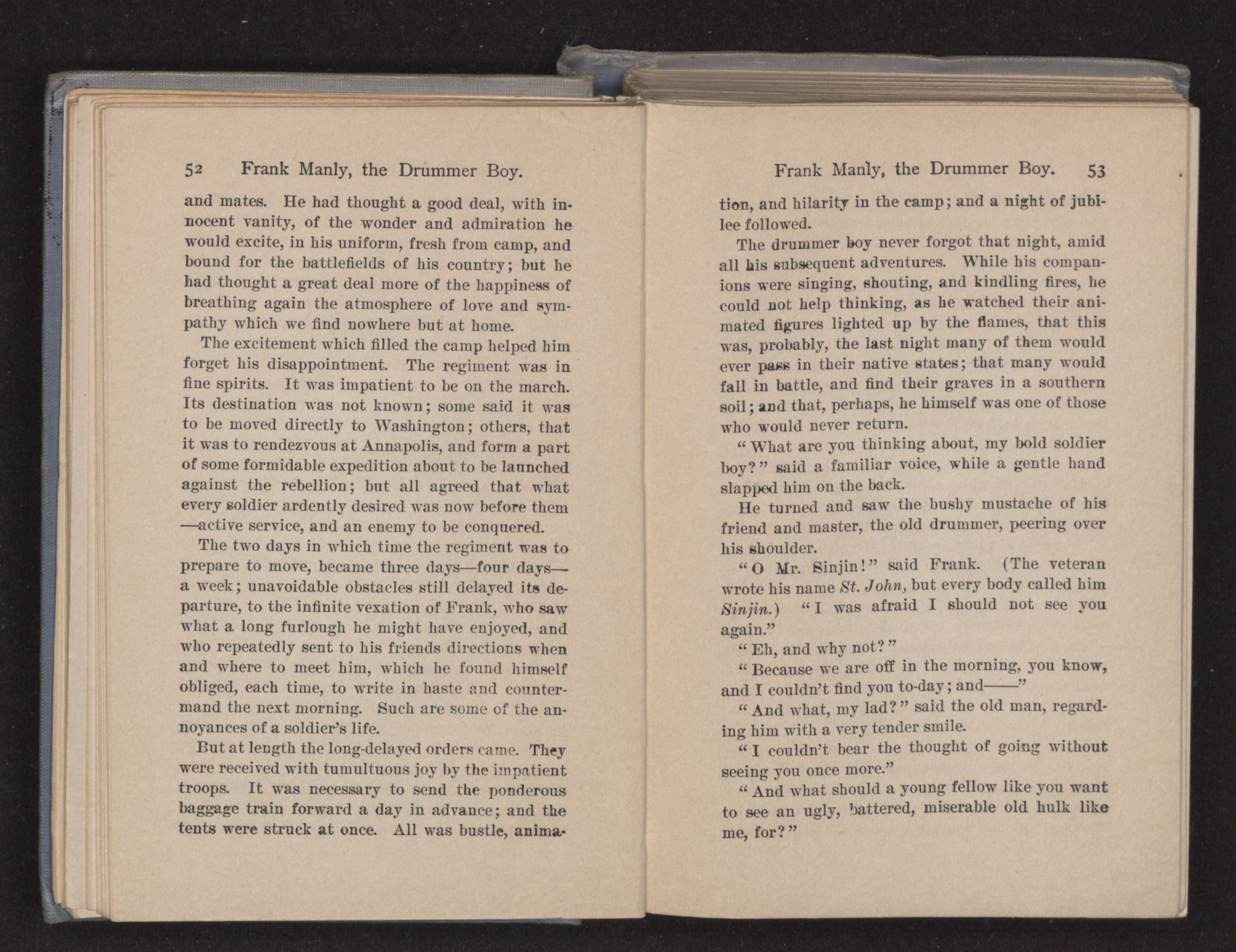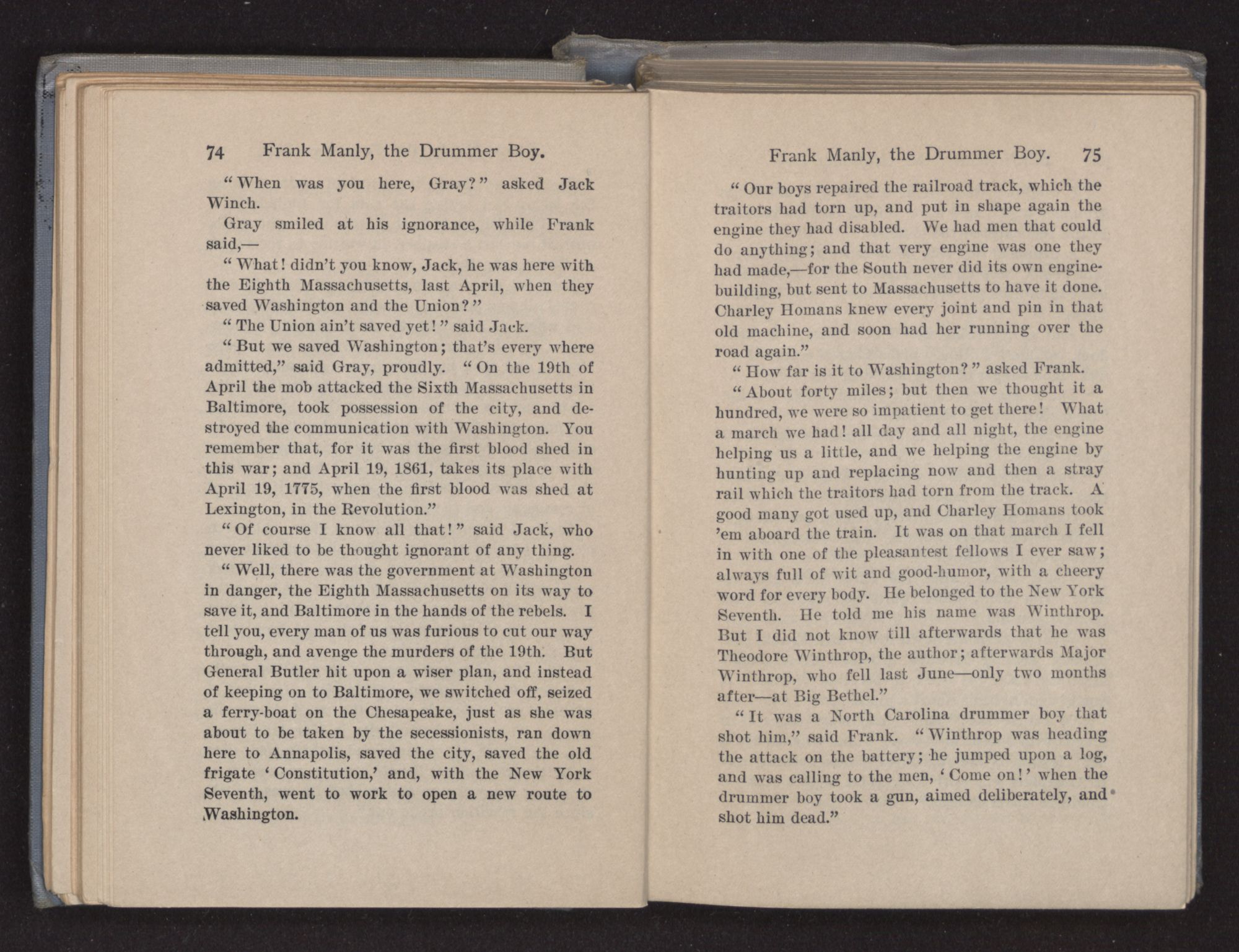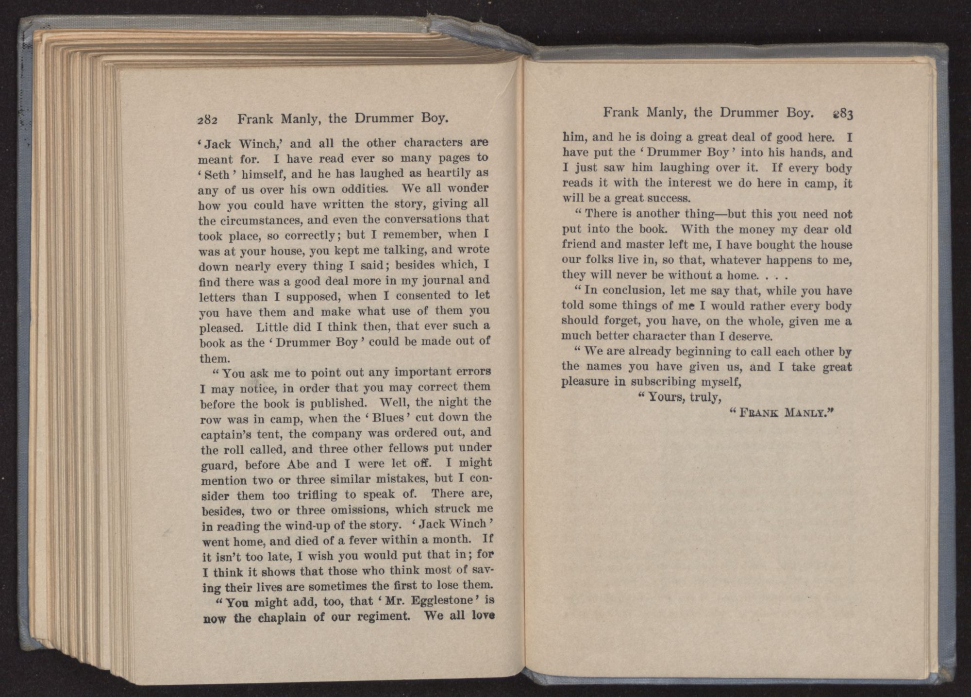 ‘Jack Winch,’ and all the other characters are meant for. I have read ever so many pages to ‘Seth’ himself, and he has laughed as heartily as any of us over his own oddities. We all wonder how you could have written the story, giving all the circumstances, and even the conversations that took place, so correctly; but I remember, when I was at your house, you kept me talking, and wrote down nearly every thing I said; besides which, I find there was a good deal more in my journal and letters than I supposed, when I consented to let you have them and make what use of them you pleased. Little did I think then, that ever such a book as the ‘Drummer Boy’ could be made out of them.