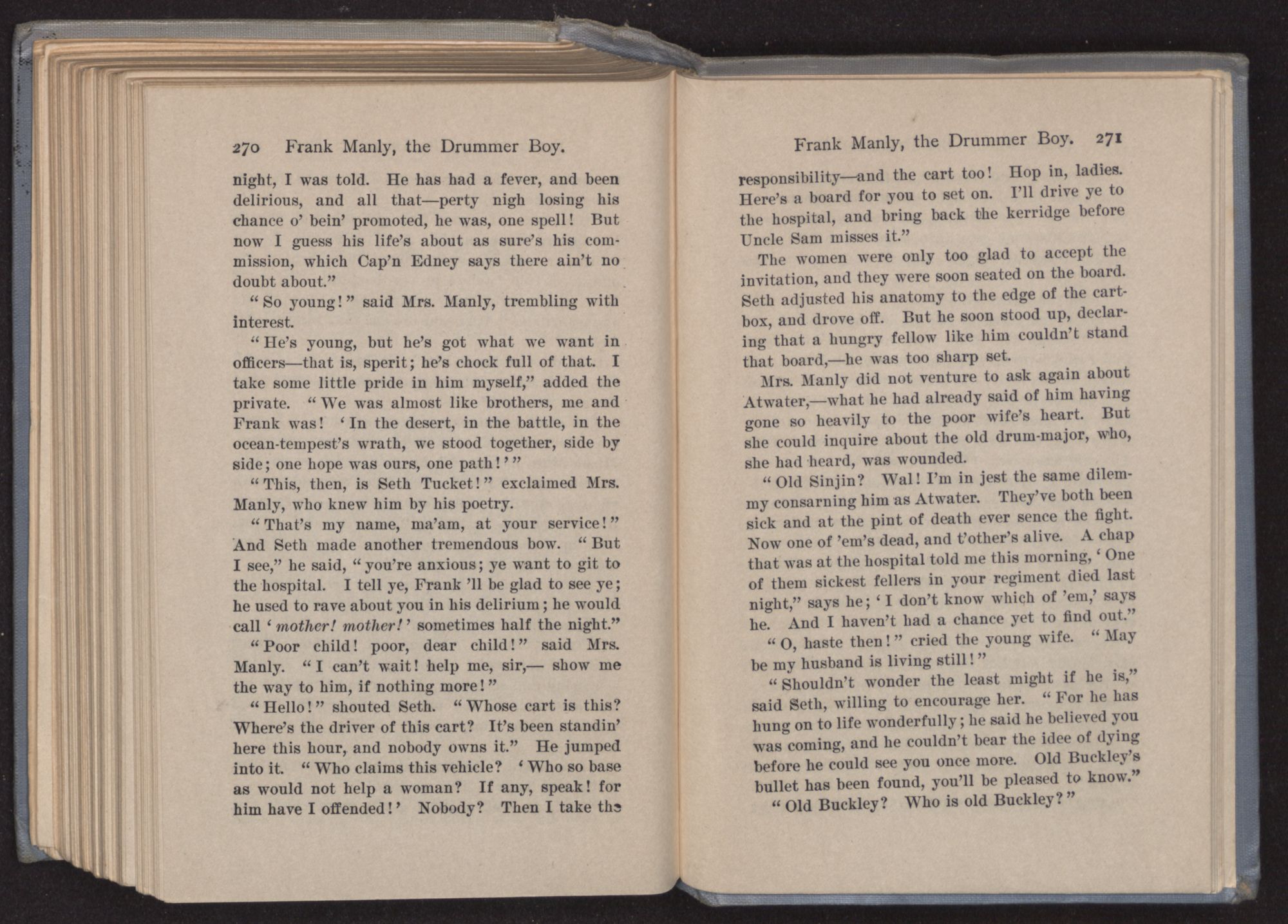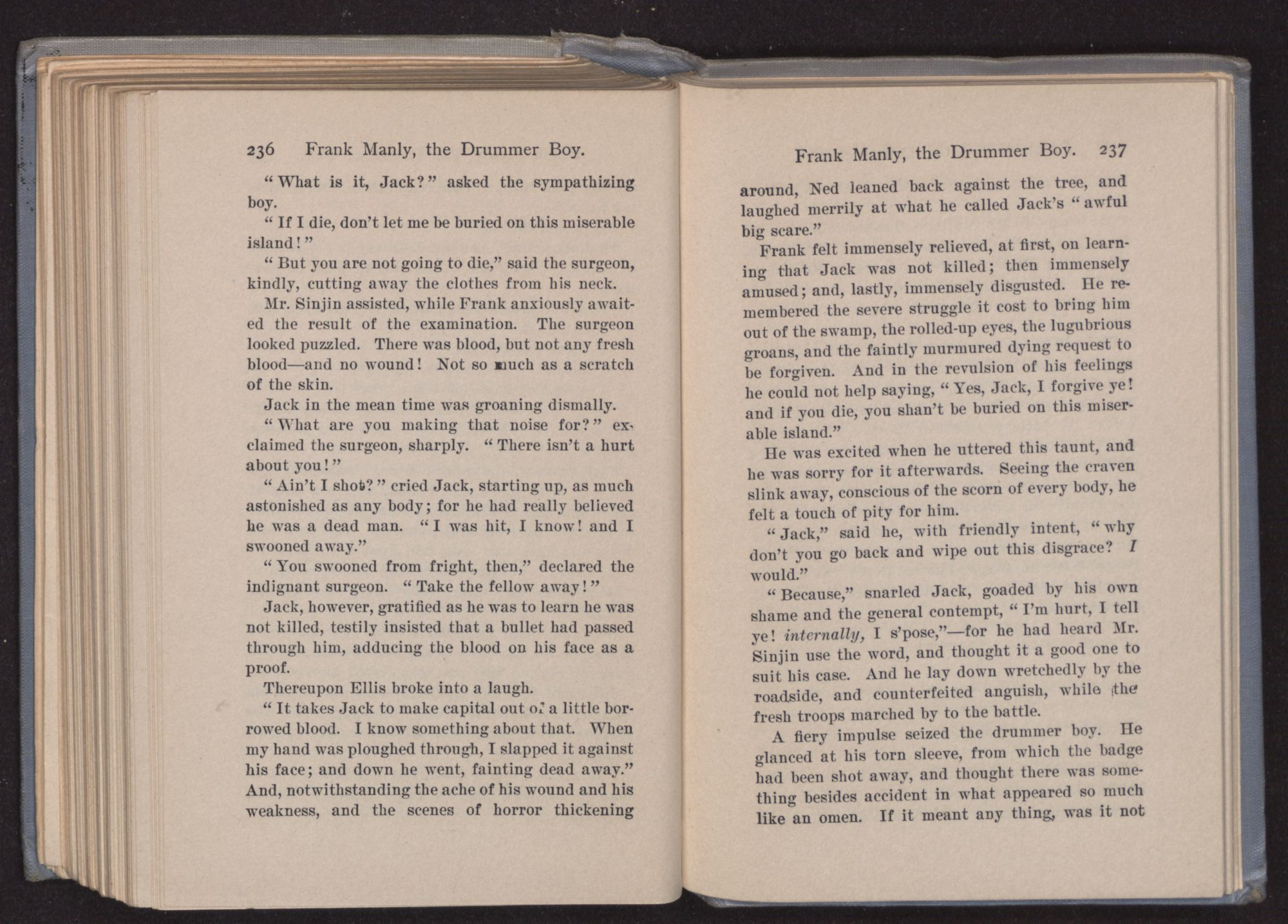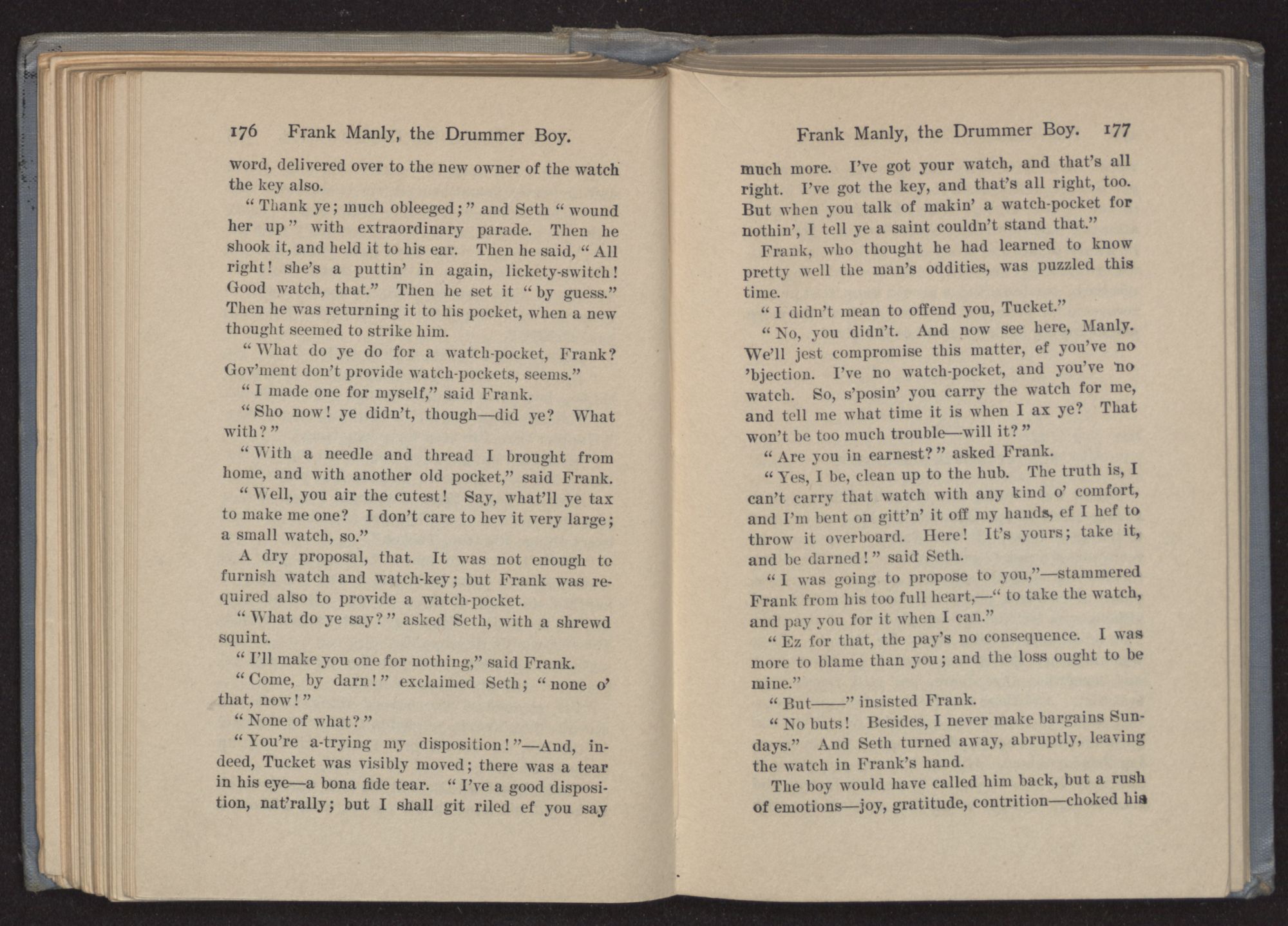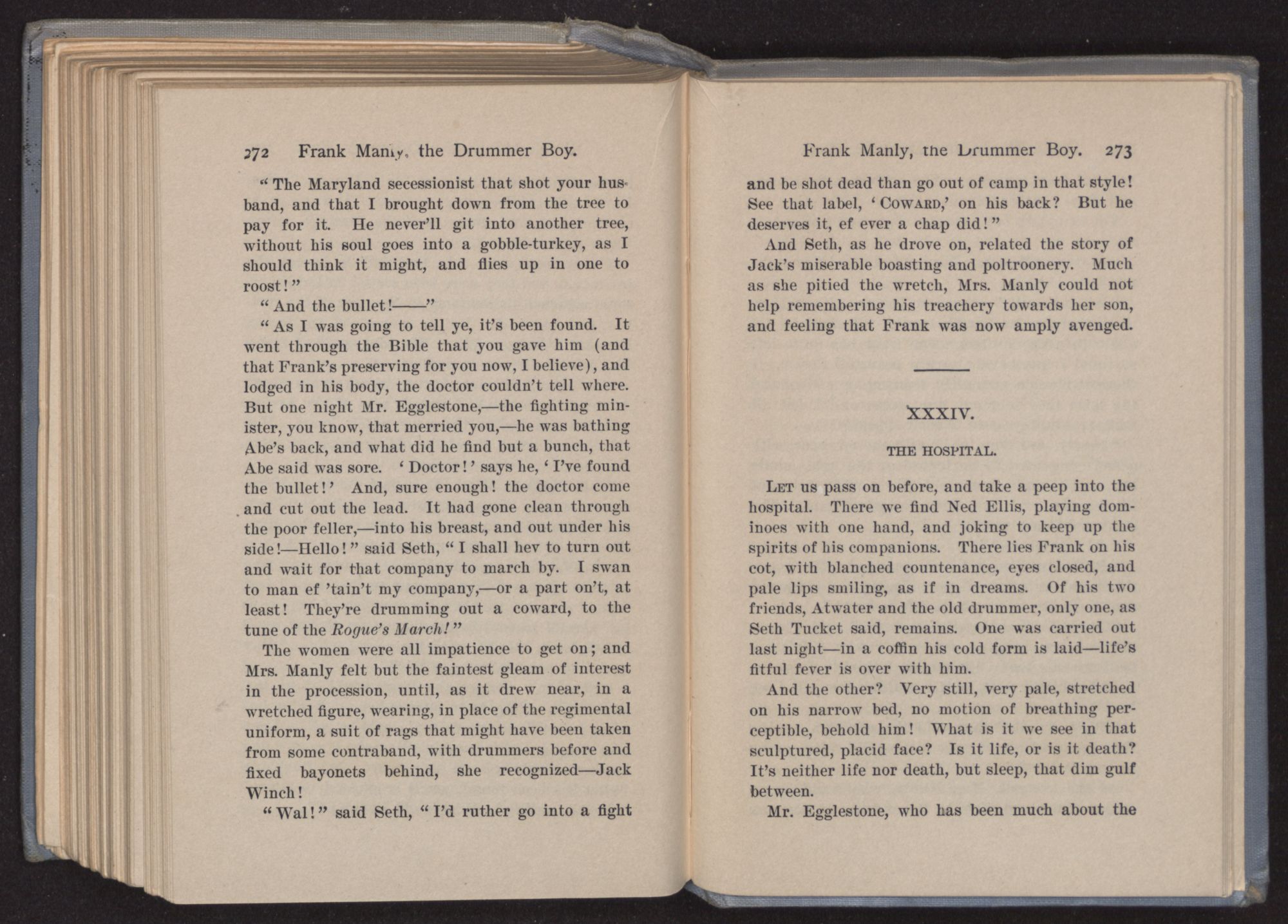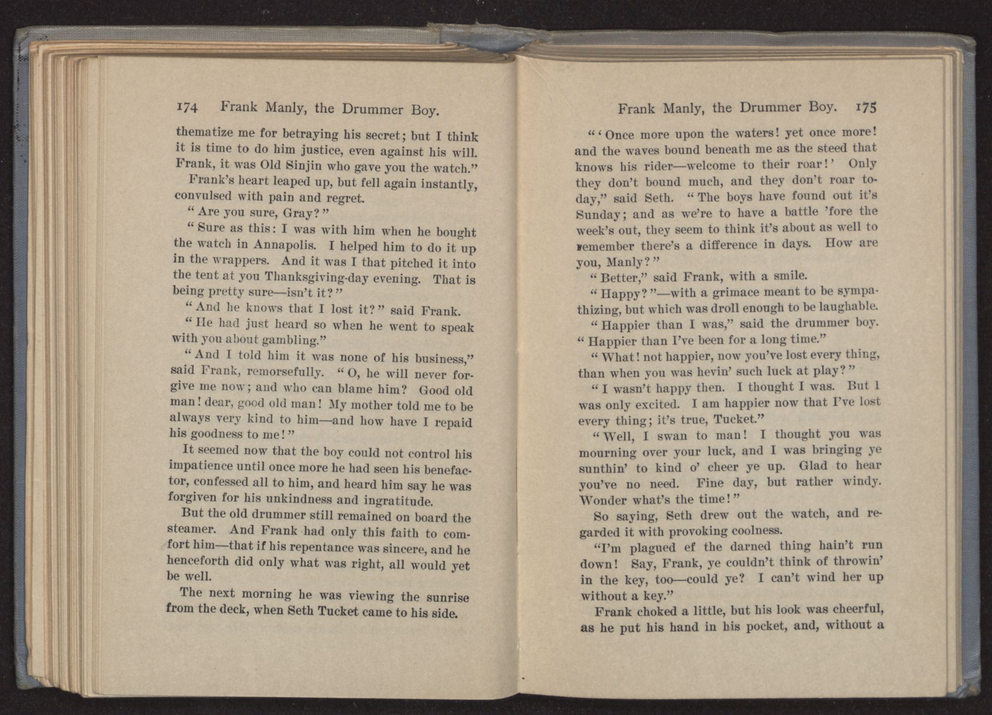 ‘Jack Winch,’ and all the other characters are meant for. I have read ever so many pages to ‘Seth’ himself, and he has laughed as heartily as any of us over his own oddities. We all wonder how you could have written the story, giving all the circumstances, and even the conversations that took place, so correctly; but I remember, when I was at your house, you kept me talking, and wrote down nearly every thing I said; besides which, I find there was a good deal more in my journal and letters than I supposed, when I consented to let you have them and make what use of them you pleased. Little did I think then, that ever such a book as the ‘Drummer Boy’ could be made out of them.