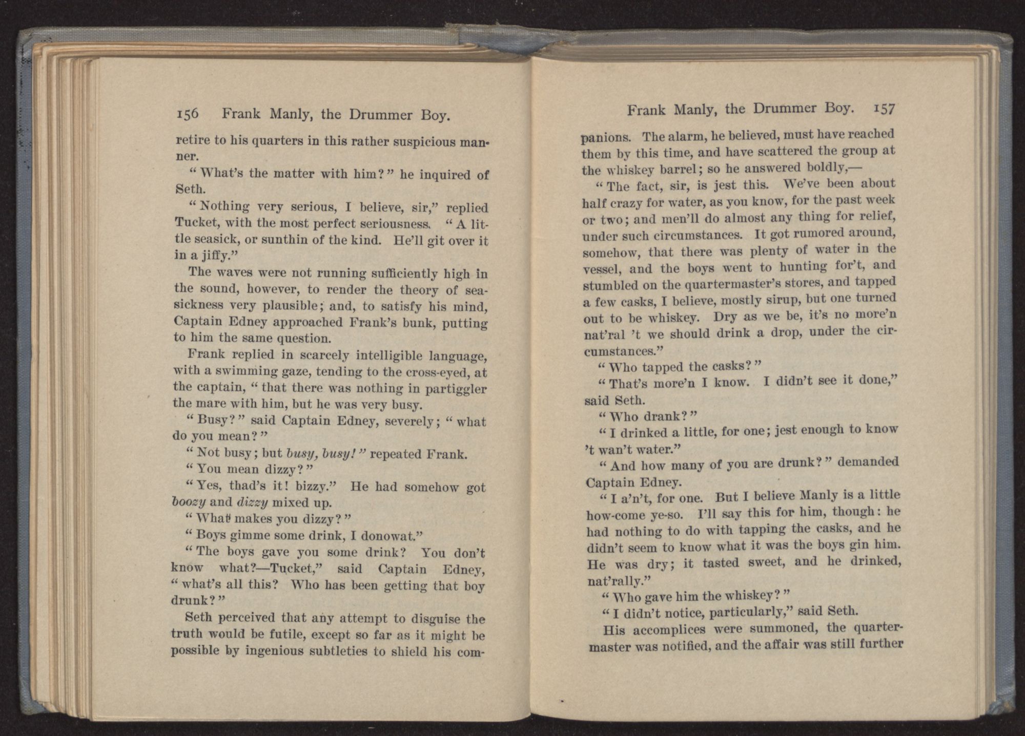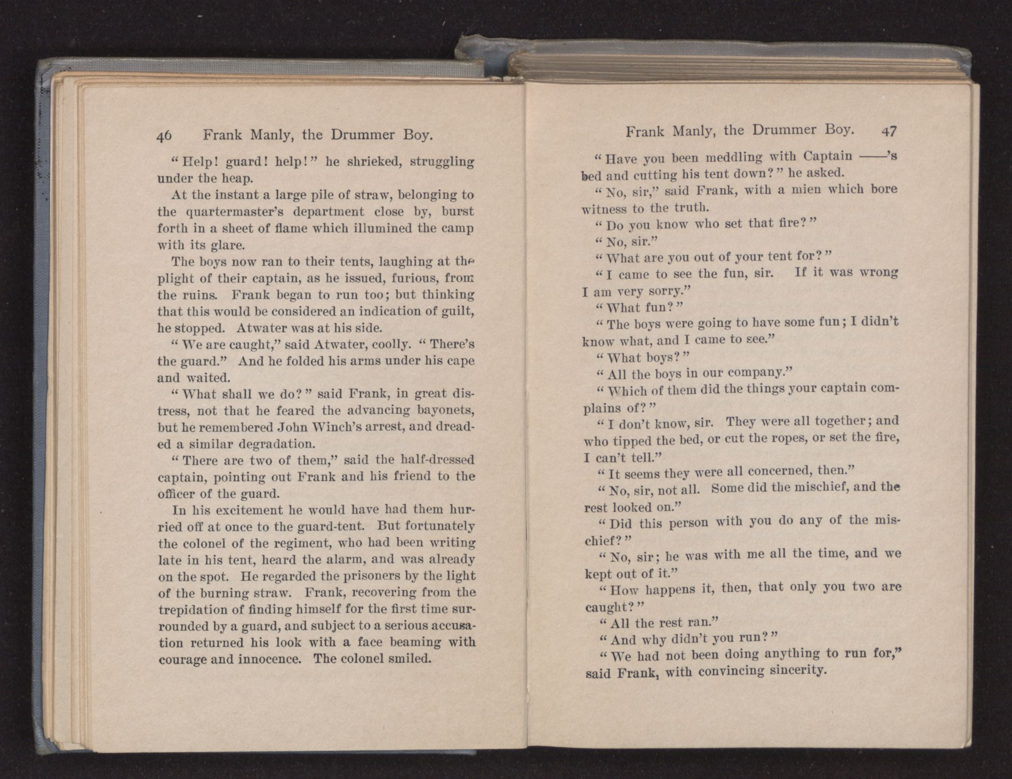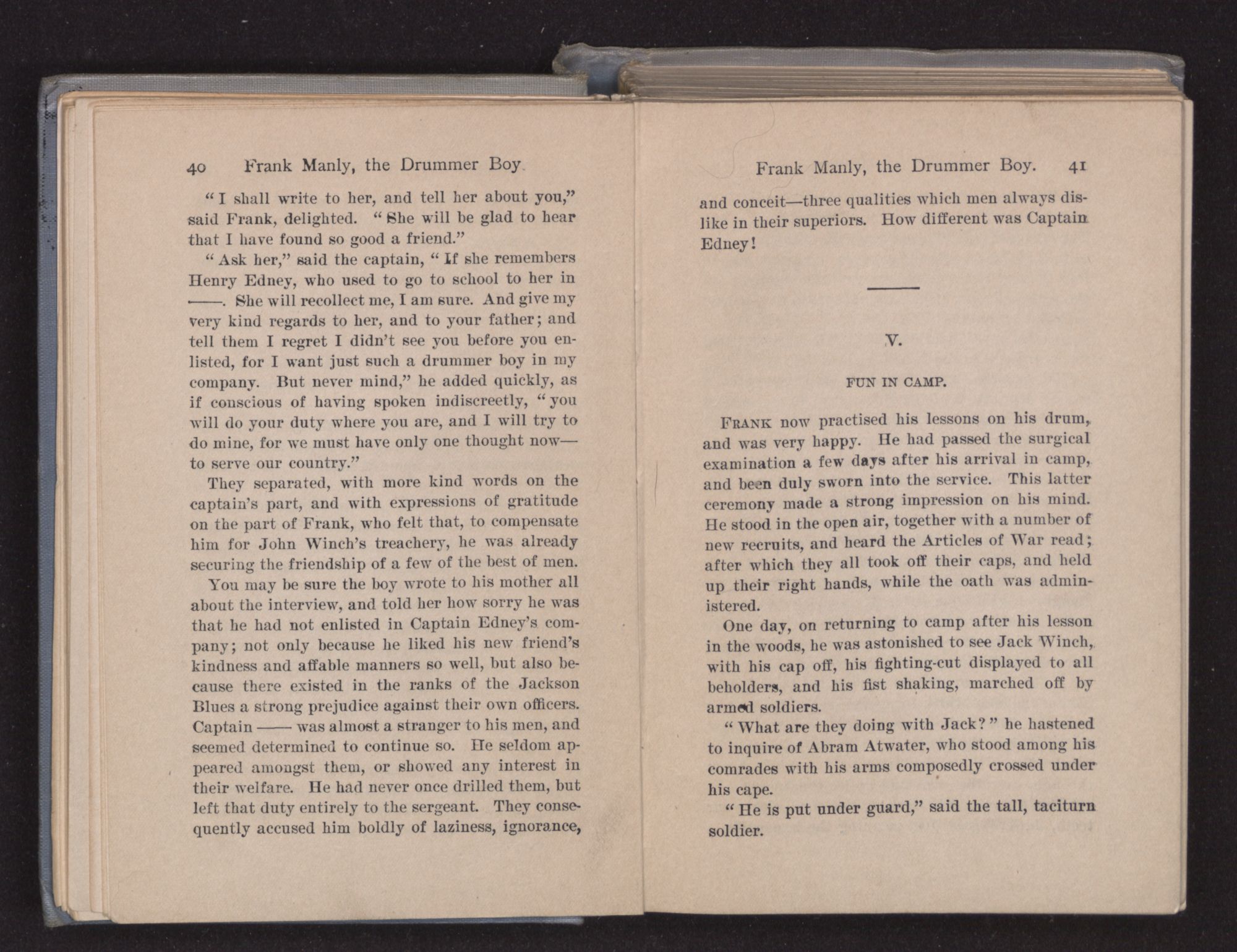 “You ask me to point out any important errors I may notice, in order that you may correct them before the book is published. Well, the night the row was in camp, when the ‘Blues’ cut down the captain's tent, the company was ordered out, and the roll called, and three other fellows put under guard, before Abe and I were let off. I might mention two or three similar mistakes, but I consider them too trifling to speak of. There are, besides, two or three omissions, which struck me in reading the wind-up of the story. ‘Jack Winch’ went home, and died of a fever within a month. If it isn't too late, I wish you would put that in; for I think it shows that those who think most of saving their lives are sometimes the first to lose them.