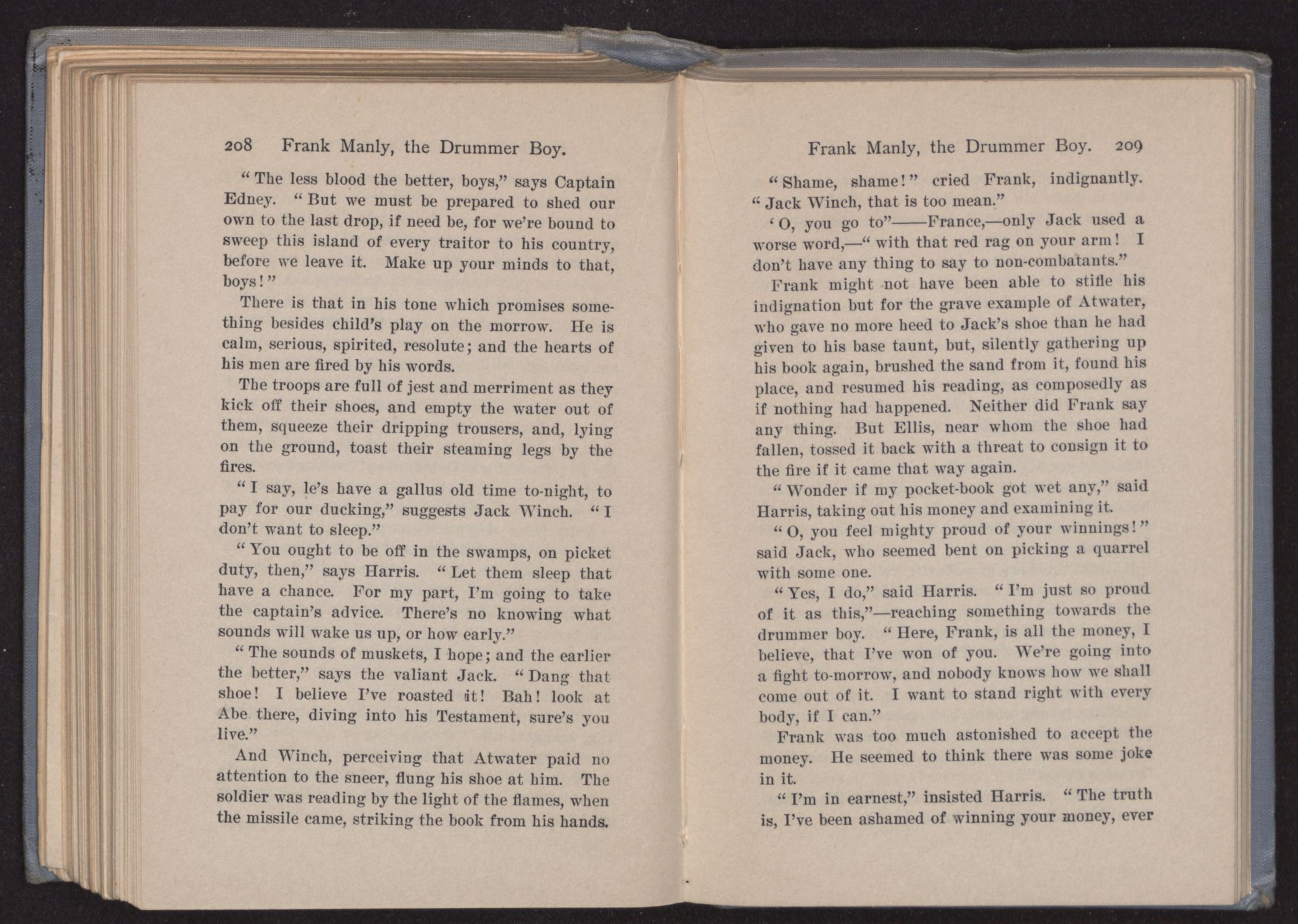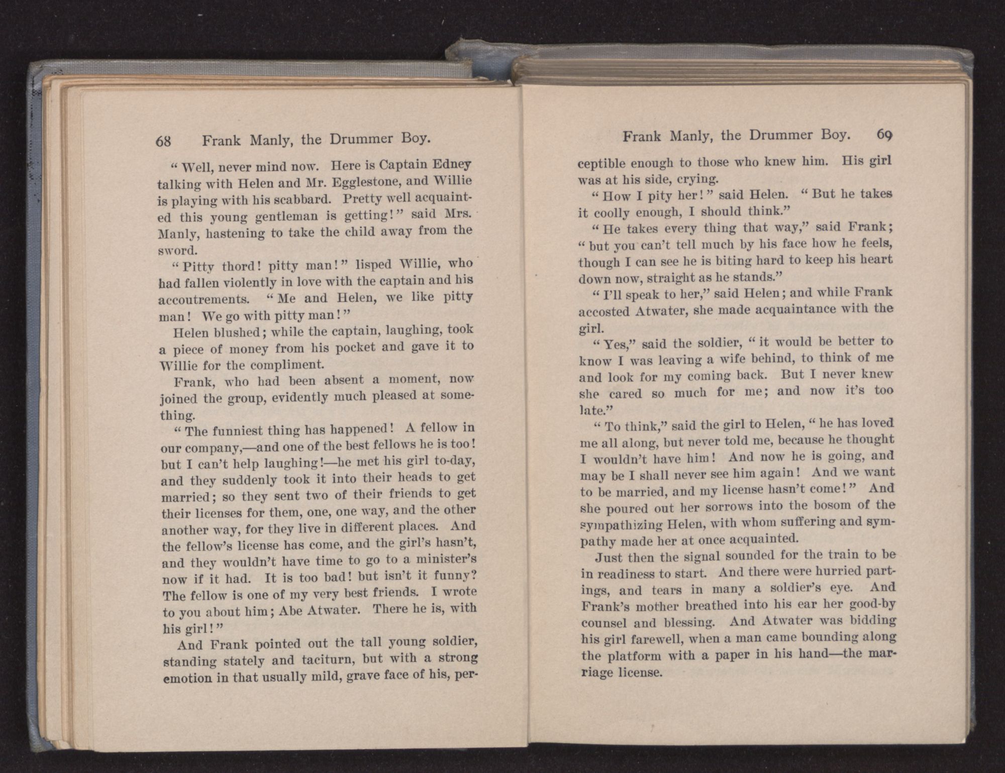 “Yes,” said Frank, “I've thought it all over. It hasn't been out of my thoughts, day or night, this ever so long; though I was determined not to open my lips about it to any one, till my mind was made up. I know five or six that have enlisted, and I'm just as well able to serve my country as any of them. I believe I can go through all the hardships any of them can. And though Helen laughs at me now for a coward, before I've been in a fight, she won't laugh at me afterwards.” But here the lad's voice broke, and he dashed a tear from his eye.