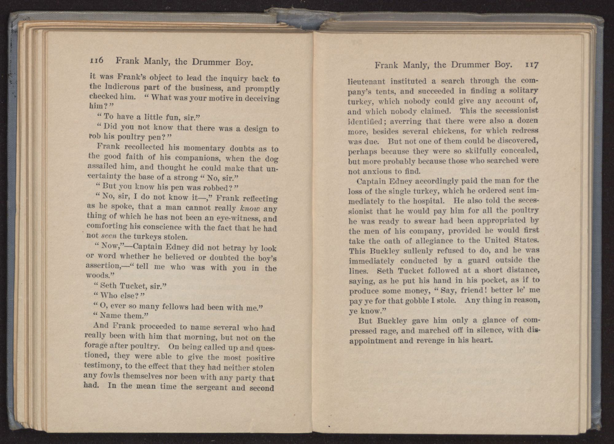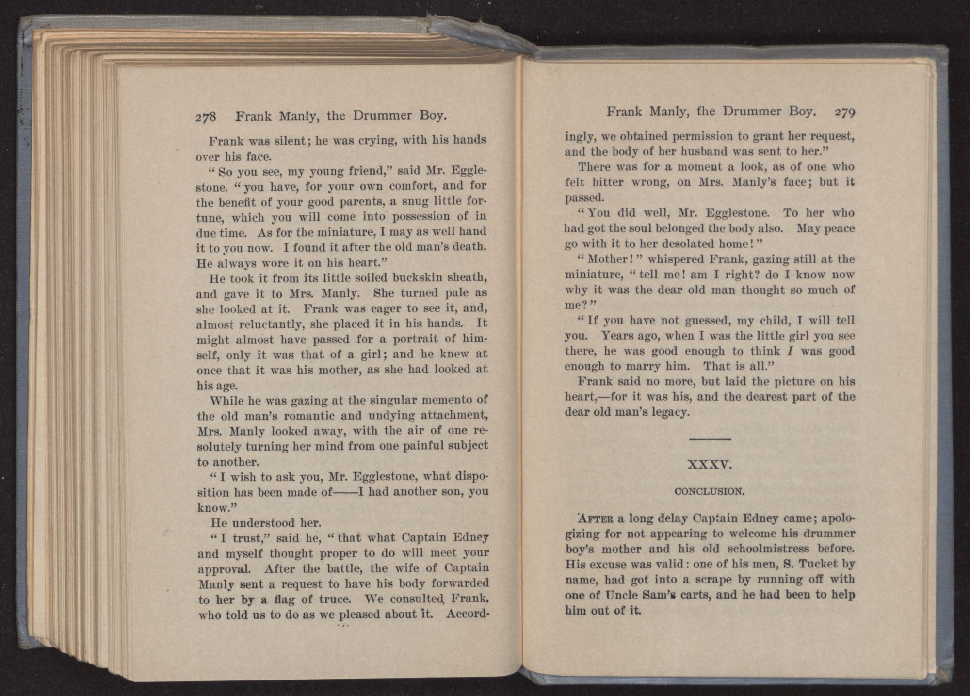 XXXV. CONCLUSION.After a long delay Captain Edney came; apologizing for not appearing to welcome his drummer boy's mother and his old schoolmistress before. His excuse was valid: one of his men, S. Tucket by name, had got into a scrape by running off with one of Uncle Sam's carts, and he had been to help him out of it.
