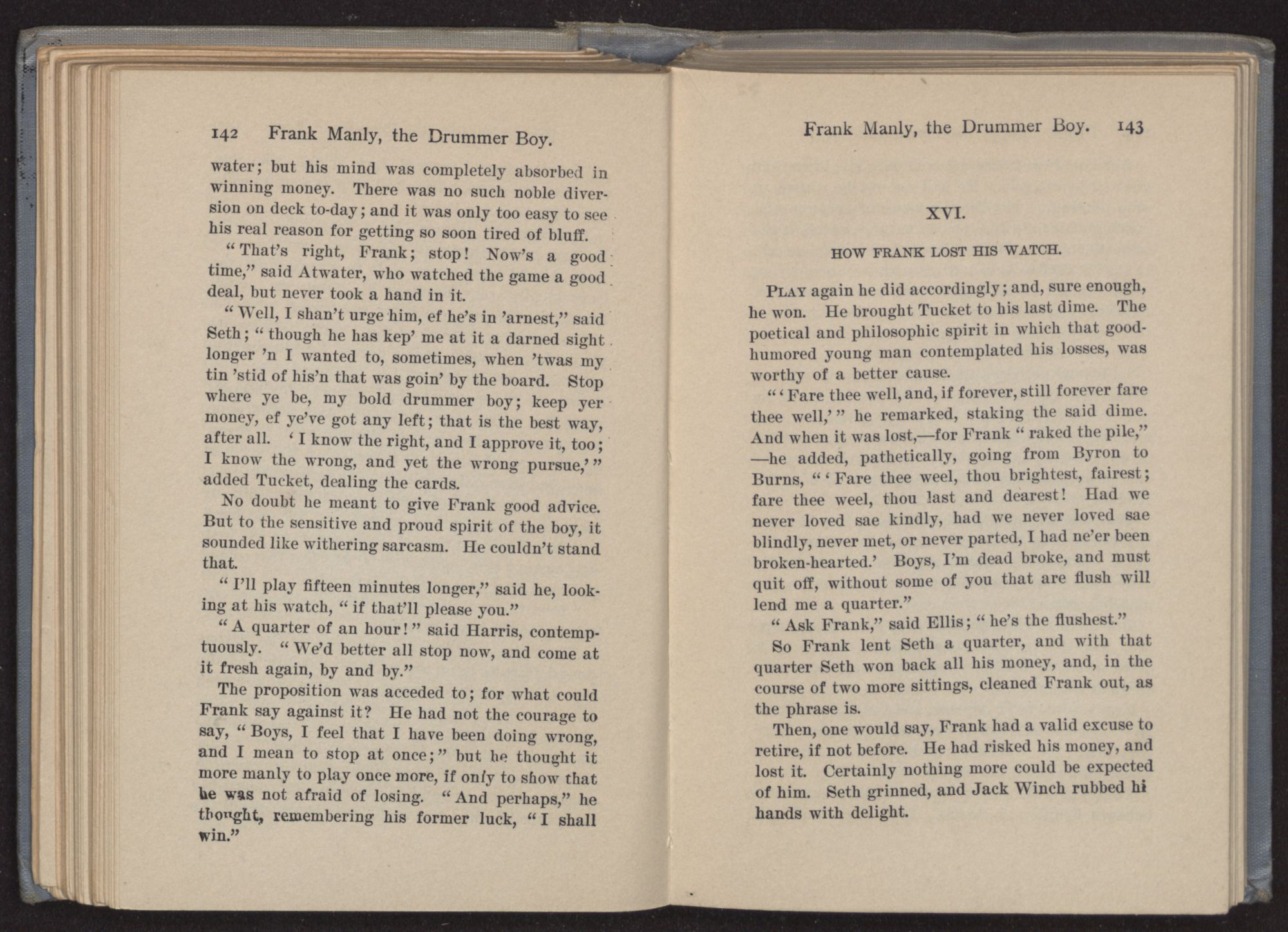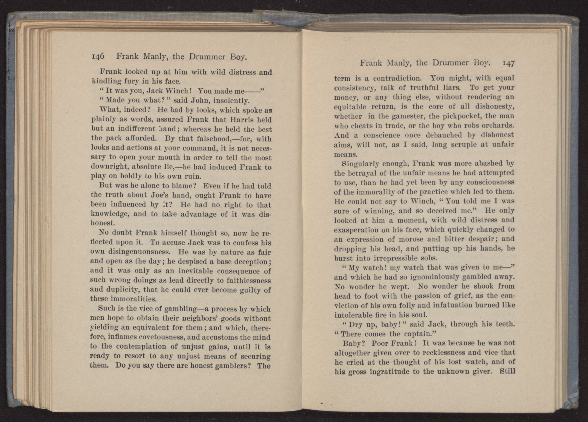 “Well,” exclaimed Frank, filled with pain, almost with indignation, at the thought of any one, especially his mother, suspecting him of such baseness, “there's one thing—you shall hear of my death, before you hear of my drinking, or gambling, or swearing, or any thing of that kind. I promise you that.”
