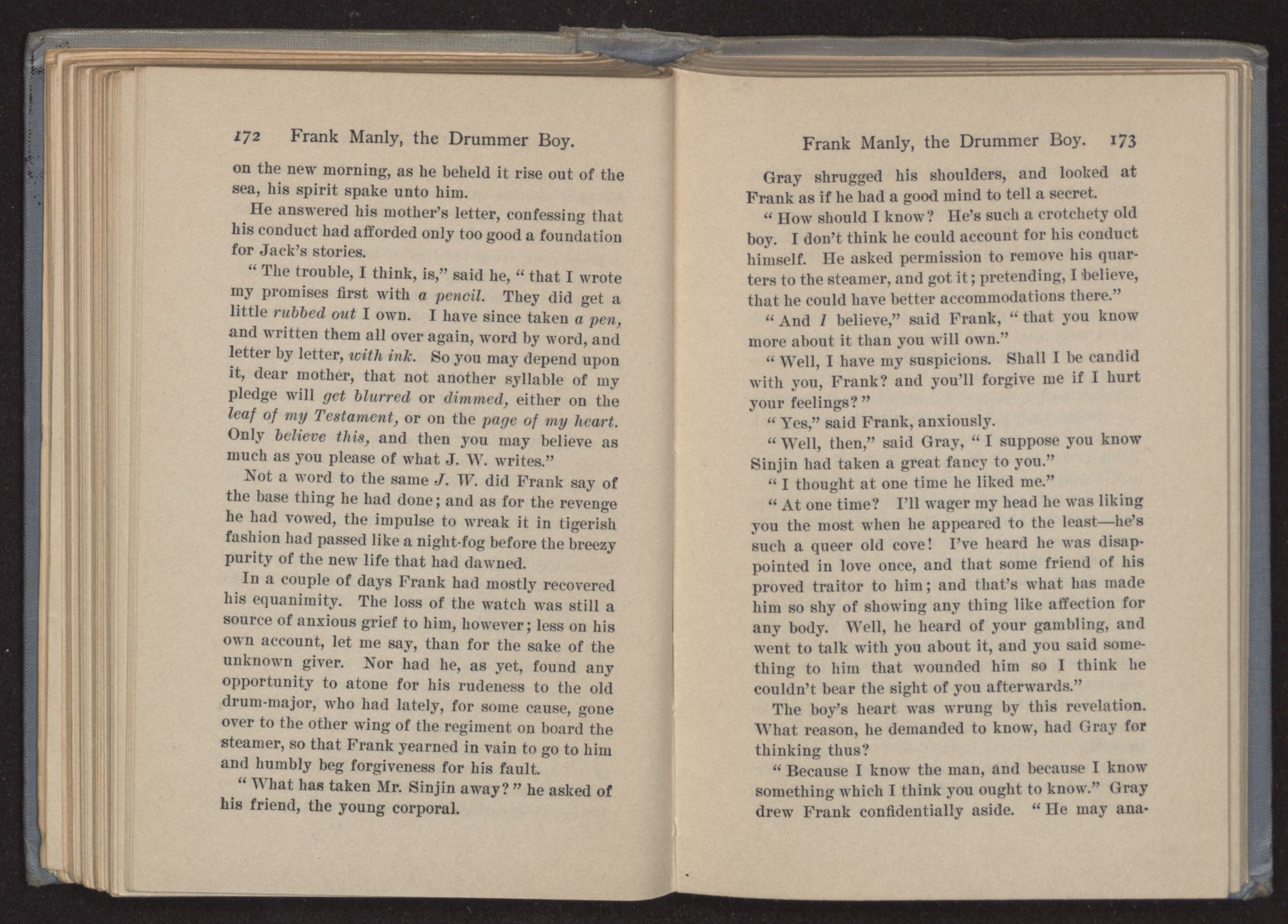 “I cannot tell you, sir, how much astonished I was on opening the package you sent me. I don't think the mysterious bundle that contained the watch dear old ‘Mr. St. John’ gave me surprised me half as much. I had never seen any proof-sheets before, and hardly knew what to make of them at first. Then you should have heard me scream at Gray and Atwater. ‘Boys,’ says I, ‘here's a story founded on our adventures!’ I sat up all that night reading it, and I must confess I had to blush a good many times before I got through. I see you have not called any of us by our real names; but I soon found out who ‘Abe,’ and ‘Seth,’ and