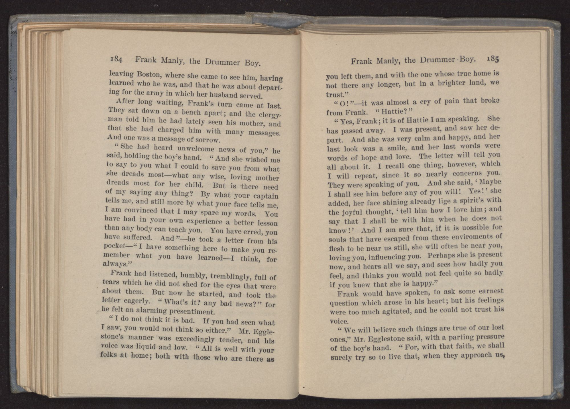 Frank meanwhile was lying on his bed, holding his mother's hands, and drinking in the joy of her presence. And she was feeding his rapture with the tenderest motherly words and looks, and telling him of home.