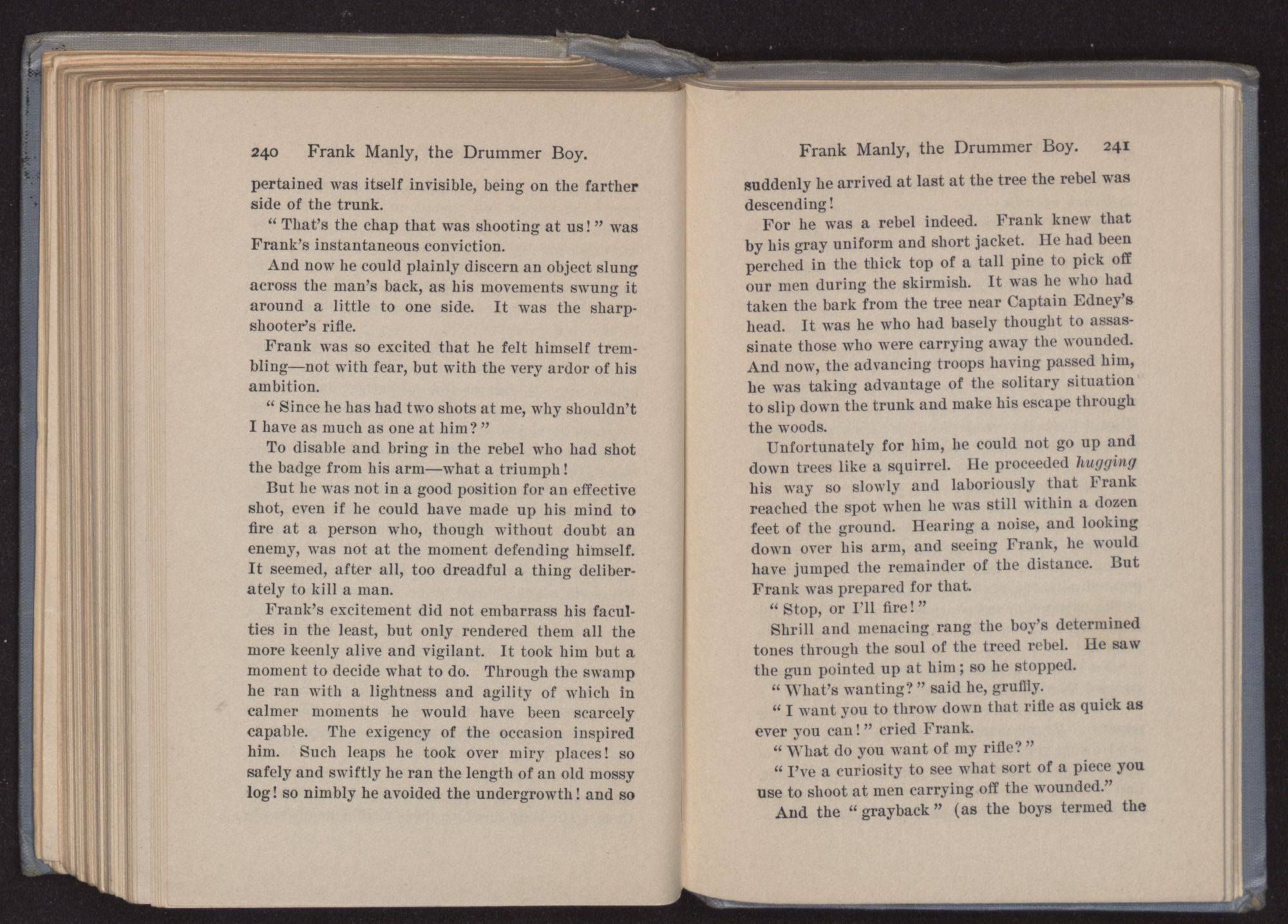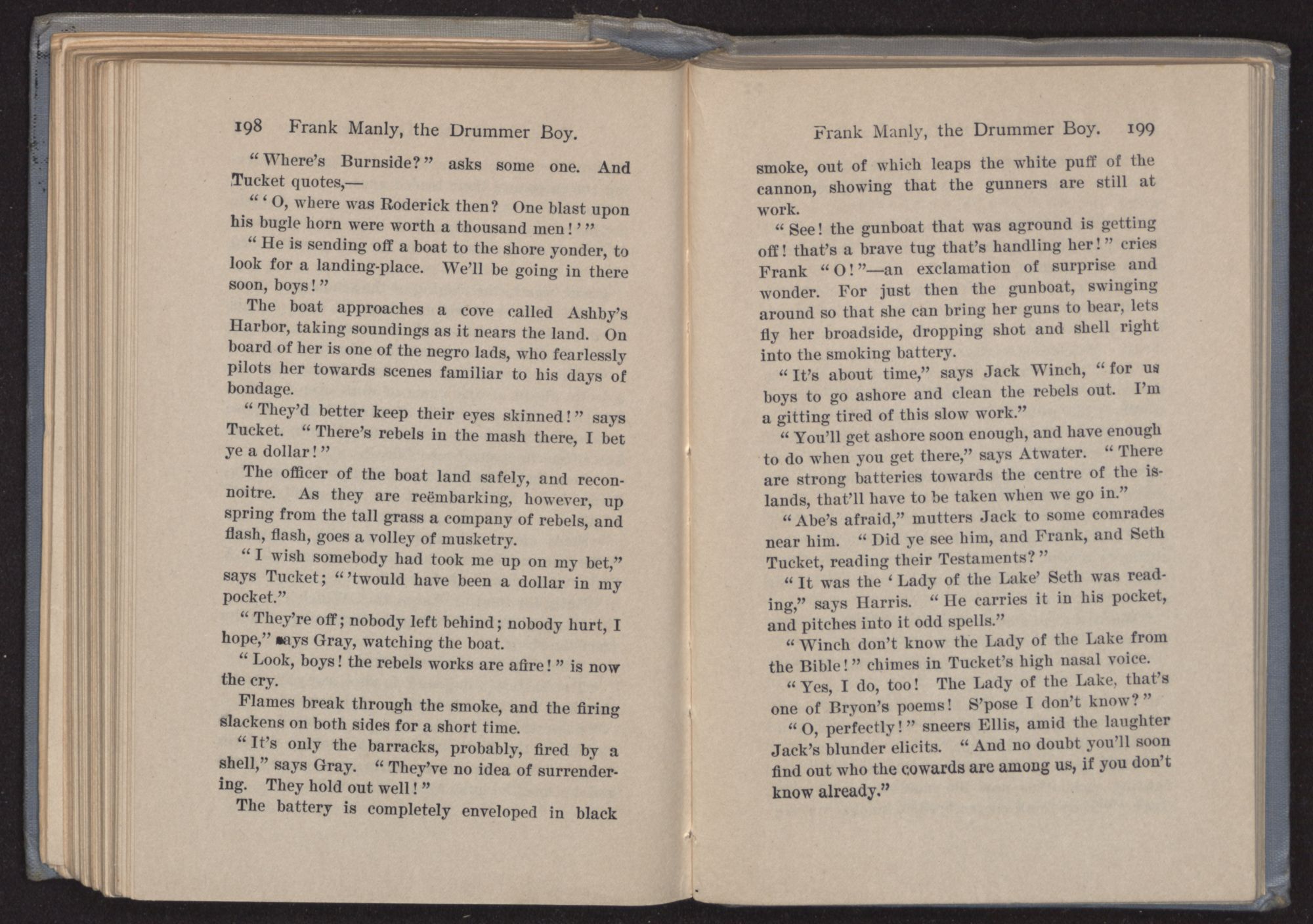 “A pretty soldier you'll make, Frank!” said Helen, his elder sister, laughing at his ambition. “You never fired a gun in your life; and if you should see a rebel, you wouldn't know which end of the gun to point at him, you'd be so frightened.”