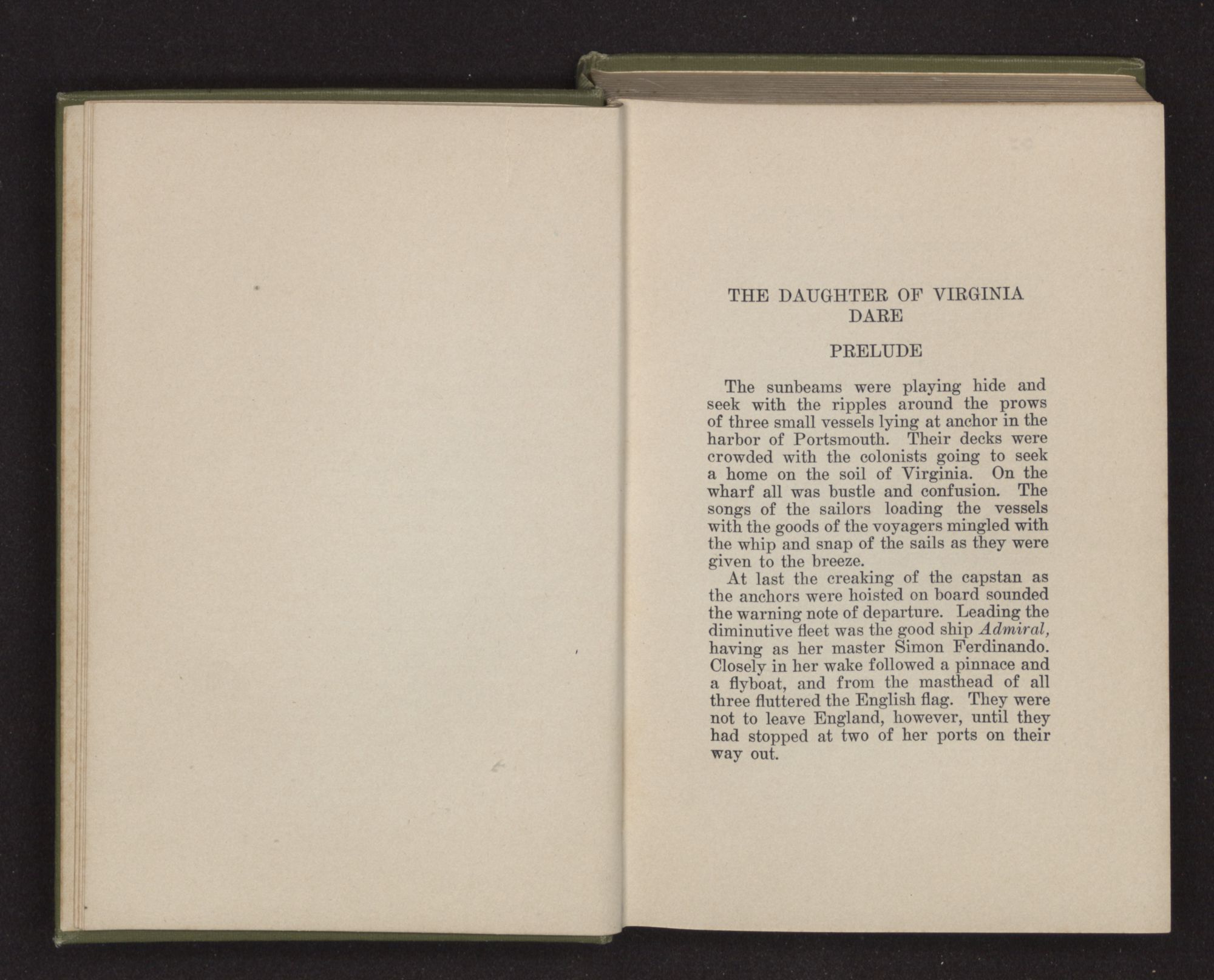 PRELUDEThe sunbeams were playing hide and seek with the ripples around the prows of three small vessels lying at anchor in the harbor of Portsmouth. Their decks were crowded with the colonists going to seek a home on the soil of Virginia. On the wharf all was bustle and confusion. The songs of the sailors loading the vessels with the goods of the voyagers mingled with the whip and snap of the sails as they were given to the breeze.