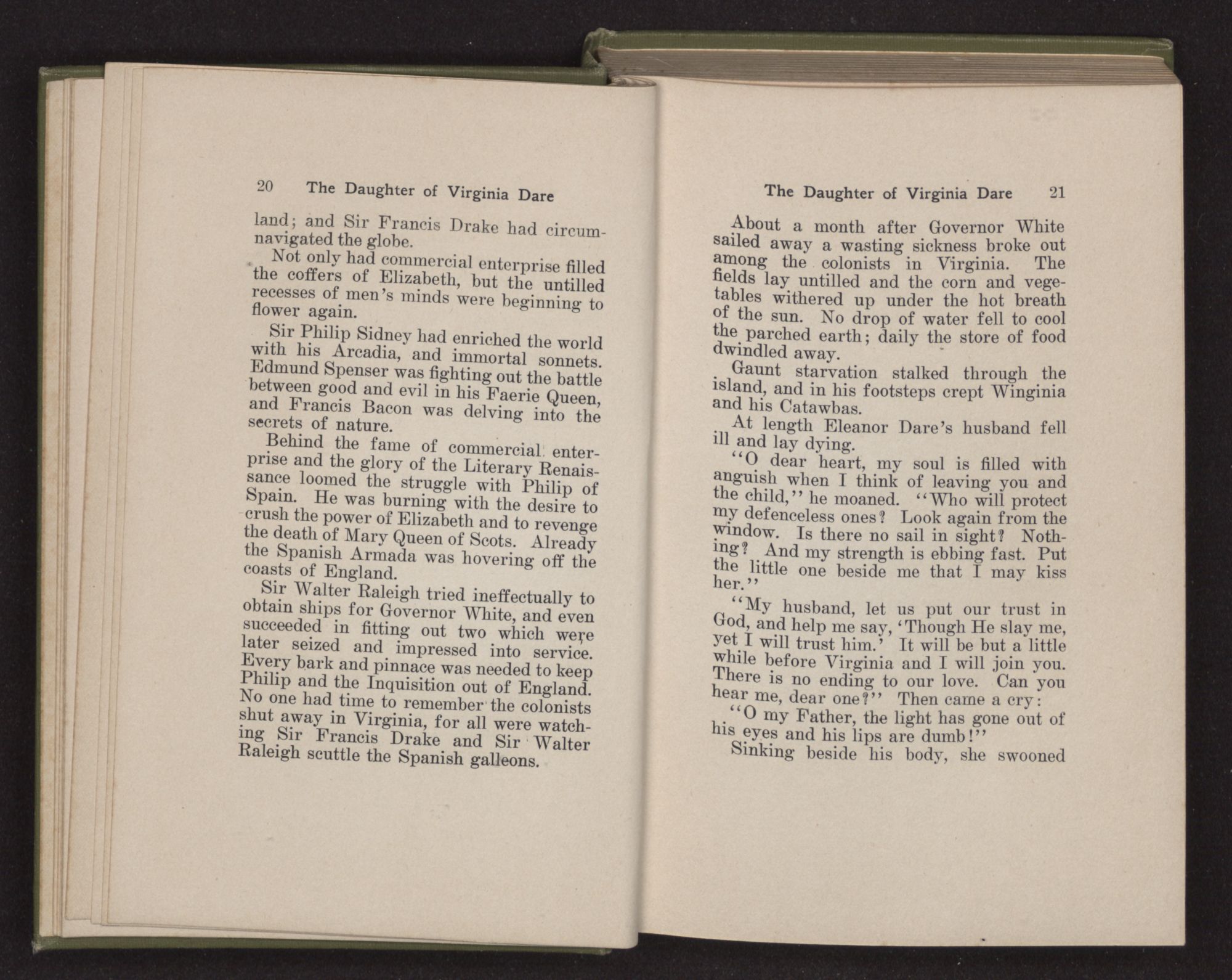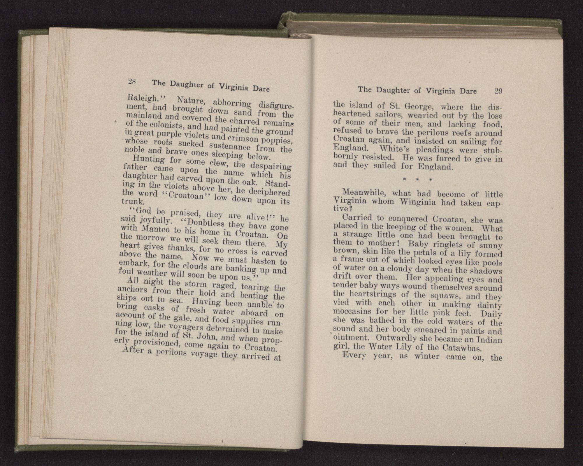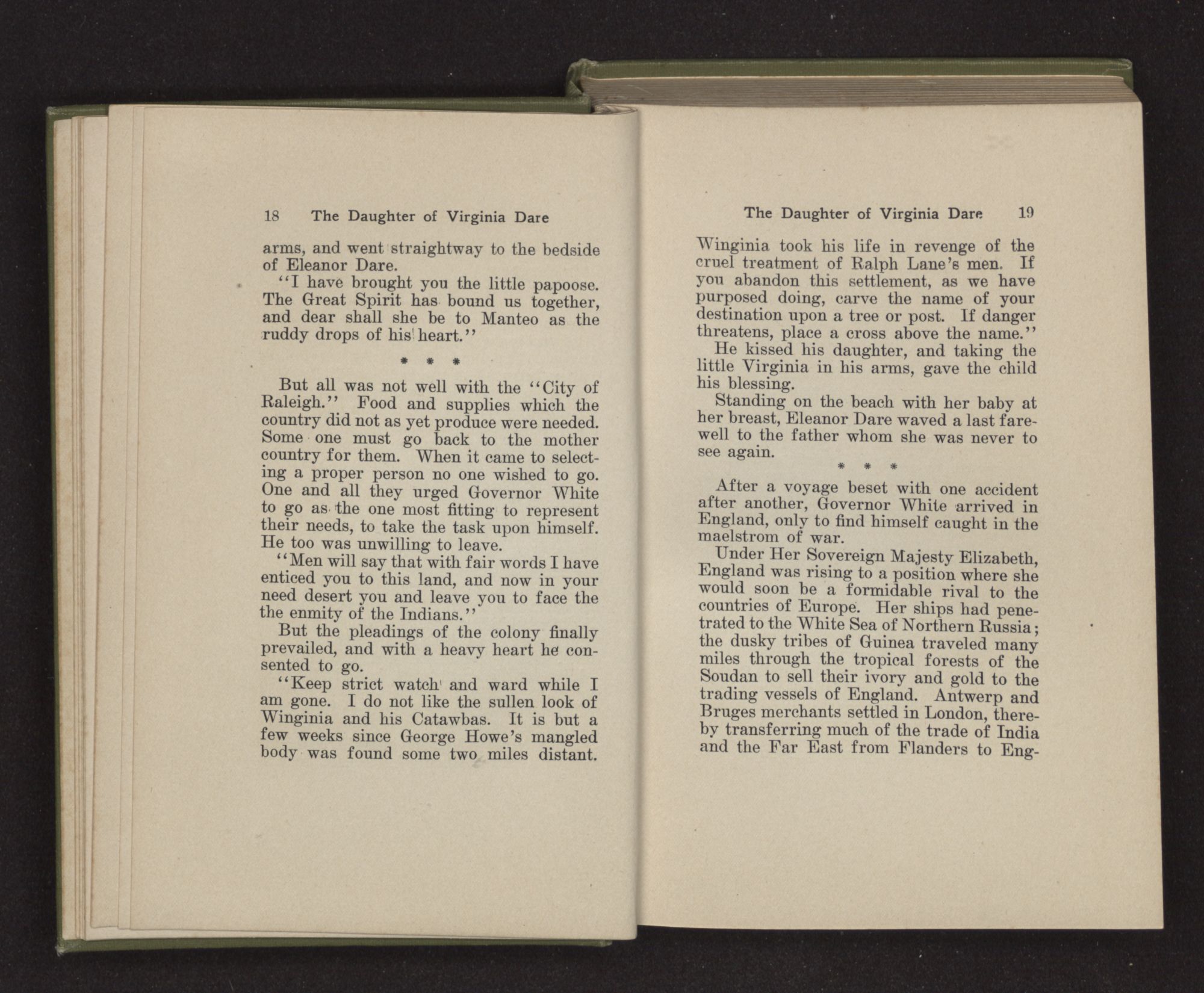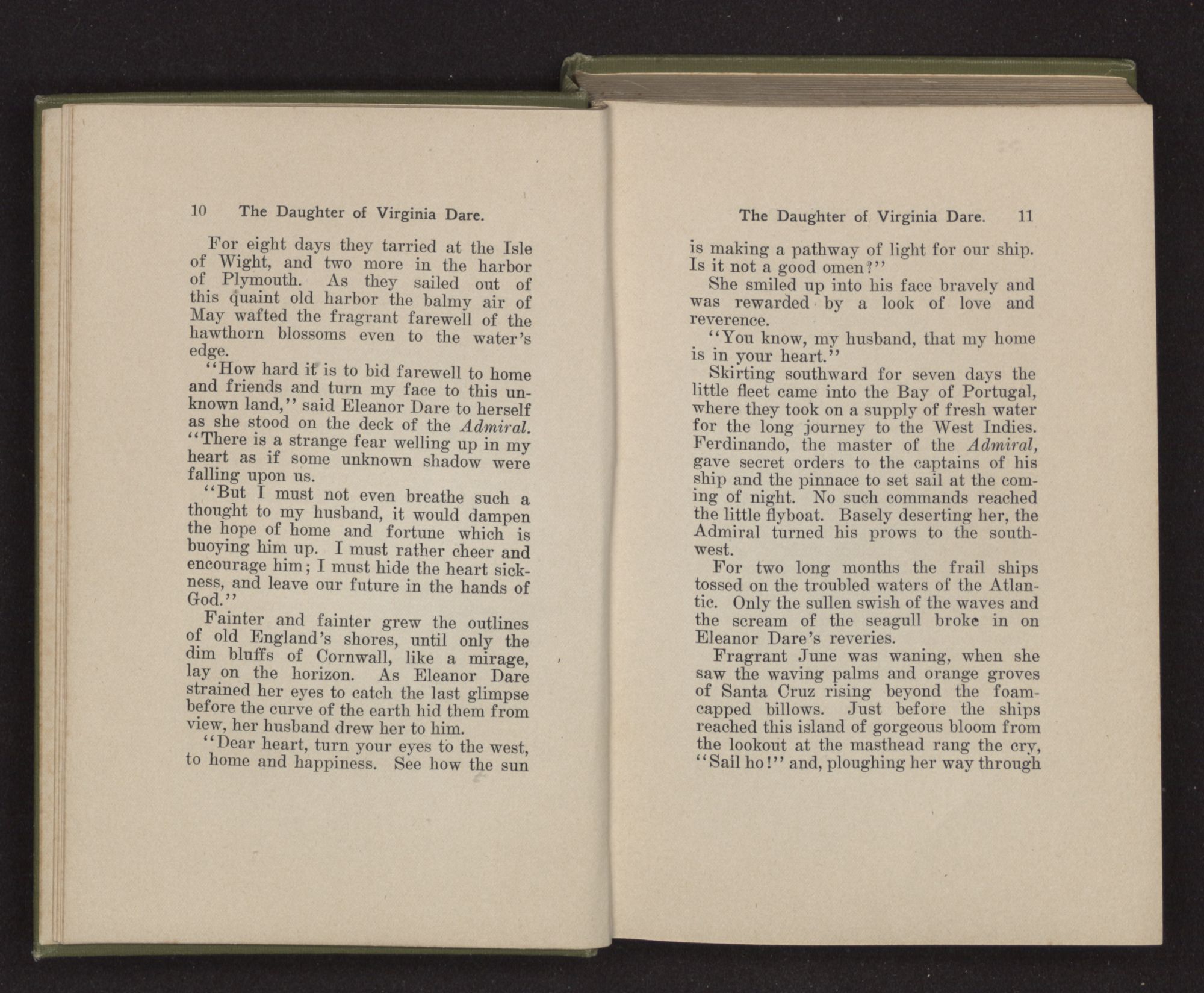 “How hard it is to bid farewell to home and friends and turn my face to this unknown land,” said Eleanor Dare to herself as she stood on the deck of the Admiral. “There is a strange fear welling up in my heart as if some unknown shadow were falling upon us.