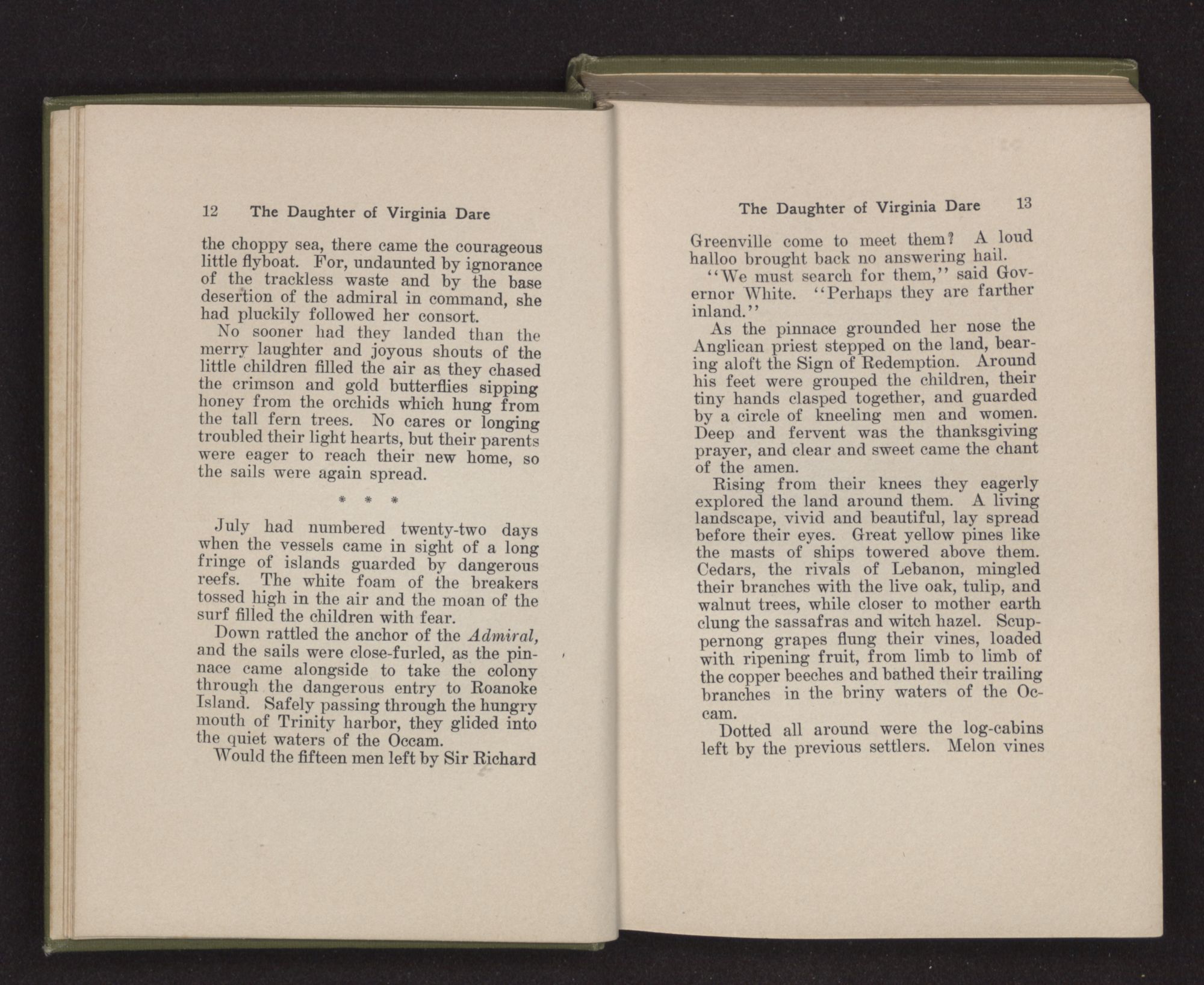 Down rattled the anchor of the Admiral, and the sails were close-furled, as the pinnace came alongside to take the colony through the dangerous entry to Roanoke Island. Safely passing through the hungry mouth of Trinity harbor, they glided into the quiet waters of the Occam.