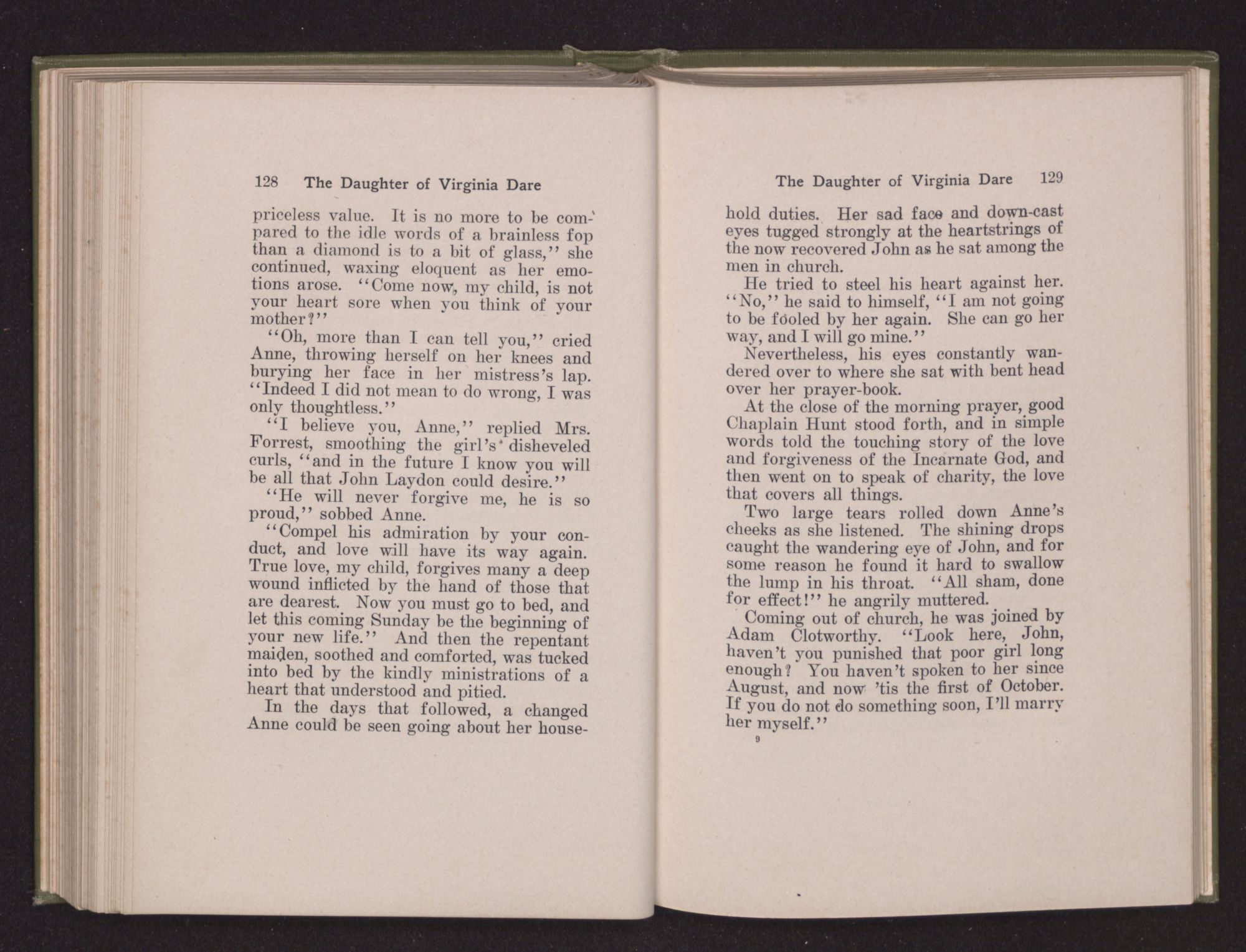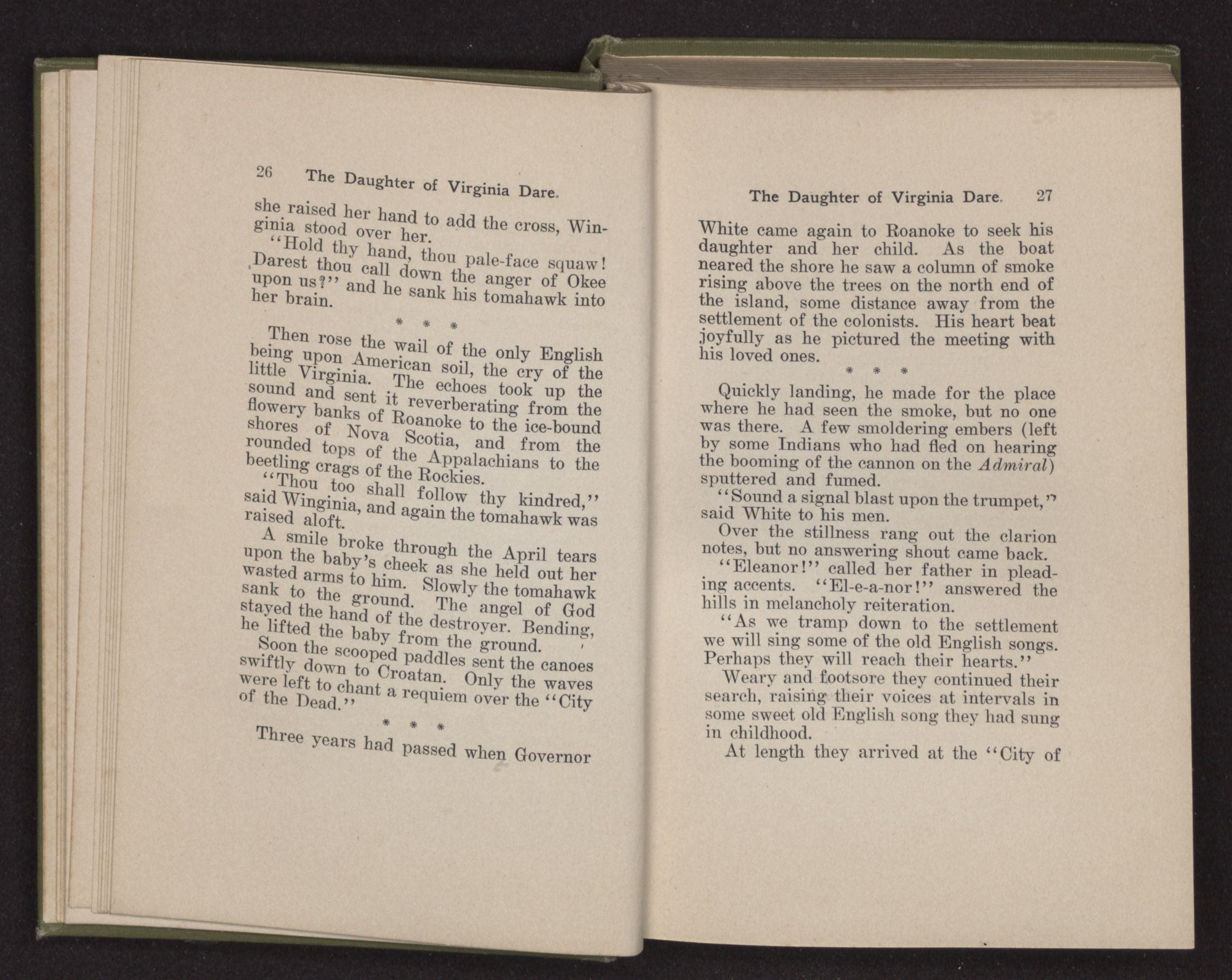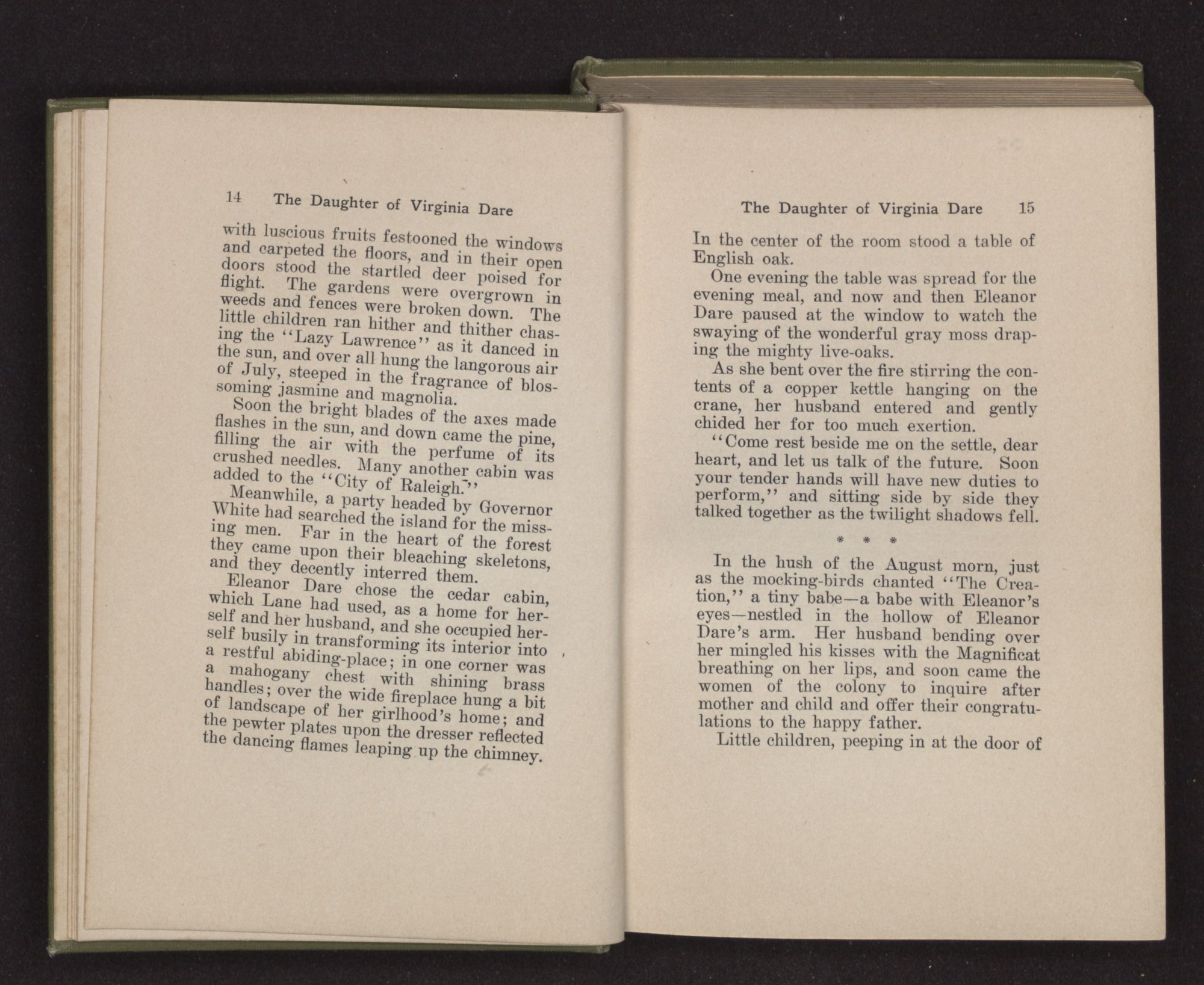 In the hush of the August morn, just as the mocking-birds chanted “The Creation,” a tiny babe—a babe with Eleanor's eyes—nestled in the hollow of Eleanor Dare's arm. Her husband bending over her mingled his kisses with the Magnificat breathing on her lips, and soon came the women of the colony to inquire after mother and child and offer their congratulations to the happy father.