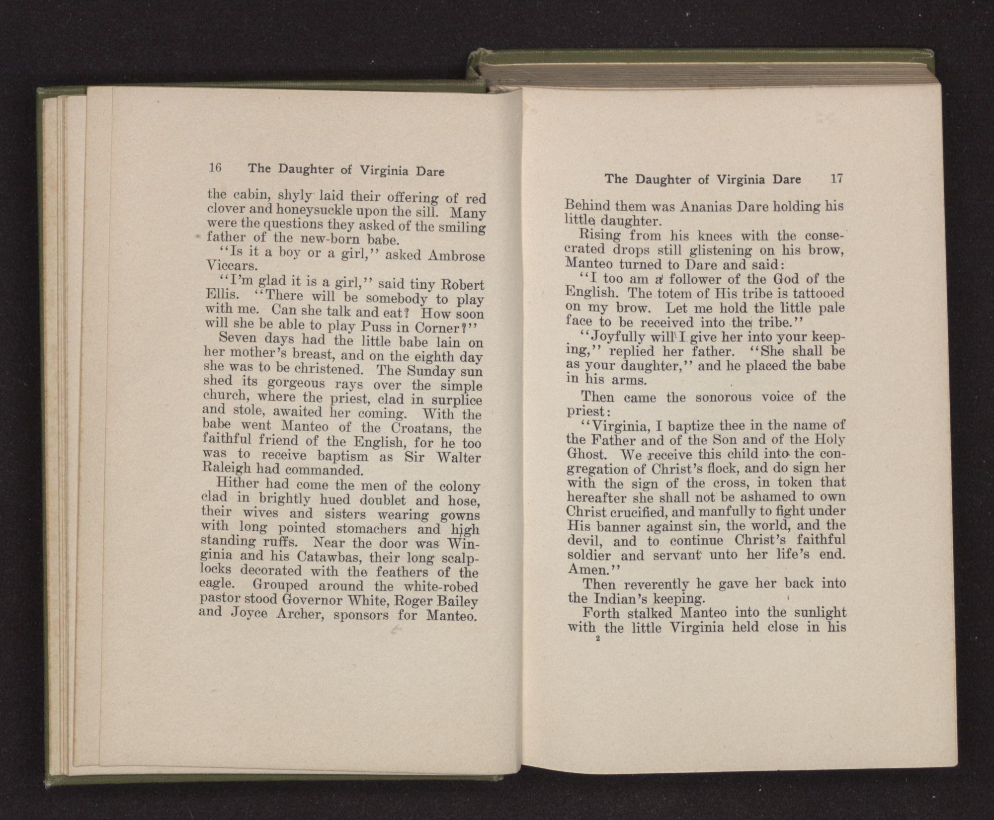 Seven days had the little babe lain on her mother's breast, and on the eighth day she was to be christened. The Sunday sun shed its gorgeous rays over the simple church, where the priest, clad in surplice and stole, awaited her coming. With the babe went Manteo of the Croatans, the faithful friend of the English, for he too was to receive baptism as Sir Walter Raleigh had commanded.