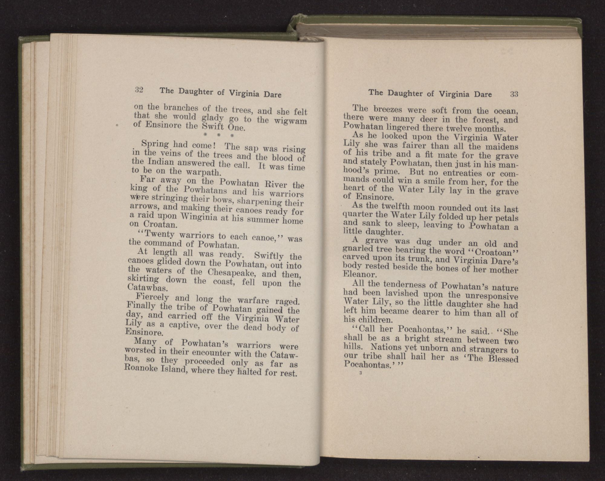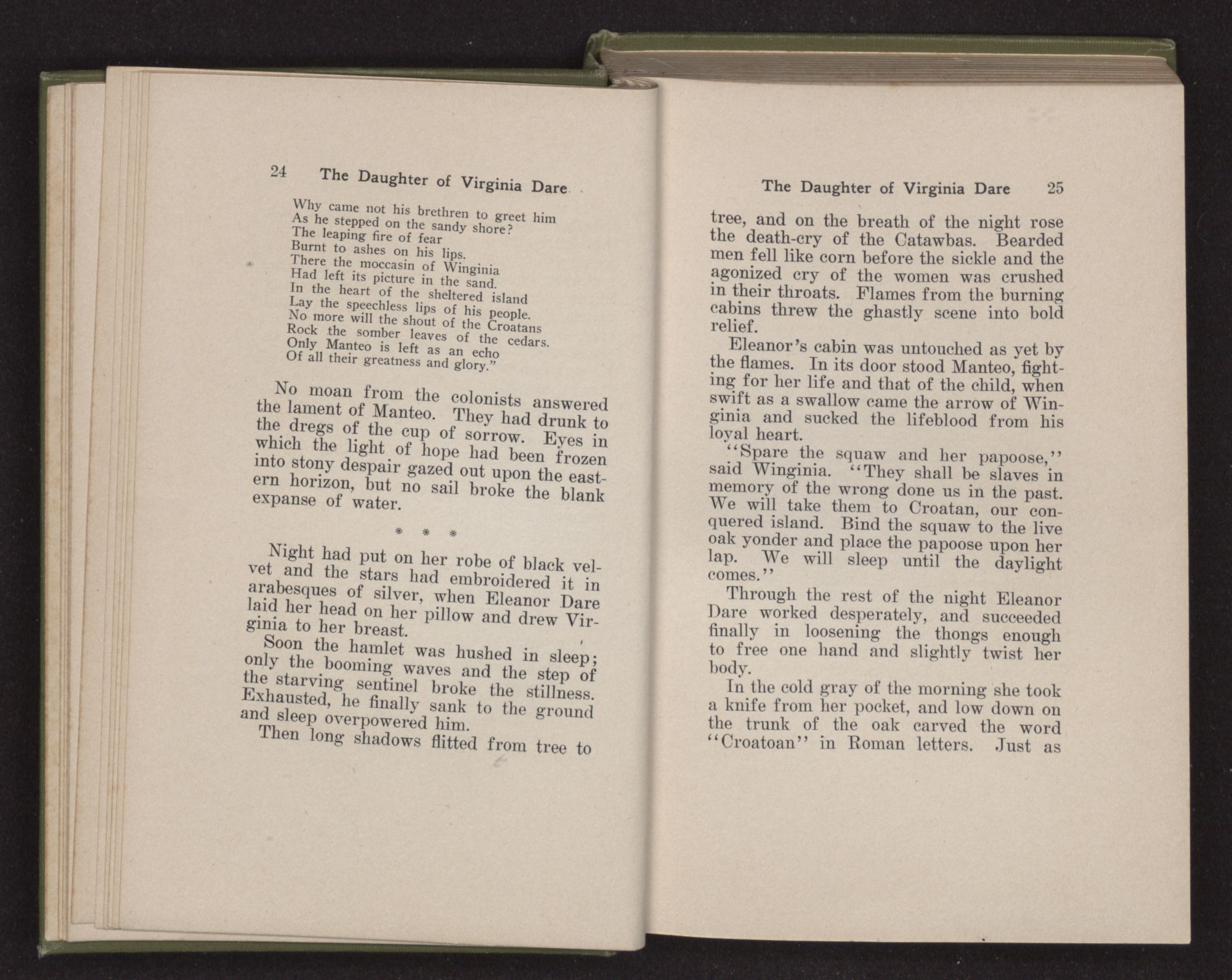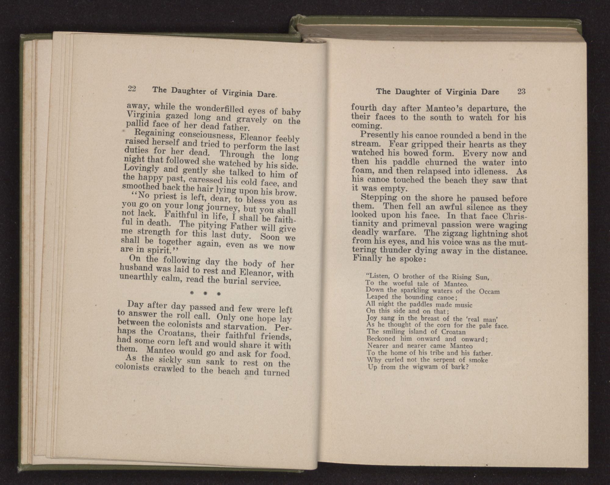 “Listen, O brother of the Rising Sun,To the woeful tale of Manteo.Down the sparkling waters of the OccamLeaped the bounding canoe;All night the paddles made musicOn this side and on that;Joy sang in the breast of the ‘real man’As he thought of the corn for the pale face.The smiling island of CroatanBeckoned him onward and onward;Nearer and nearer came ManteoTo the home of his tribe and his father.Why curled not the serpent of smokeUp from the wigwam of bark?Why came not his brethren to greet himAs he stepped on the sandy shore?The leaping fire of fearBurnt to ashes on his lips.There the moccasin of WinginiaHad left its picture in the sand.In the heart of the sheltered islandLay the speechless lips of his people.No more will the shout of the CroatansRock the somber leaves of the cedars.Only Manteo is left as an echoOf all their greatness and glory.”