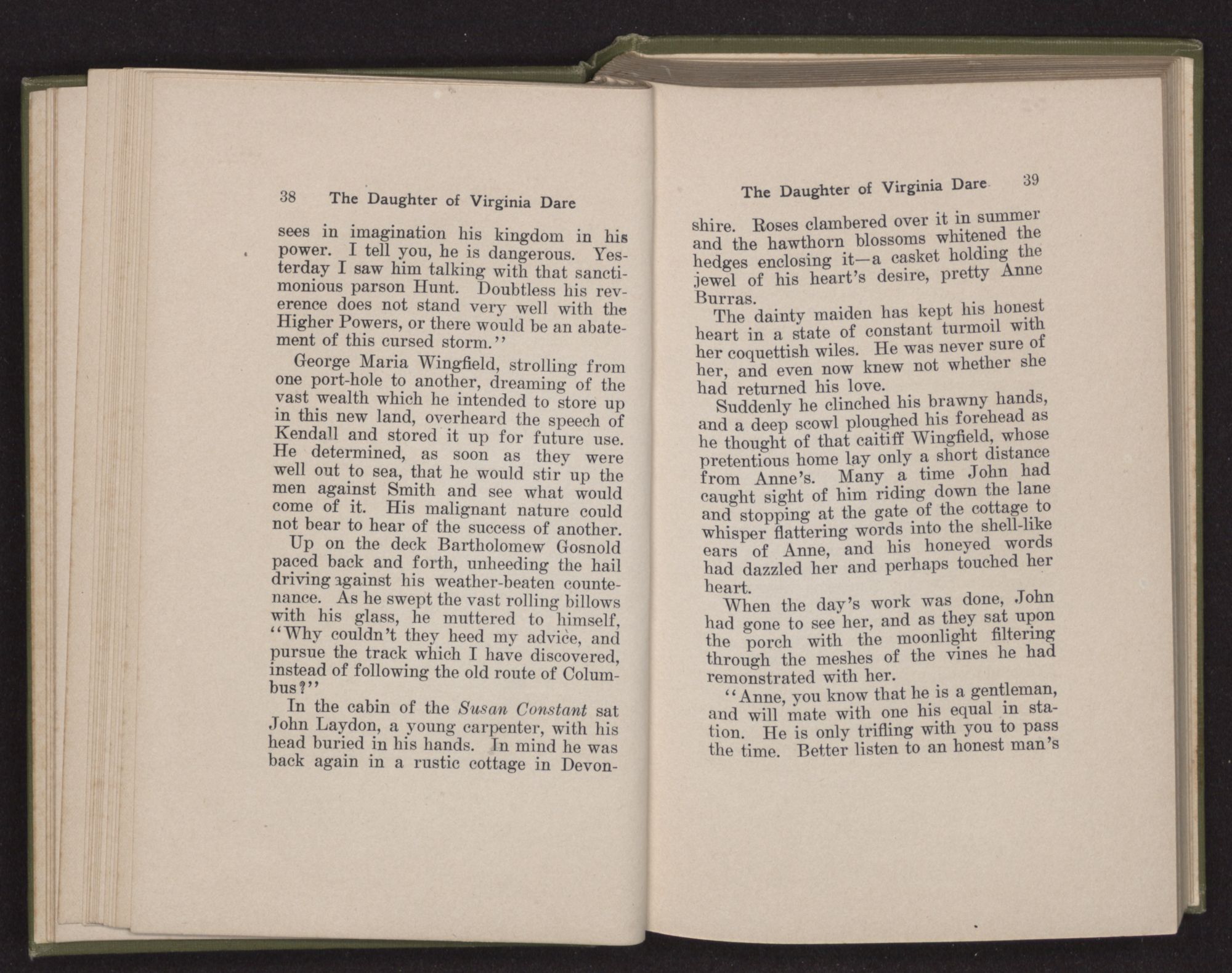 Fainter and fainter grew the outlines of old England's shores, until only the dim bluffs of Cornwall, like a mirage, lay on the horizon. As Eleanor Dare strained her eyes to catch the last glimpse before the curve of the earth hid them from view, her husband drew her to him.