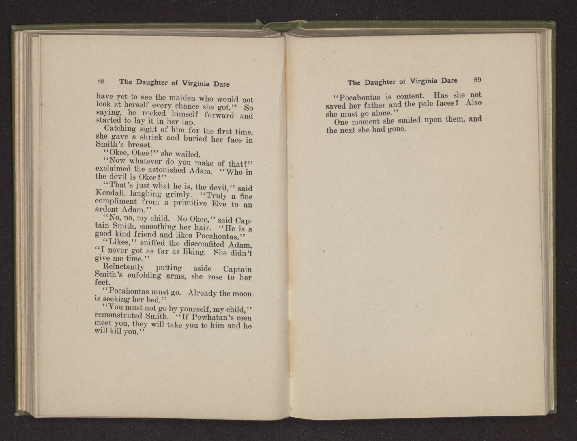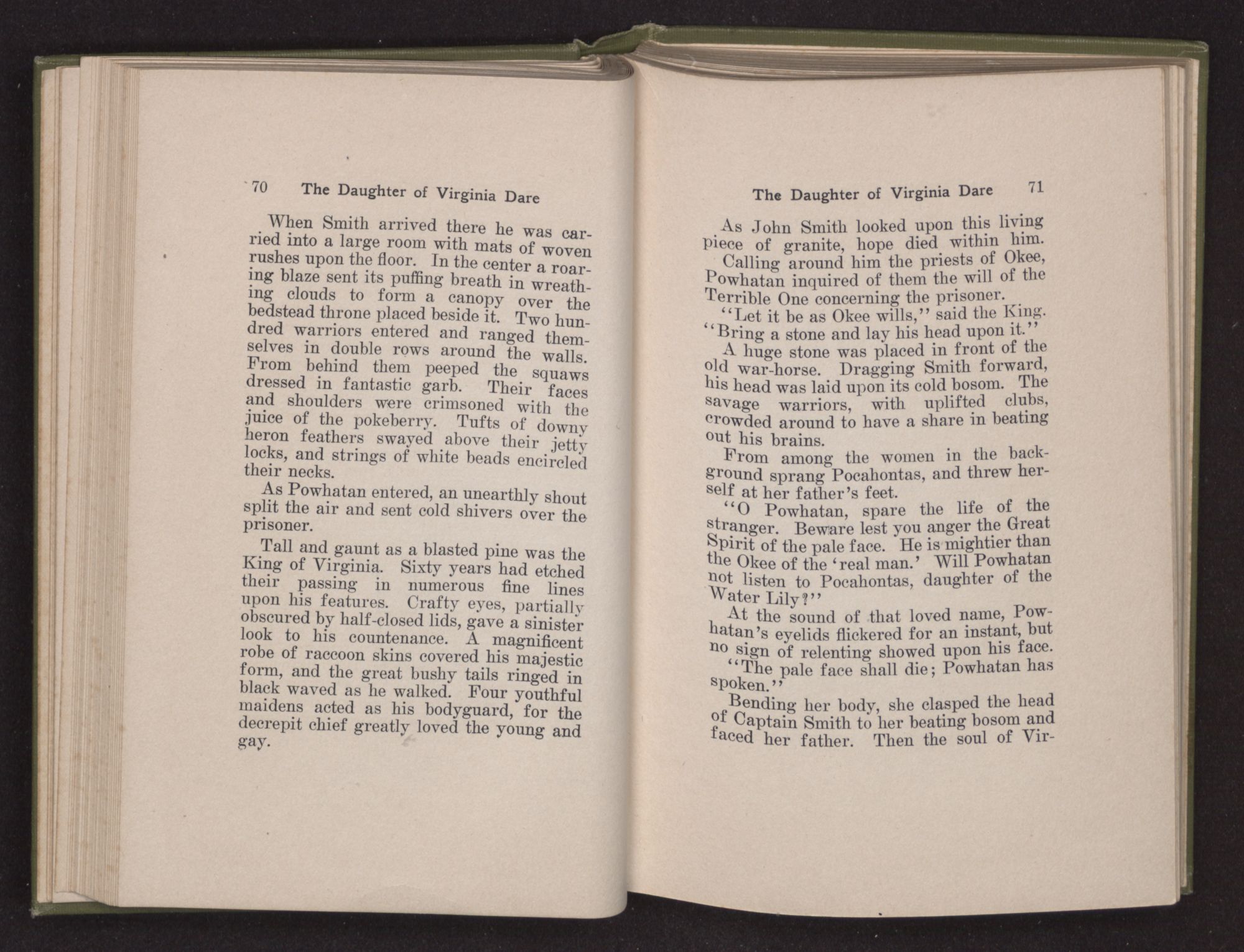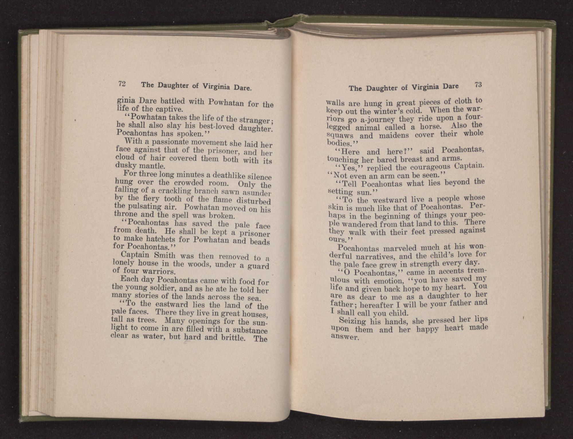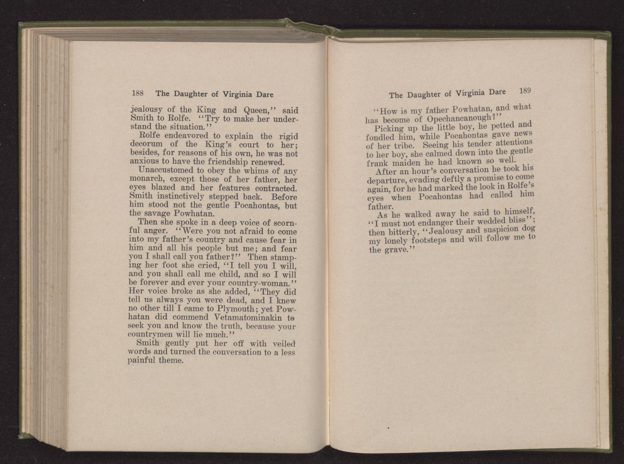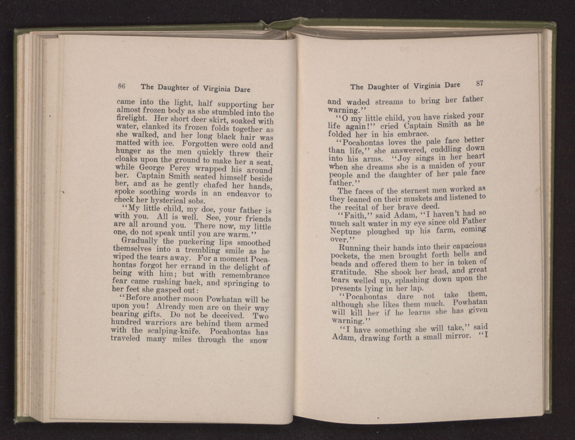 Then she spoke in a deep voice of scornful anger. “Were you not afraid to come into my father's country and cause fear in him and all his people but me; and fear you I shall call you father?” Then stamping her foot she cried, “I tell you I will, and you shall call me child, and so I will be forever and ever your country-woman.” Her voice broke as she added, “They did tell us always you were dead, and I knew no other till I came to Plymouth; yet Powhatan did commend Vetamatominakin to seek you and know the truth, because your countrymen will lie much.”