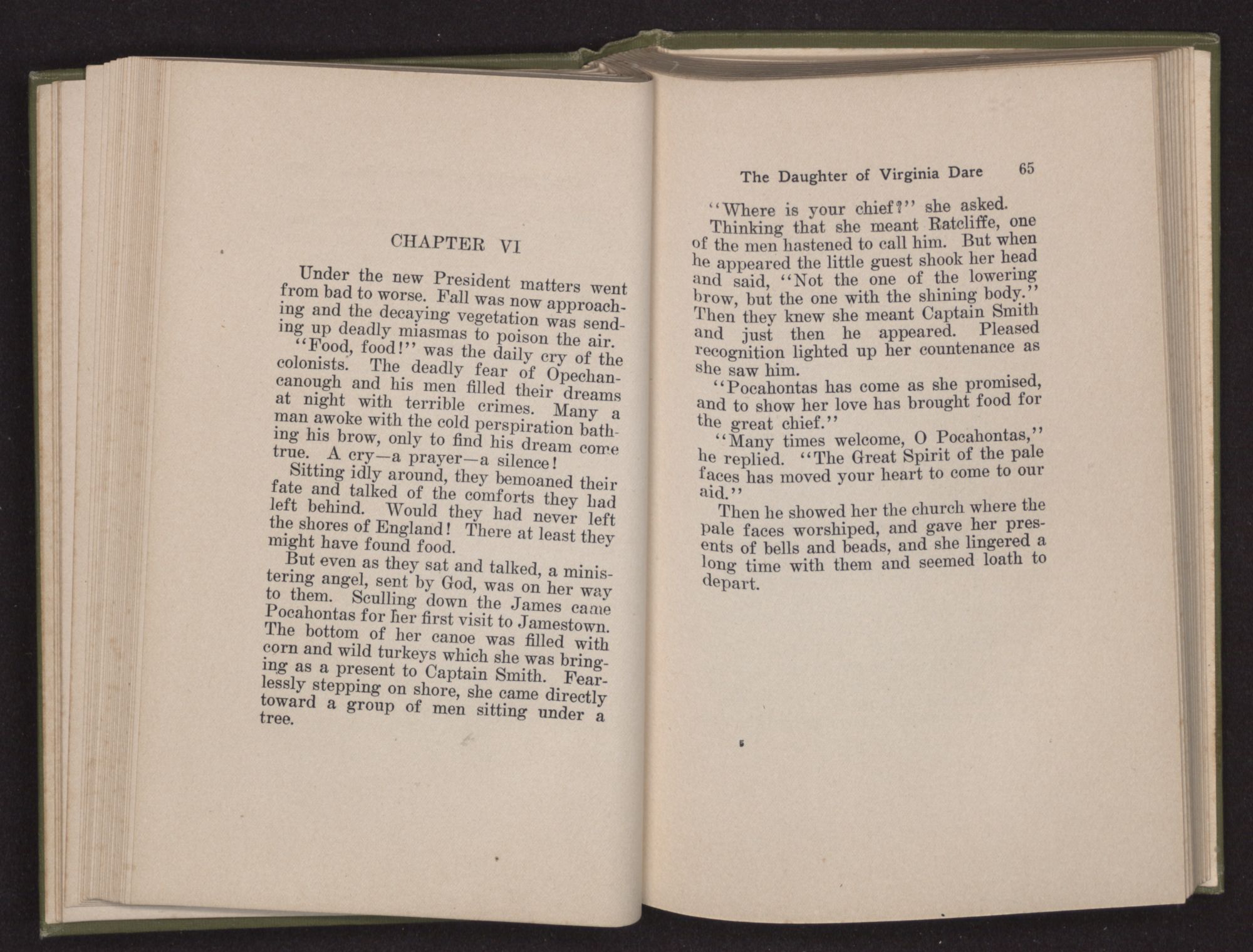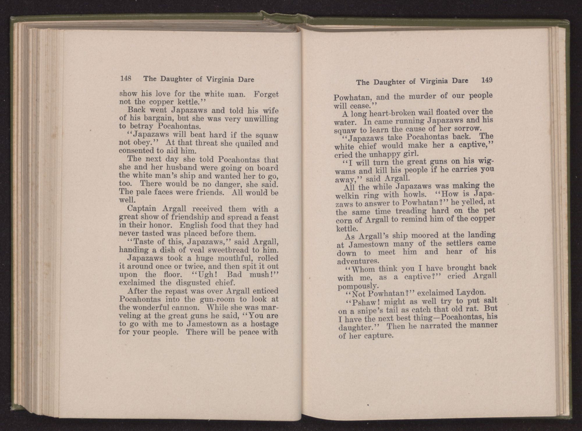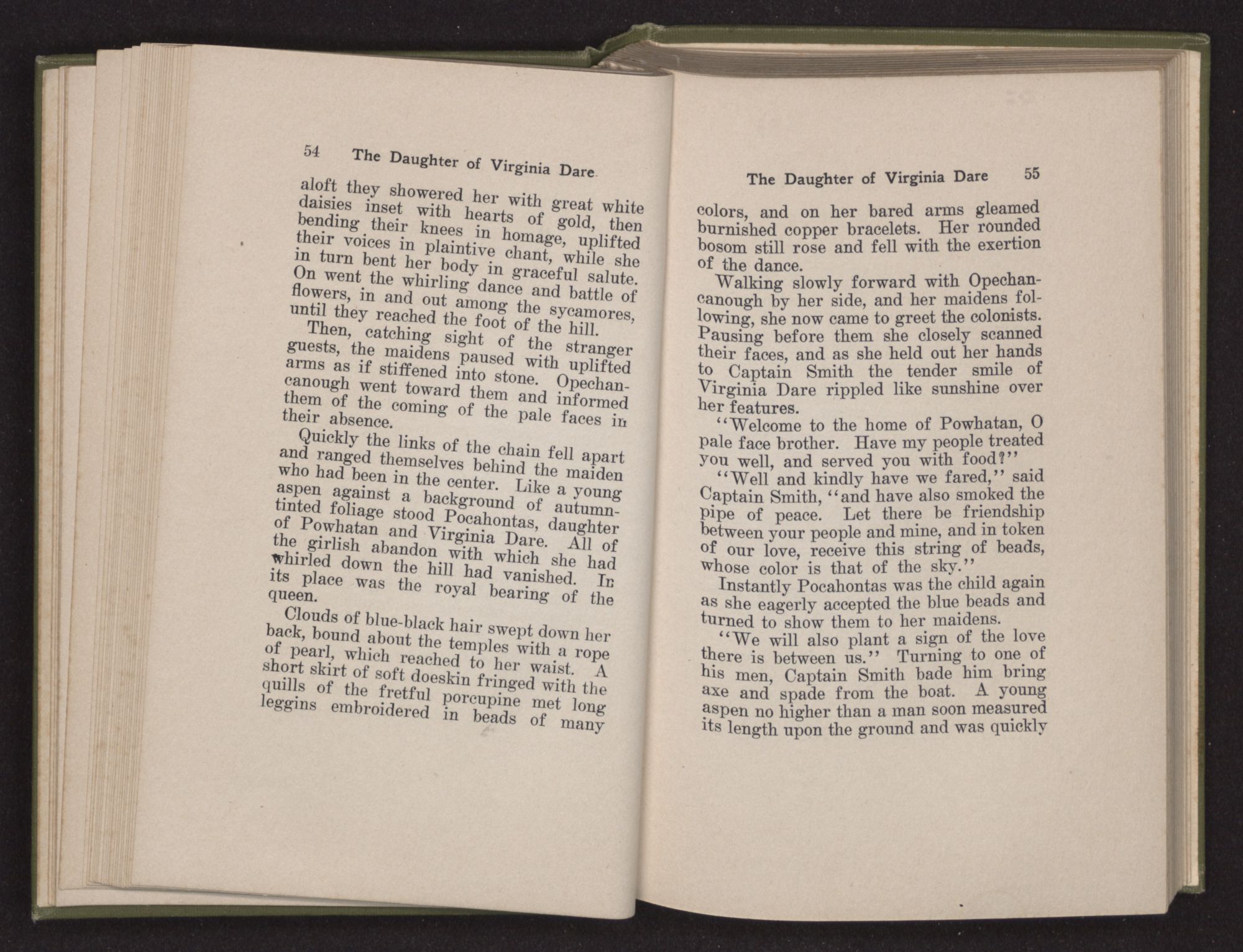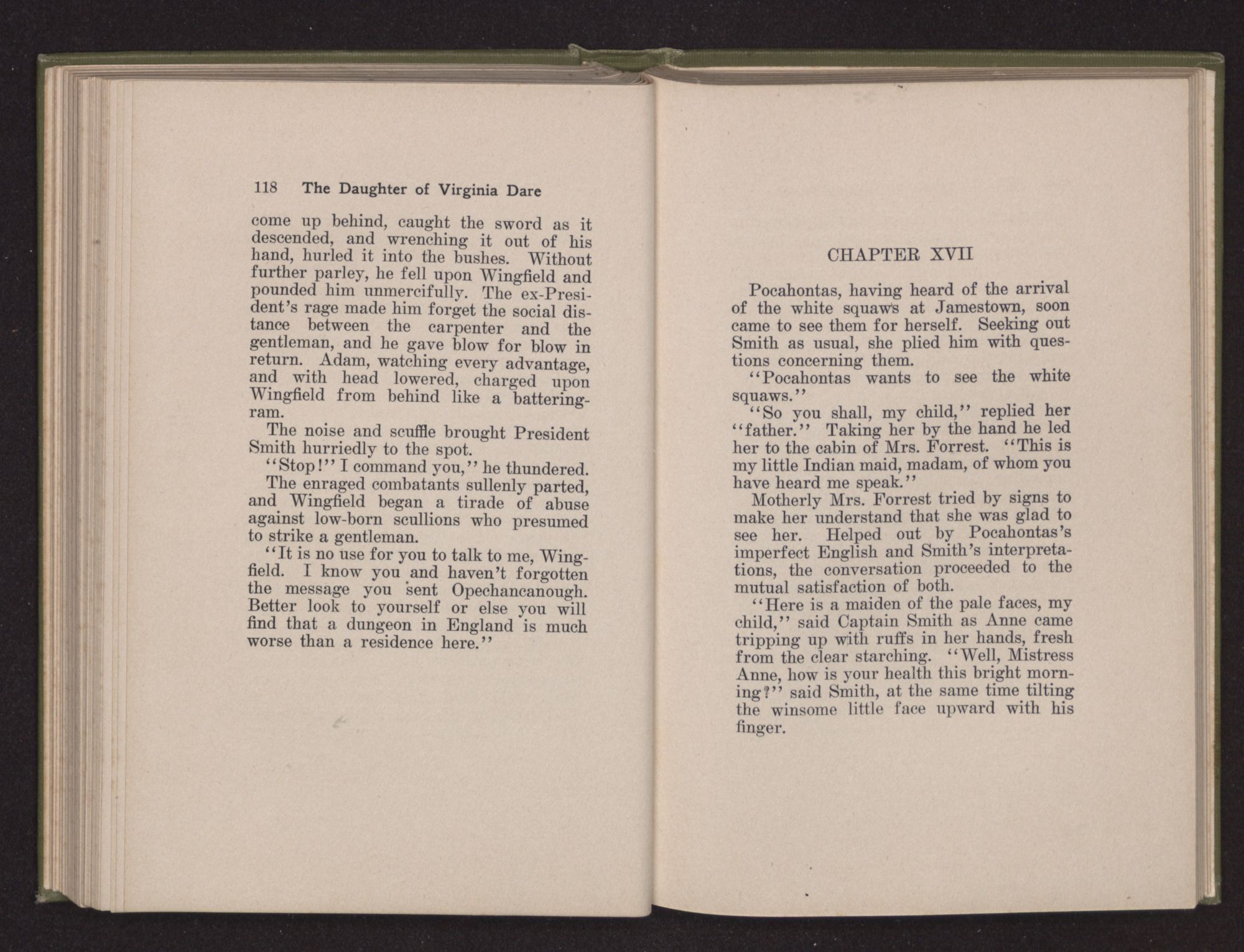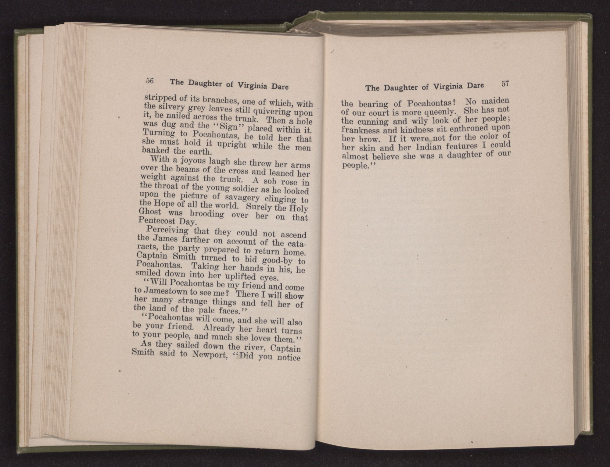 Then she spoke in a deep voice of scornful anger. “Were you not afraid to come into my father's country and cause fear in him and all his people but me; and fear you I shall call you father?” Then stamping her foot she cried, “I tell you I will, and you shall call me child, and so I will be forever and ever your country-woman.” Her voice broke as she added, “They did tell us always you were dead, and I knew no other till I came to Plymouth; yet Powhatan did commend Vetamatominakin to seek you and know the truth, because your countrymen will lie much.”