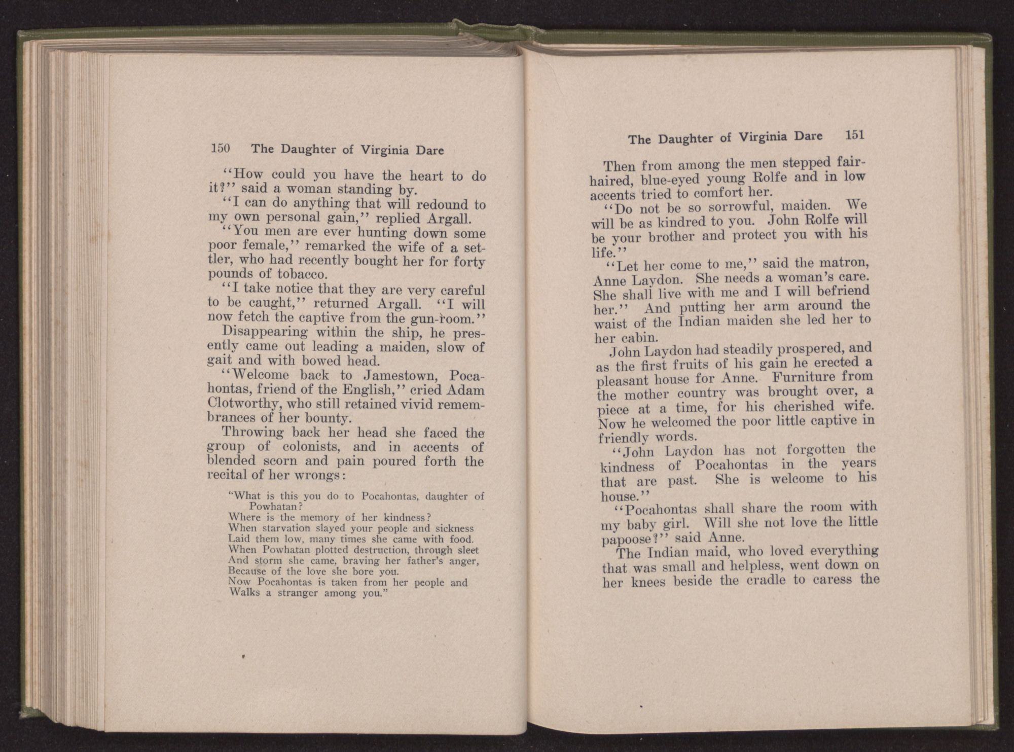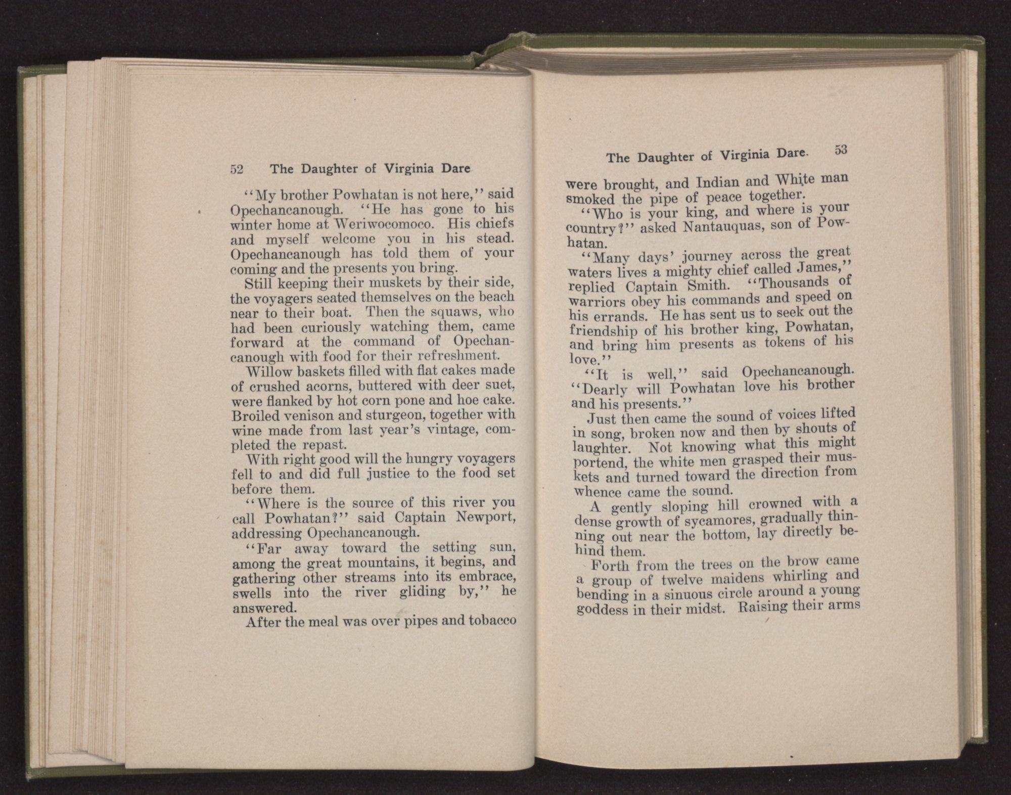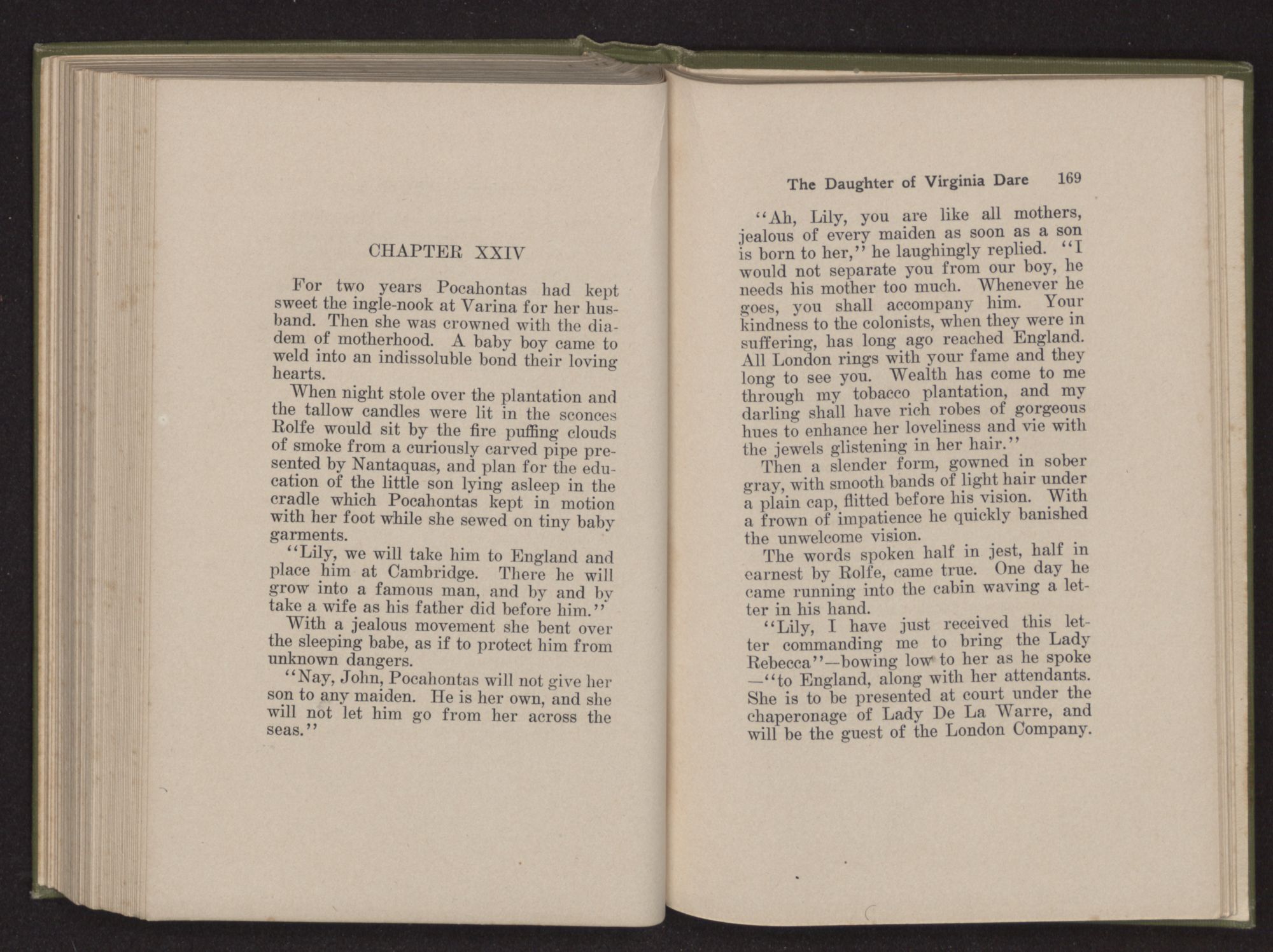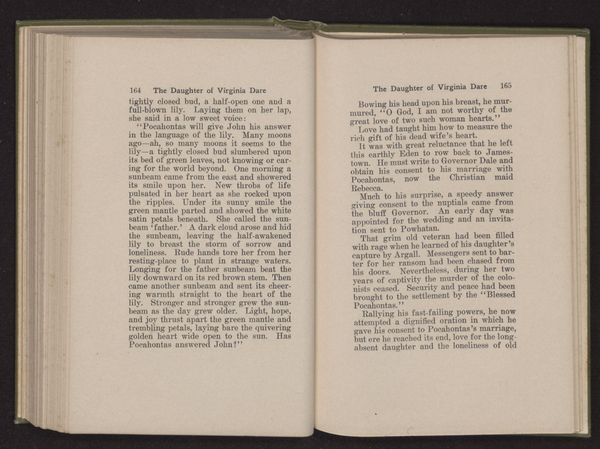 Then she spoke in a deep voice of scornful anger. “Were you not afraid to come into my father's country and cause fear in him and all his people but me; and fear you I shall call you father?” Then stamping her foot she cried, “I tell you I will, and you shall call me child, and so I will be forever and ever your country-woman.” Her voice broke as she added, “They did tell us always you were dead, and I knew no other till I came to Plymouth; yet Powhatan did commend Vetamatominakin to seek you and know the truth, because your countrymen will lie much.”