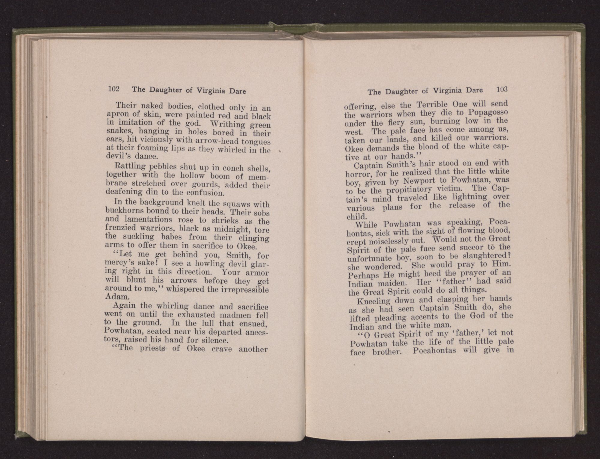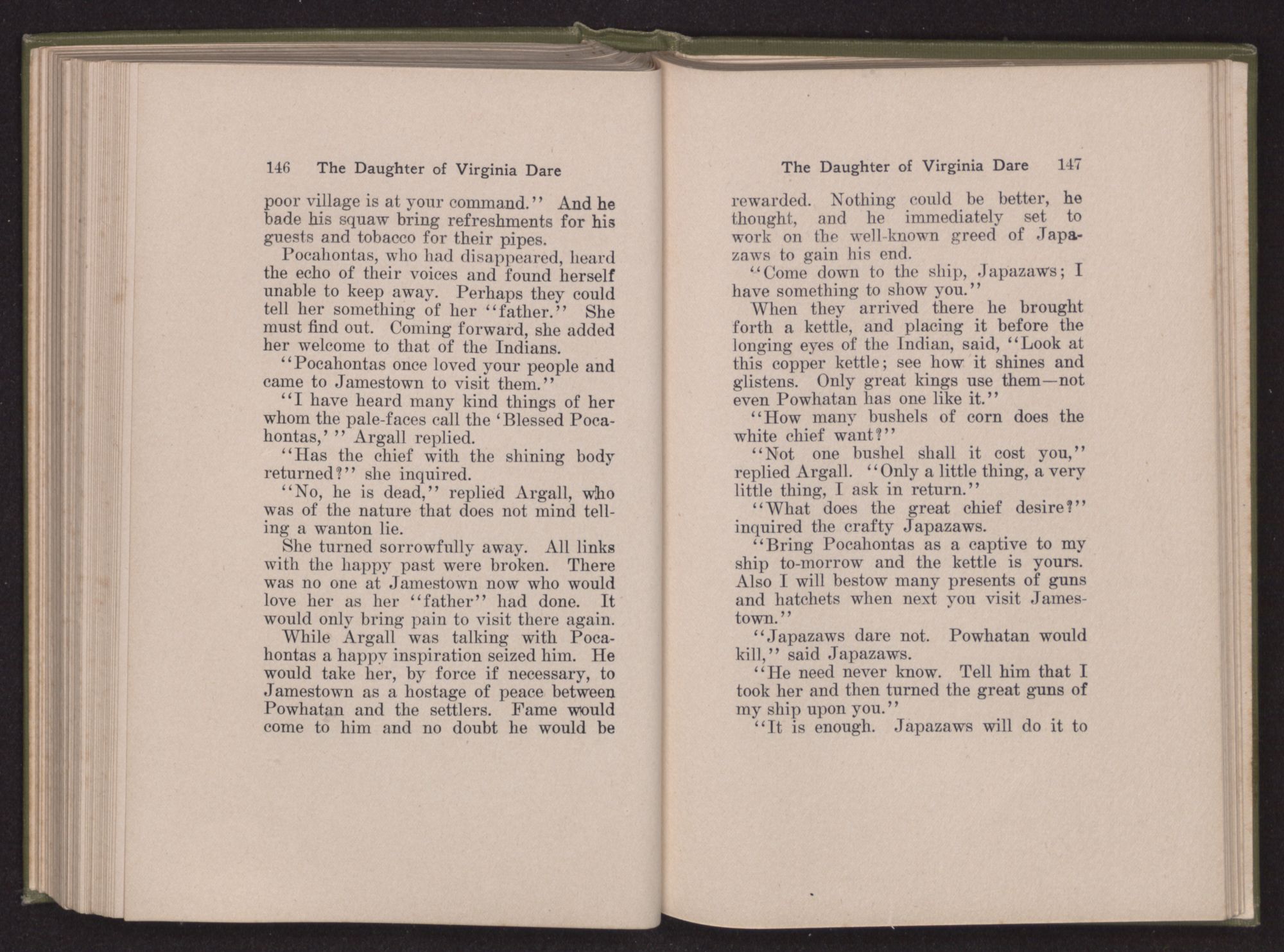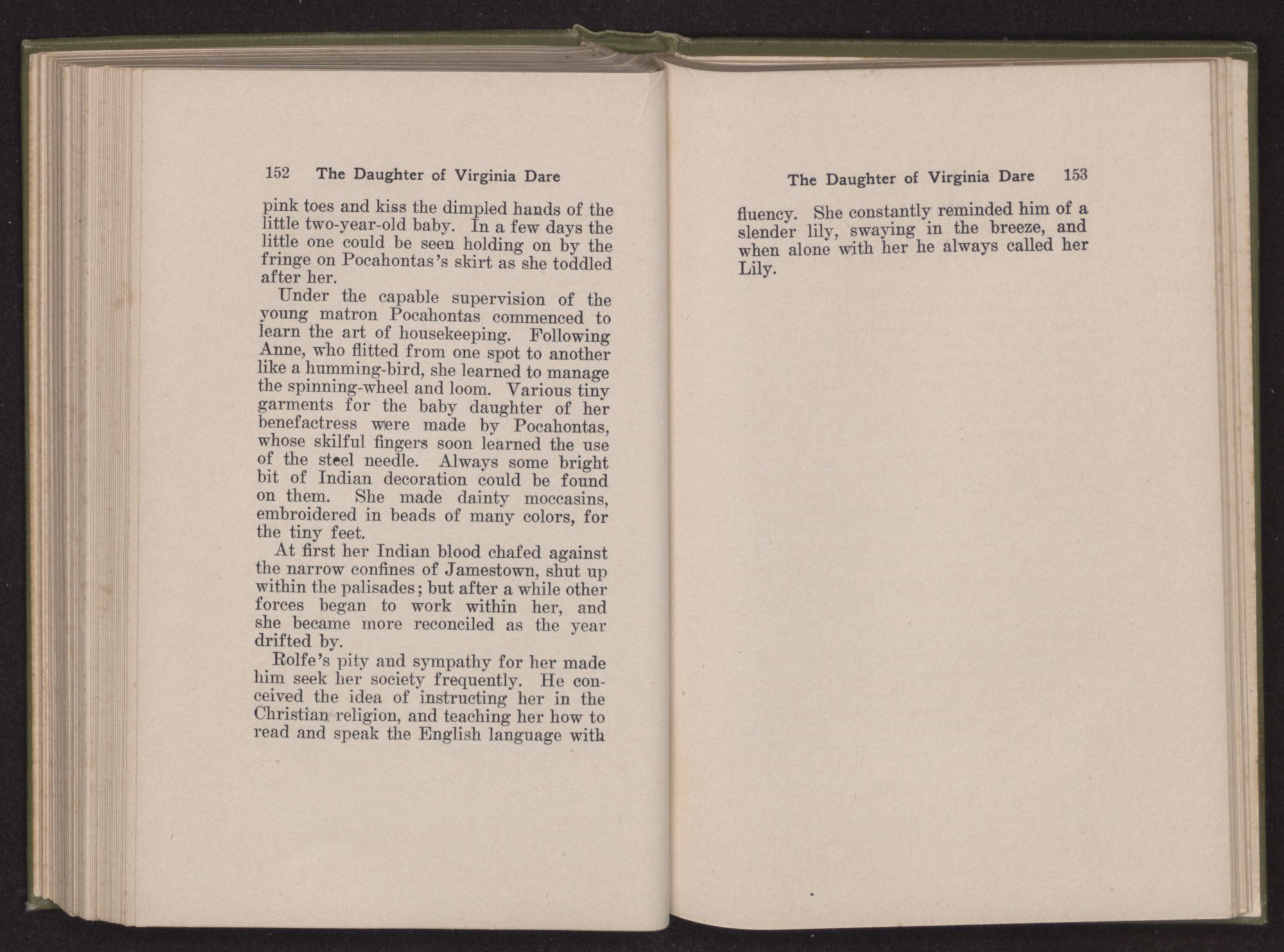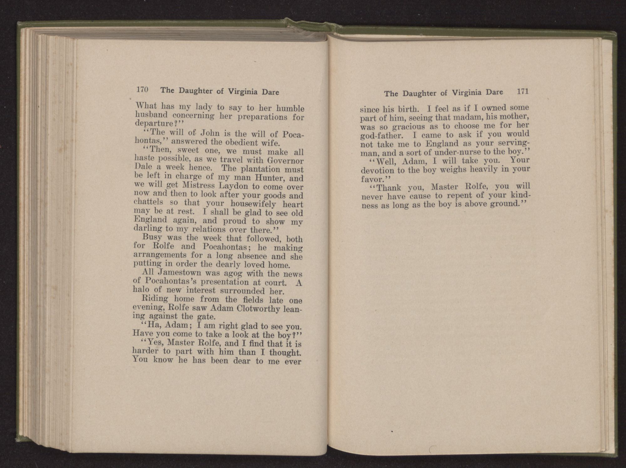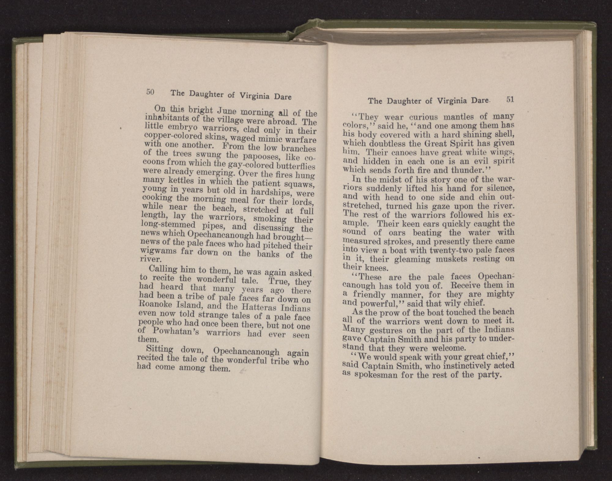 Then she spoke in a deep voice of scornful anger. “Were you not afraid to come into my father's country and cause fear in him and all his people but me; and fear you I shall call you father?” Then stamping her foot she cried, “I tell you I will, and you shall call me child, and so I will be forever and ever your country-woman.” Her voice broke as she added, “They did tell us always you were dead, and I knew no other till I came to Plymouth; yet Powhatan did commend Vetamatominakin to seek you and know the truth, because your countrymen will lie much.”