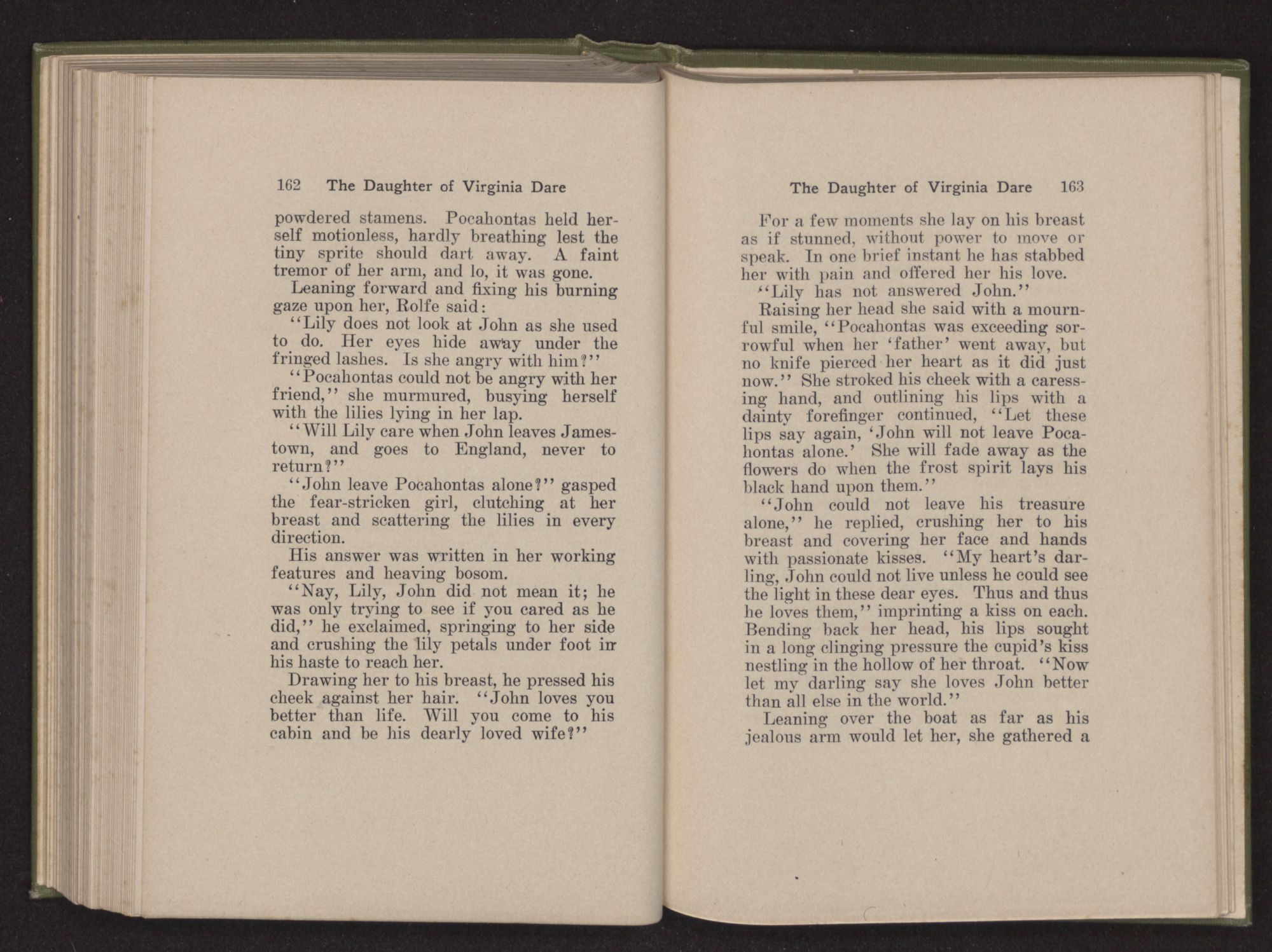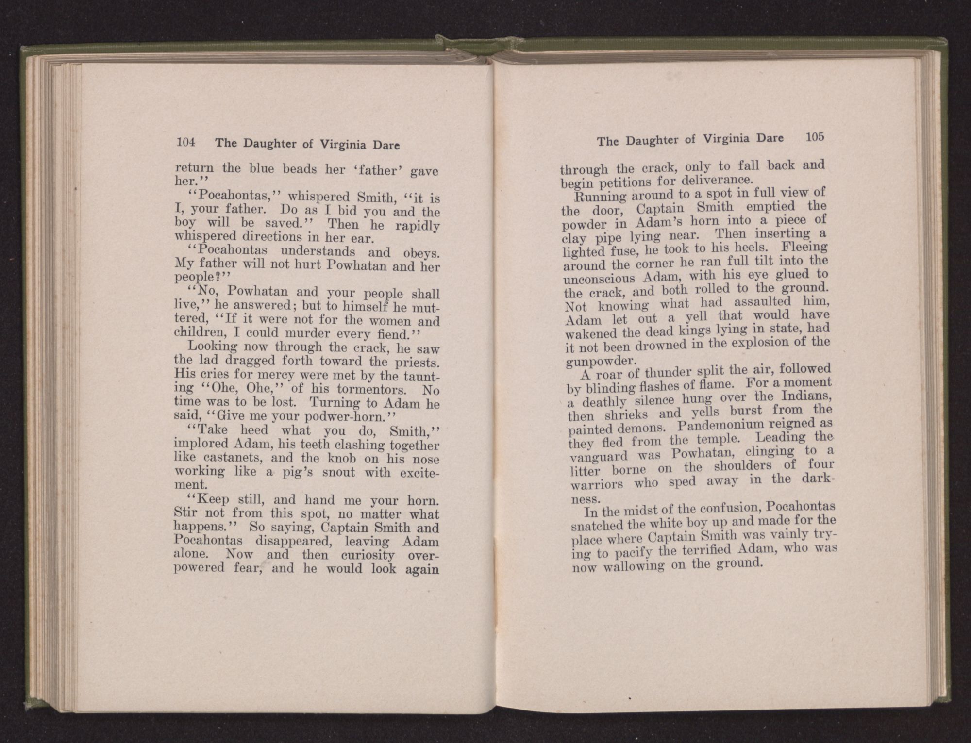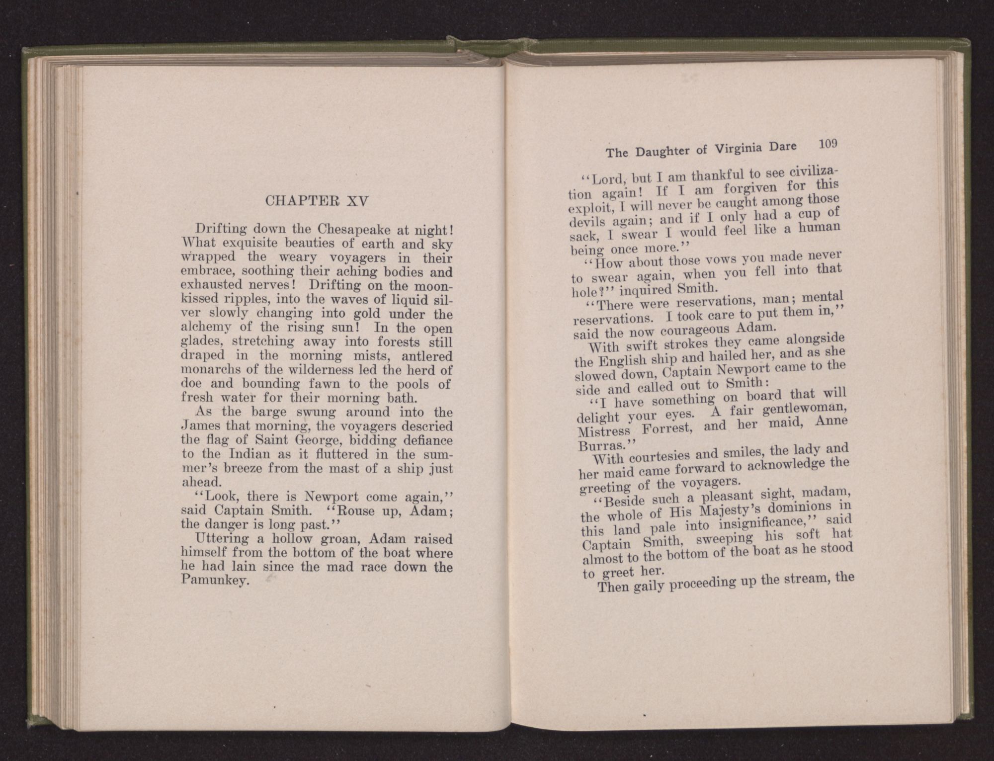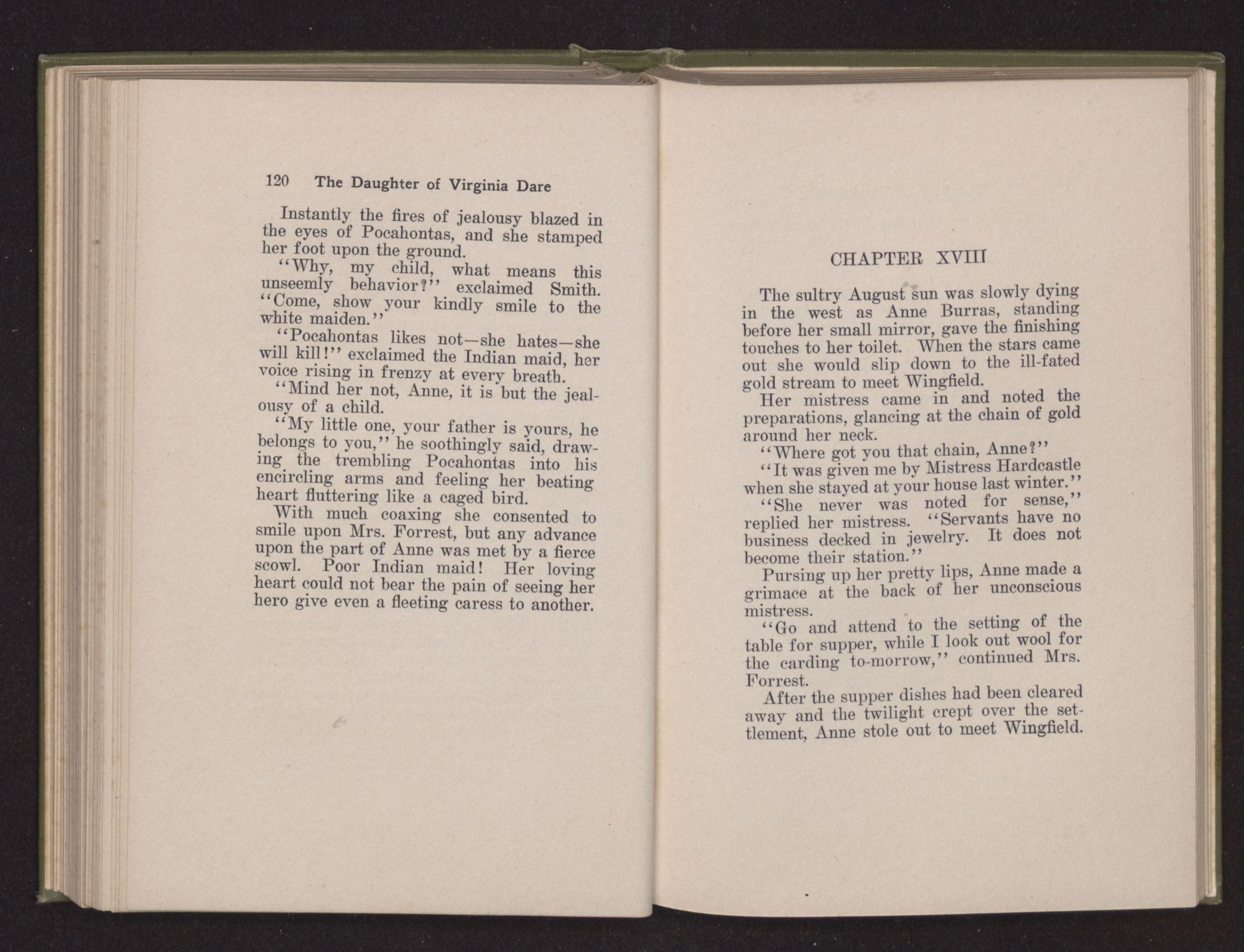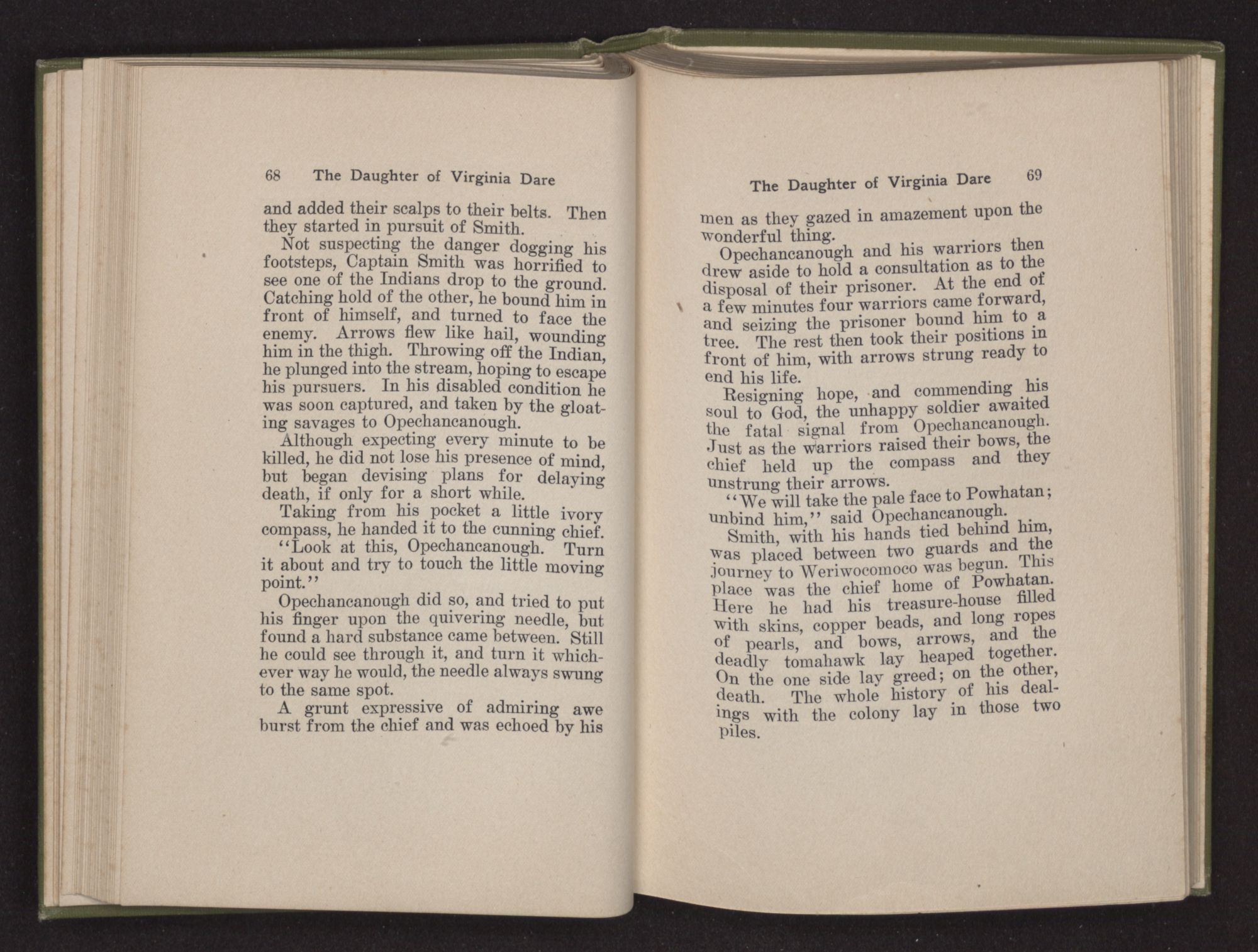 Then she spoke in a deep voice of scornful anger. “Were you not afraid to come into my father's country and cause fear in him and all his people but me; and fear you I shall call you father?” Then stamping her foot she cried, “I tell you I will, and you shall call me child, and so I will be forever and ever your country-woman.” Her voice broke as she added, “They did tell us always you were dead, and I knew no other till I came to Plymouth; yet Powhatan did commend Vetamatominakin to seek you and know the truth, because your countrymen will lie much.”
