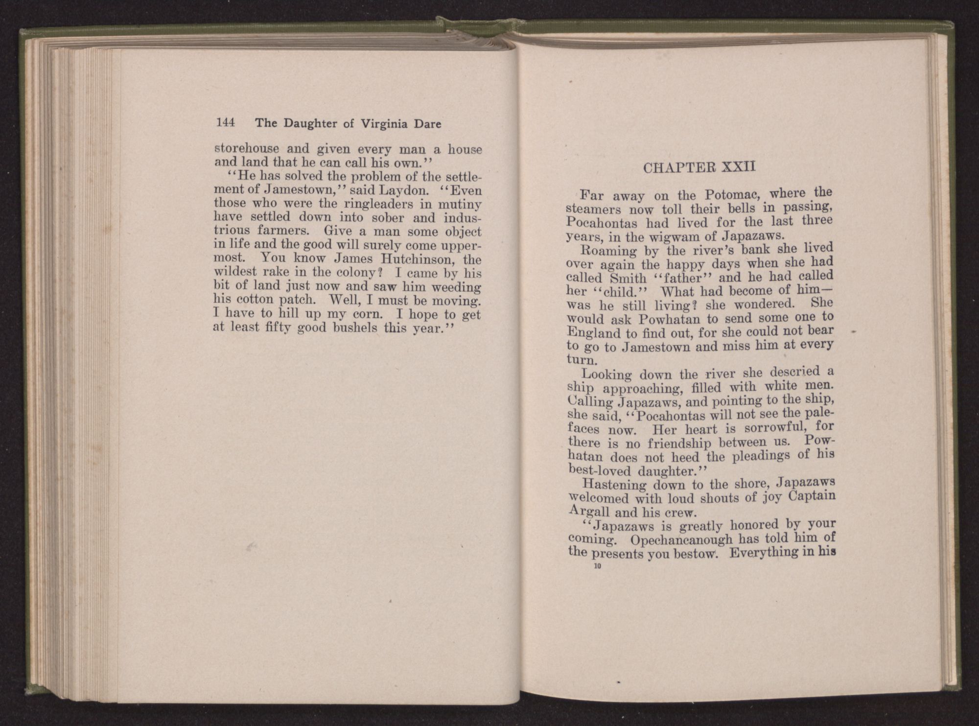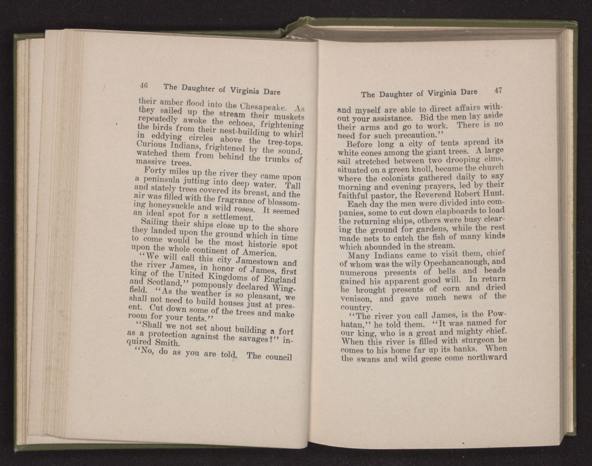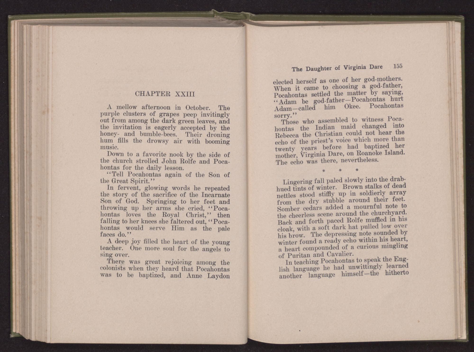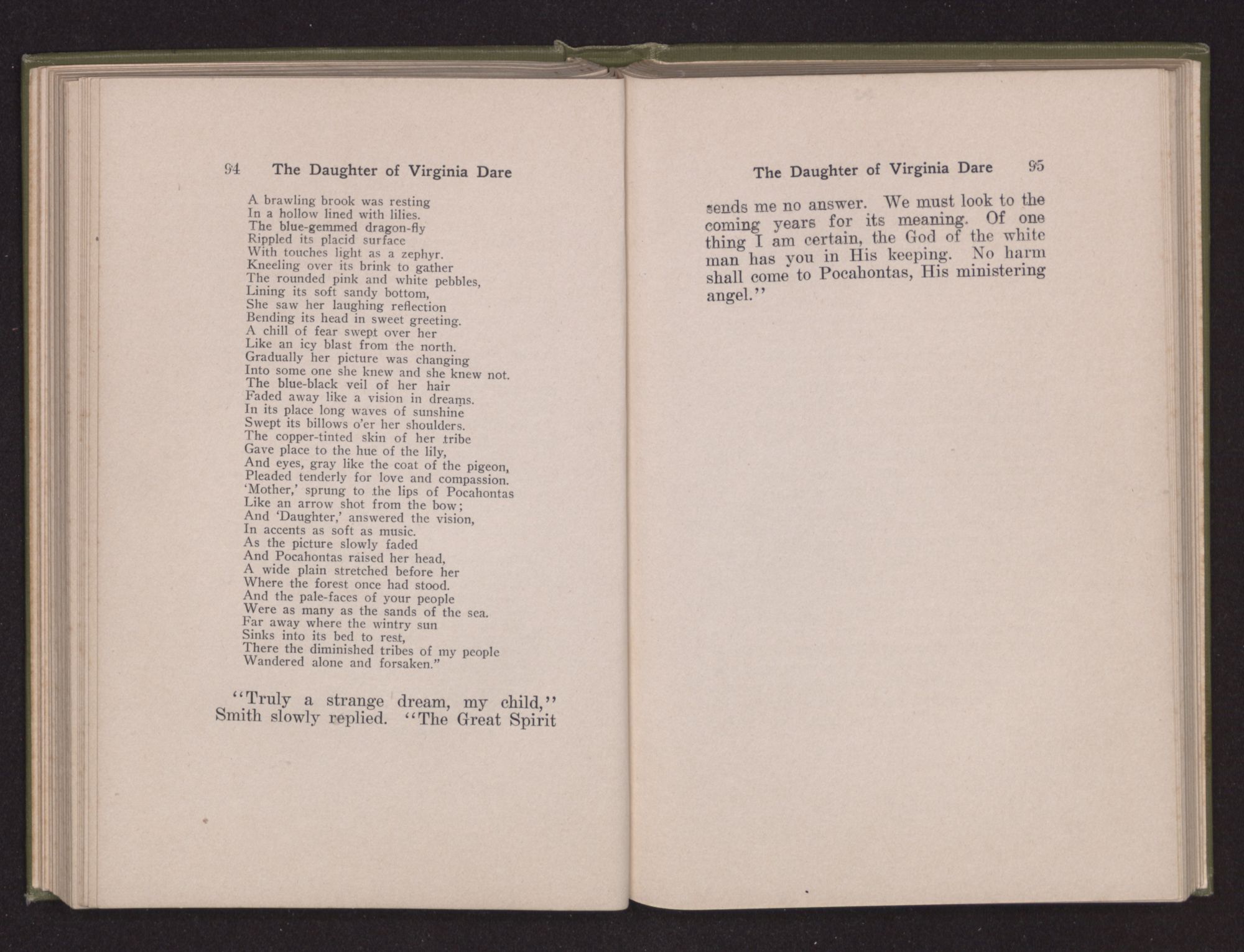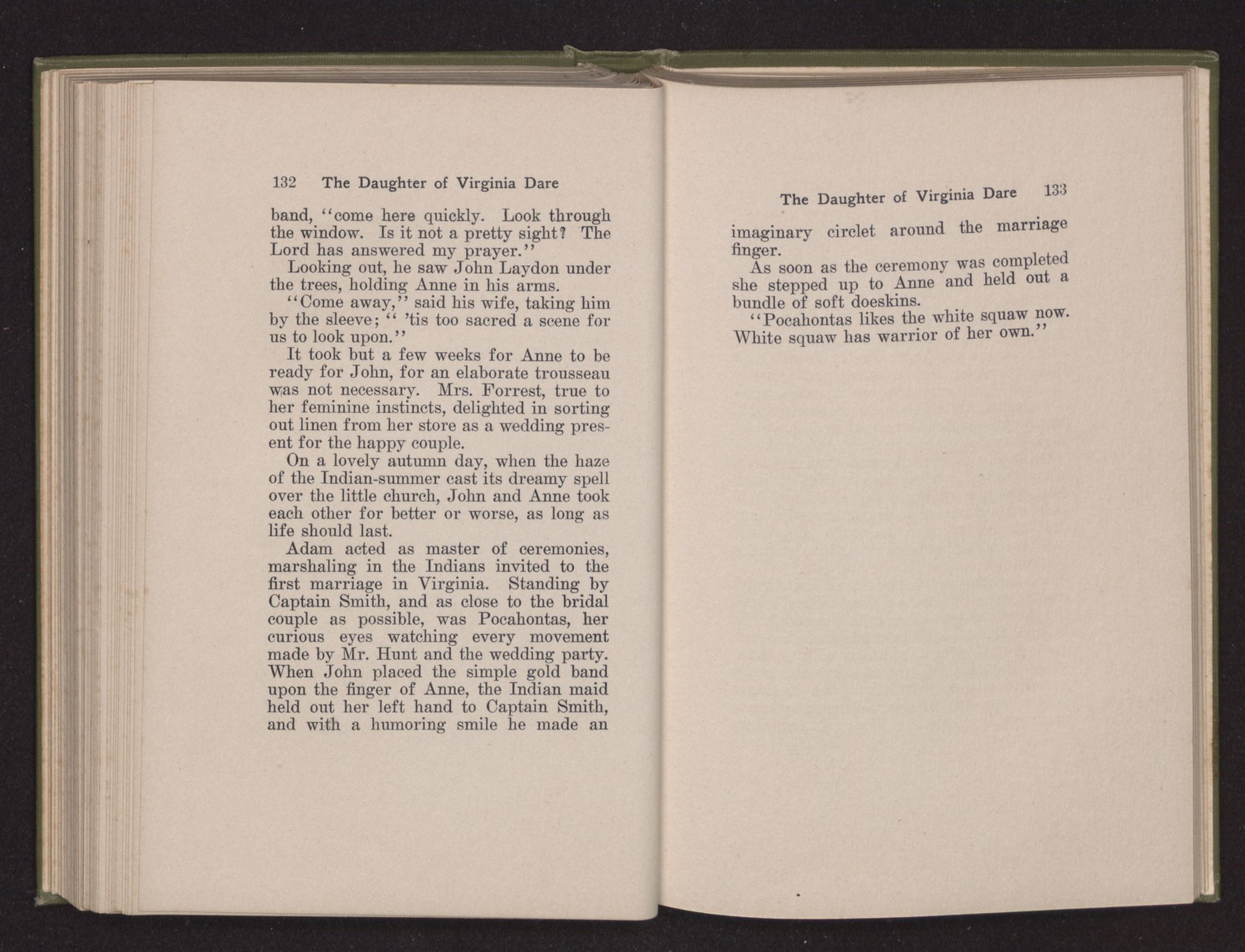Then she spoke in a deep voice of scornful anger. “Were you not afraid to come into my father's country and cause fear in him and all his people but me; and fear you I shall call you father?” Then stamping her foot she cried, “I tell you I will, and you shall call me child, and so I will be forever and ever your country-woman.” Her voice broke as she added, “They did tell us always you were dead, and I knew no other till I came to Plymouth; yet Powhatan did commend Vetamatominakin to seek you and know the truth, because your countrymen will lie much.”