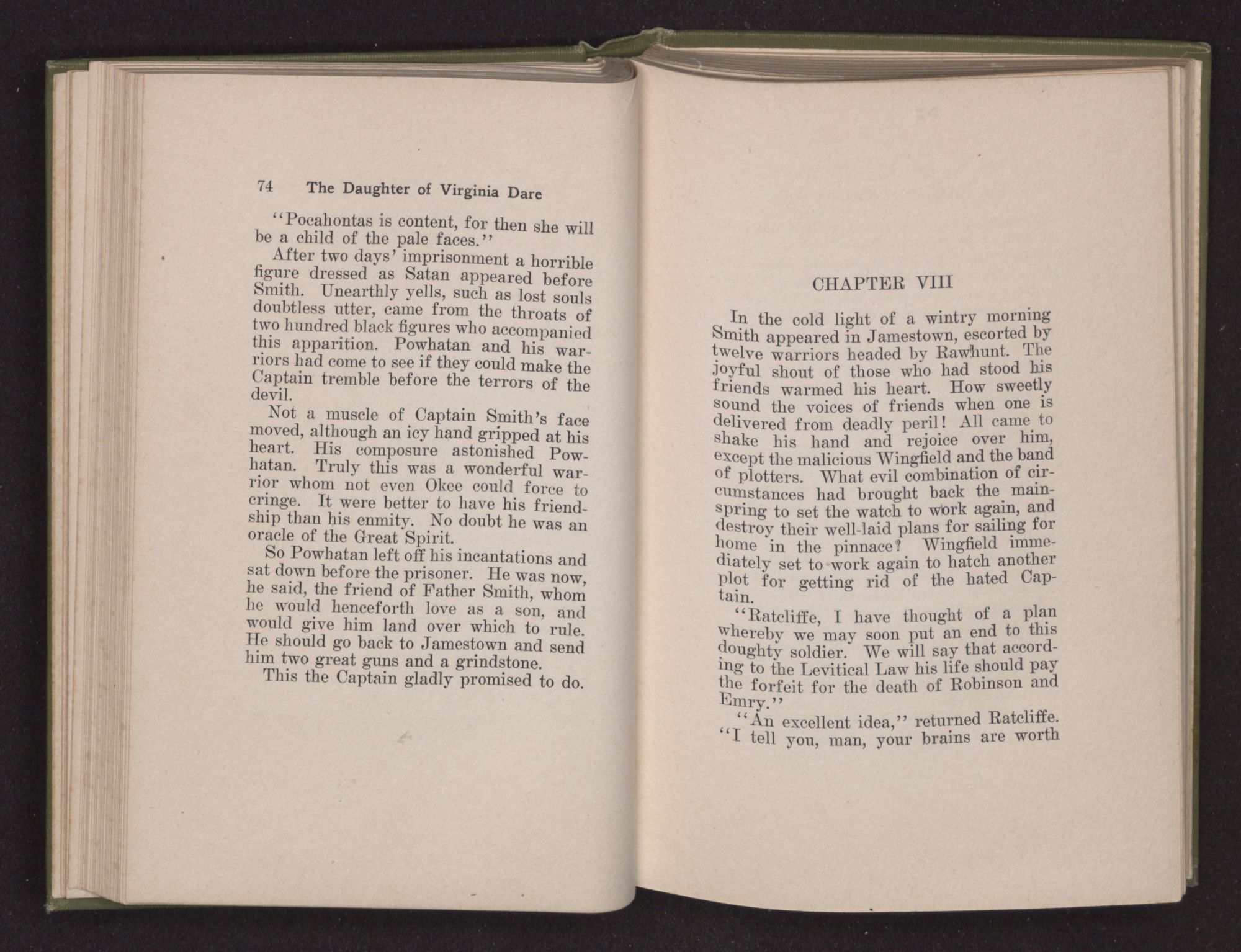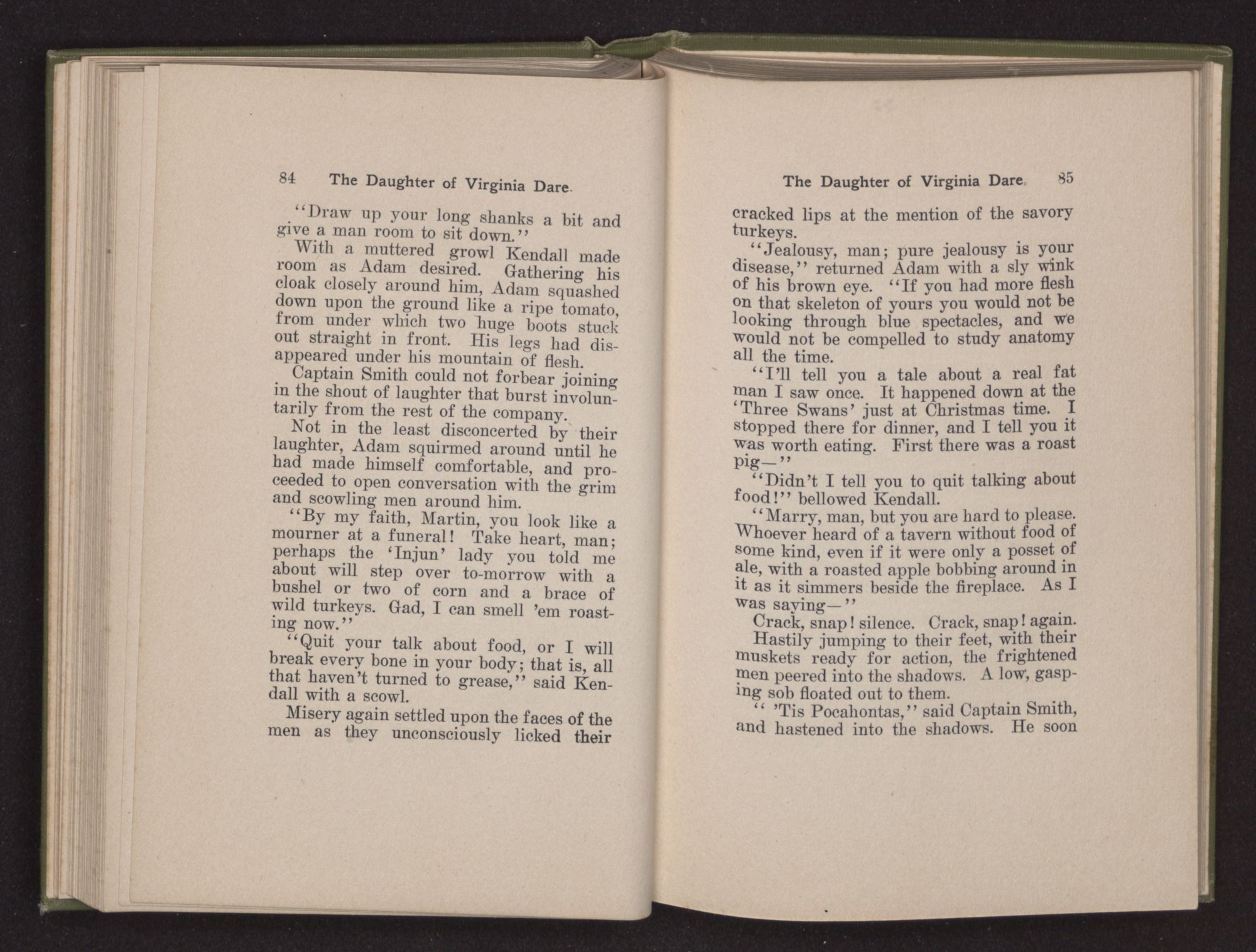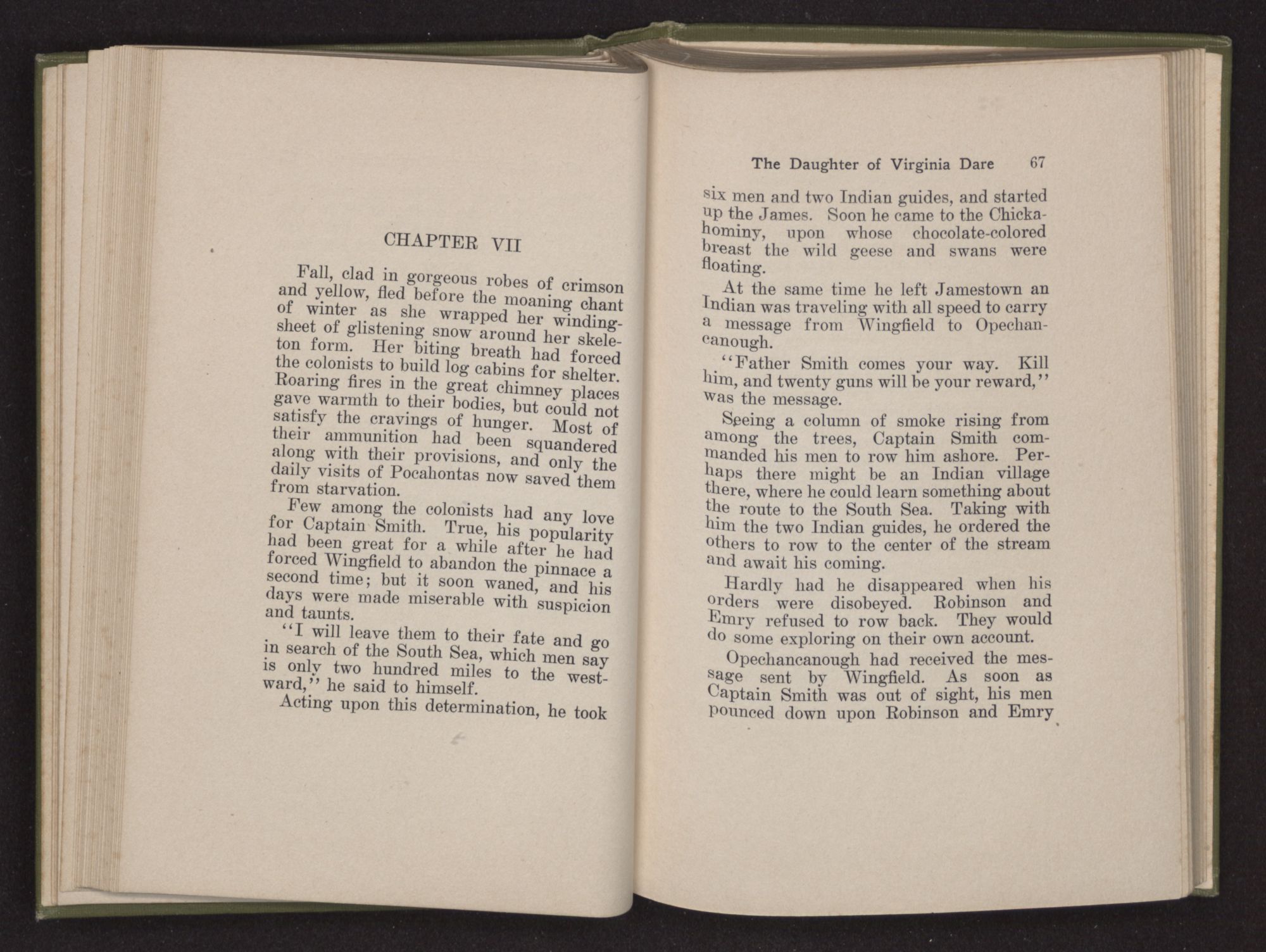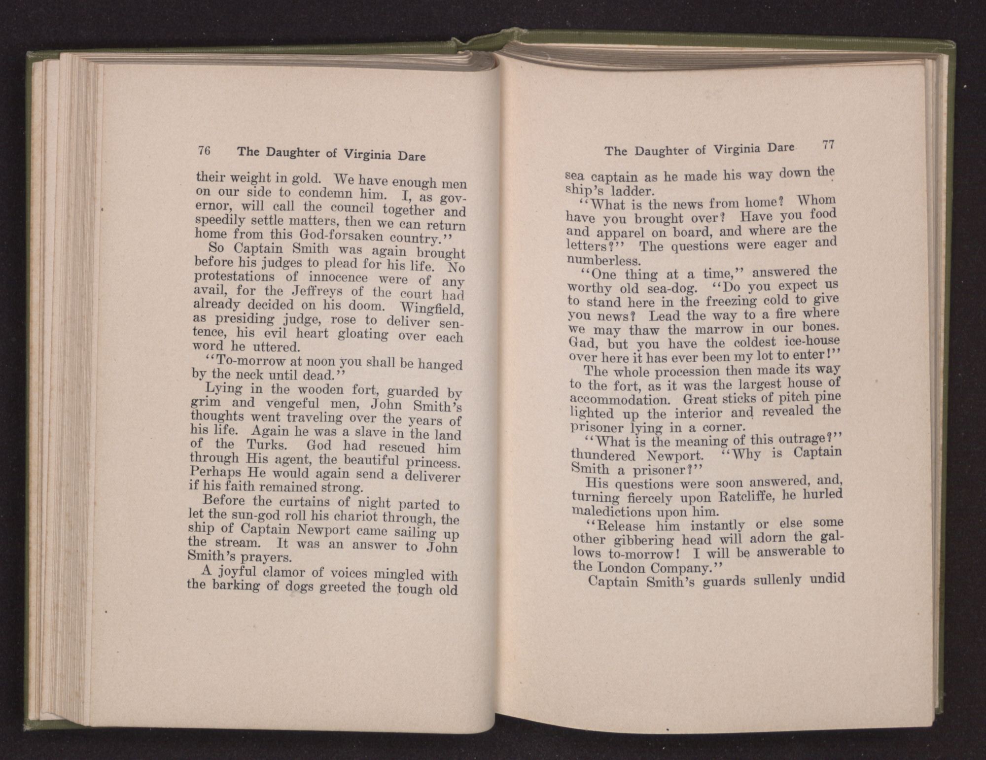 Then she spoke in a deep voice of scornful anger. “Were you not afraid to come into my father's country and cause fear in him and all his people but me; and fear you I shall call you father?” Then stamping her foot she cried, “I tell you I will, and you shall call me child, and so I will be forever and ever your country-woman.” Her voice broke as she added, “They did tell us always you were dead, and I knew no other till I came to Plymouth; yet Powhatan did commend Vetamatominakin to seek you and know the truth, because your countrymen will lie much.”