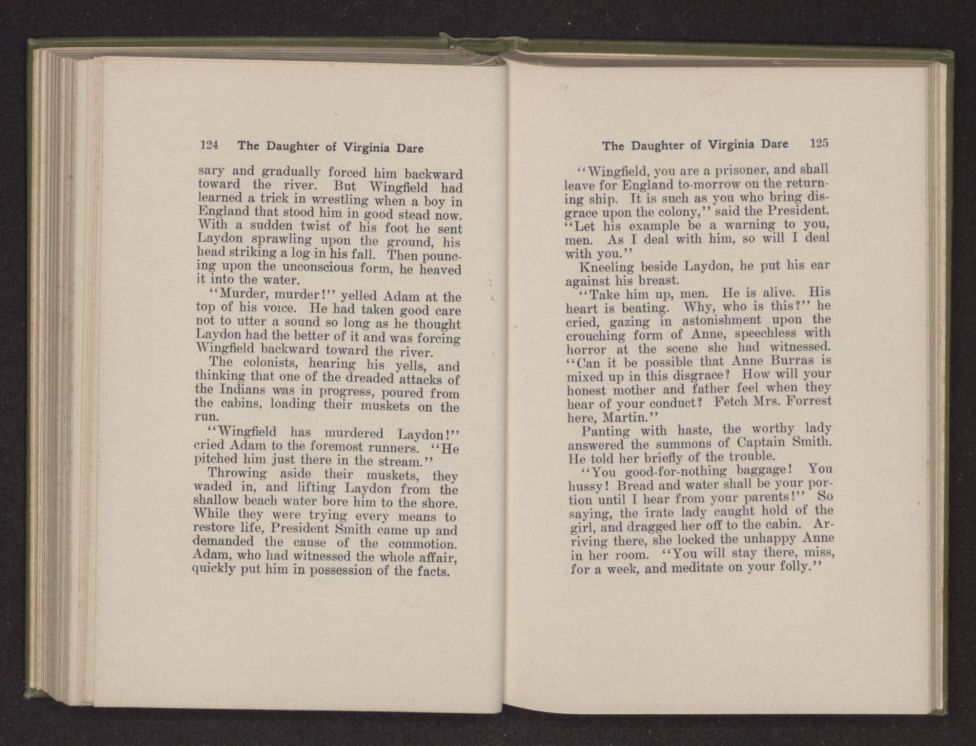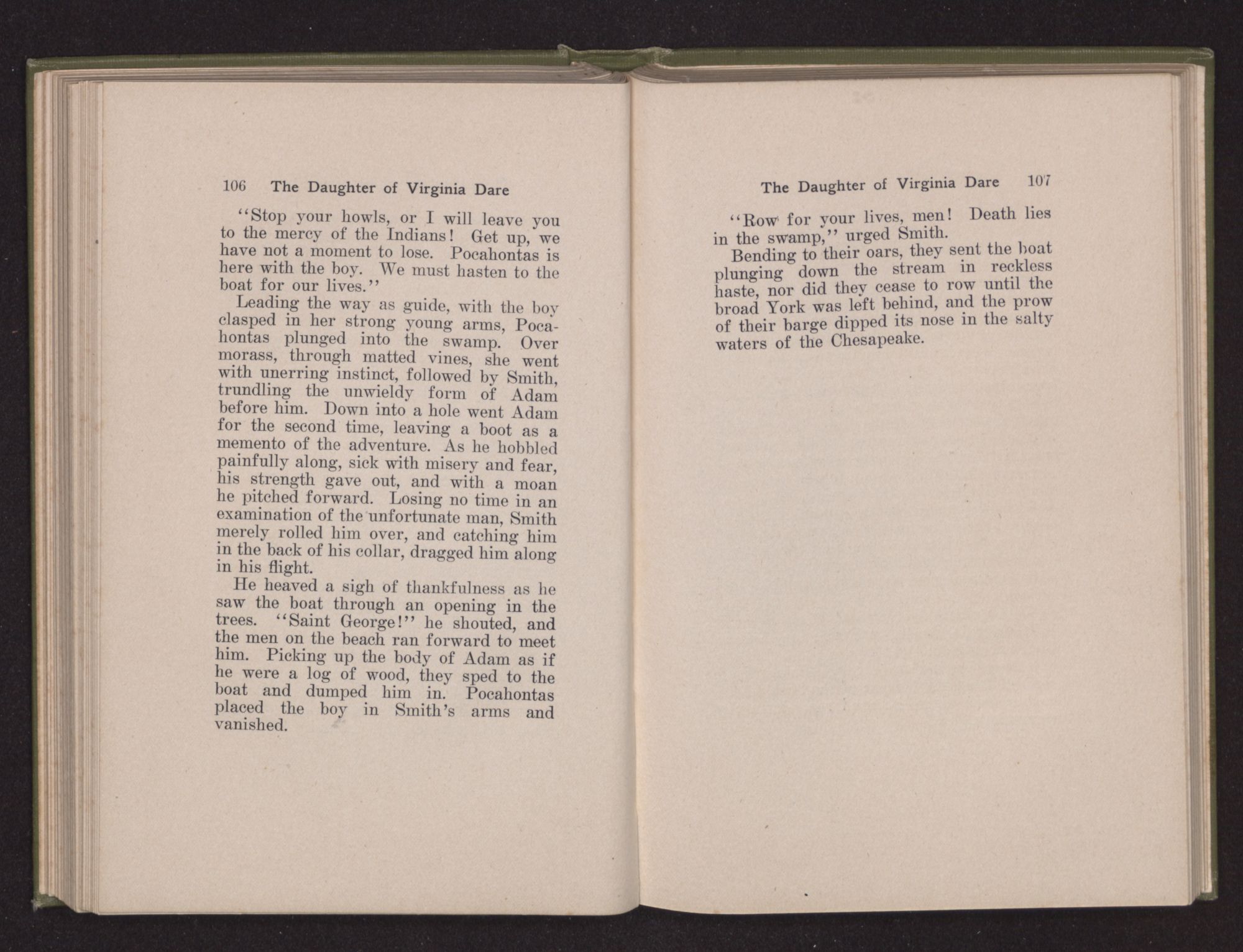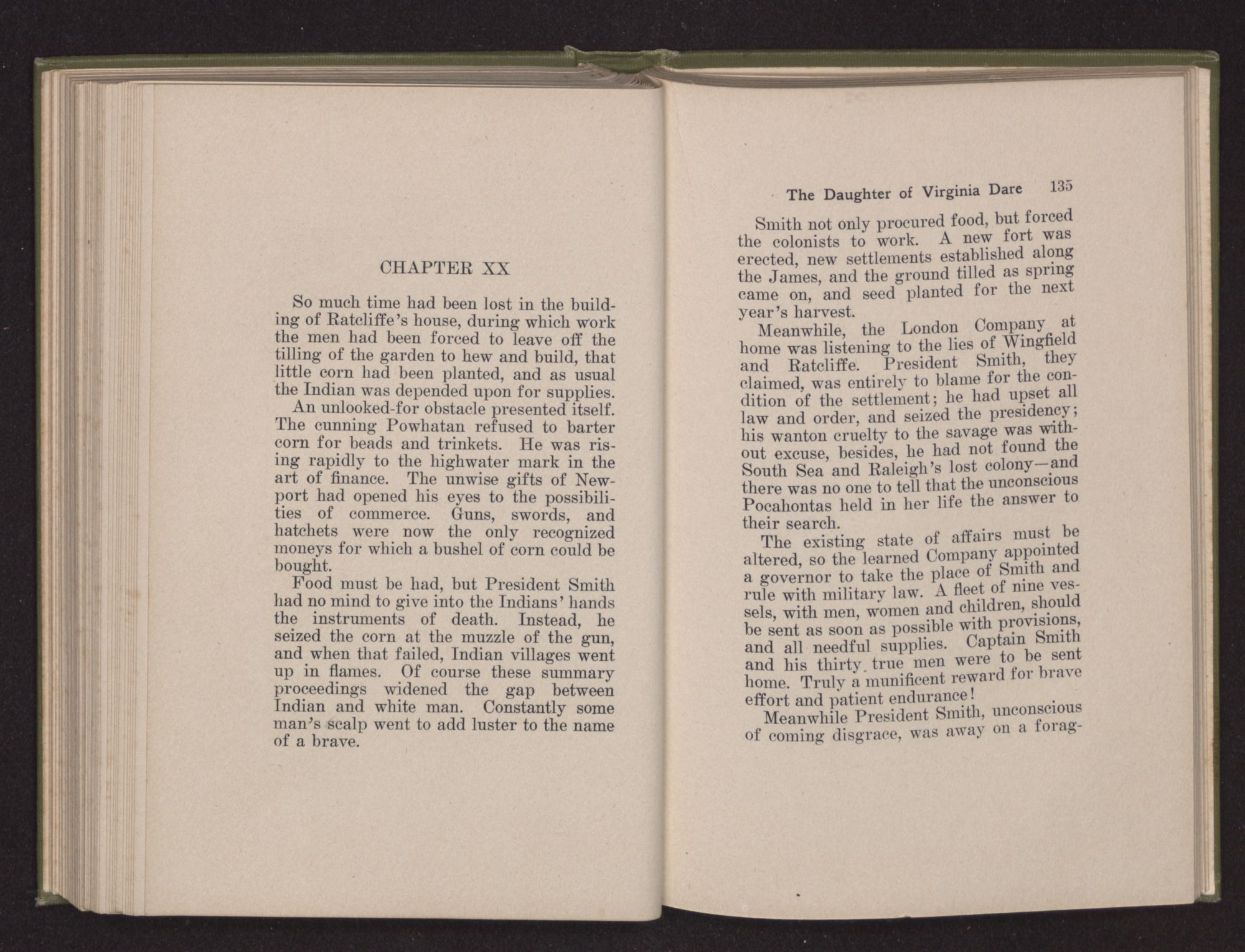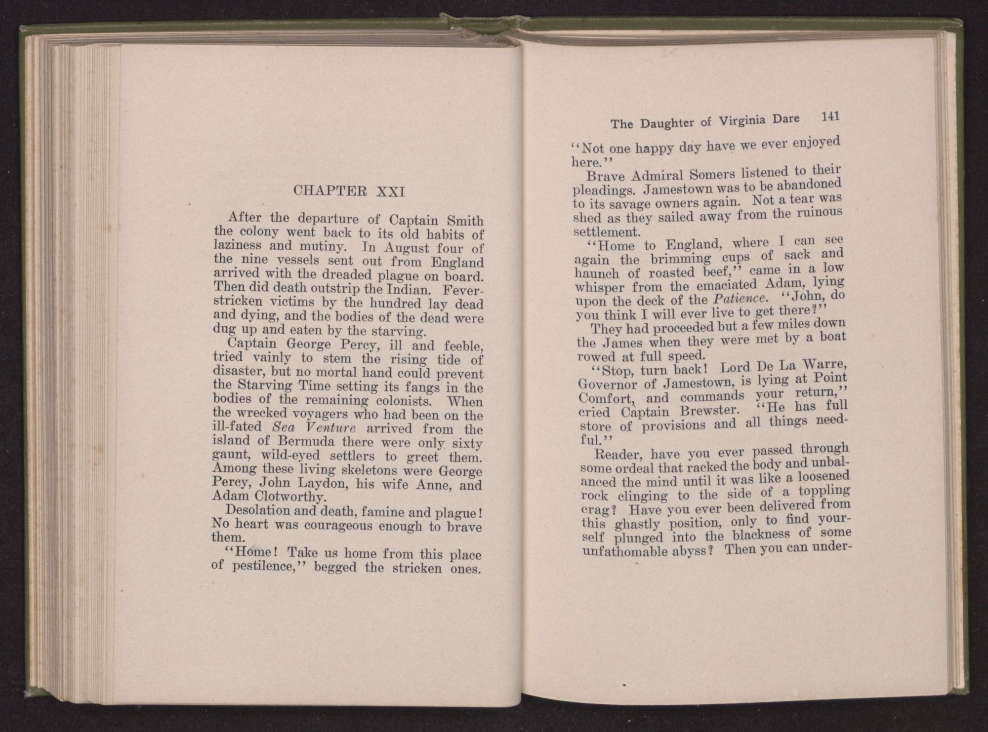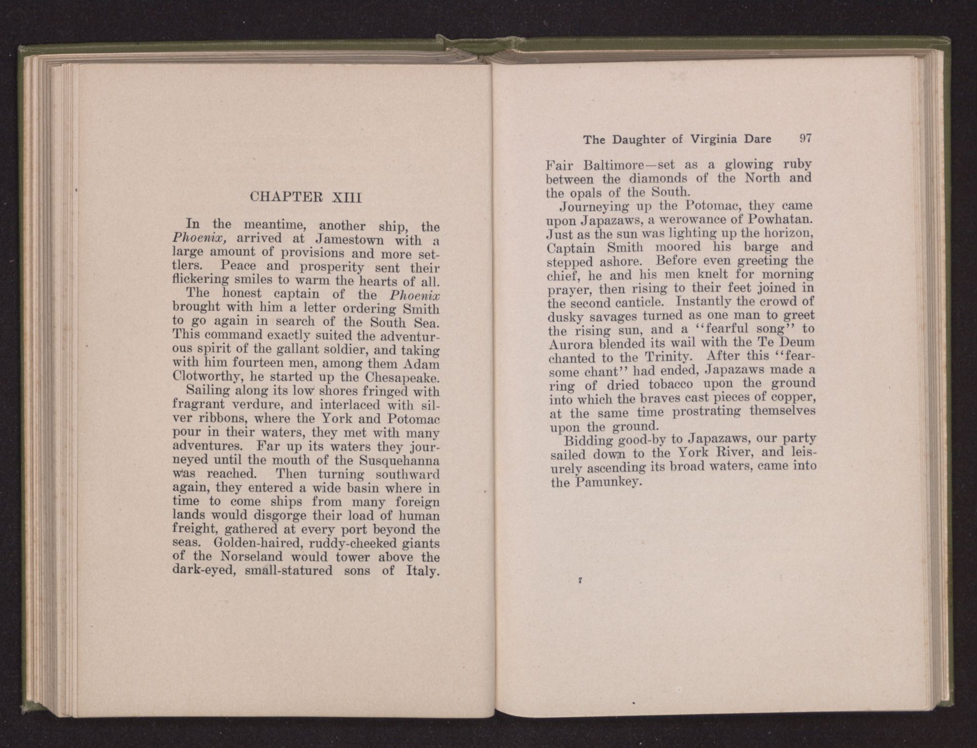 Then she spoke in a deep voice of scornful anger. “Were you not afraid to come into my father's country and cause fear in him and all his people but me; and fear you I shall call you father?” Then stamping her foot she cried, “I tell you I will, and you shall call me child, and so I will be forever and ever your country-woman.” Her voice broke as she added, “They did tell us always you were dead, and I knew no other till I came to Plymouth; yet Powhatan did commend Vetamatominakin to seek you and know the truth, because your countrymen will lie much.”