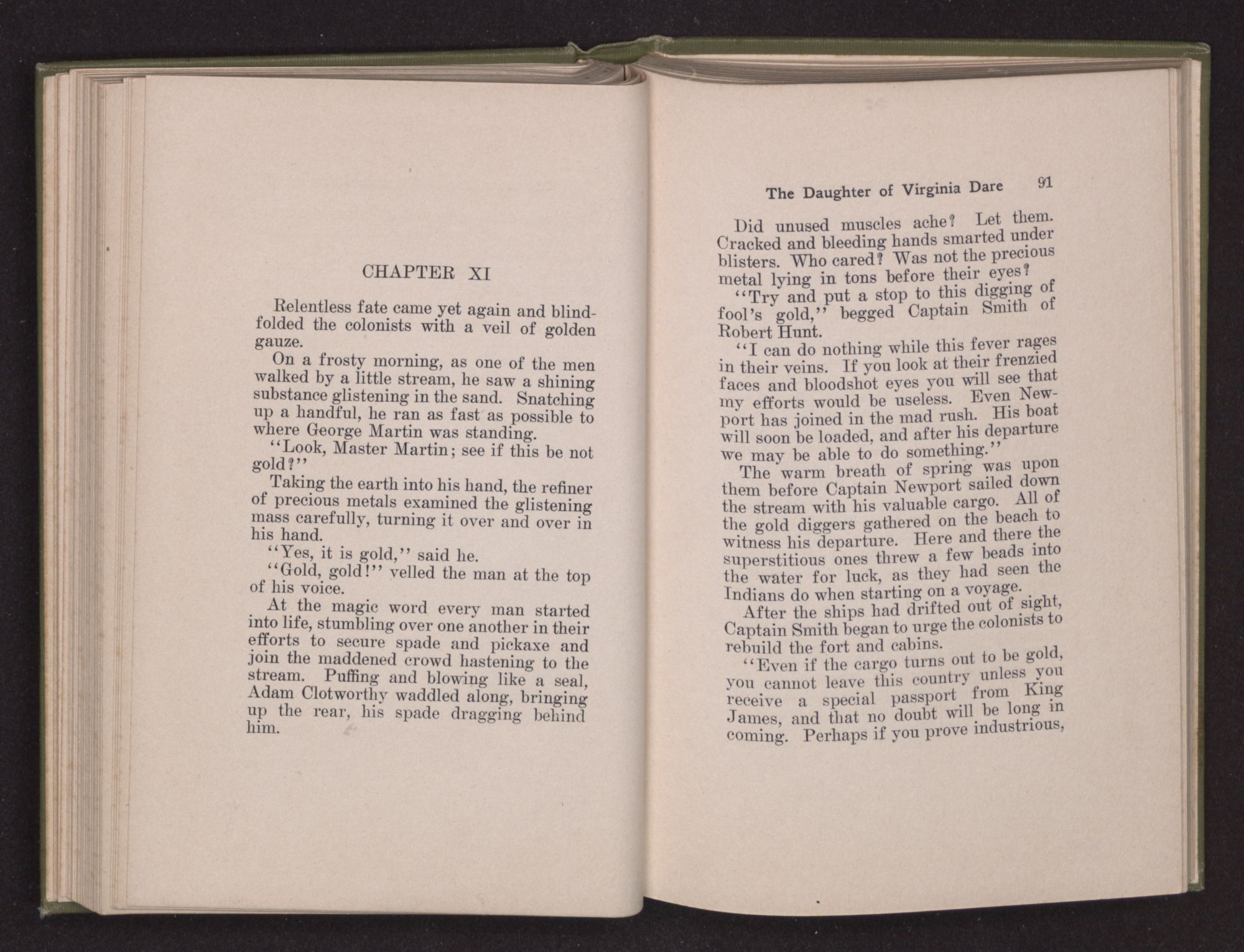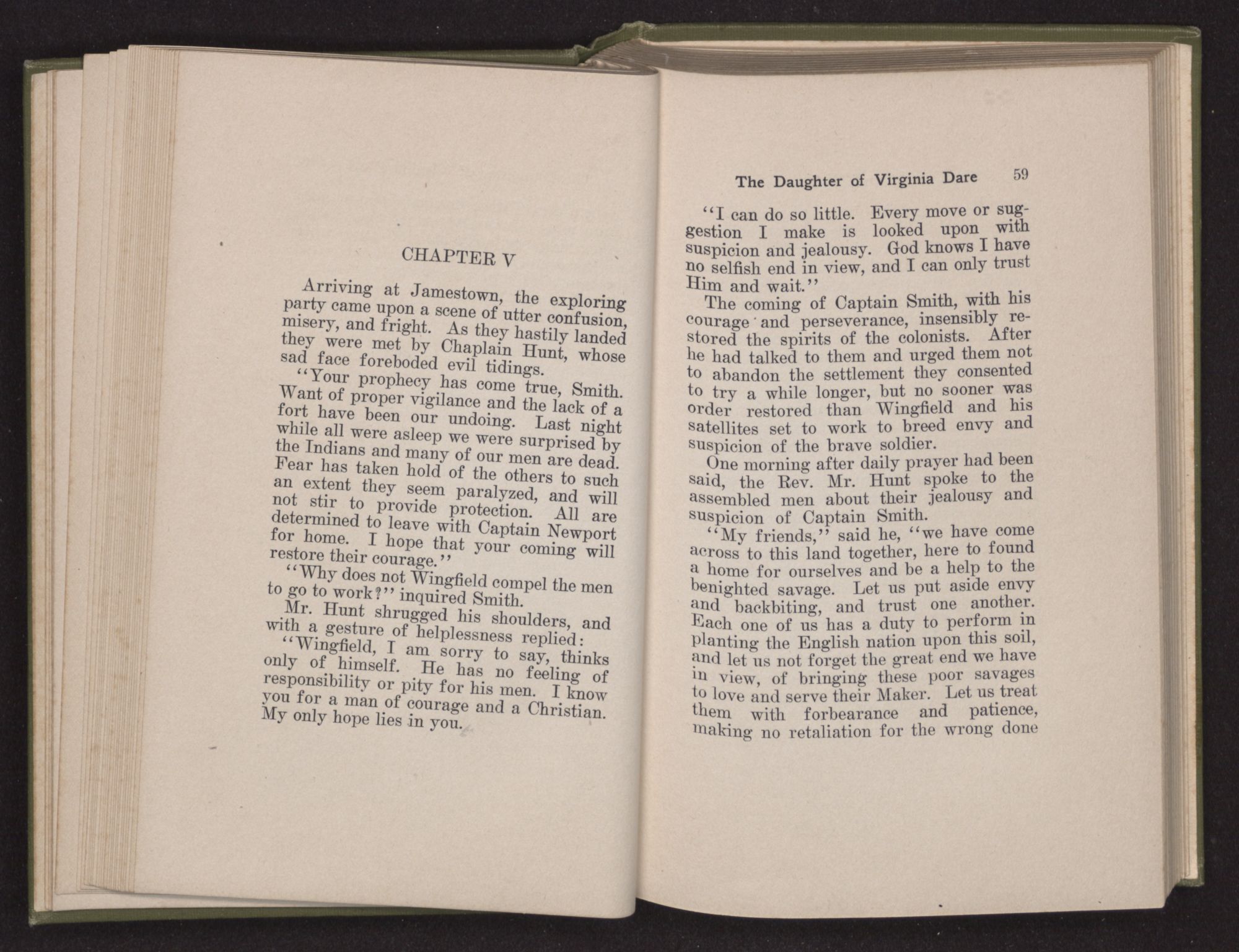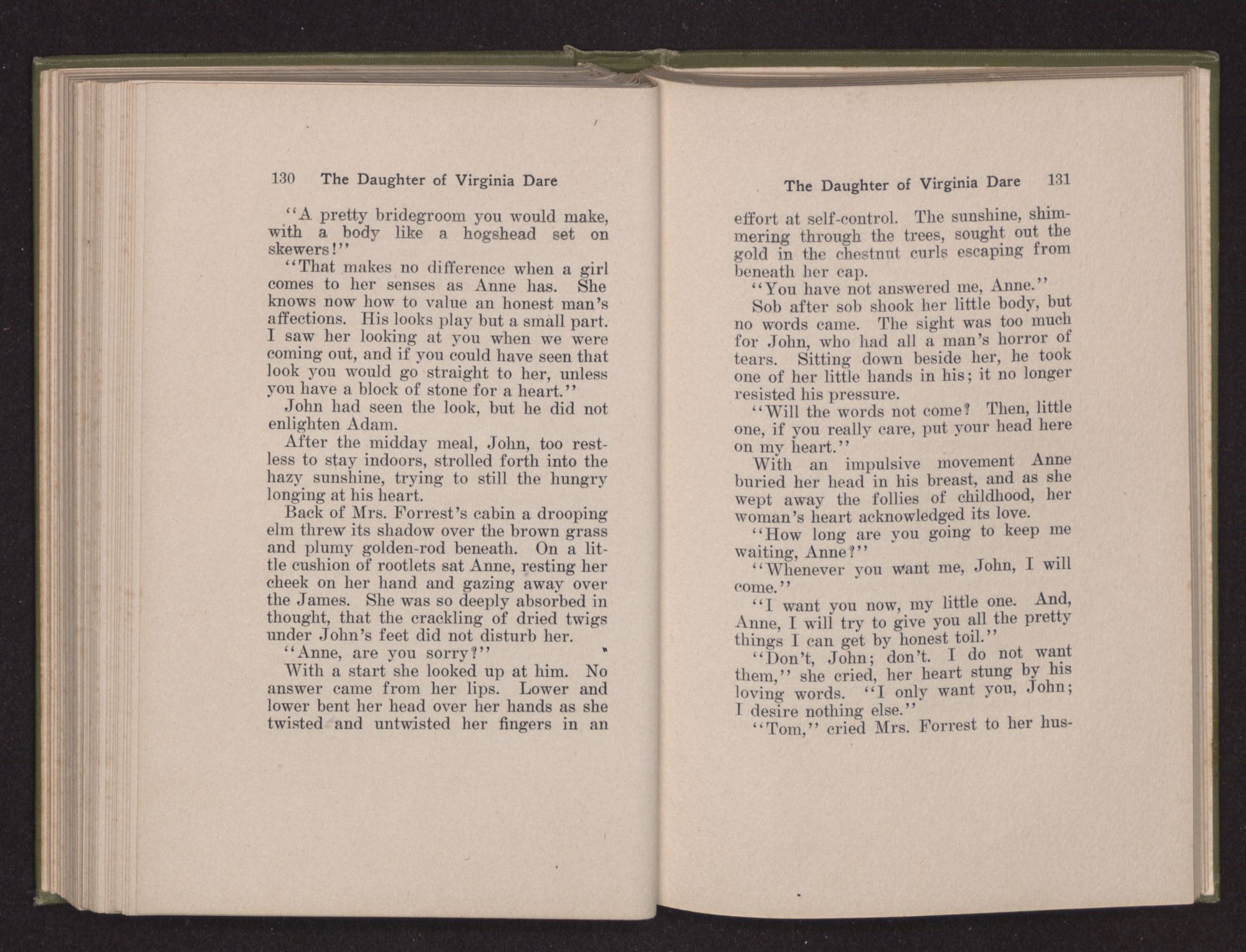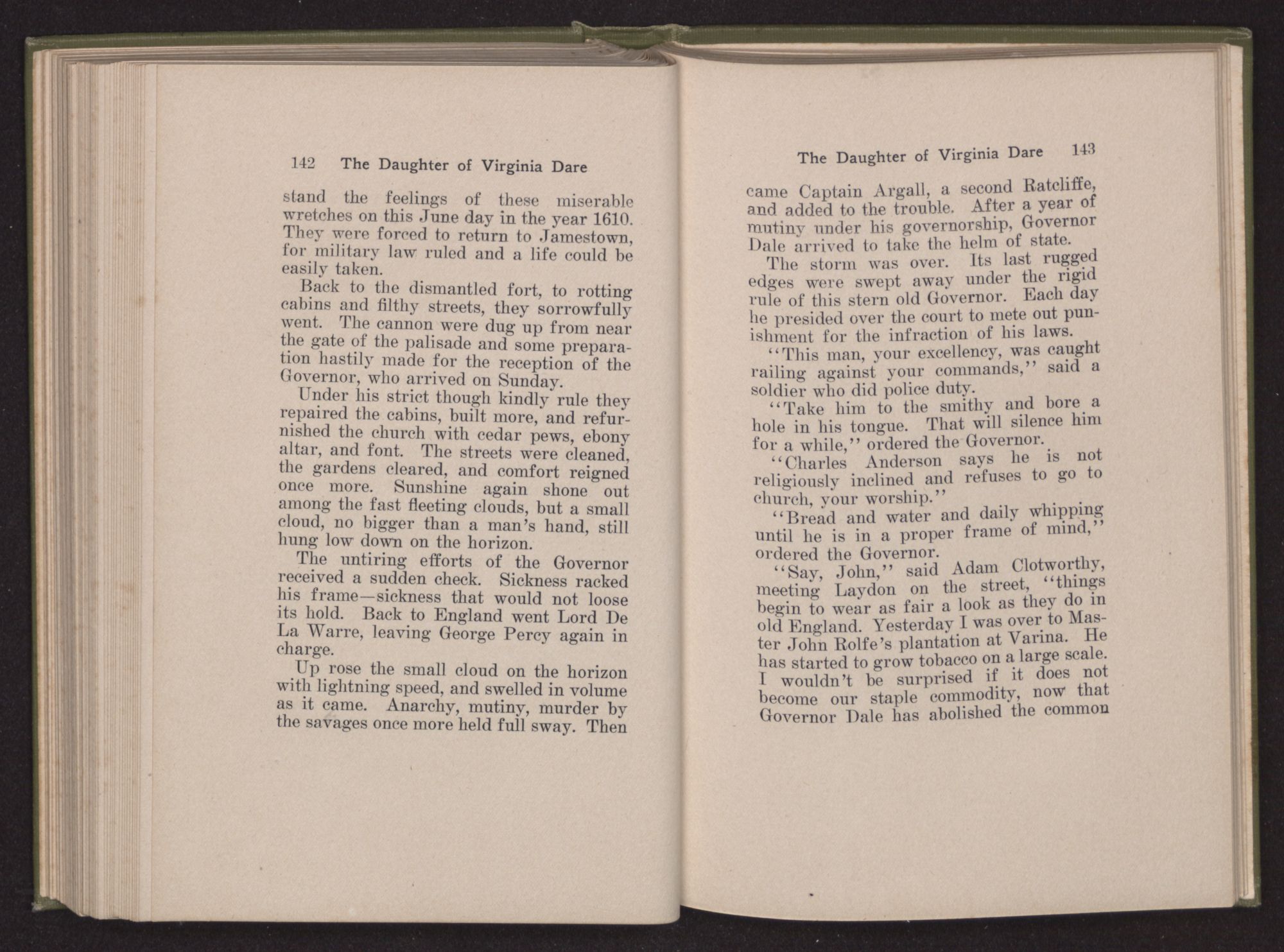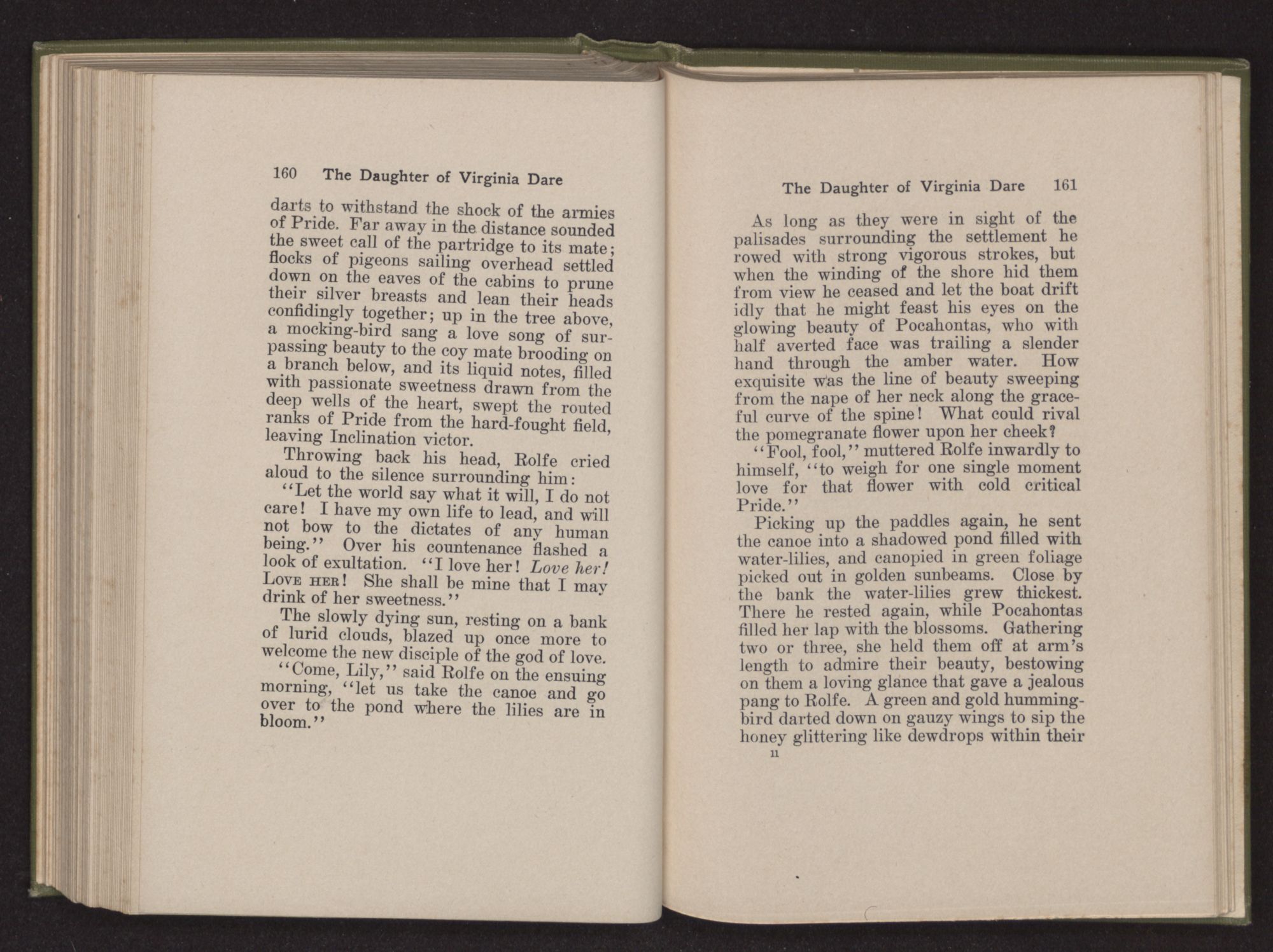 Then she spoke in a deep voice of scornful anger. “Were you not afraid to come into my father's country and cause fear in him and all his people but me; and fear you I shall call you father?” Then stamping her foot she cried, “I tell you I will, and you shall call me child, and so I will be forever and ever your country-woman.” Her voice broke as she added, “They did tell us always you were dead, and I knew no other till I came to Plymouth; yet Powhatan did commend Vetamatominakin to seek you and know the truth, because your countrymen will lie much.”