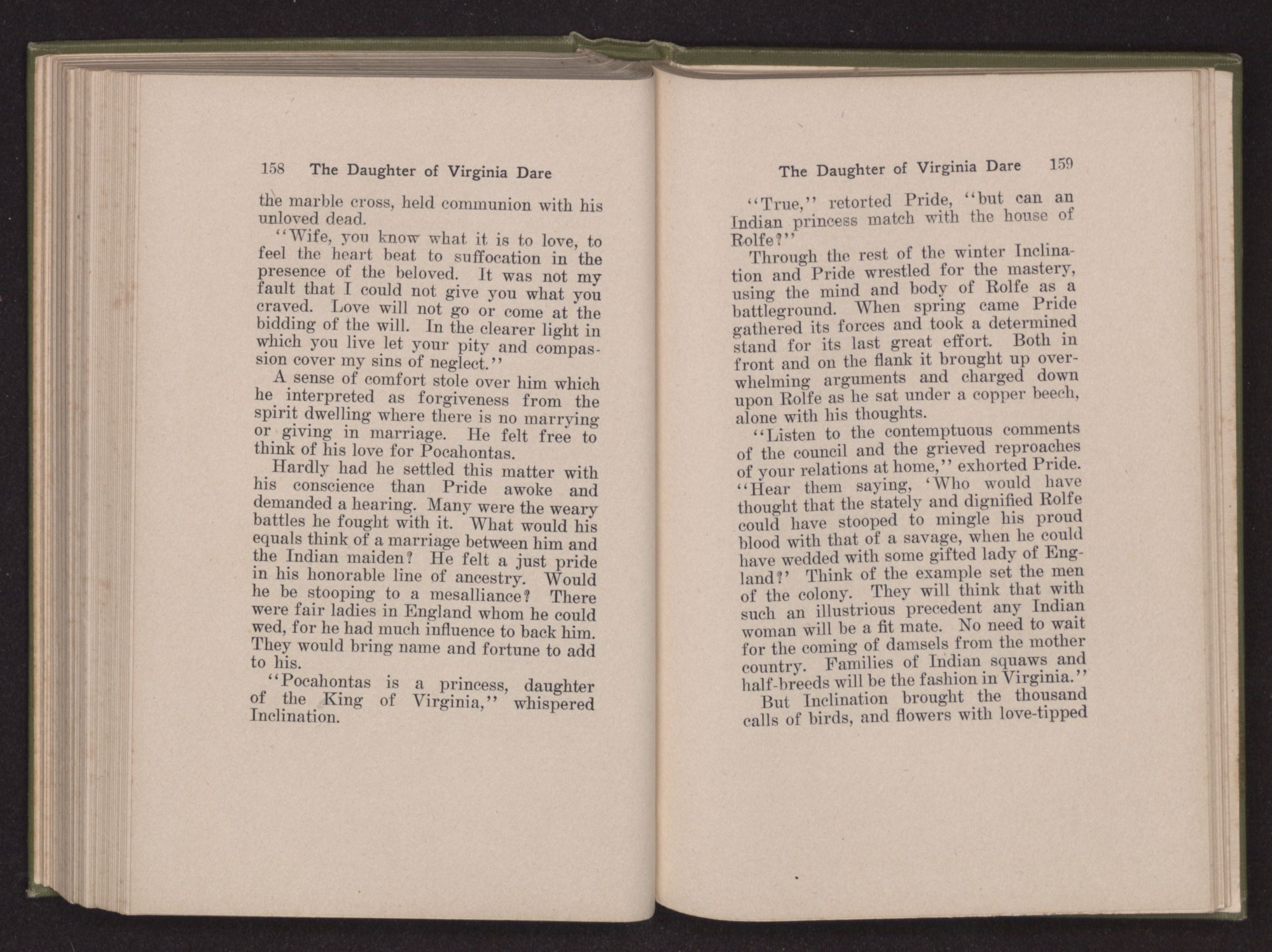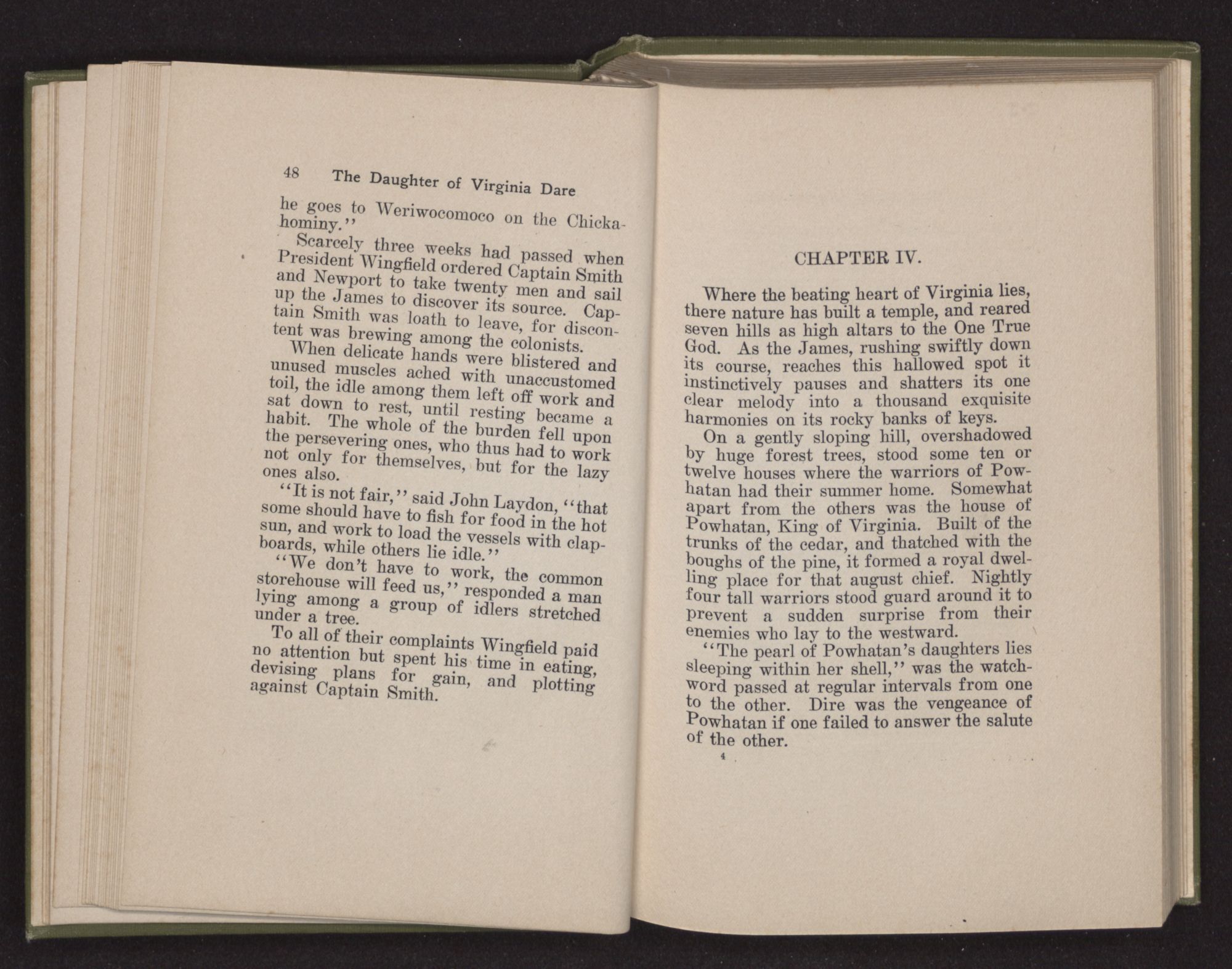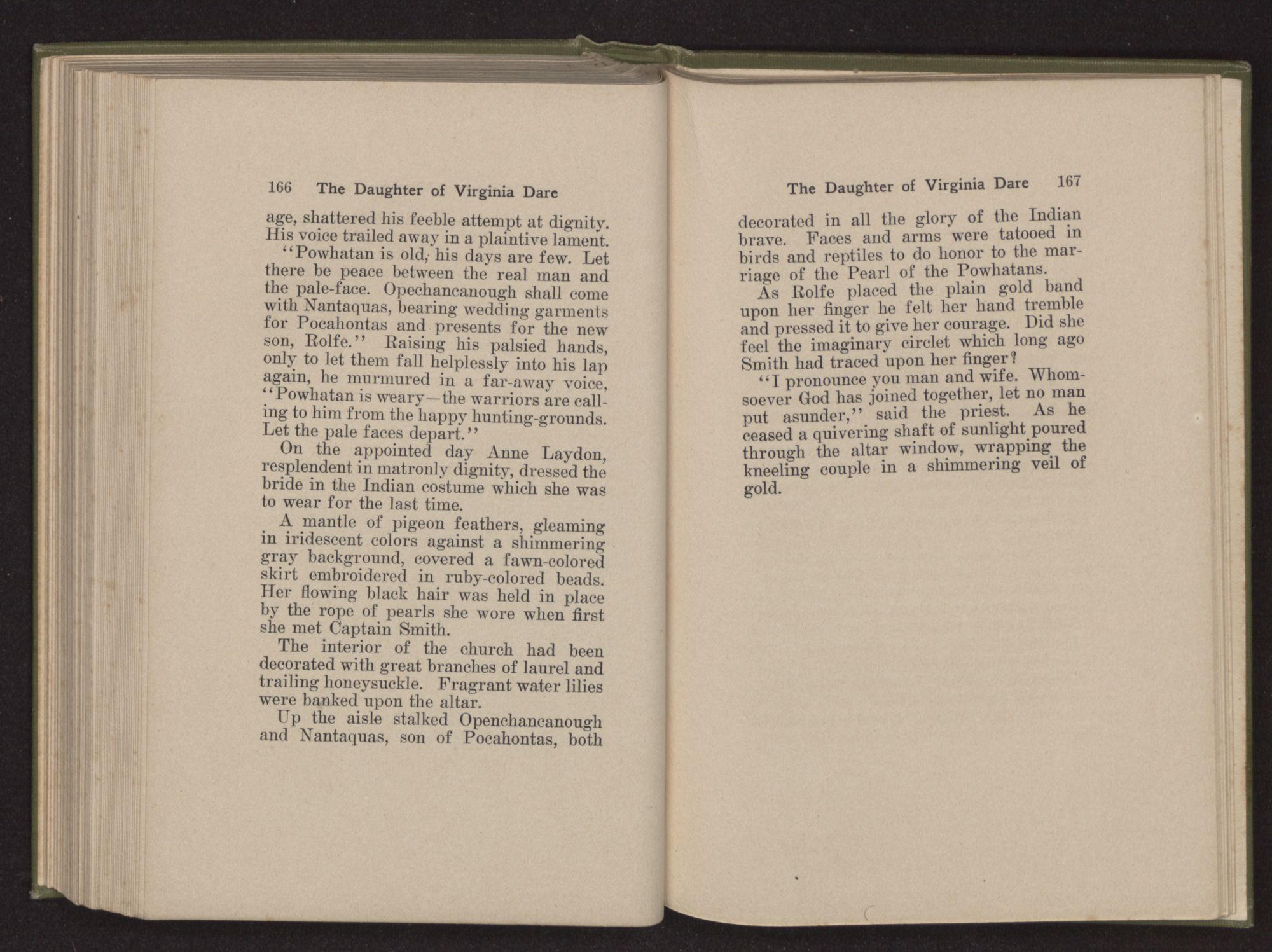 “Powhatan worships Okee. He bends not the knee to the Royal Christ. When warriors offend, he kills. Therefore he is feared, not loved,” she answered, sadly, unconscious of the irony of her reply.