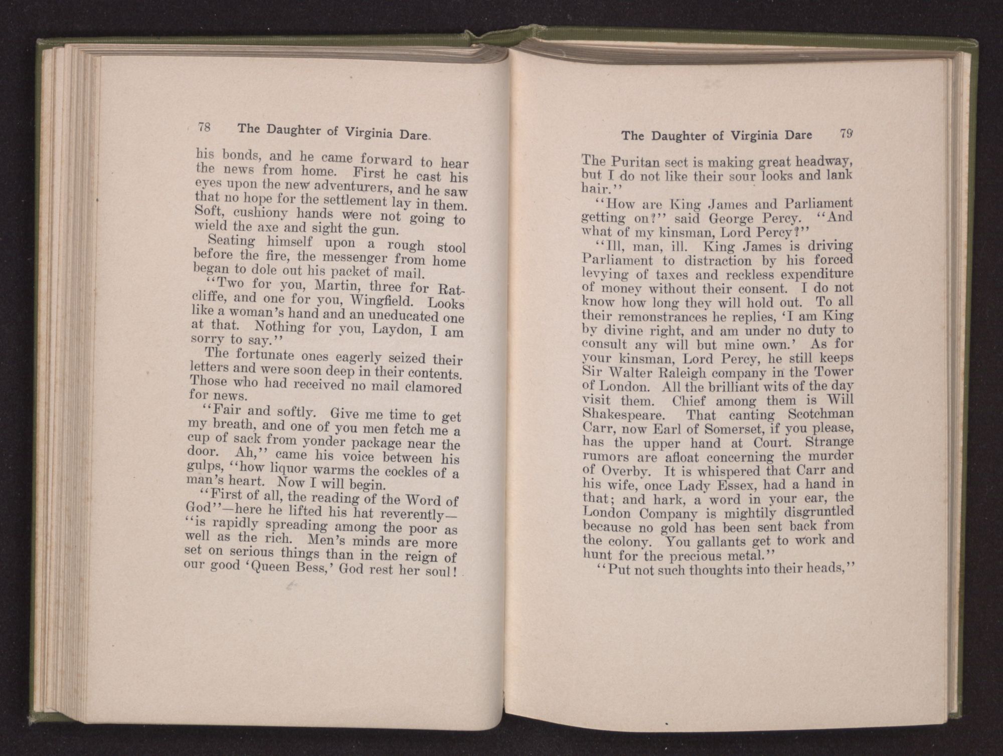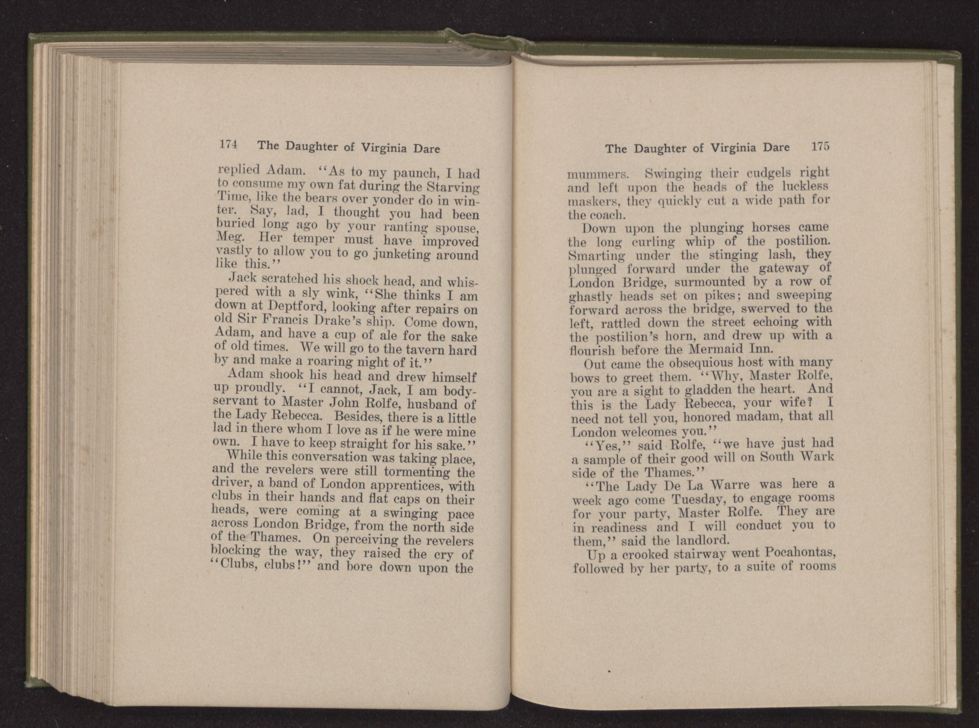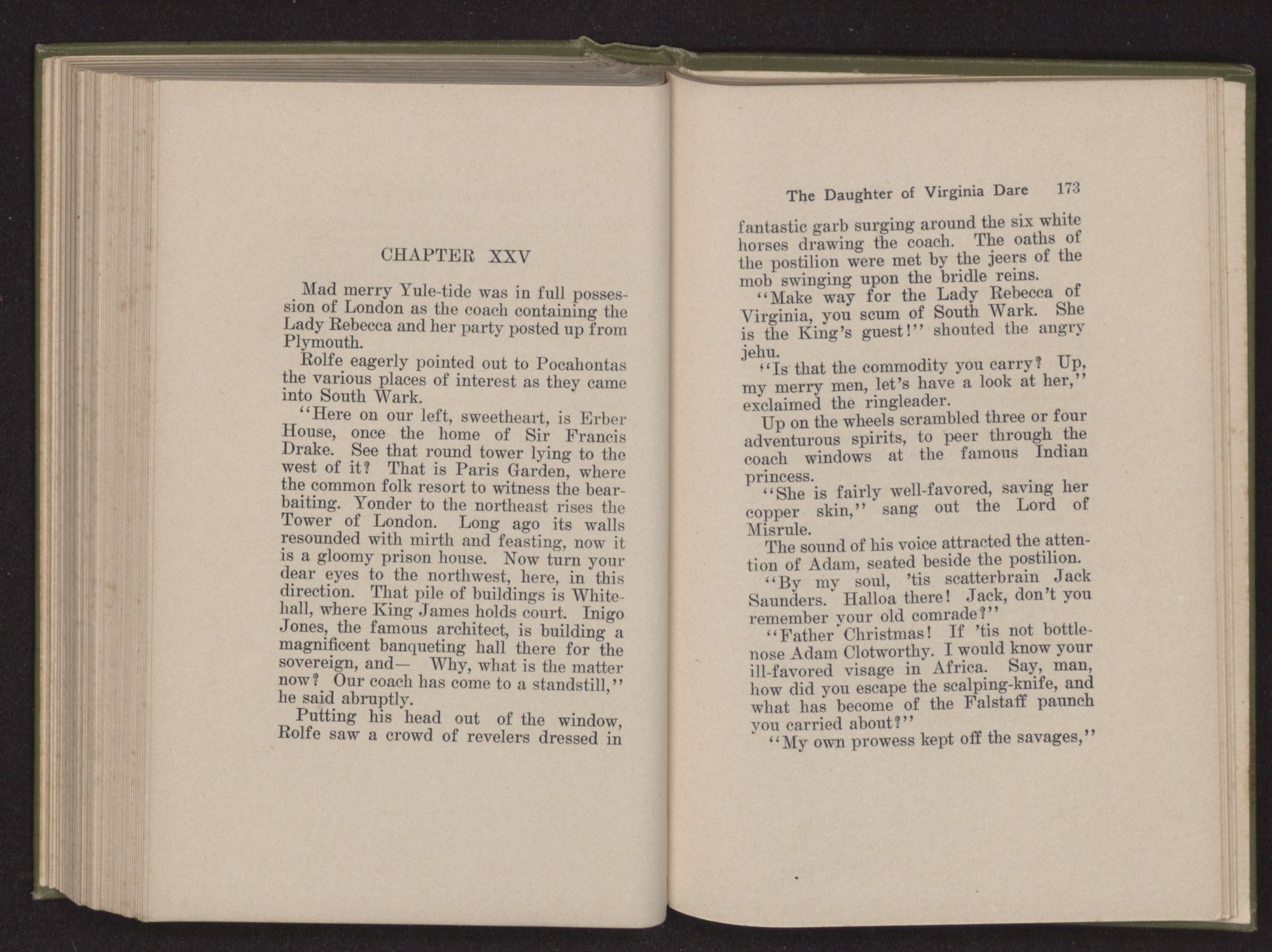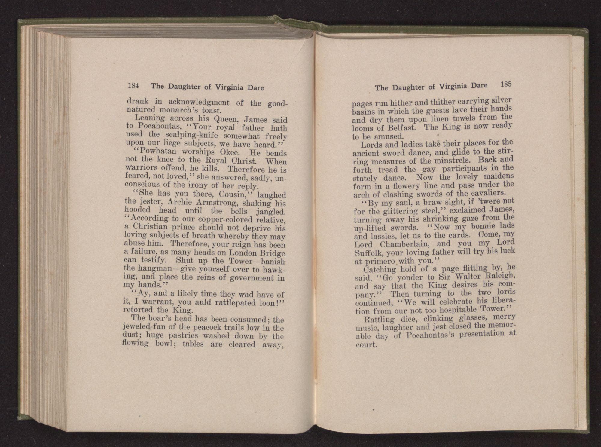 Leaning across his Queen, James said to Pocahontas, “Your royal father hath used the scalping-knife somewhat freely upon our liege subjects, we have heard.”