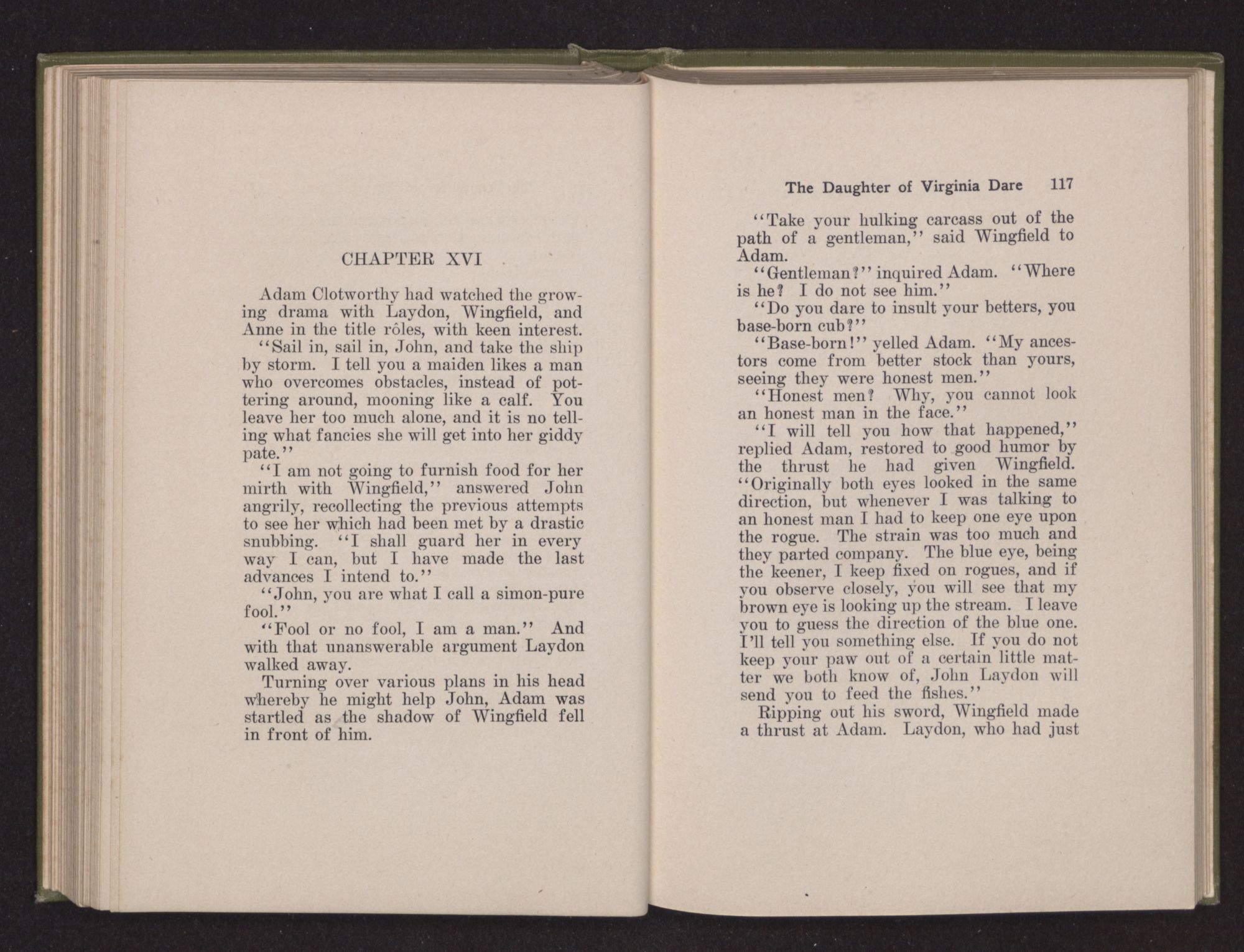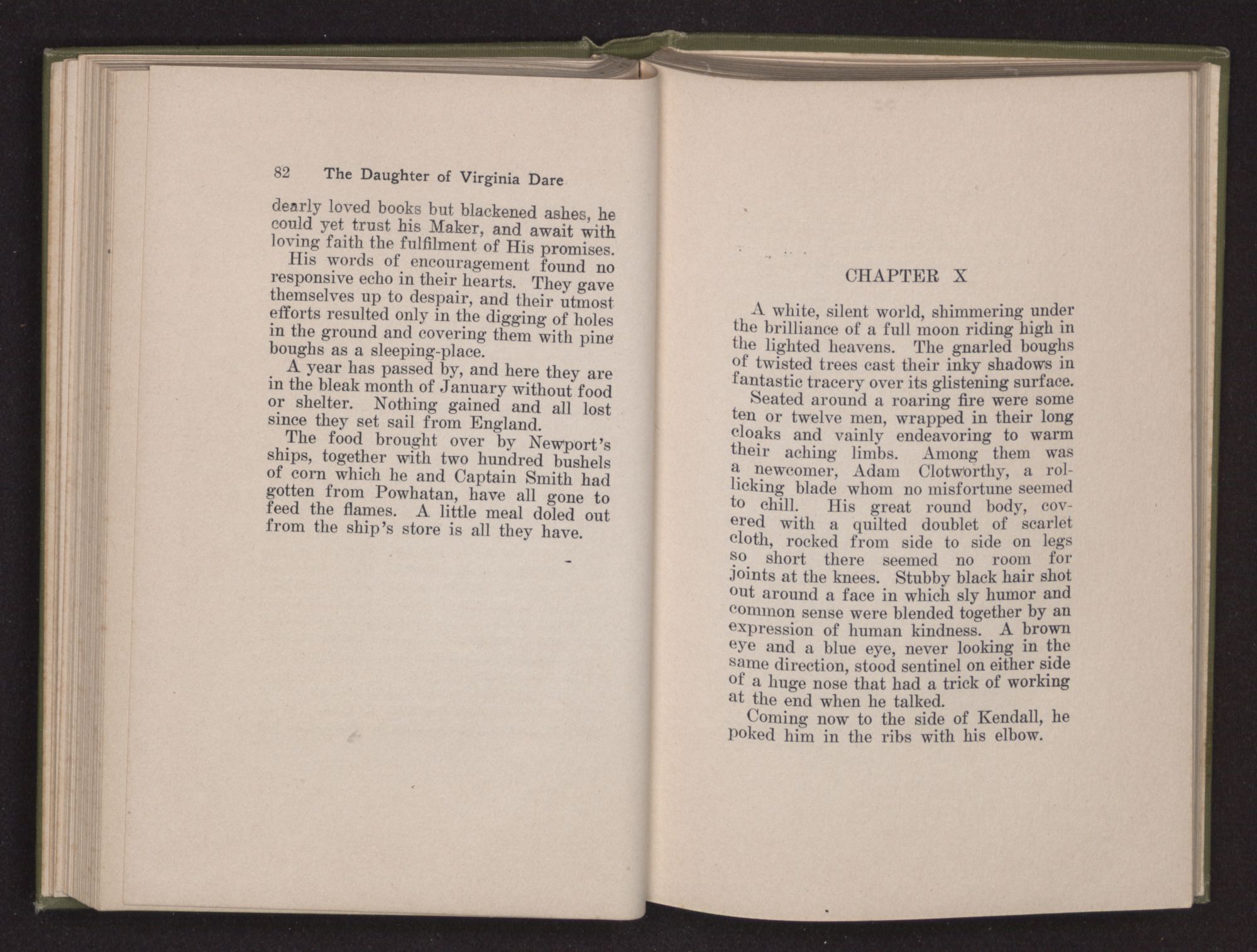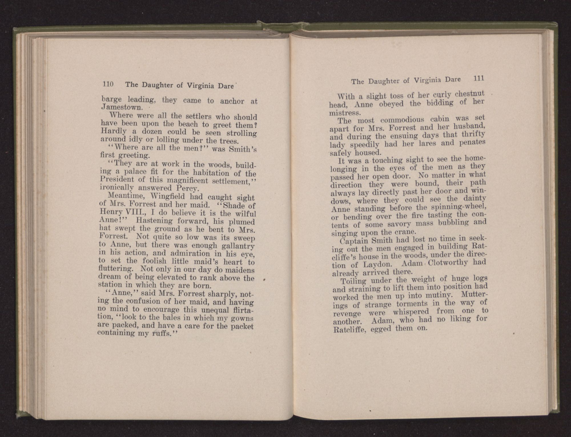 Eleanor Dare chose the cedar cabin, which Lane had used, as a home for herself and her husband, and she occupied herself busily in transforming its interior into a restful abiding-place; in one corner was a mahogany chest with shining brass handles; over the wide fireplace hung a bit of landscape of her girlhood's home; and the pewter plates upon the dresser reflected the dancing flames leaping up the chimney.